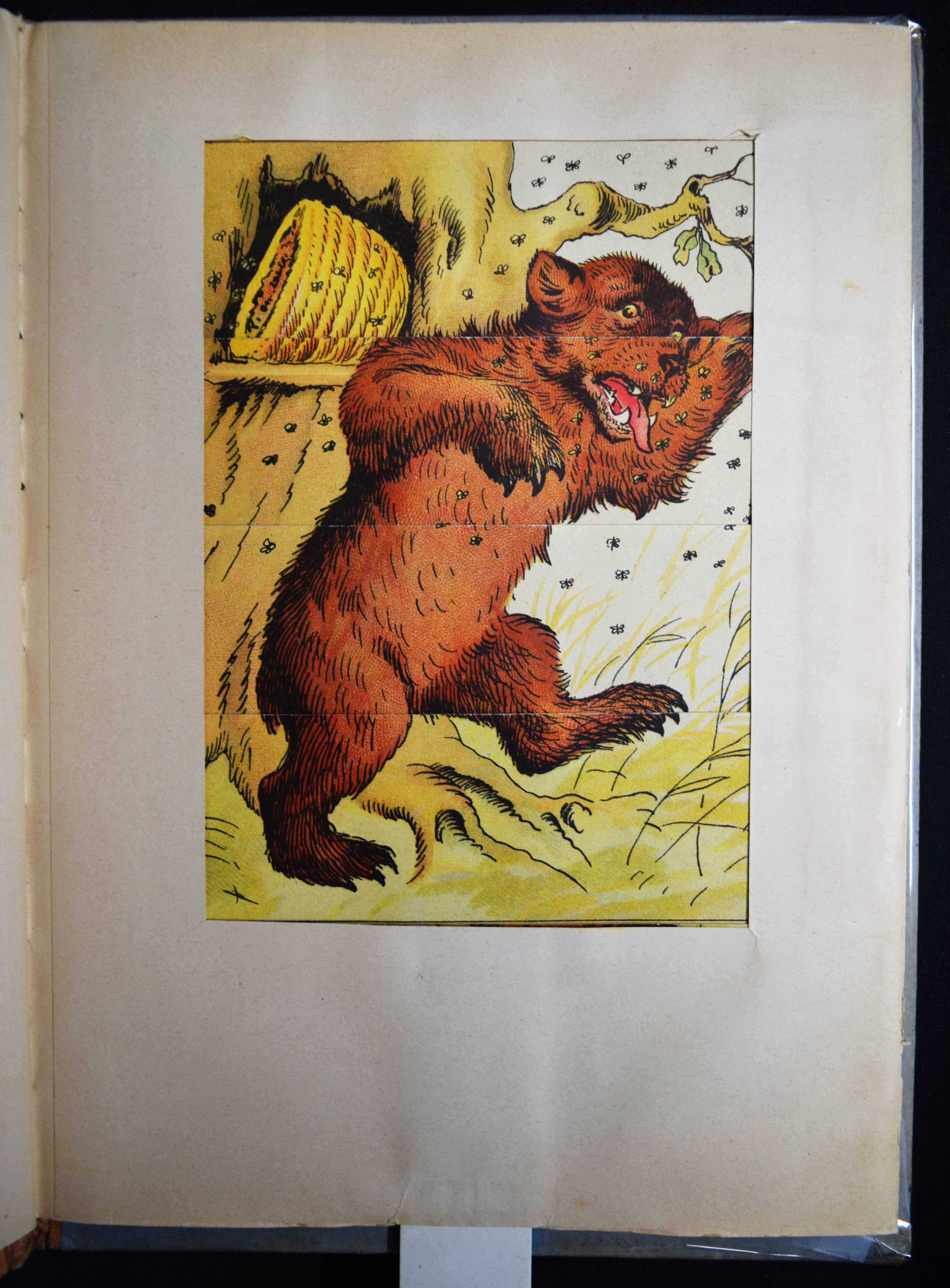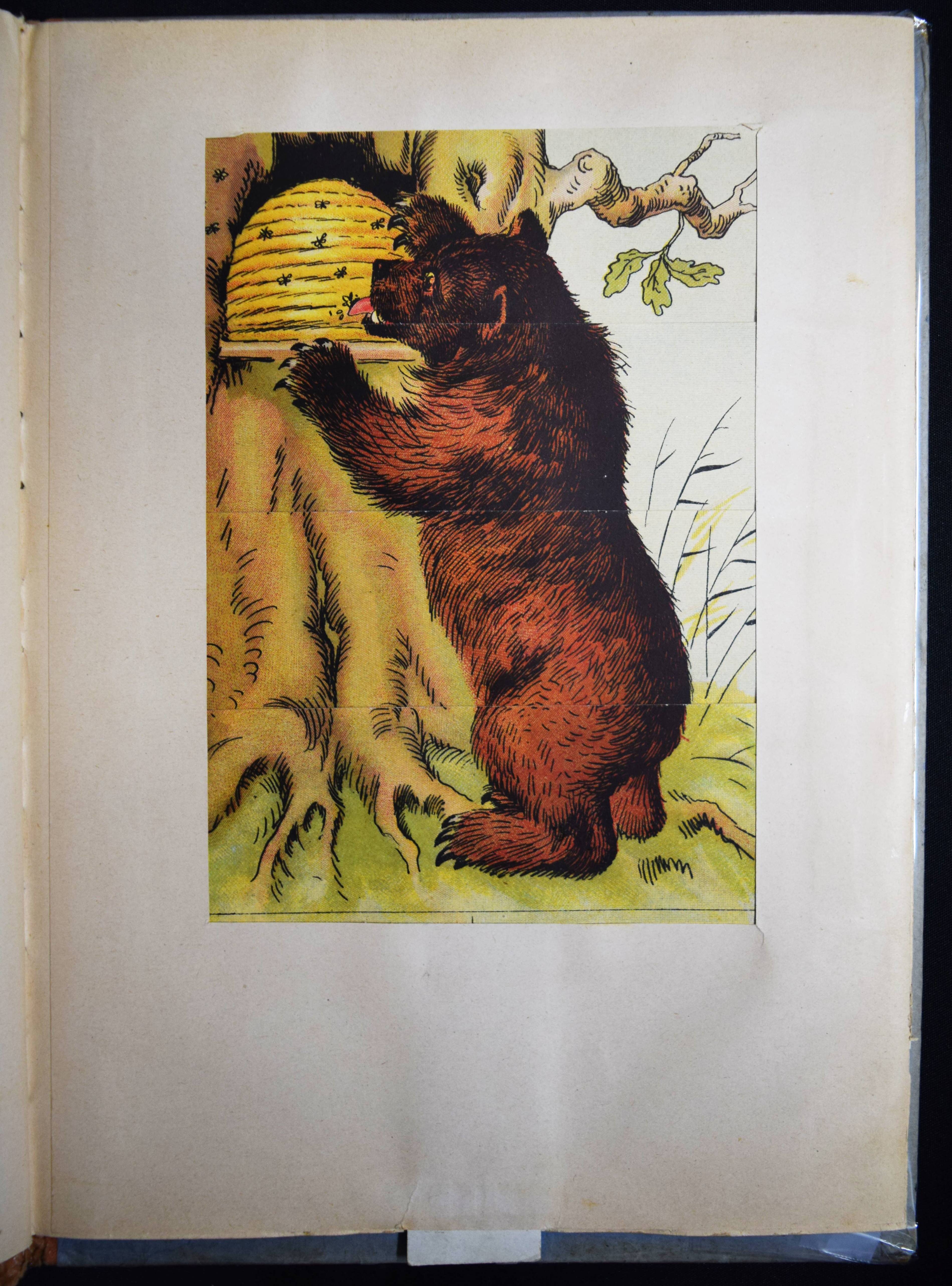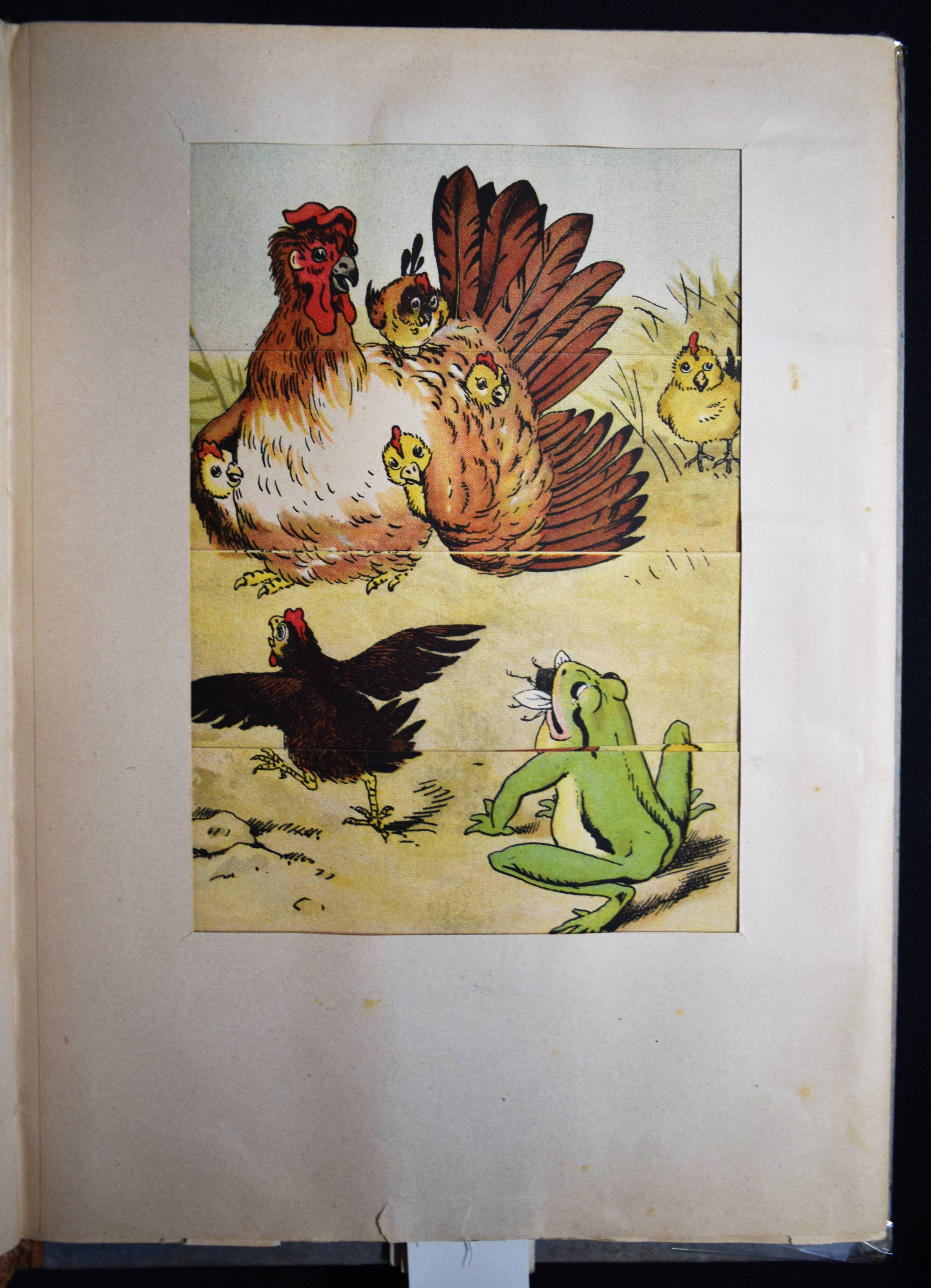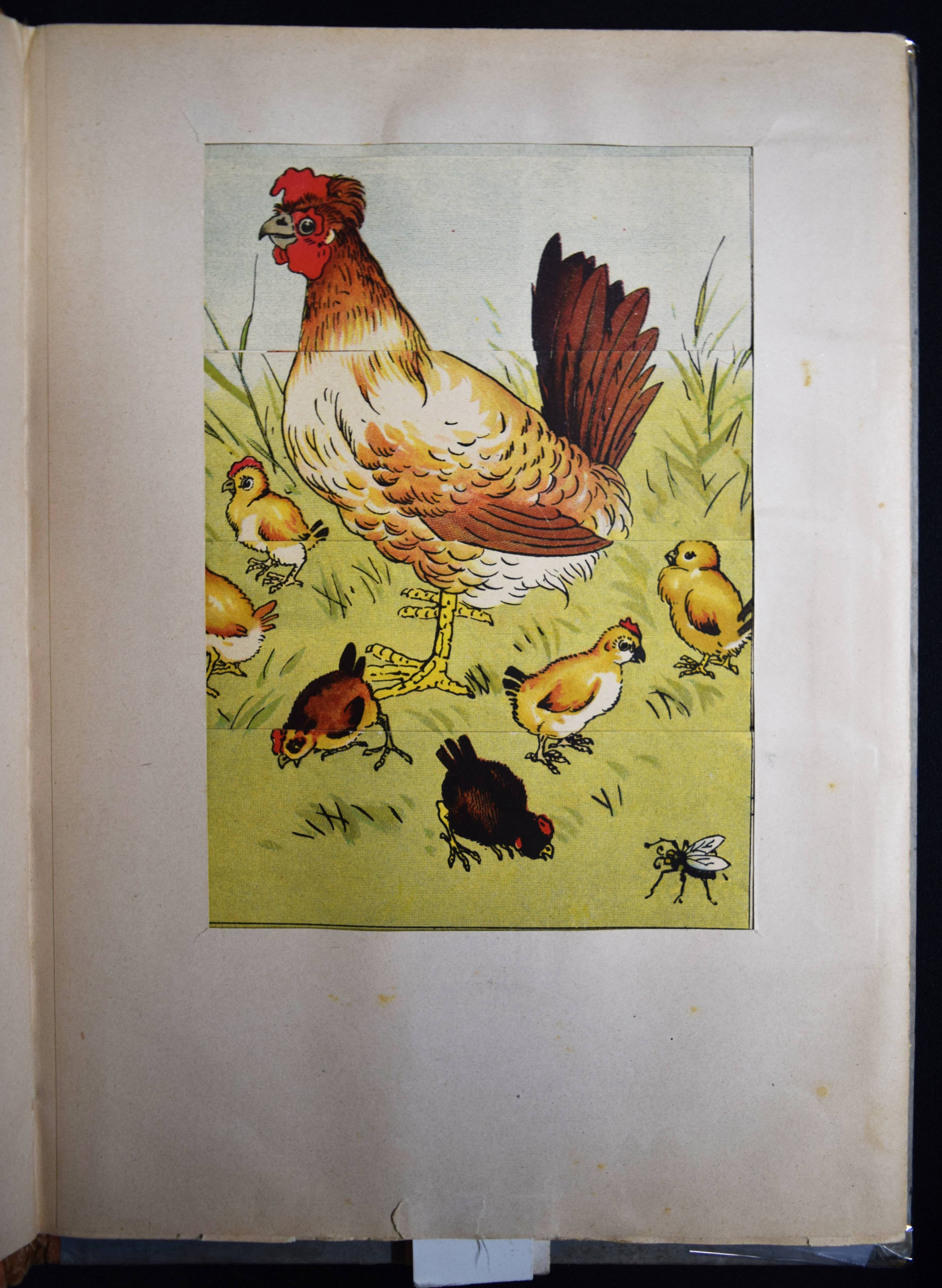 Beck, Julius. Bilder aus dem Tierleben. Ein Verwandlungsbilderbuch von Lothar Meggendorfer. 7.-9. Aufl. Esslingen und München, Schreiber o. J. (1925). 4°. 7 Bl. mit 6 chromolithogr. Tafeln (jede dreimal quer durchgeschnitten und von 6 weiteren Tafeln jalousieartig unterlegt) mit Ziehmechanismus u. Illustrationen im Text. Farbig illustr. OHln. (Verlags-Nr. 138). Klotz 316/1. Krahé 19 (mit Abb. S. 140). Krahé, Puppentheatermuseum 21 u. S. 33 (mit Abb.). Ries 713, 96 u. S. 56. Robinson u. Struwwelpeter 239. Schiller, Meggendorfer 8 u. Sotheby’s Catalogue of the Meggendorfer Archive 76 u. 77 (Originalvorlagen u. Probedrucke mit Abb.). Stuck-Villa I, 432. Wegehaupt II, 2157 (diese Aufl., mit farb. Abb.). – Krahé, Ries u. Wegehaupt dat. die 1.-9. Aufl. 1895. J. Schiller erwähnt jedoch handschriftliche Jahresangaben auf Textprobedrucken (5. Aufl.: 1913 u. 7.-9. Aufl. 1925). – „Die Darstellungen sind sehr überraschend, und führen die Tiere, sobald man an einem Papierstreifen zieht, sehr nette Dinge aus. So legt plötzlich ein Hase Ostereier, trägt ein Storch unversehens ein kleines Kind, macht ein gebildeter Pudel Kunststücke, und dergleichen mehr“ (Aus der Verlagswerbung v. 1895). – „Der Künstler hatte unverkennbar eine Vorliebe dafür, Tiere zu beleben. Ganz offenbar hat er sie geliebt und mit Anteilnahme beobachtet… Man kommt nicht los von Meggendorfers Tieren…“ (M. Sendak). – „Als frühester Beleg für die Jalousietechnik ist ein englischer Titel von 1862 nachgewiesen“ (H. Ries S. 56). – Im Blattrand teils geringfügig fingerfleckig, sehr gutes voll funktionsfähiges Exemplar dieses originellen Spielbilderbuchs. – Krahé, Ries and Wegehaupt dated the 1st-9th editions 1895. However, J. Schiller mentions handwritten dates on proofs of the text (5th edition: 1913 and 7th-9th editions 1925). – “The illustrations are very surprising, and the animals do very nice things as soon as you pull on a strip of paper. Thus a rabbit suddenly lays Easter eggs, a stork suddenly carries a small child, an educated poodle performs tricks, and the like” (from the publisher’s advertisement of 1895). – “The artist had an unmistakable predilection for animating animals. He obviously loved them and observed them with sympathy… One cannot get away from Meggendorfer’s animals…” (M. Sendak). – “The earliest evidence of the Venetian blind technique is an English title from 1862” (H. Ries p. 56). – Some minor fingerstaining in the margins, a very good, fully functional copy of this unusual picture book.