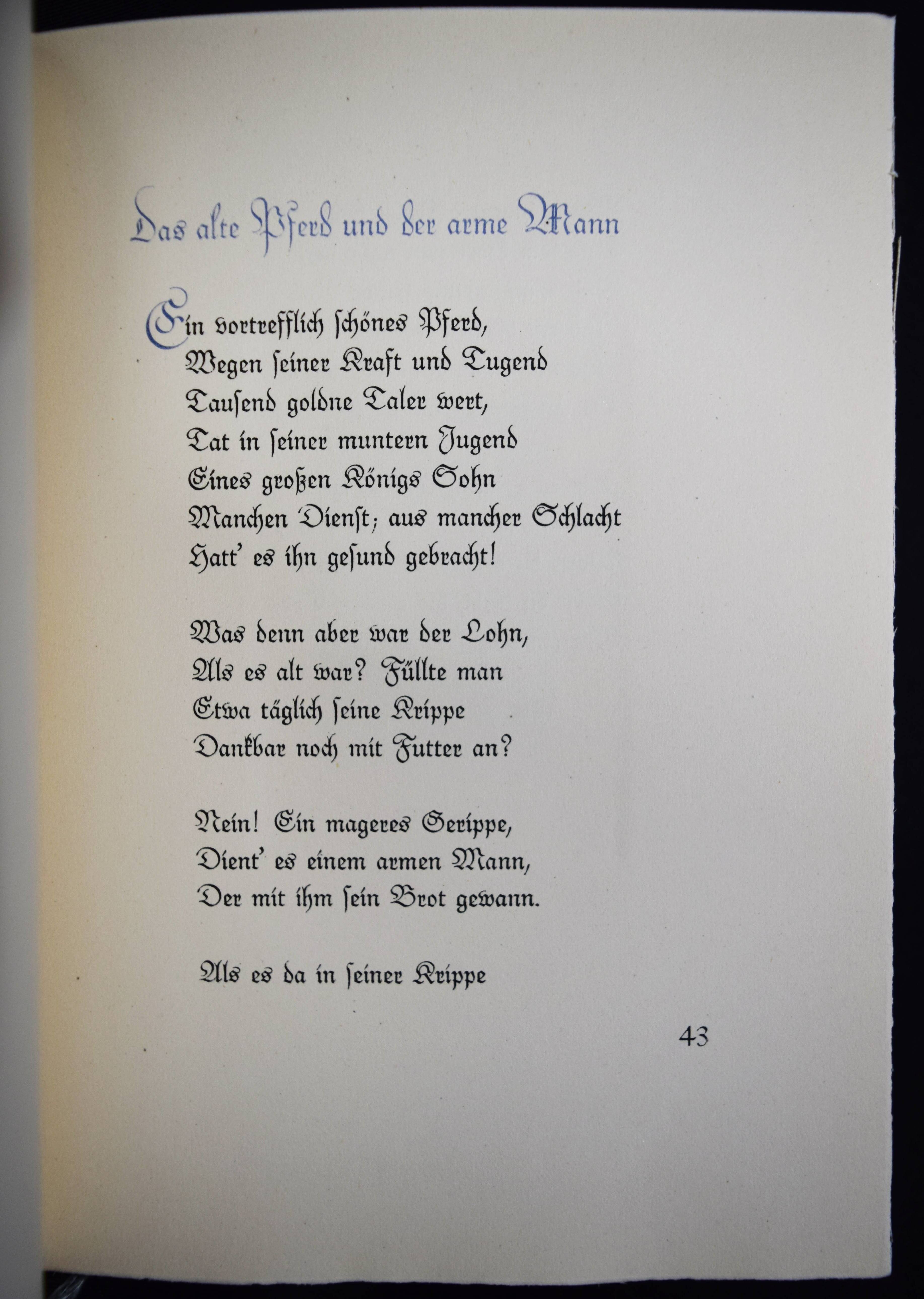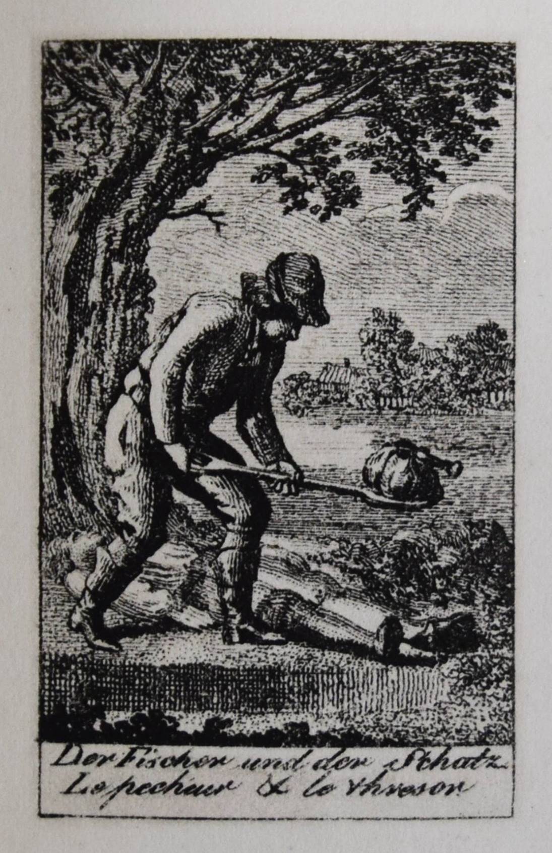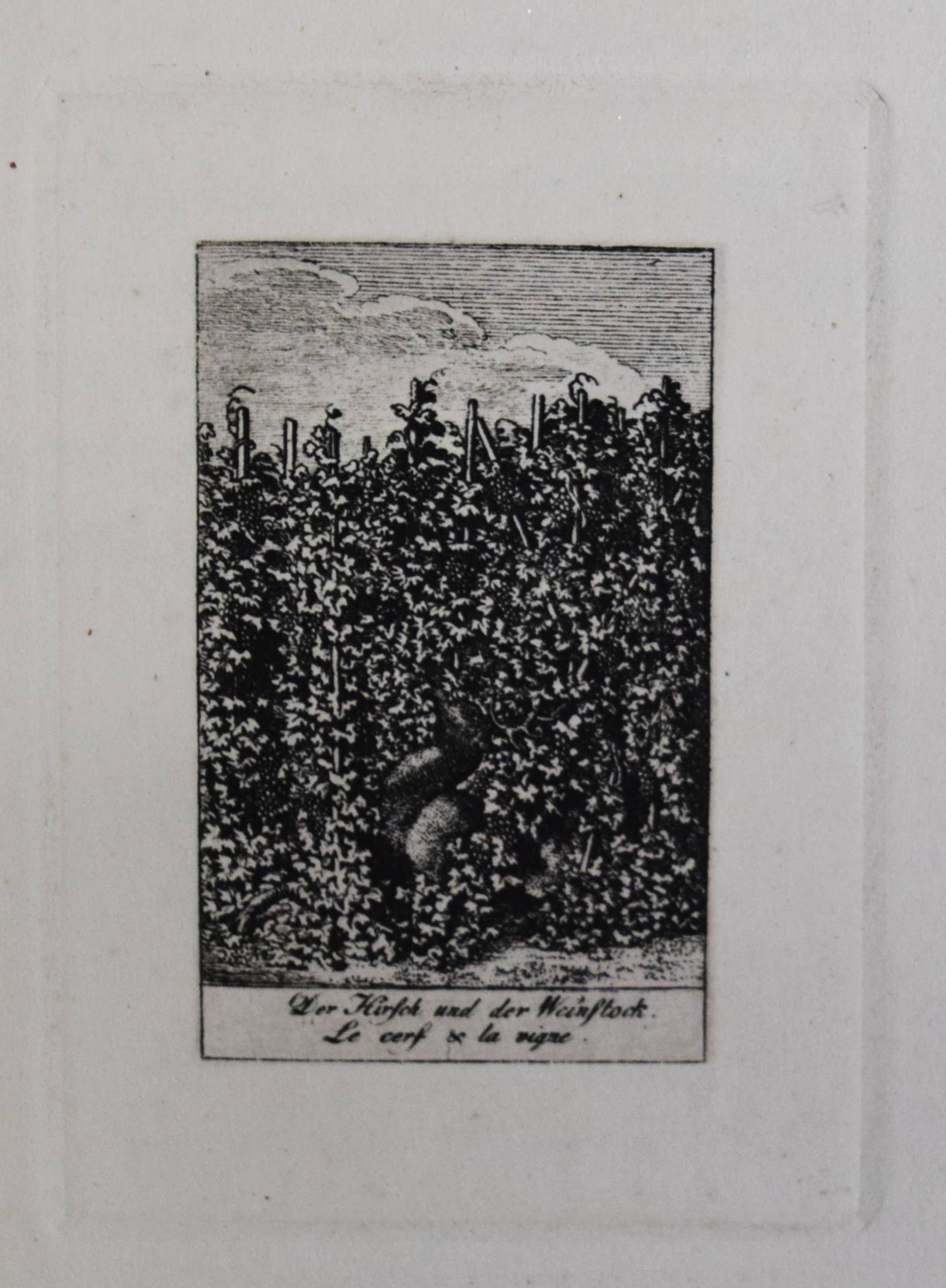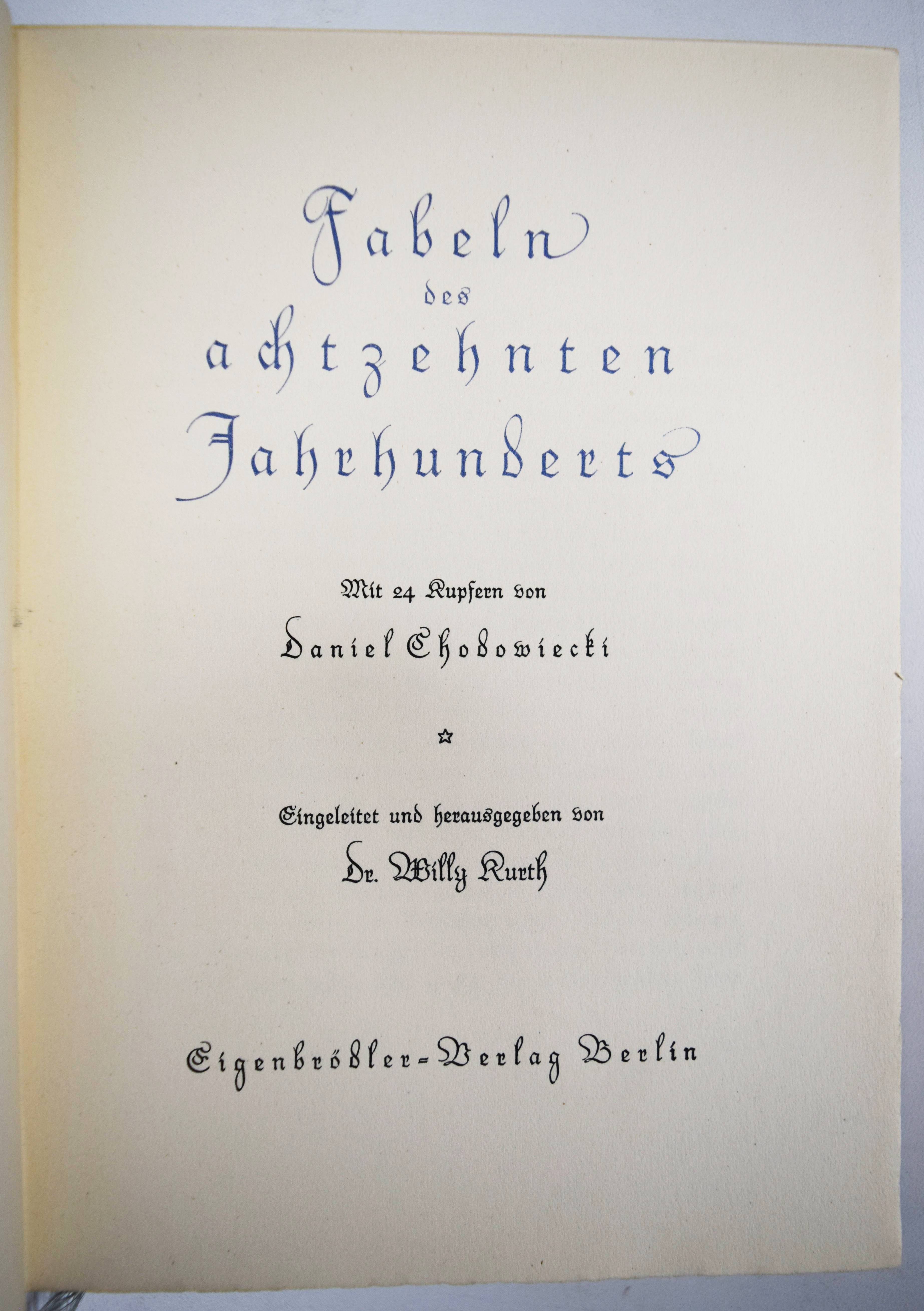 Kurth, Willy (Hrsg.). Fabeln des achtzehnten Jahrhunderts. Mit 24 Kupfern von Daniel Chodowiecki. Berlin, Eigenbrödler-Verlag (1923). 8°. 88 S. mit Titelblatt in Blau und Schwarz und 24 Tafeln nach Kupferstichen. Blauer Orig.-Kalbslederband mit goldgepr. Rückenschild, floraler Rücken- und Deckelvergoldung und Kopfgoldschnitt (Entwurf: Erwin Rechenberg, Berlin). Nicht bei Bodemann. – Nr. 18 von 25 Exemplaren im Handeinband (GA 850 Exemplare). Die Illustrationen von D. Chodowiecki zu Fabeln von Gellert, Gleim, Pfeffel, Hagedorn und Lichtwer wurden hier erstmals veröffentlicht. – „Diese Fabeln mit den 24 Kupfern von Daniel Chodowiecki, zum erstenmal vereint veröffentlicht, wurden in einer einmaligen Auflage von 850 Exemplaren in der Offizin von Radellli & Hille in Leipzig gedruckt. Die Nummern I-XXV wurden ganz besonders kostbar in Leder mit der Hand gebunden. Der Druck der 24 Kupfer wurde in der Handpresse hergestellt. Der Einbandentwurf stammt von Erwin Rechenberg, Berlin“ – Paginierfehler: die Seitenzählung springt von 24 auf 27, sehr schönes Exemplar.