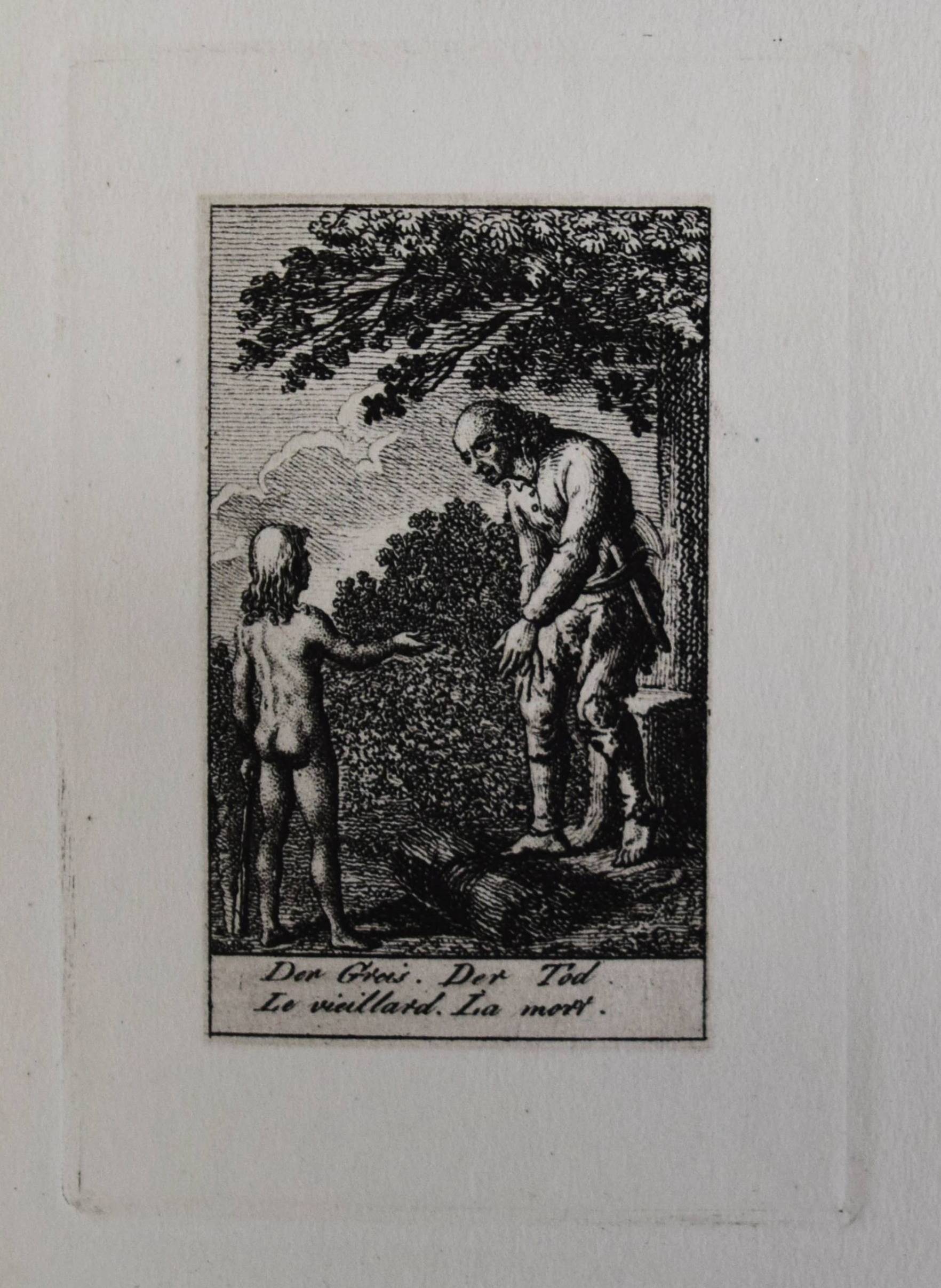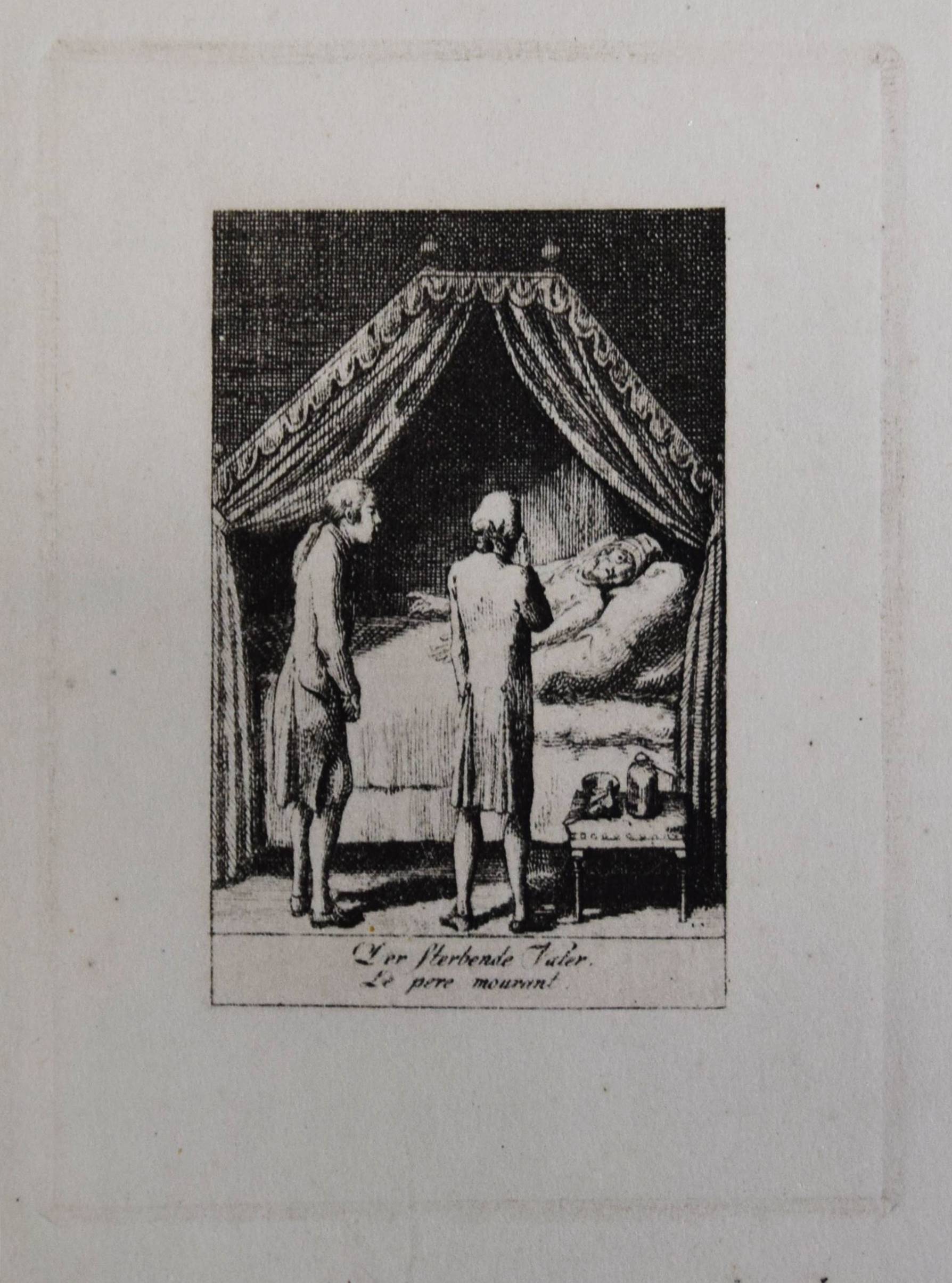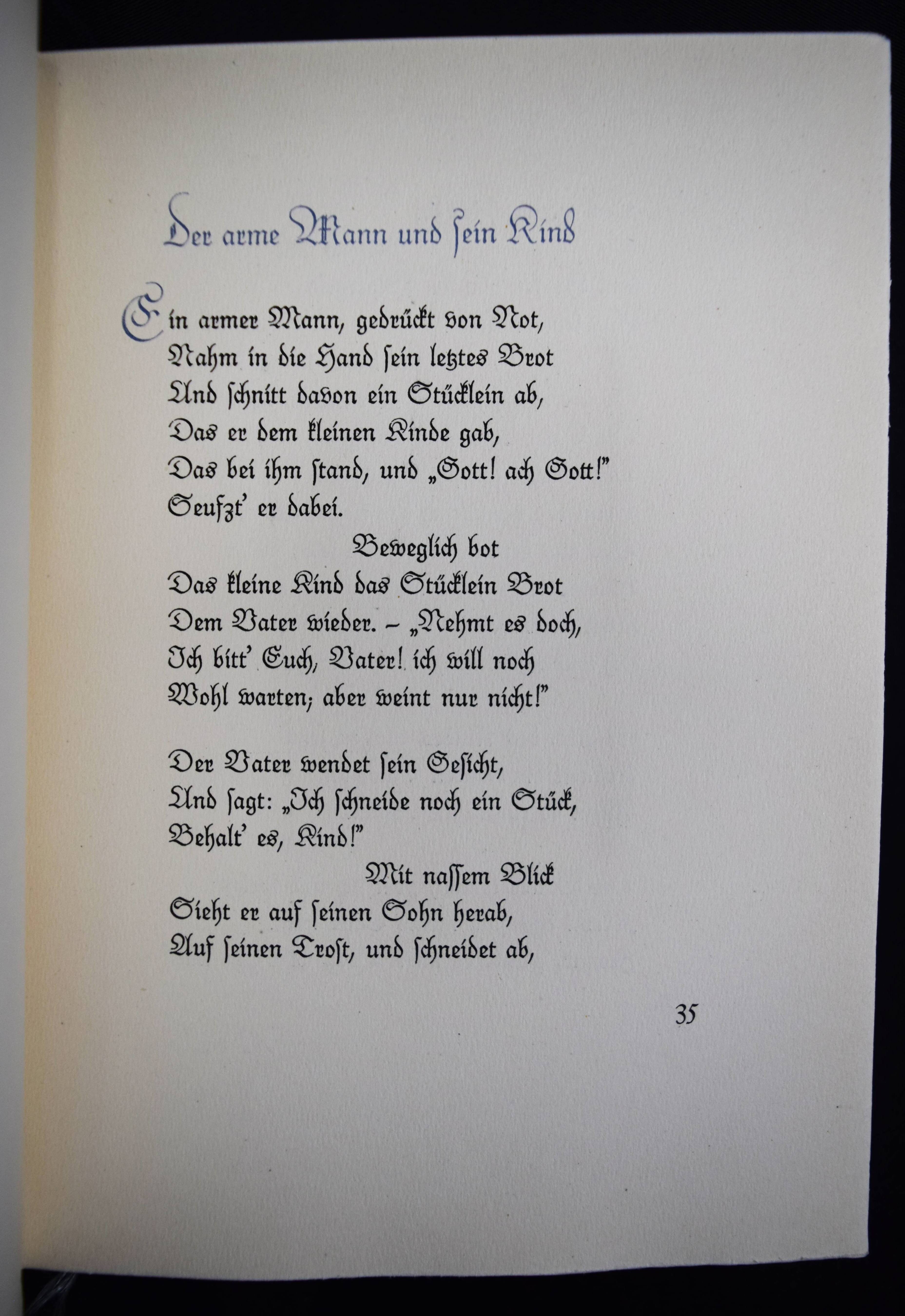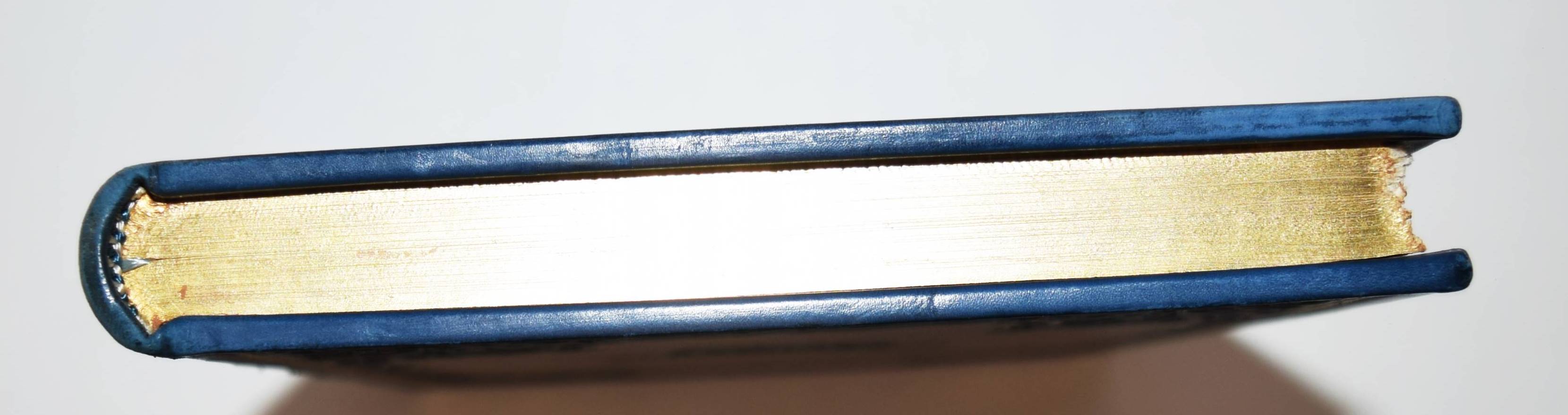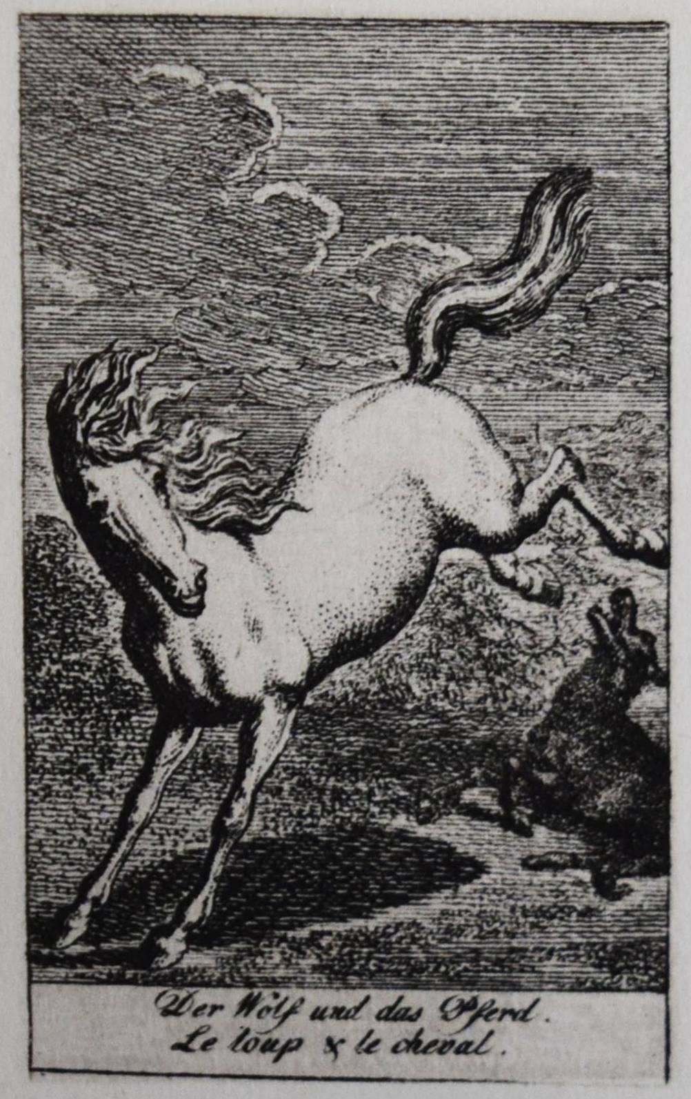 Kurth, Willy (Hrsg.). Fabeln des achtzehnten Jahrhunderts. Mit 24 Kupfern von Daniel Chodowiecki. Berlin, Eigenbrödler-Verlag (1923). 8°. 88 S. mit Titelblatt in Blau und Schwarz und 24 Tafeln nach Kupferstichen. Blauer Orig.-Kalbslederband mit goldgepr. Rückenschild, floraler Rücken- und Deckelvergoldung und Kopfgoldschnitt (Entwurf: Erwin Rechenberg, Berlin). Nicht bei Bodemann. – Nr. 18 von 25 Exemplaren im Handeinband (GA 850 Exemplare). Die Illustrationen von D. Chodowiecki zu Fabeln von Gellert, Gleim, Pfeffel, Hagedorn und Lichtwer wurden hier erstmals veröffentlicht. – „Diese Fabeln mit den 24 Kupfern von Daniel Chodowiecki, zum erstenmal vereint veröffentlicht, wurden in einer einmaligen Auflage von 850 Exemplaren in der Offizin von Radellli & Hille in Leipzig gedruckt. Die Nummern I-XXV wurden ganz besonders kostbar in Leder mit der Hand gebunden. Der Druck der 24 Kupfer wurde in der Handpresse hergestellt. Der Einbandentwurf stammt von Erwin Rechenberg, Berlin“ – Paginierfehler: die Seitenzählung springt von 24 auf 27, sehr schönes Exemplar.