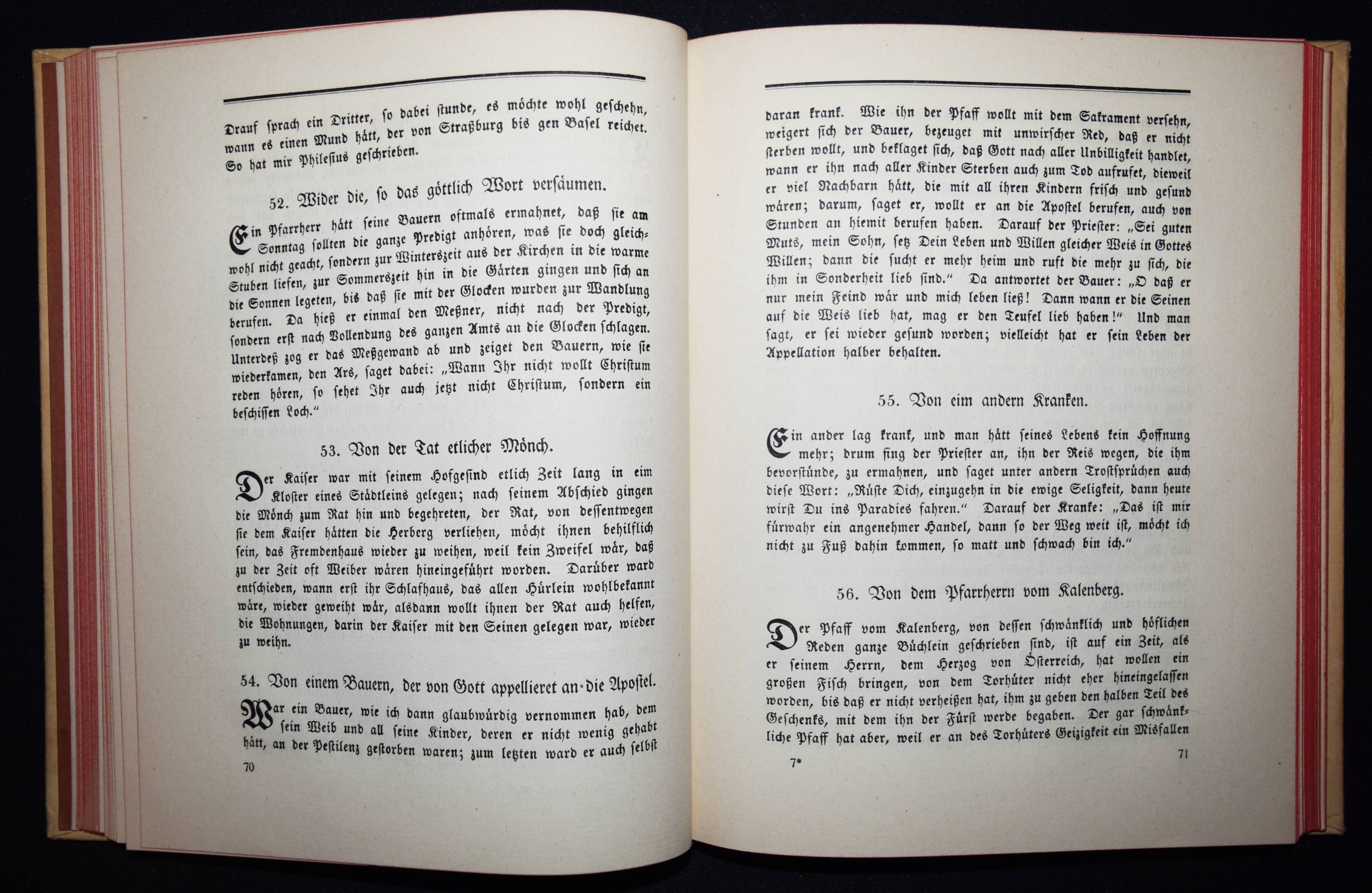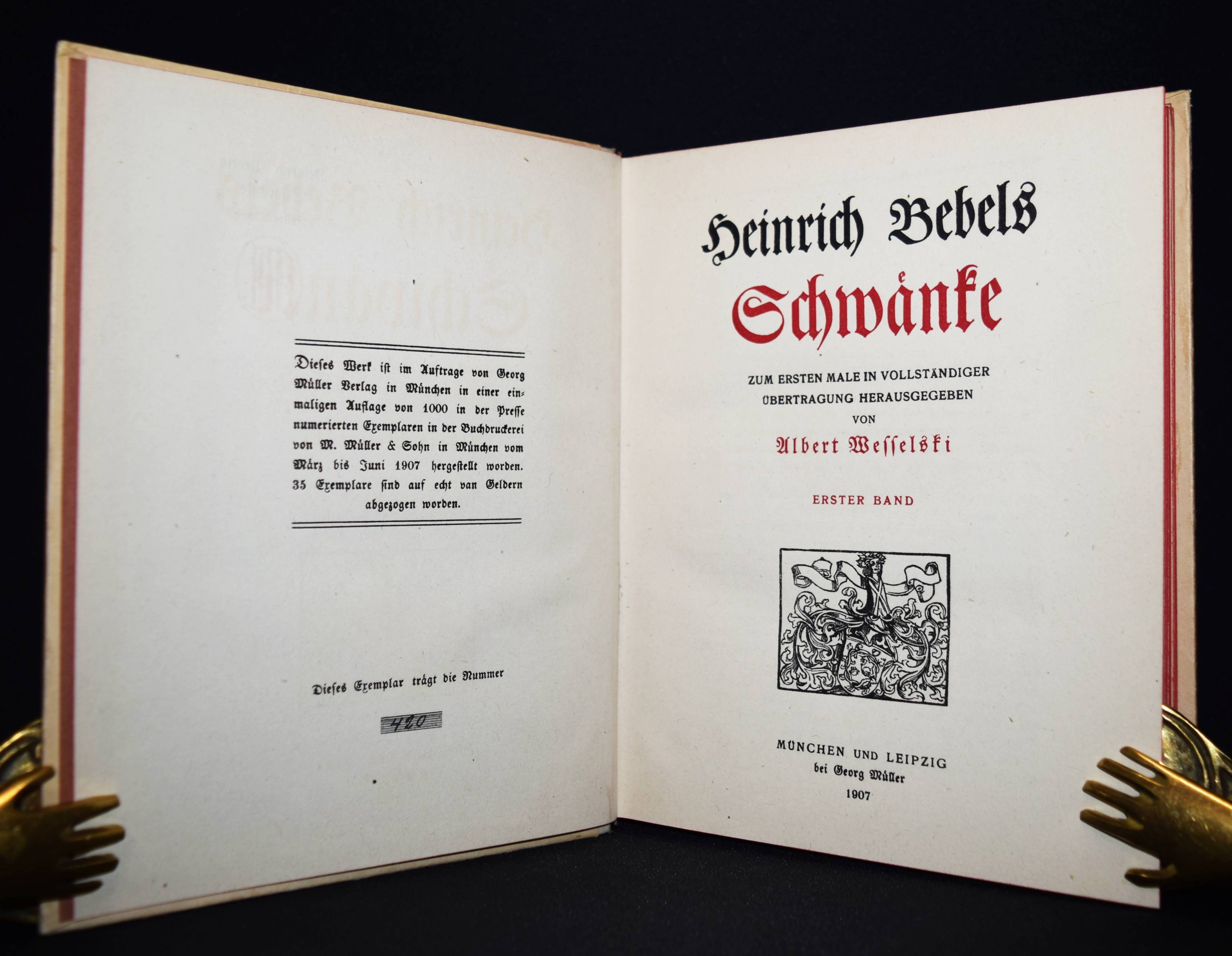 Bebel, Heinrich. Schwänke. Zum ersten Male in vollständiger Übertragung herausgegeben von Albert Wesselski. 2 Bände. München, Leipzig, G. Müller 1907. 8°. XXVII, 241 S.; 212 S. mit Titeln in Schwarz und Rot und Titelvignetten. OHprgt. mit Rücken- und Deckeltitel in Rot sowie Rücken- und Deckelvergoldung. Hayn-Gotendorf I, 195. – Eines von 1000 num. Exemplaren (GA 1035). – „Der Übertragung ist Bebels Ausgabe letzter Hand, die 1514 in Straßburg bei Schürer erschienenen ‚Bebeliana opuscula nova et adolescentiae labores‘, zugrunde gelegt worden, jedoch sind auch die nur in andern Editionen enthaltenen Stücke beigegeben, so daß absolute Vollständigkeit erreicht ist“ (Hayn-Gotendorf). – Schönes Exemplar mit leichten Gebrauchsspuren.