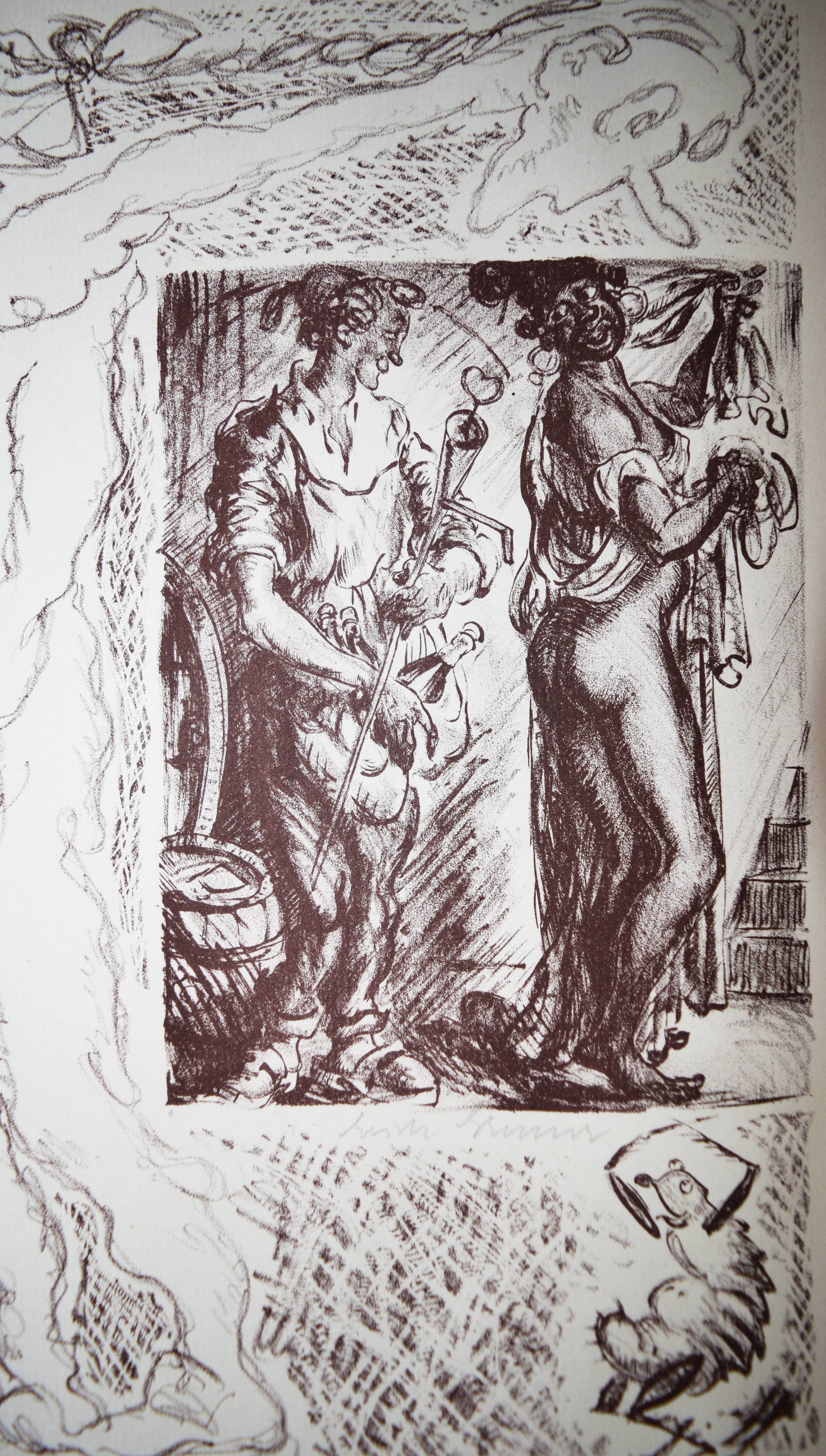 Gruner – (Cramer, Karl Gottlob). Meppen Bocksbart’s nächtliches Floherlebnis und Traum. Mit Steinzeichnungen von Erich Gruner. Leipzig, Meißner & Buch 1920. 4°. 2 Bl., 40 S. mit lithogr. handkol. Titel, 2 handkol. Initialen sowie 34 (10 ganzs.) Lithographien mit eingedr. Text. OPbd. mit Deckelvignette. Nicht bei Sennewald. Vgl. Hayn/Gotendorf I, 403. – Eines von 150 num. Exemplaren. – Im Stil der Malerbücher durchkonzipiertes Buch. Jede Seite ist mit lithographierten Illustrationen umrahmt. – Die beiden Erzählungen erschienen zuerst 1785 in „Meppen Bocksbart oder wundersame Ebentheuer eines peregrinirenden Kandidaten“. – Die Titelbordüre und die beiden Initialen koloriert. – Karl Gottlob Cramer gehörte zu den erfolgreichsten Trivialautoren seiner Zeit. „Allen Romanen Cramers ist eine gehörige Portion bissiger, wenn auch oberflächlicher Zeit- und Sozialkritik beigemischt, seine formale Vielseitigkeit erinnert manchmal an Jean Paul, wie seine geschickten Kolportageeffekte an einen Johannes Mario Simmel. Sein Stil ist in den Ritterromanen ebenso unverkennbar wie in den Satiren, in den Gespenstergeschichten wie in den erotischen Werken“ (R. Wittmann, Zur Trivialliteratur der Goethezeit. Randbemerkungen eines Sammlers. In: Aus dem Antiquariat 1976/Heft V). – Zu dem Leipziger Maler, Buchkünstler und Graphiker Erich Gruner (geb. 1881) vgl. Vollmer II, 325. – Hinterer Deckel mit leichtem Lichtrand, sonst gutes Exemplar.