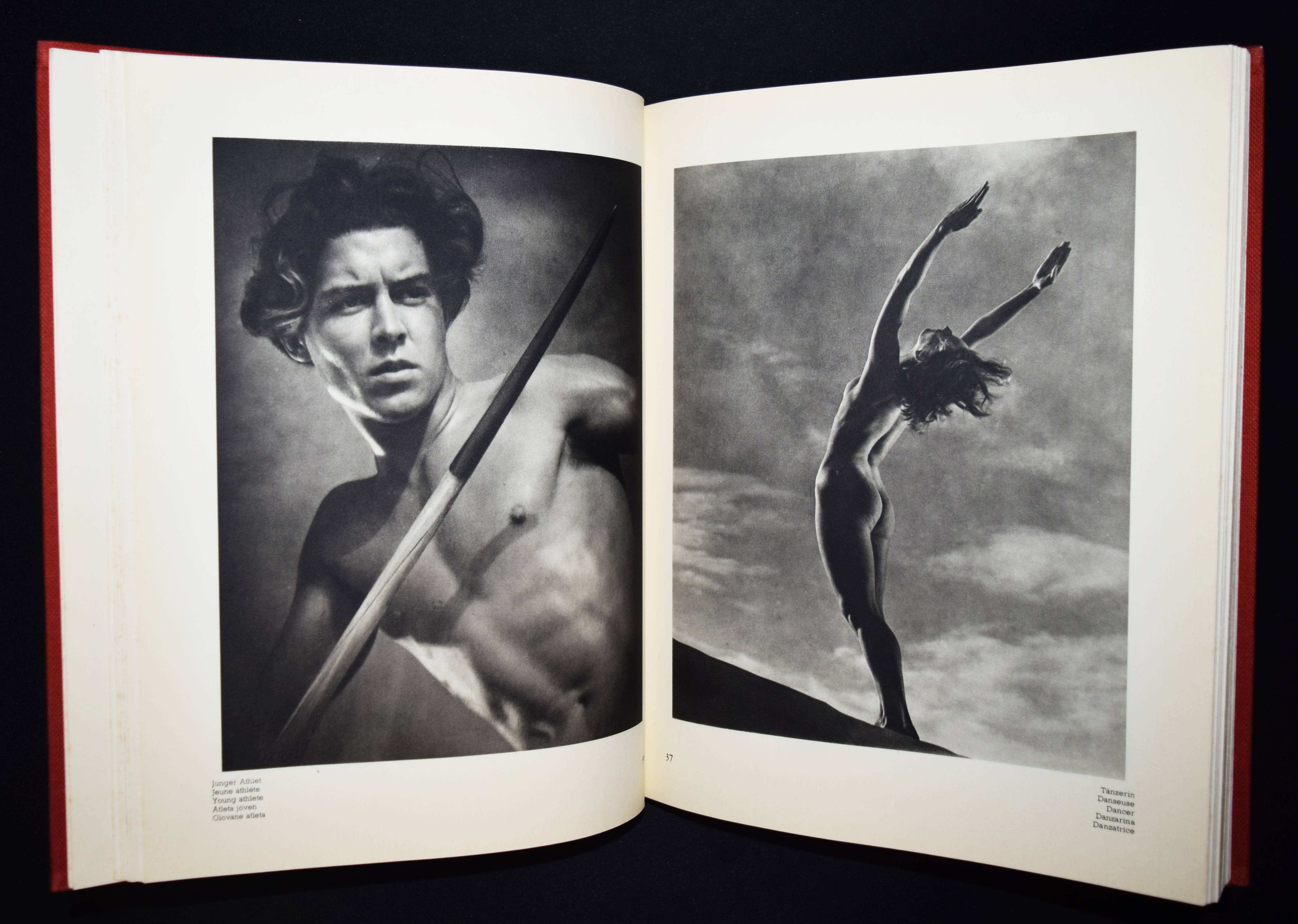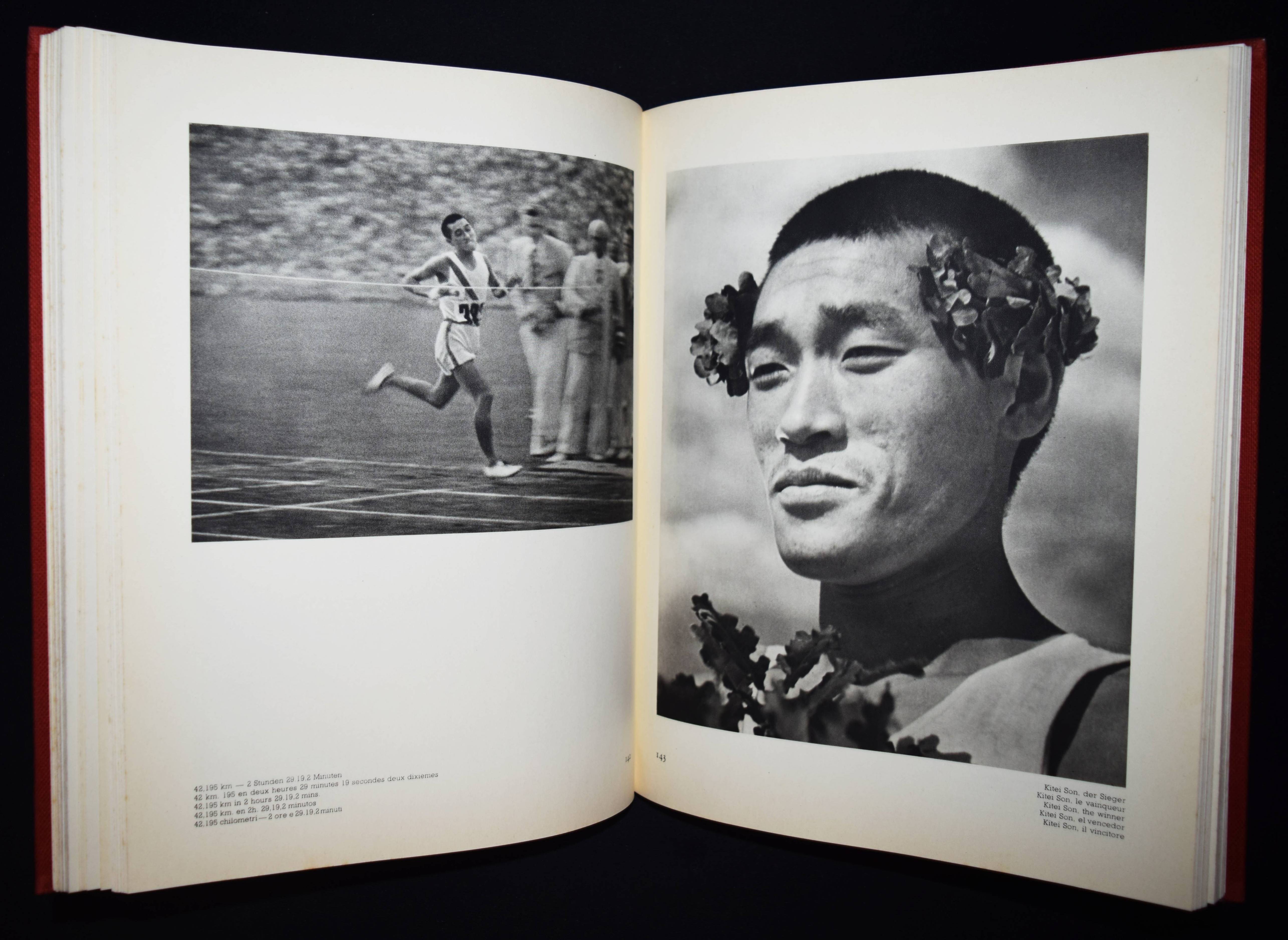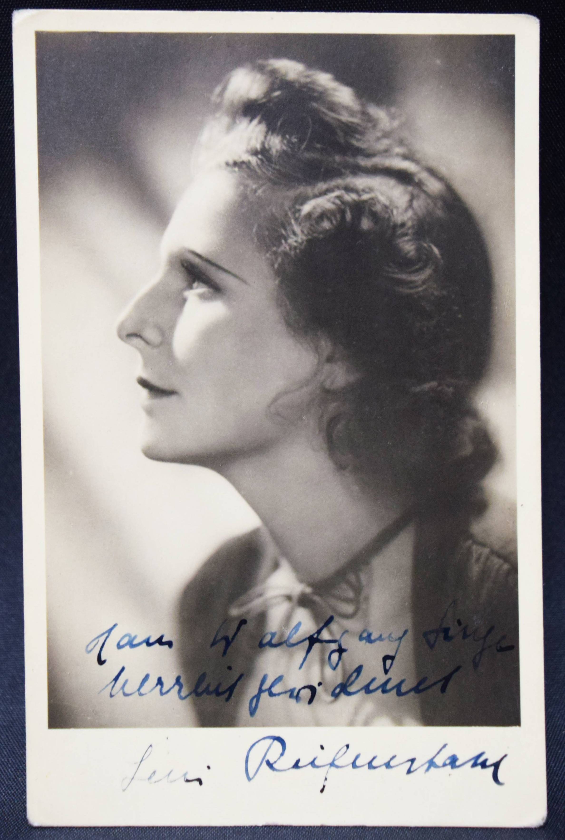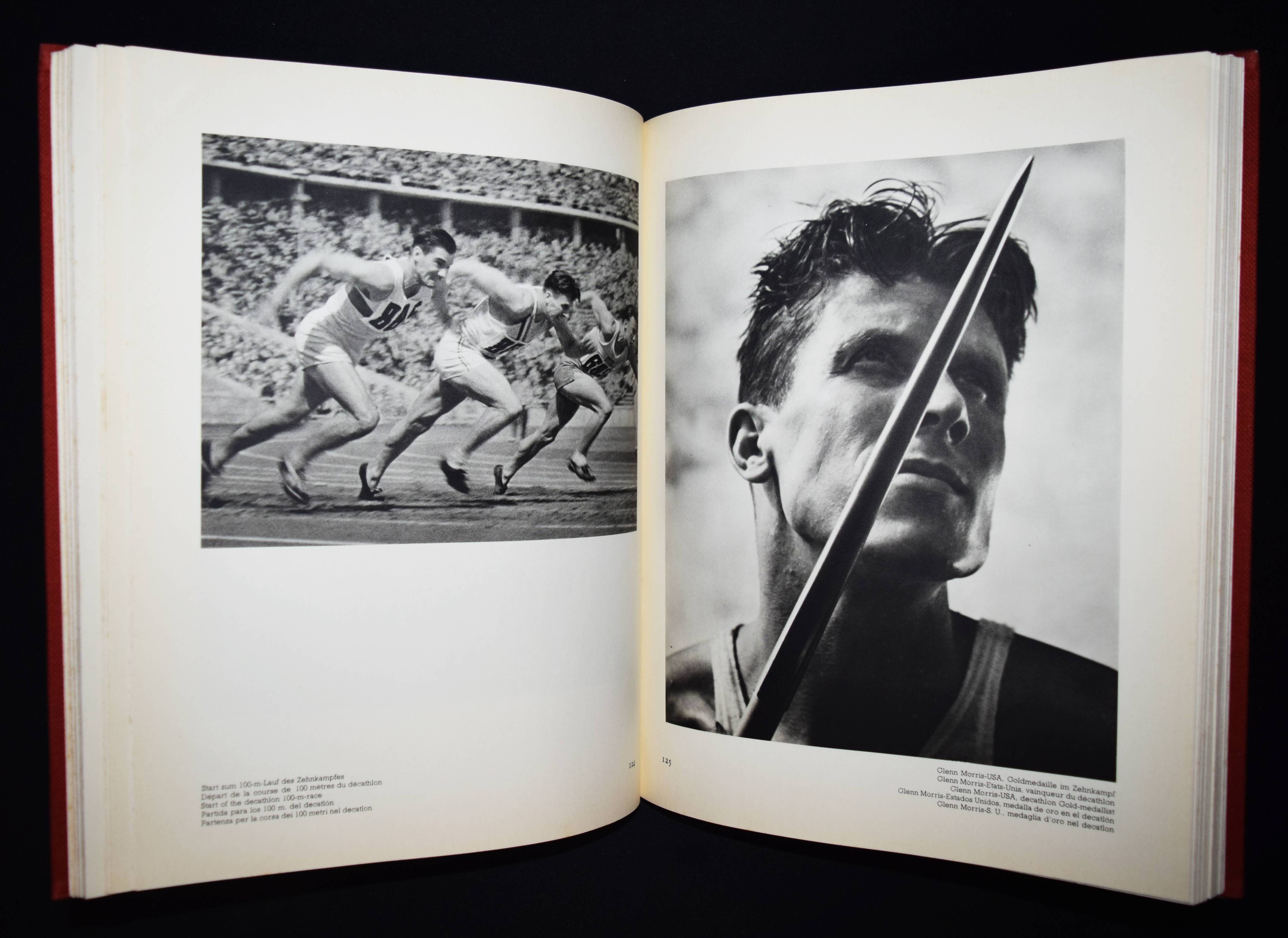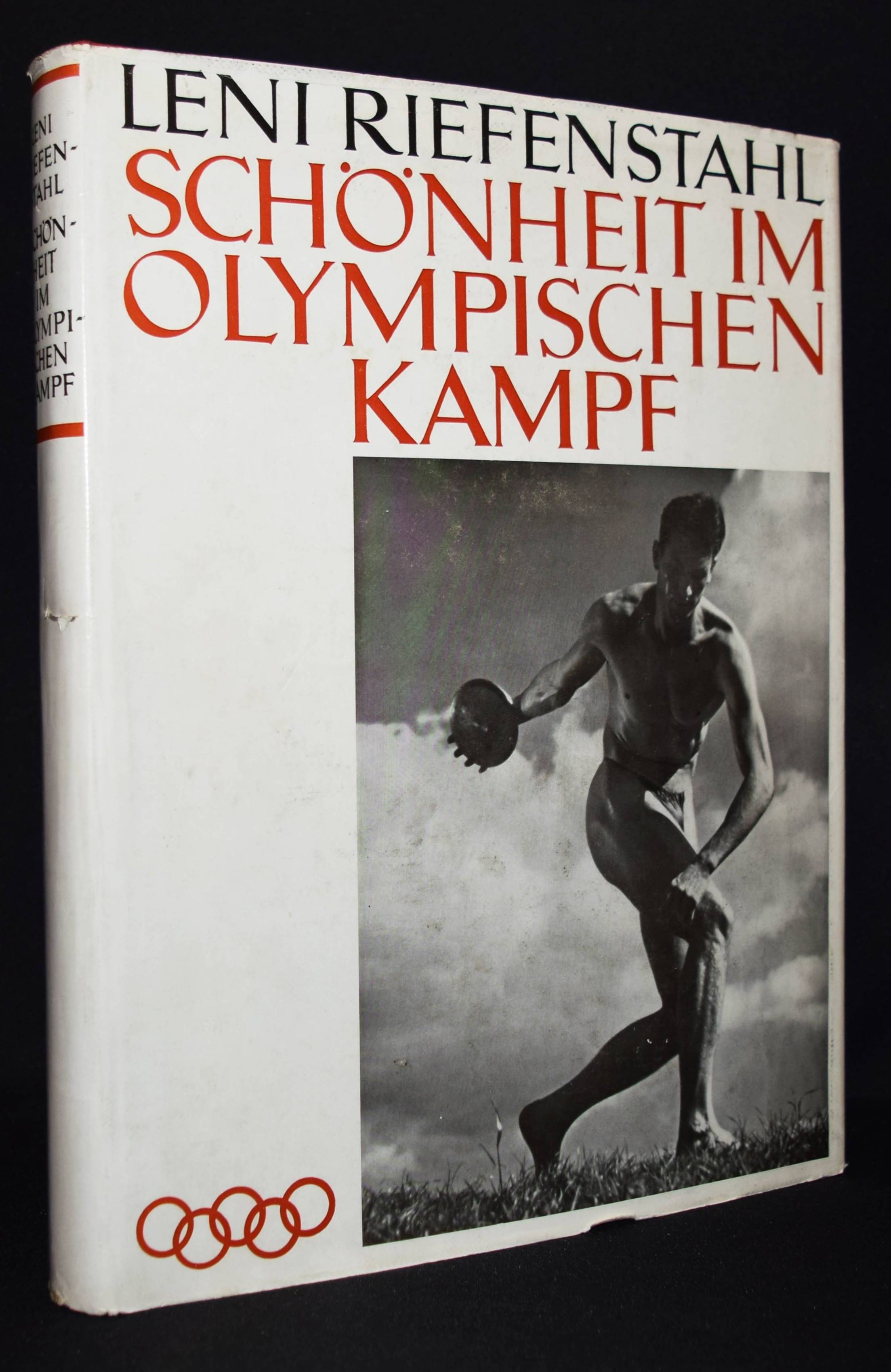 Riefenstahl, Leni (eig. Helene Amalia Bertha). Schönheit im Olympischen Kampf. Mit zahlreichen Aufnahmen von den Olympischen Spielen 1936. Berlin, Deutscher Verlag (1937). 4°. 280 S., [2] Bl. mit teils ganzs. Abb. in Kupfertiefdruck. OLn. mit goldgepr. Rücken- u. Deckeltitel (Entwurf: F. H. Ehmcke), illustr. Orig.-Schutzumschlag und transparenter Japanpapier-Schutzumschlag. Auer 255. Heidtmann 17277. Heiting/Jaeger II, 530 ff. Koetzle 369 f. Lederman/Yatskevich 93. Parr/Badger I, 151. Roth, The Book of 101 Books 96 f. – Erste Ausgabe der ersten Bindequote. – Dazu: Postkarte mit eigenhändiger Widmung von L. Riefenstahl um 1935 und 1 Orig.-Photographie (Silbergelatine, 23,5 x 30 cm.) „Die Fünfkampfsieger Handrick-Deutschland, Leonard, USA und Abba, Italien“, im Buch abgebildet auf S. 179, rückseitig mit Stempel „Foto: Tobis. Fimkunst G.m.b.H.“ (Kino-Aushangfoto). – „Der größte Teil der Bilder sind Vergrößerungen aus dem Olympia-Film. Von Willy Zielke sind die Aufnahmen der Tempel, Plastiken und Akte. Arthur Grimm machte die Standfotos. Die Werkaufnahmen sind von Arthur Grimm und Rolf Lantin. Das Heraussuchen der Bilder aus dem Filmmaterial erfolgte durch Guzzi Lantschner. Vergrößerungen und Ausarbeitung der Fotos: Gertrud Sieburg und Rolf Lantin“ (T. Wiegand in Heiting/Jaeger). – „These are such exquisite, such trancscendentally beautiful images of athletes, that one almost forgets their context. … ‚Schönheit im Olympischen Kampf‘ begins with the pillars of the Parthenon and ends with the stacks of film reels on Leni Riefenstahl’s shelves. In his history of films, Gilles Deleuze wrote, „This was the deathknell for the ambitions of ‚the old cinema‘: not, or not only, the mediocrity and vulgarity of curent production, but rather Leni Riefenstahl, who was not mediocre“.“ (A. Roth). – Der seltene Schutzumschlag am Rücken mit kl. Beschädigung unter dem Rückentitel und kl. Randläsuren am Rückendeckel, zeitgenöss. Besitzvermerk auf dem Vorsatz, sehr gutes sauberes Exemplar.