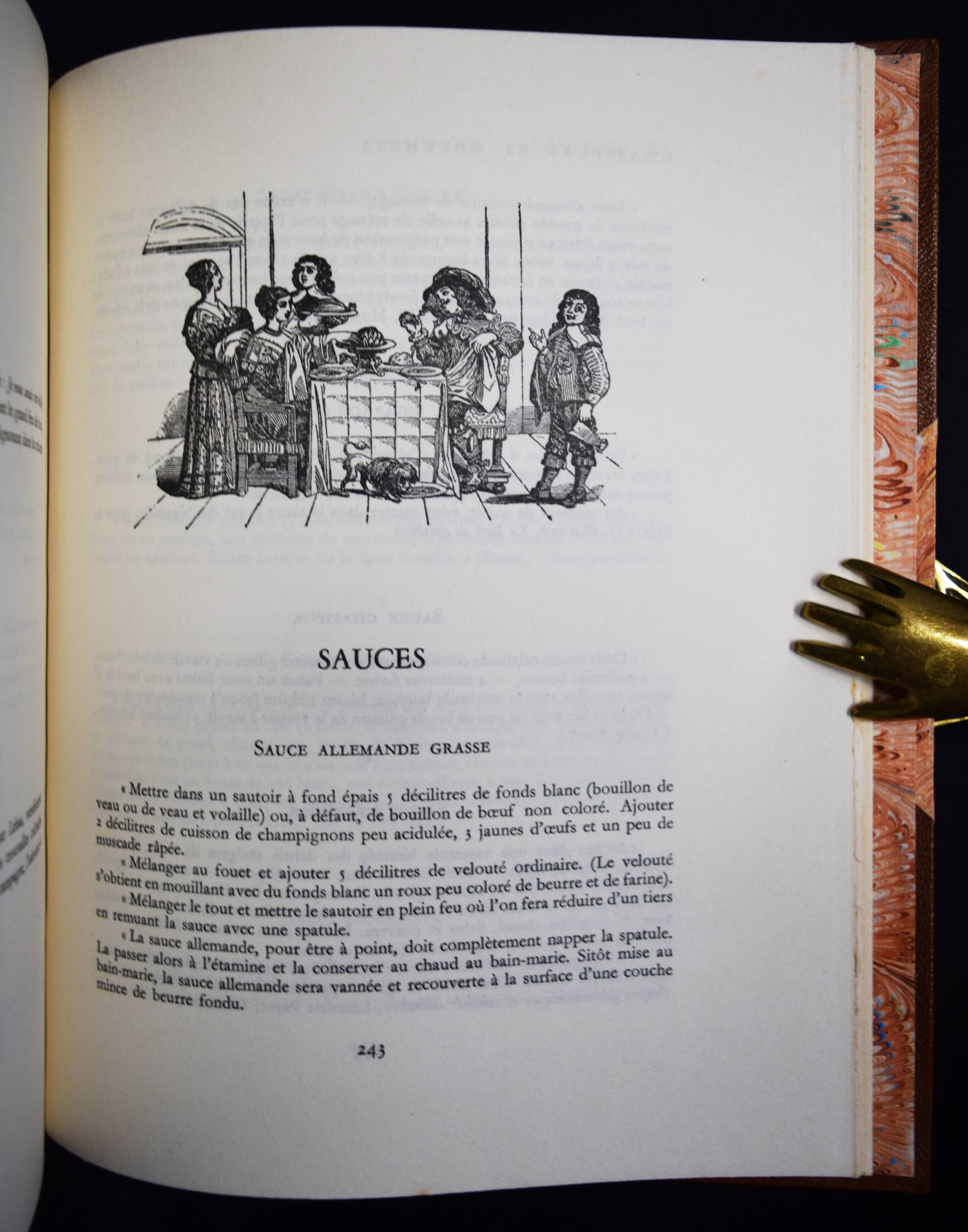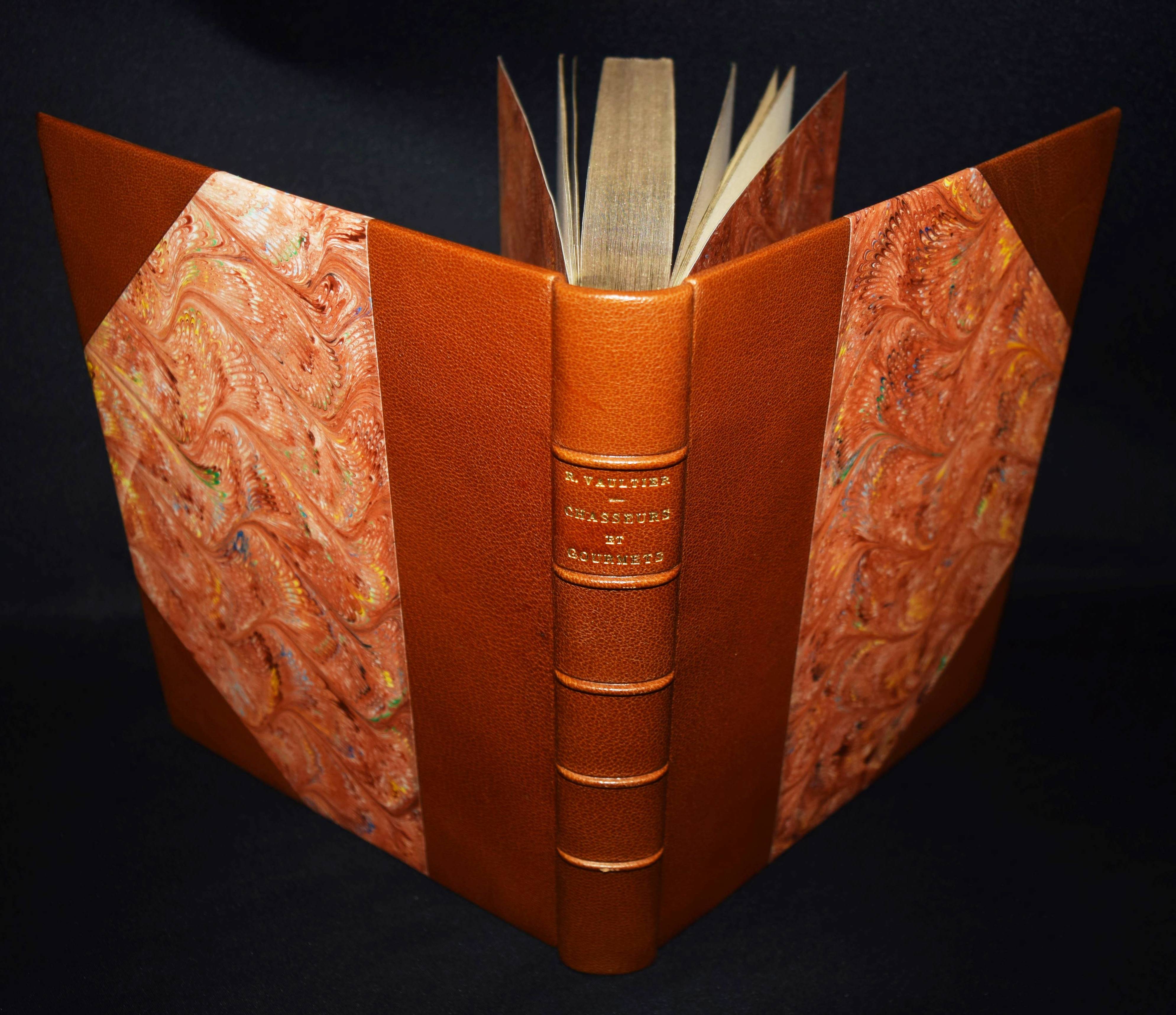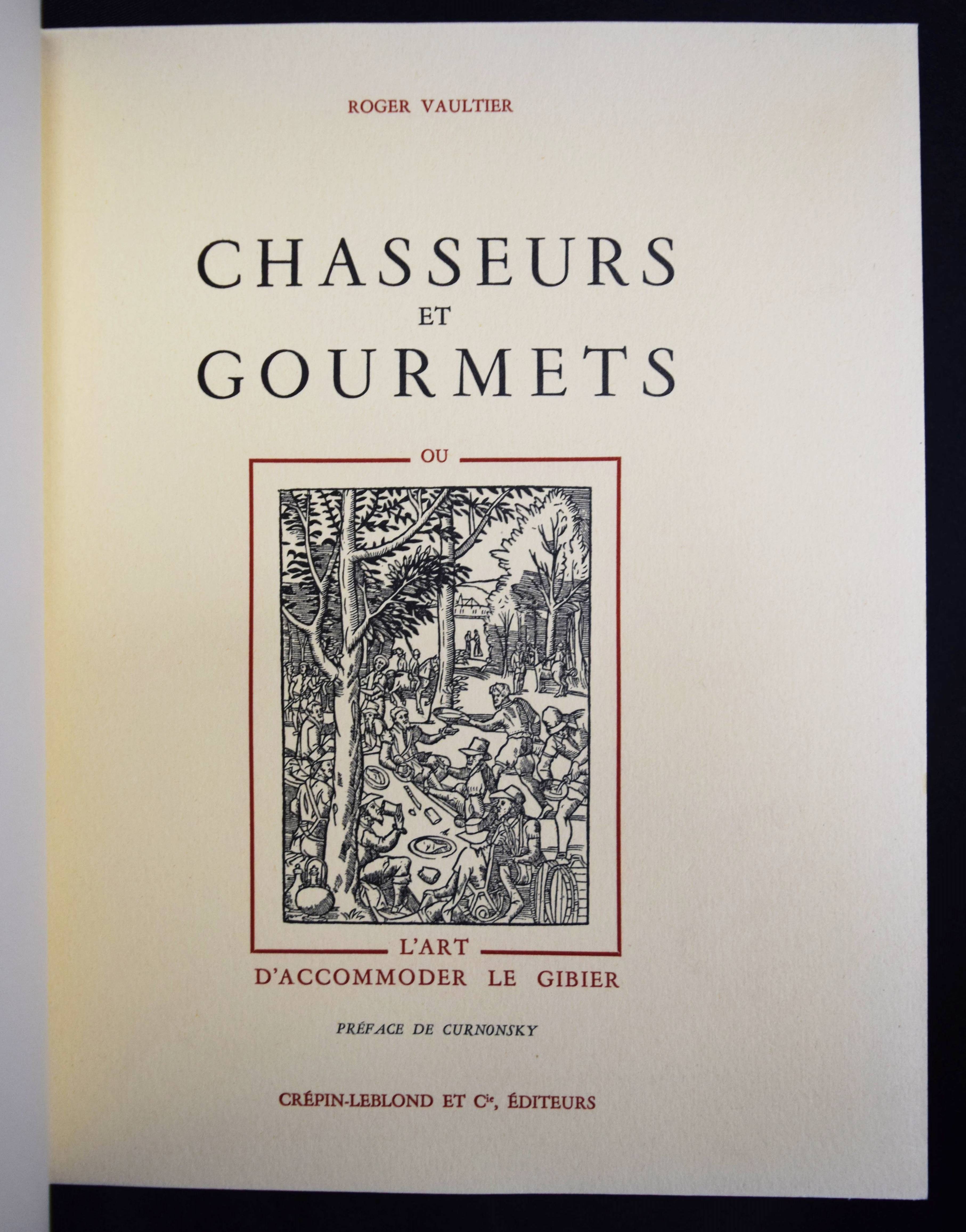 Vaultier, Roger Chasseurs et gourmets ou L’art d’accomoder le gibier. Préface de Curnonsky (d. i. Maurice-Louis Sailland). Paris, Crépin-Leblond et Cie. (1951). Gr.-8°. 256 S., [1] Bl. mit illustr. Titel und zahlr. Abb. Hldr. der Zeit mit goldgepr. Rückentitel und Kopfgoldschnitt (illustr. Orig.-Umschlag beigebunden). Eines von 2490 Exemplaren auf Papier Fleur d’Alfa (GA 2500 Exemplare). – Einzige Ausgabe des schön ausgestatteten Wild-Kochbuchs. – „Tayaut ! Tayaut ! Voici, plumes et poils, un des meilleurs recueils de recettes pour cuisiner le gibier: 32 bêtes à plumes ou parmi les gastronomiquement corrects canards, cailles, bécasses, gélinottes, ortolans et autres sarcelles on peut cependant hésiter devant les corbeaux, vanneaux, geais et pies.– Dans le poil aussi signalons quelques bizarreries: les blaireaux, loirs, loutres, loups (dont on peut dissimuler la chair dans les bouchées à la reine) et autres gibiers d’aventure viennent semer l’effroi parmi les lièvres à la royale, les filets mignons de sanglier à la sauce Robert et garennes à la Marengo.– Suivent des recettes de sauces, fonds et fumets“ (Préface). – R. Vaultier (1908-1960) hat zahlreiche Werke zum Thema Wein und Gastronomie herausgegeben. – Sehr schönes dekorativ gebundenes Exemplar.