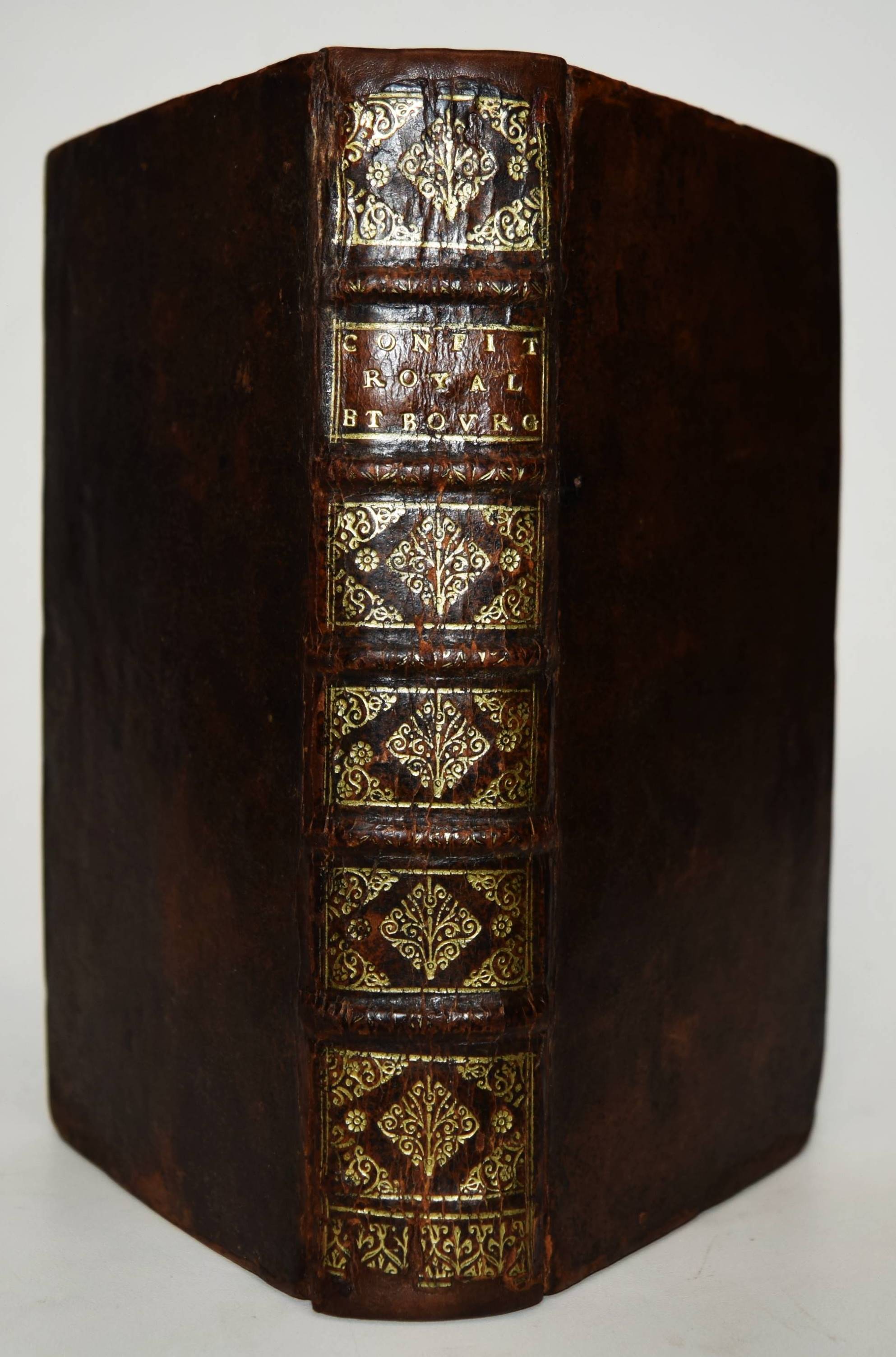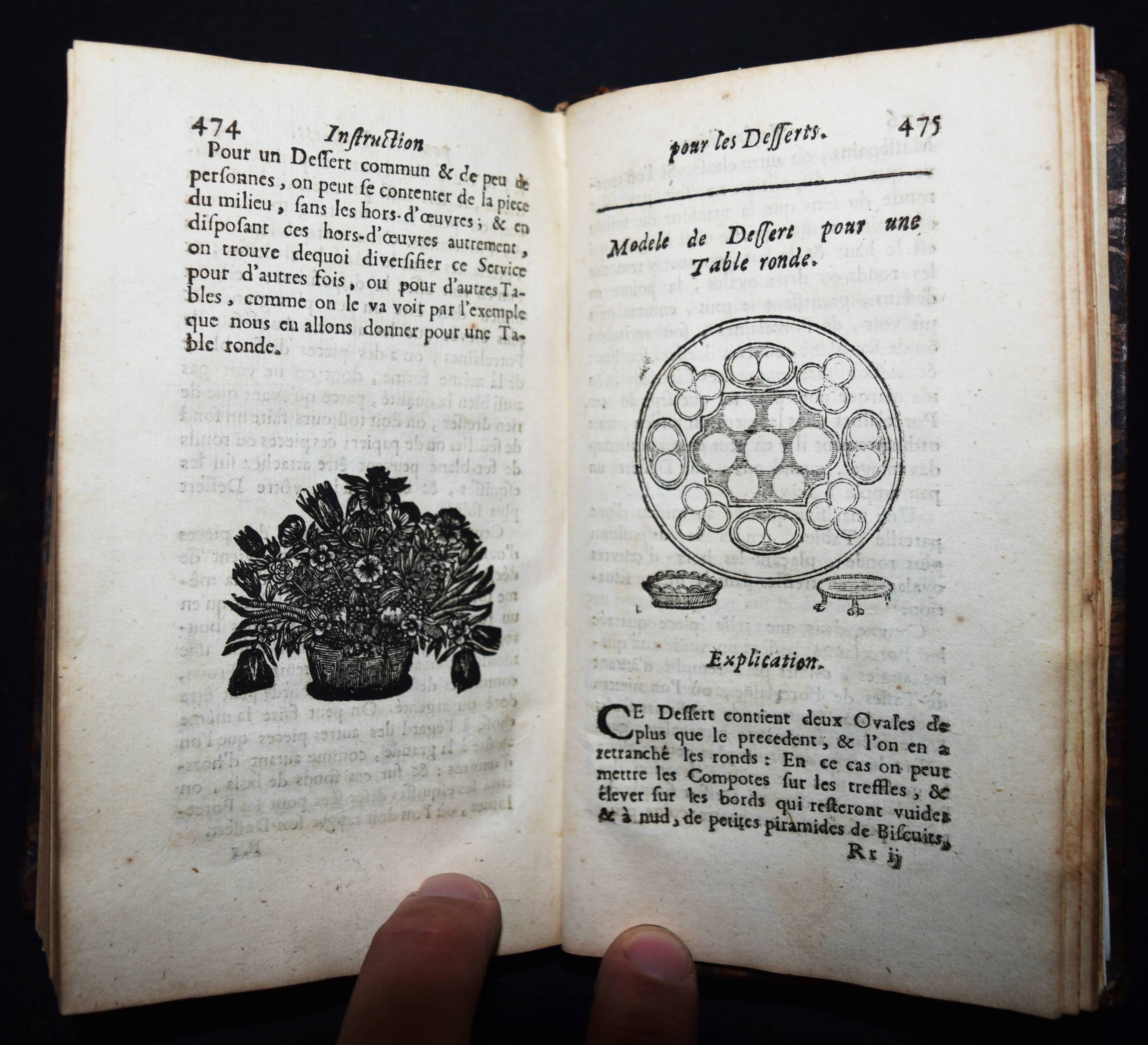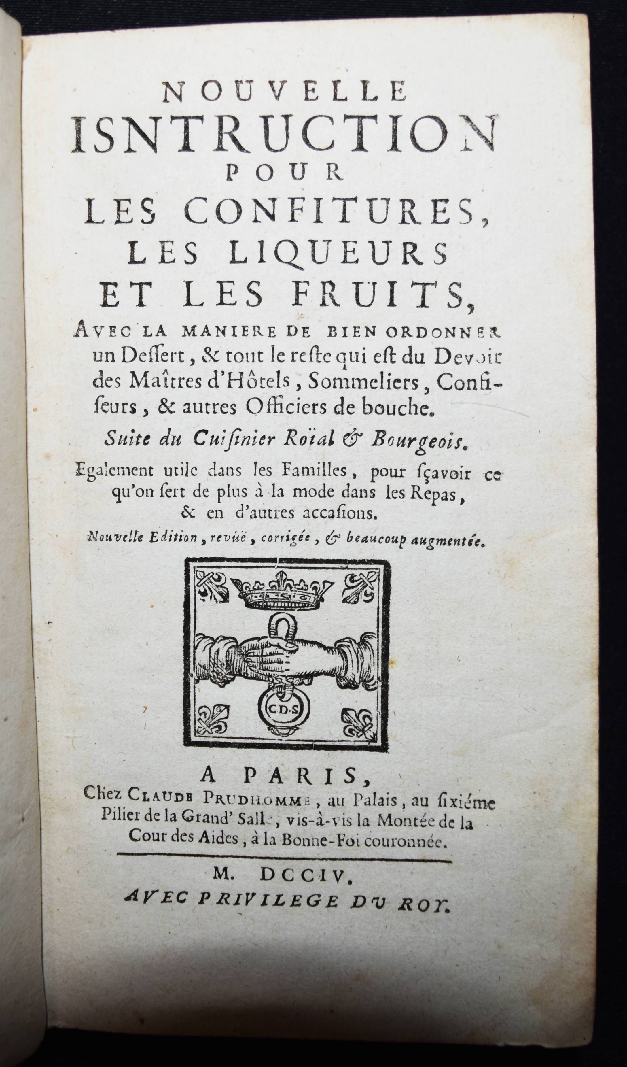 (Massialot, François). Nouvelle isntruction [sic !] pour les confitures, les liqueurs et les fruits. Avec la maniere de bien ordonner un dessert, & tout le reste qui est du devoit des maîtres d’hôtels, sommeliers, confiseurs, & autres officiers de bouche. Suite du cuisinier roial & bourgeois. Egalement utile dans les familles, pour sçavoir ce qu’on sert de plus à la mode dans les repas, & en d’autres accasions. Nouvelle Edition, revué, corrigée, & beaucoup augmentée. Paris, Claude Prudhomme 1704. Kl.-8° (17 x 10 cm.). [12] Bl., 480 S., [11 statt 12] Bl. mit 2 Holzschnitten im Text, 1 gefalt. Holzschnitt-Tafel und einigen Schmuck-Vignetten. Kalbslederband der Zeit mit goldgepr. Rückenschild und reicher floraler Rückenvergoldung. Bitting 584. Horn-Arndt 169 u. 170. Oberlé 78, 94 f. Vicaire 454. – Frühe Ausgabe des zuerst 1692 erschienenen berühmten franz. Dessert- und Konditor-Rezeptbuchs. Spätere Ausgabe erschienen mit dem Titel „Le Confiturier Royal“. Nach „Le cuisinier roïal et bourgeois“ das zweite erfolgreiche Kochbuch des berühmten Küchenchefs. – F. Massialot (1660-1733), seinerzeit der berühmteste Koch Frankreichs, er war Hofkoch zahlreicher bedeutender Persönlichkeiten des Adels, darunter Philippe I., Herzog von Orléans, der Bruder von Ludwig XIV., und dessen Sohn Philippe II., Herzog von Orléans. „Massialot beschreibt sich selbst in seinem Vorwort als „einen Koch, der es wagt, sich als königlich zu bezeichnen, und das nicht ohne Grund, denn die Mahlzeiten, die er beschreibt … wurden alle bei Hofe oder in den Häusern von Fürsten und Leuten ersten Ranges serviert.“ Zu den Orten, an denen Massialot Bankette gab, gehörten das Château de Sceaux, das Château de Meudon und Versailles. Eine Neuerung in Massialots Buch war die alphabetische Anordnung der Rezepte, „ein Schritt in Richtung des ersten kulinarischen Wörterbuchs“, bemerkt Barbara Wheaton. Wheaton hat die Änderungen in den verschiedenen Ausgaben von Massialot verglichen: Ein Glas Weißwein in einer Fischbrühe taucht überraschend spät auf, nämlich im Jahr 1703. Baisers tauchen unter ihrem bekannten Namen erstmals bei Massialot auf, dem auch die Crème Brûlée zugeschrieben wird, bei der die Zuckerglasur geschmolzen und mit einer glühenden Feuerschaufel verbrannt wurde“ (Wikipedia aus dem engl. Übersetzt). – Einband etwas berieben, das letzte Registerblatt (W-Z) und der hintere freie Vorsatz fehlen, gutes dekorativ gebundenes Exemplar.