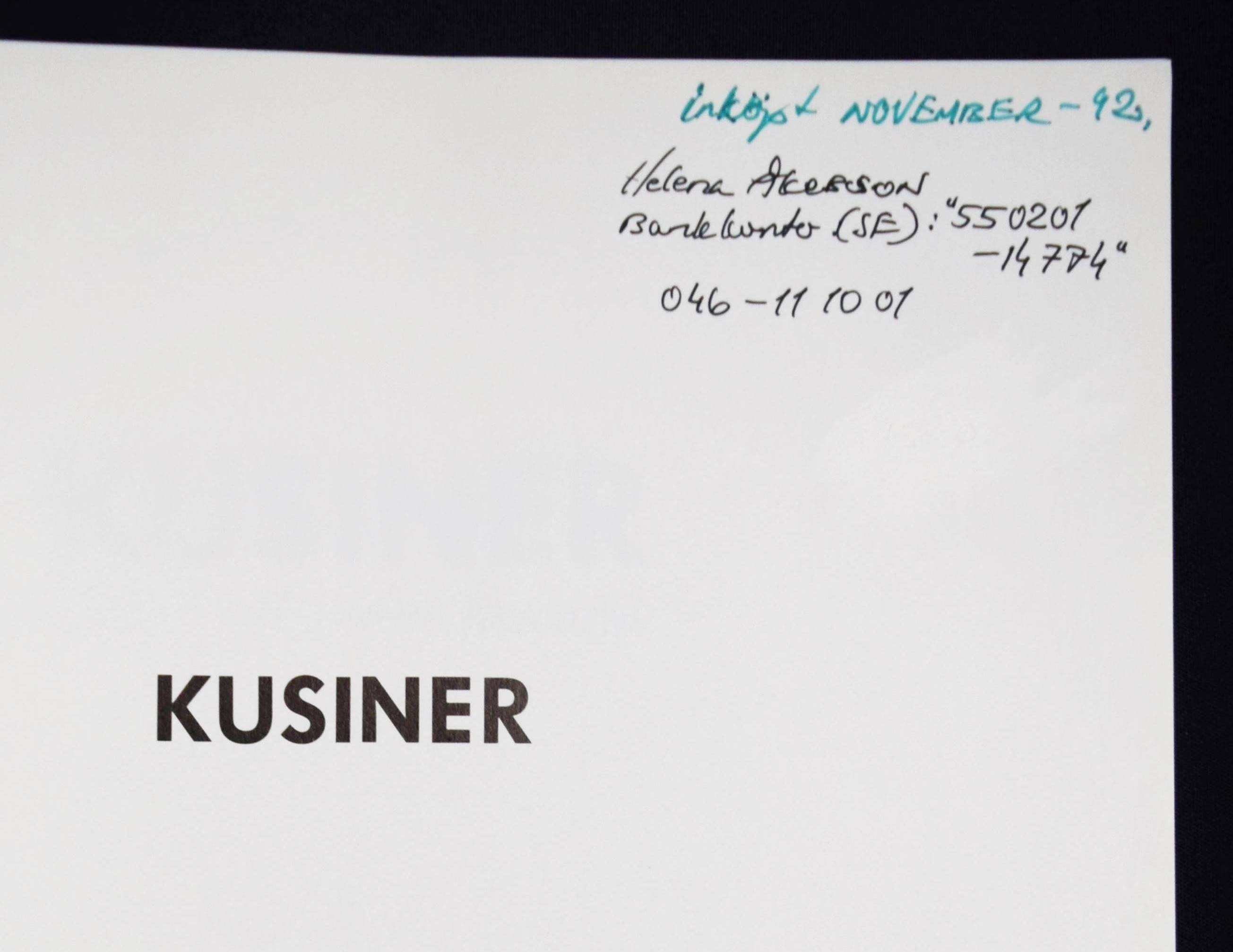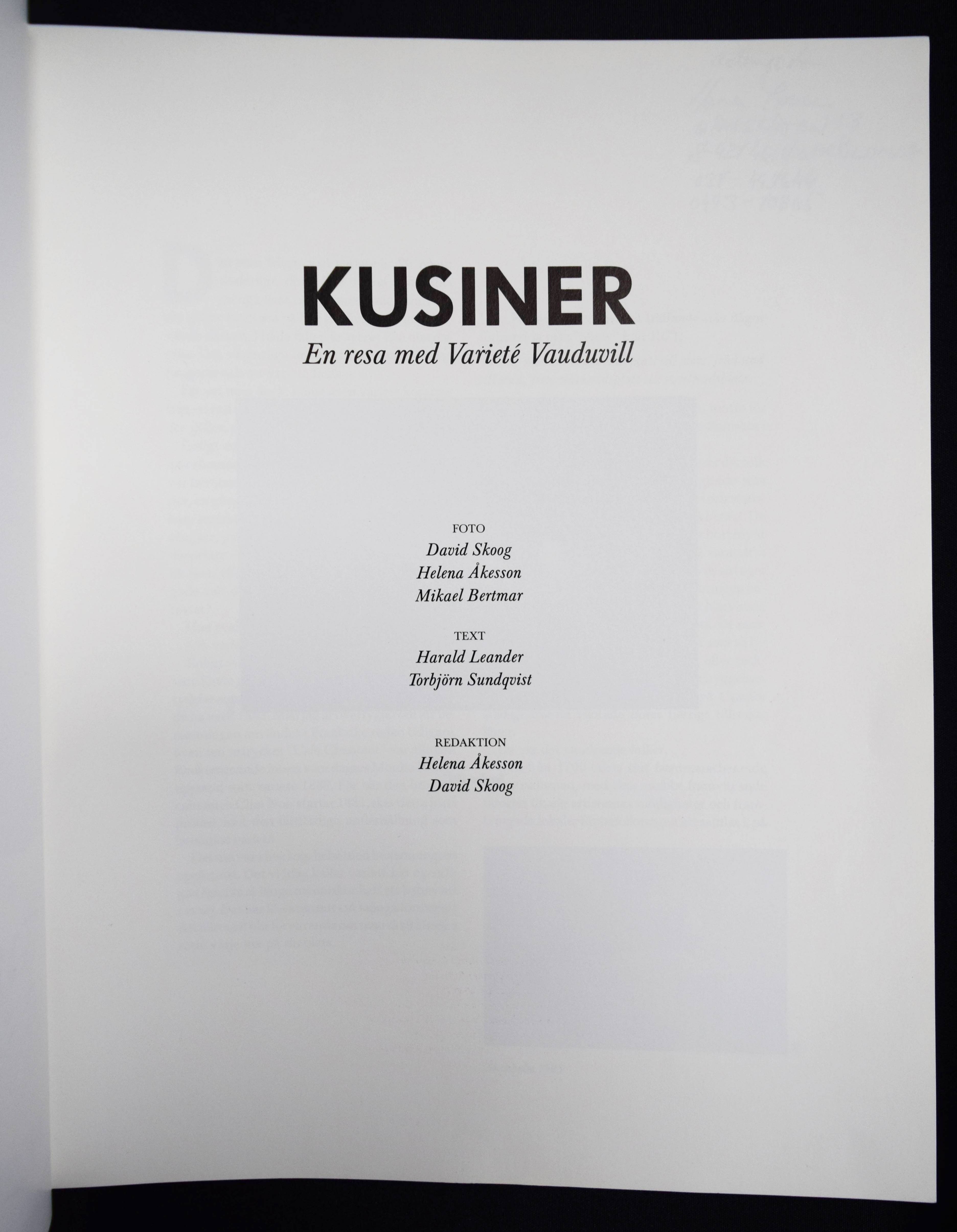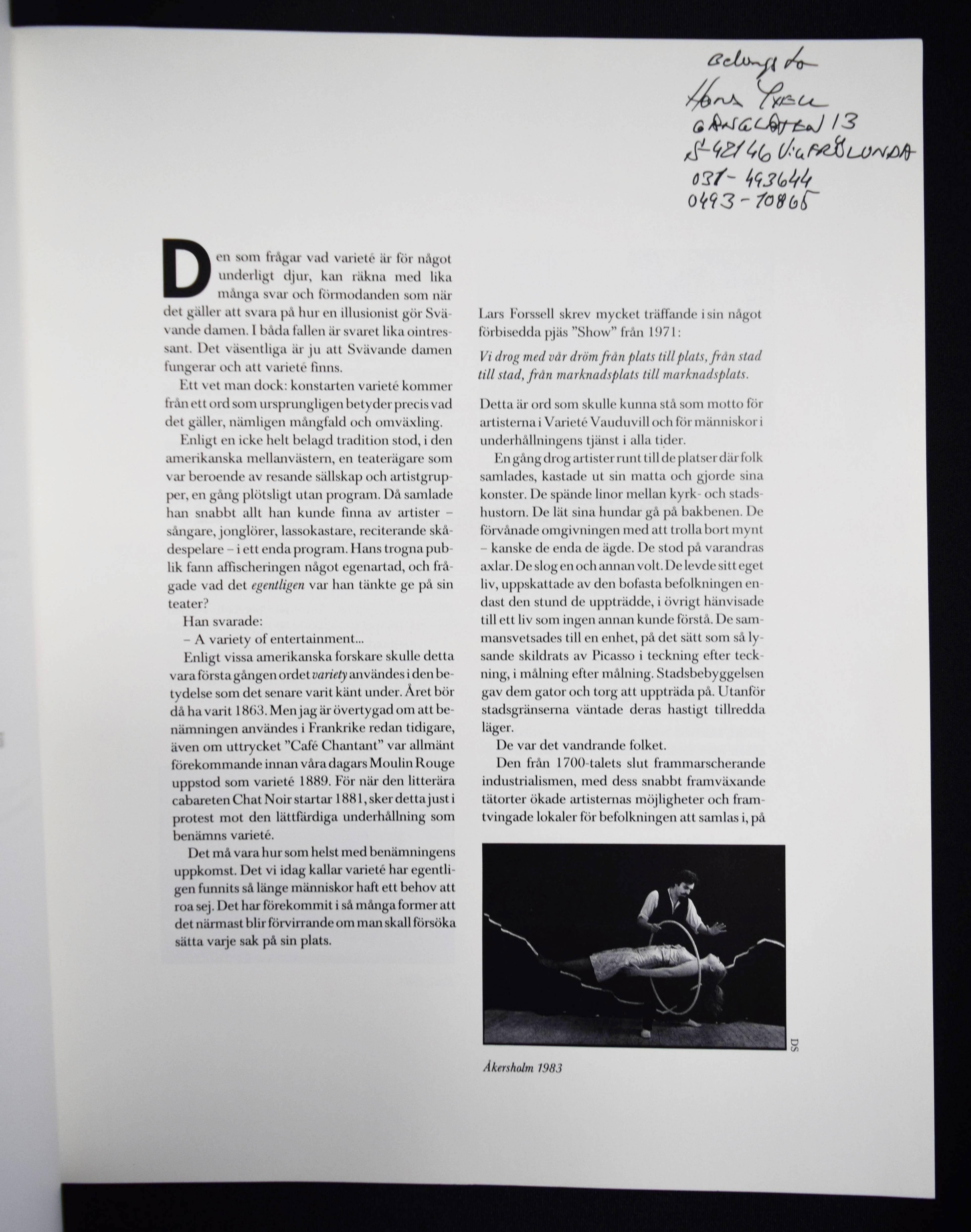 Akesson, Helena, Mikael Bertmar and David Skoog. Kusiner. En resa med Varité Vauduvill. Text: Harald Leander, Torbjörn Sundqvist. Redaktion: Helena Åkesson, David Skoog. Lund, Varité Vauduvill und Helena Åkesson (1991). 4°. [40] Bl. mit zahlr. teils farb. (1 doppelblattgr.) Abb. Farbig illustr. OKart. Von H. Akesson auf dem Vortitel signiert und auf der letzten Seite monogrammiert. – Interessante Foto-Dokumentation des schwedischen Varietéshow Vaudeville, die von 1982 bis 1995 jährlich im Sommer durch Schweden tourte und immer noch in unregelmäßigen Abständen auftritt. Die Truppe wurde in Ängelholm gegründet und umfasste Bauchtänzerinnen, Akrobaten und andere Künstler. Ziel war es, die alte Varieté-Tradition für ein modernes Publikum wiederzubeleben. Um 1979 begannen sie unter dem Namen Mr Hängbug’s magic Totalshow aufzutreten, der sich drei Jahre später in Kusin Hängbug’s Vauduvill und schließlich 1984 in Varieté Vauduvill änderte. Die Theatergruppe, bestehend u. a. aus Feuerschluckern und Schlangenbeschwörern wurde 1993 mit dem Malmö-Preis ausgezeichnet. – H. Akesson arbeitet heute als Interior-Designerin und Produkt-Fotografin. – Mit größerem Besitzvermerk auf dem Vortitel, gutes Exemplar.