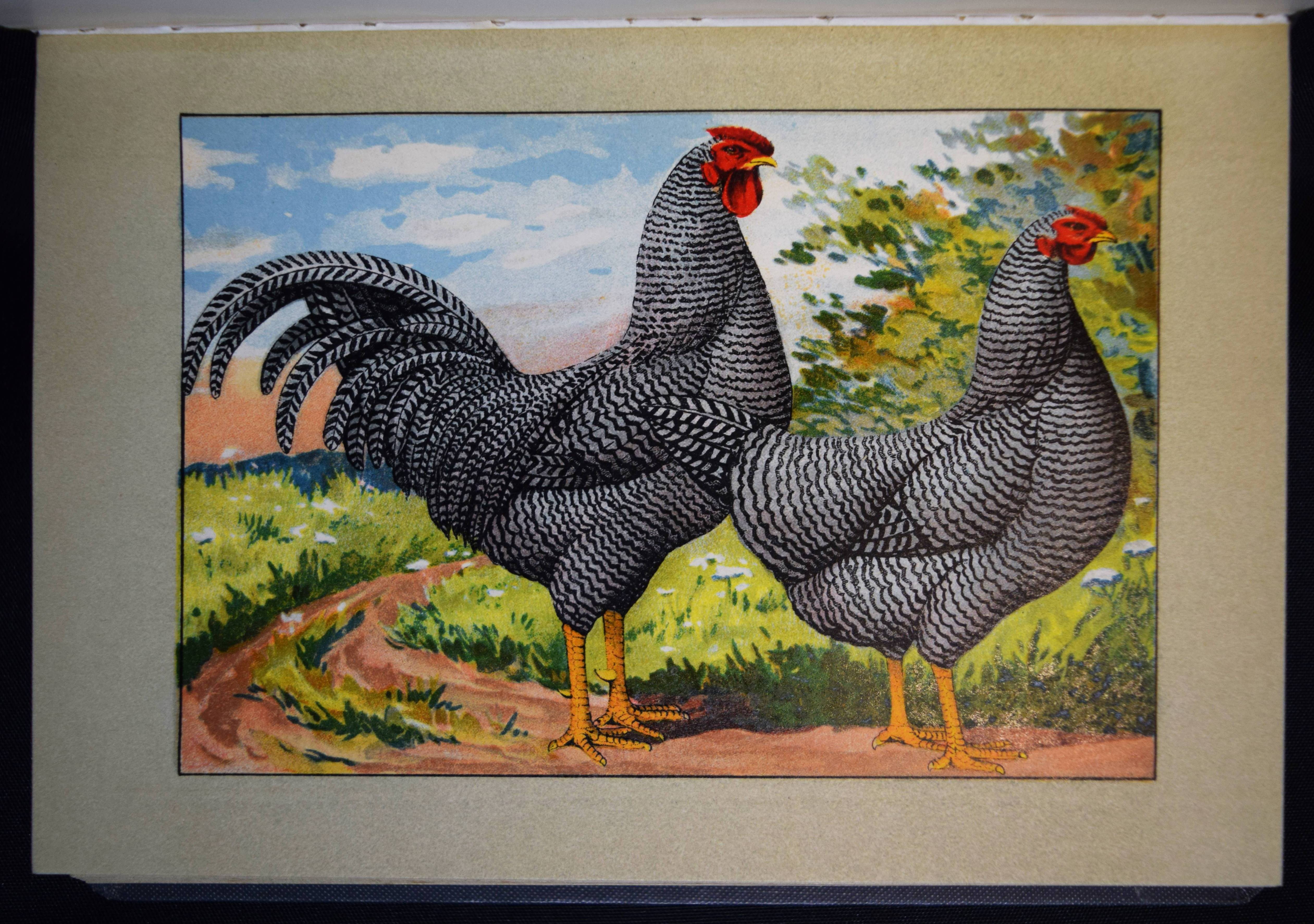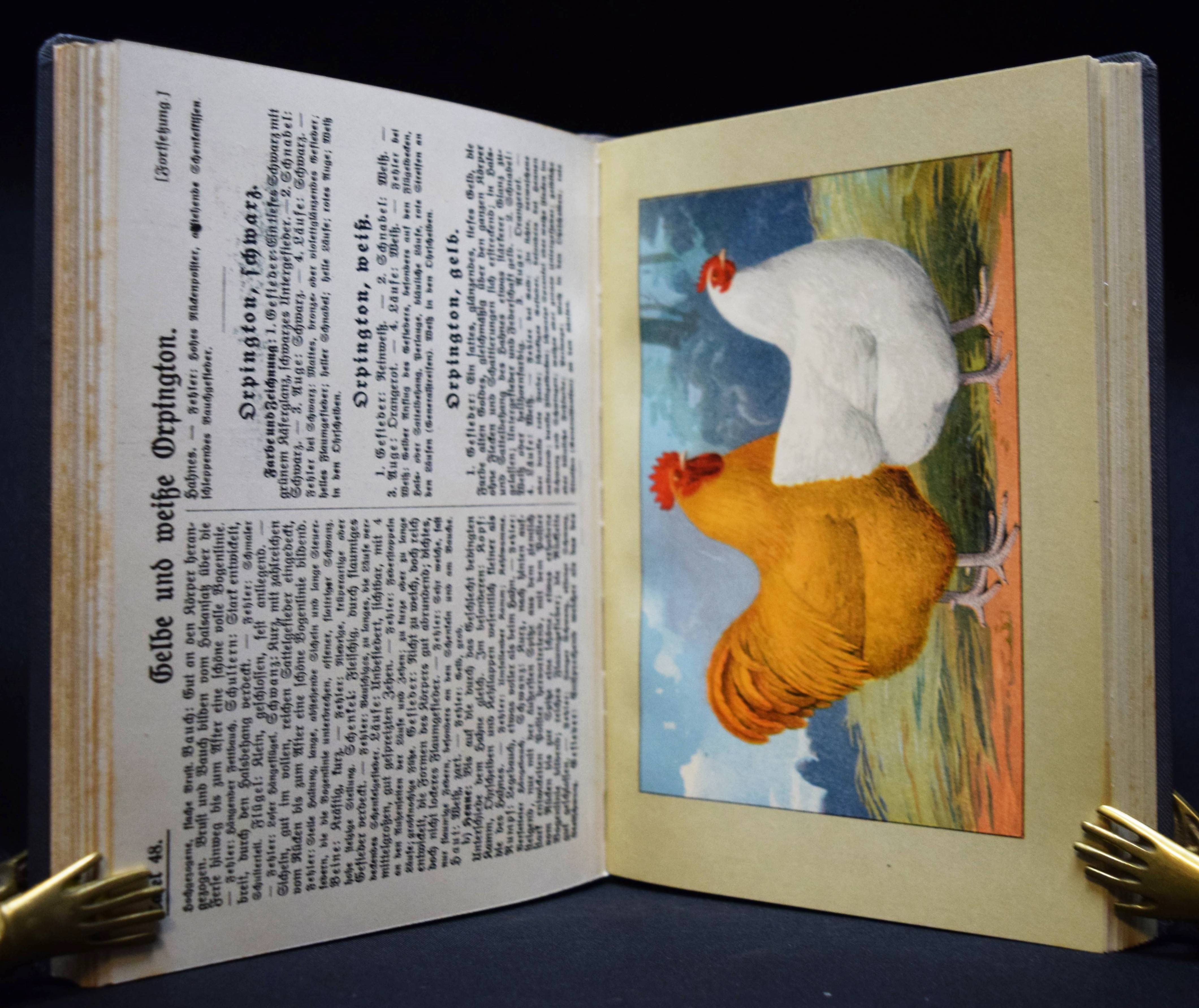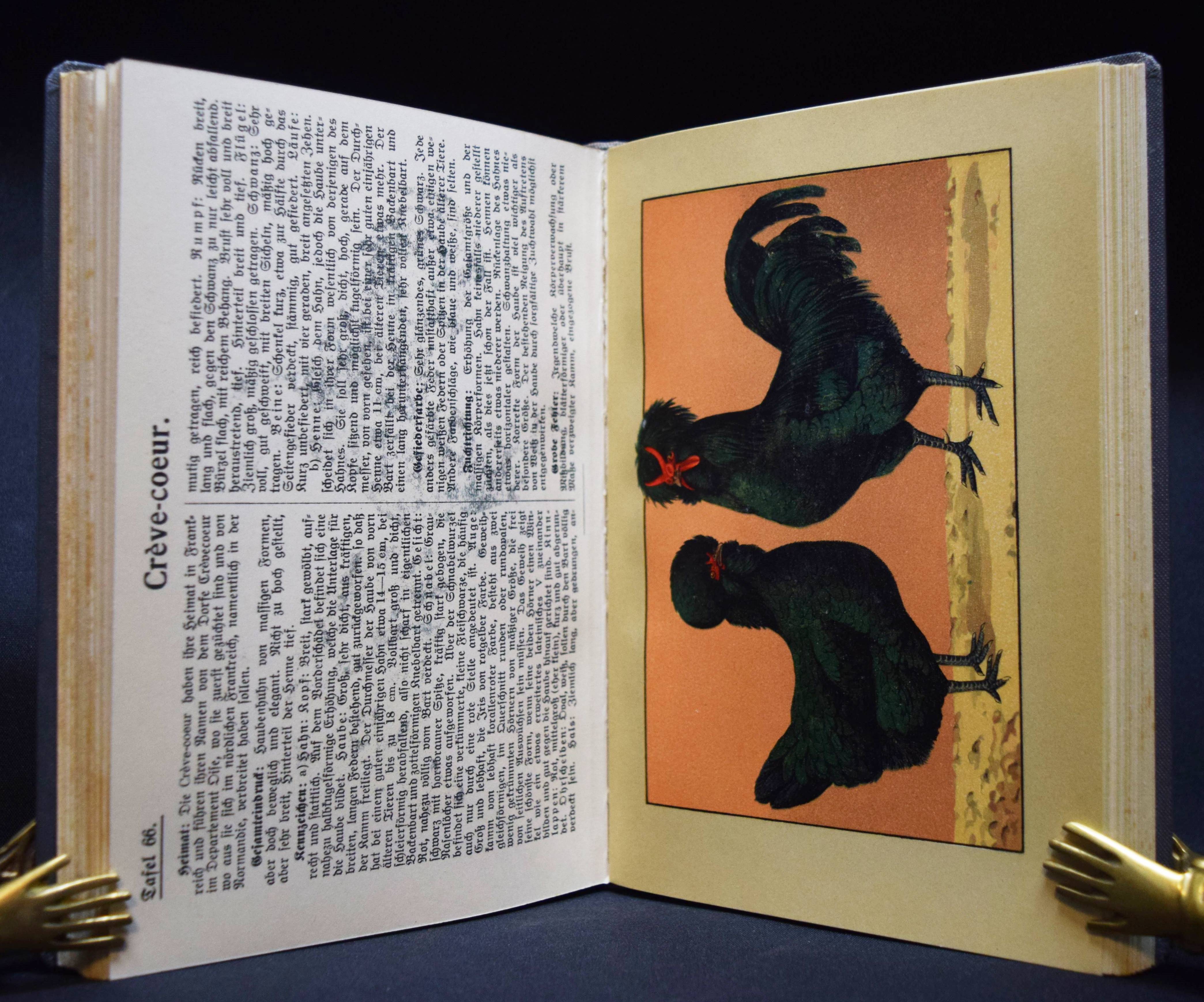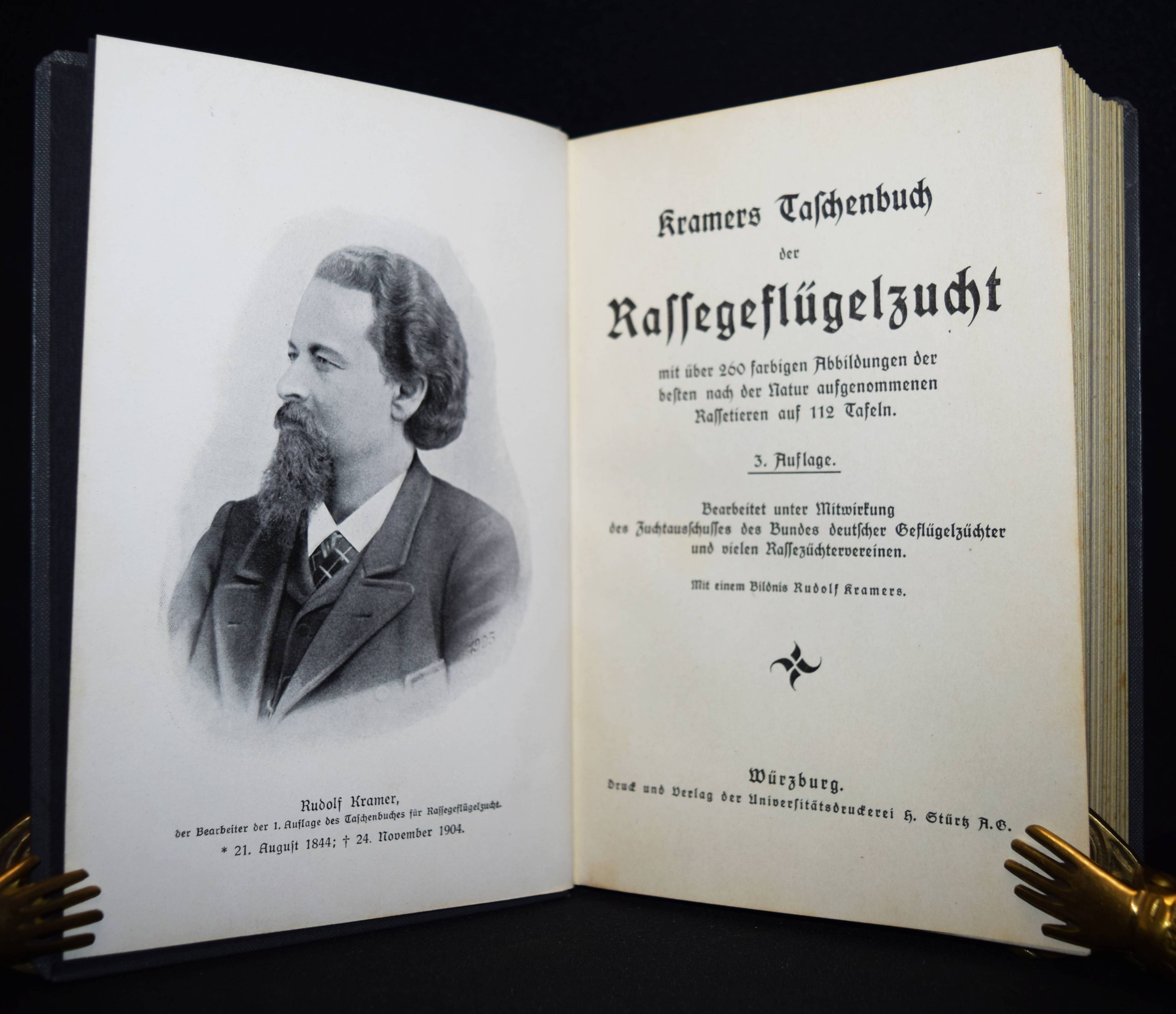 Kramer, Rudolf. Taschenbuch der Rassegeflügelzucht. Mit über 260 farbigen Abbildungen nach der Natur aufgenommenen Rassetieren auf 112 Tafeln. 3. Auflage bearbeitet unter Mitwirkung des Zuchausschusses des Bundes deutscher Geflügelzüchter und vielen Rassezüchtervereinen. Würzburg, Verlag der Universitätsdruckerei H. Stürtz (1926). 8°. 14 S., [1] Bl. mit 1 Portrait und 112 chromolithogr. Tafeln. OLn. mit Deckelvignette in Orig.-Pappschuber. Beste, da umfangreichste Ausgabe. Mit Vorworten von H. du Roi, R. Kramer, Erich Klein und Emil Schachtzabel. – „Als „Der Kramer“ wurde das Buch zu einem Standardwerk der Geflügelzucht. Im Gegensatz zu anderen Werken enthielt das Buch in der Erstauflage erstmals neben Beschreibungen auch farbige Abbildungen, die von verschiedenen Künstlern angefertigt wurden. Es gilt als erster Zuchtstandard der deutschen Rassegeflügelzucht und wurde auch international in Fachkreisen rezipiert“ (Wikipedia). – Wenige Tafelrückseiten mit den Beschreibungen mit Abklatschspuren der chromolithogr. Tafeln, sehr gutes vollständiges und sauberes Exemplar.