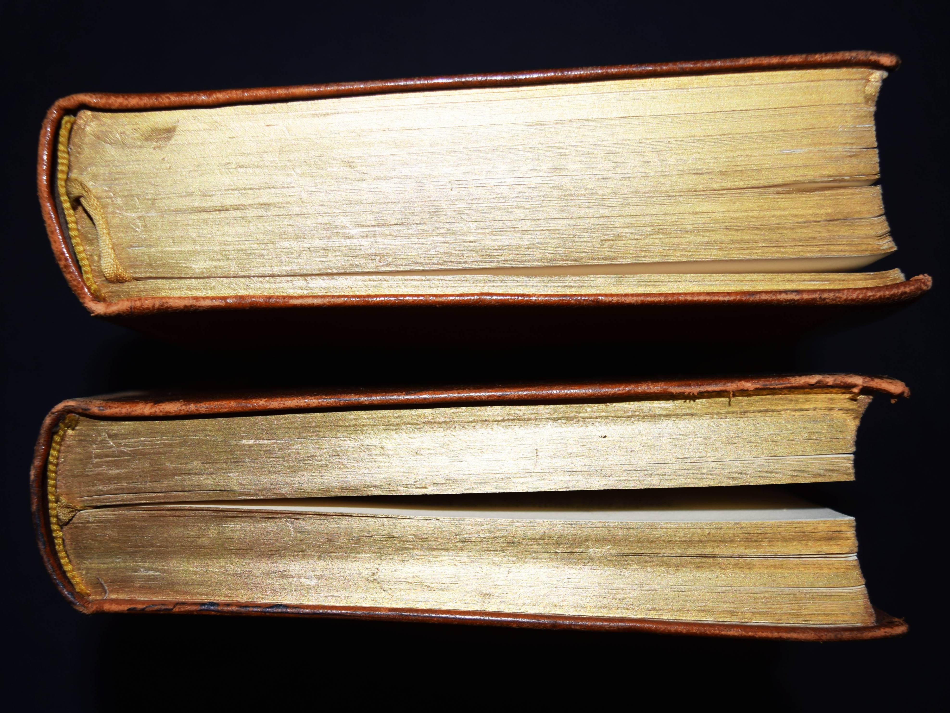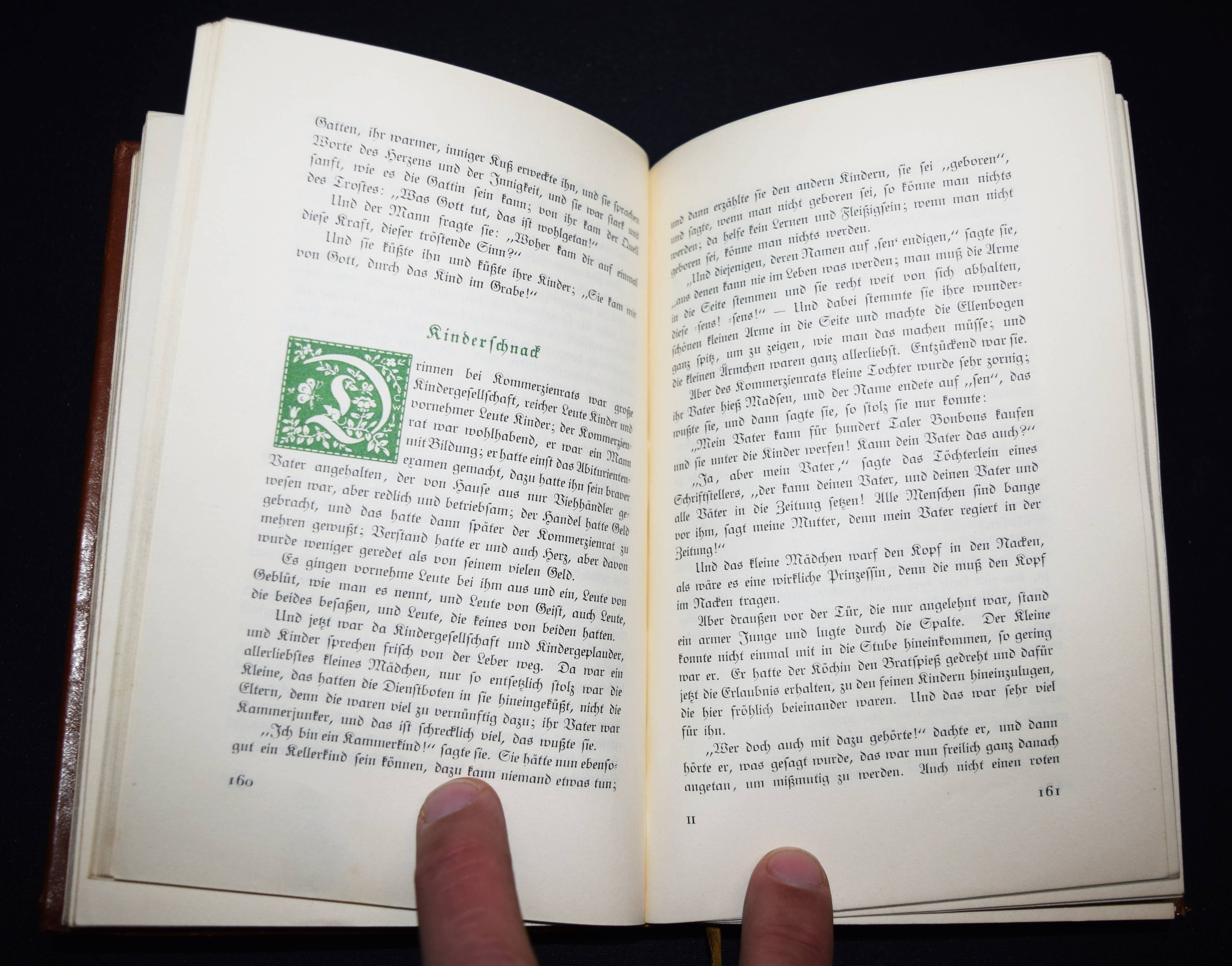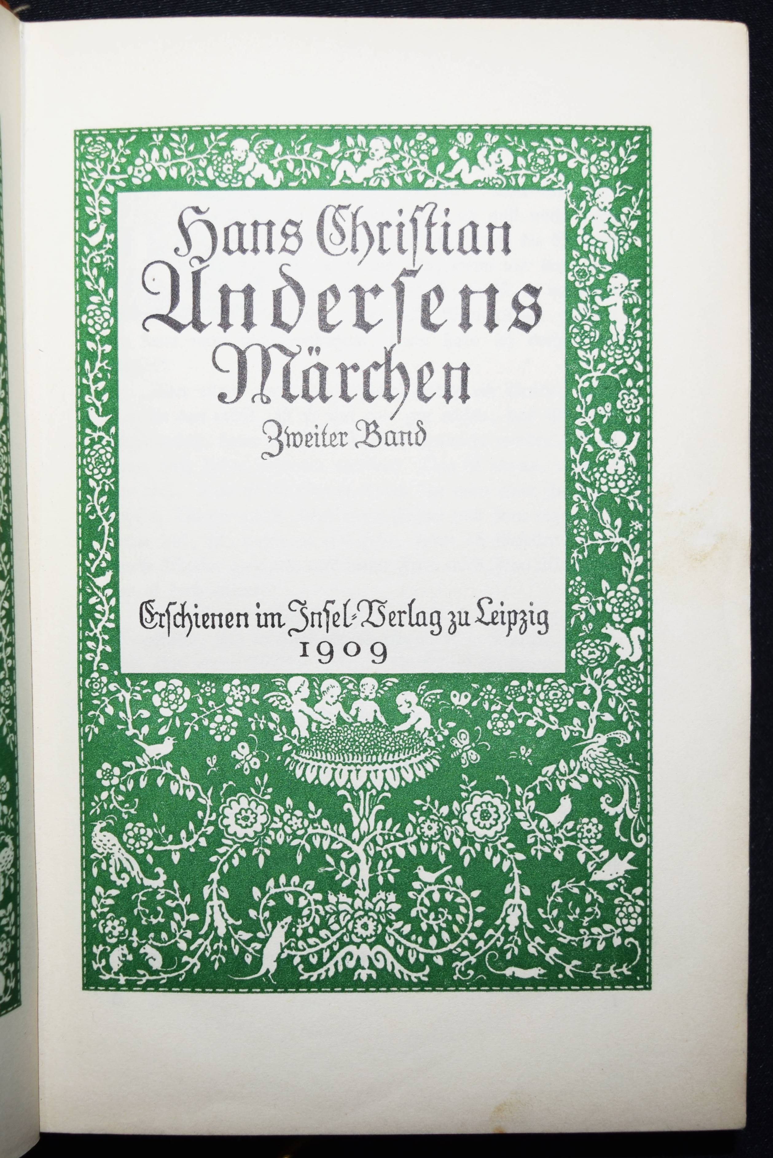Andersen, Hans Christian. Märchen. (Mit einer biographischen Einleitung von Sophus Bauditz. Ins Deutsche übertragen von Mathilde Mann). 2 Bände. Leipzig, Insel 1909. 8°. XXII, 1 Bl., 556 S., 2 Bl.; 2 Bl., 549 S., 1 Bl. mit illustr. Titeln, 2 Frontisp. u. illustr. Initialen von Carl Wiedemeyer-(Worpswede). Orig.-Kalbldr. mit goldgepr. Rückentitel, reicher Rückenverg. u. Deckelvignetten sowie Kopfgoldschnitt. Klotz 111/199. Sarkowski 21. – Erste Ausgabe dieser Übersetzung. – Rücken minimal berieben, schönes Exemplar der Luxusausgabe in Ganzleder.