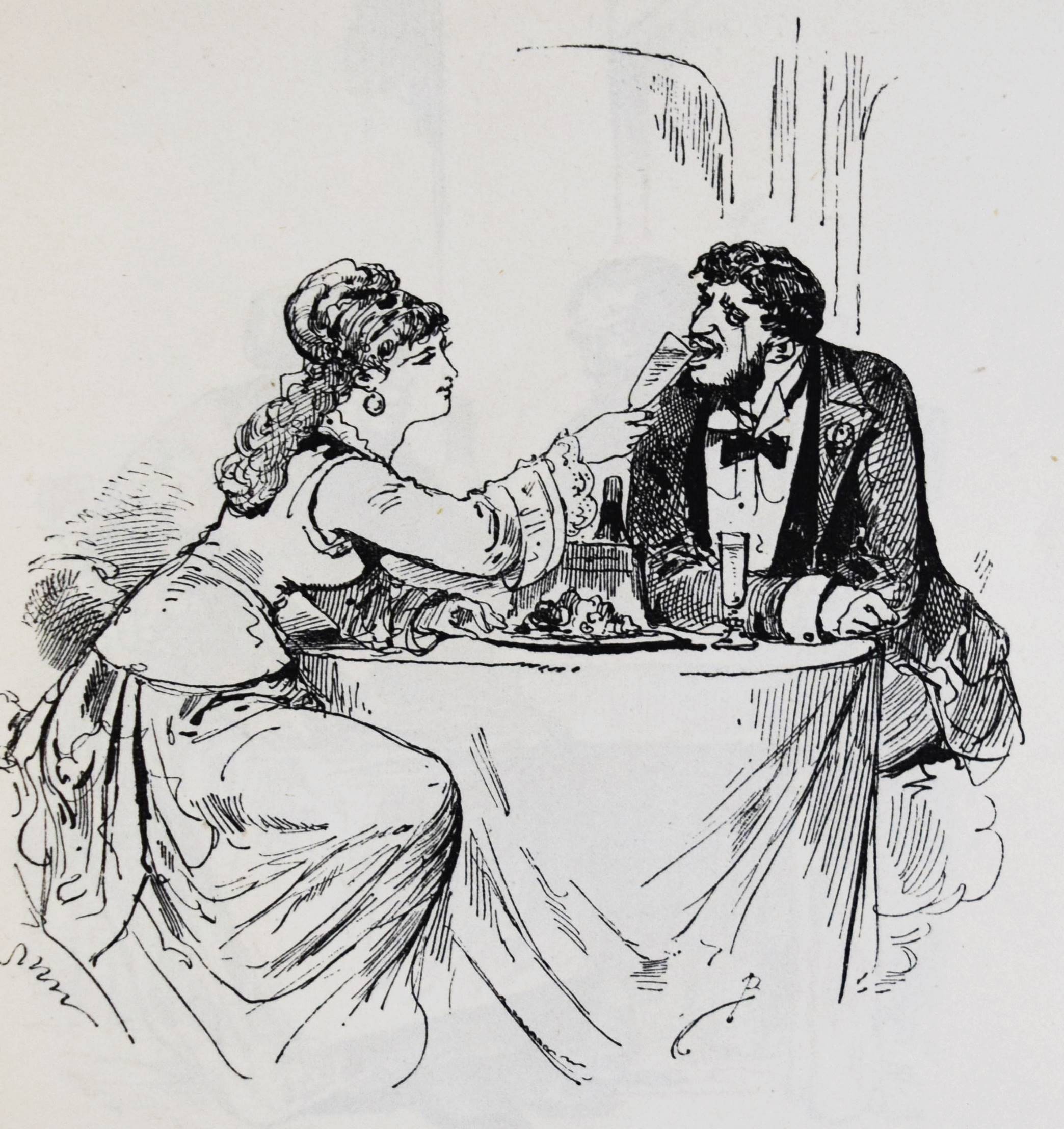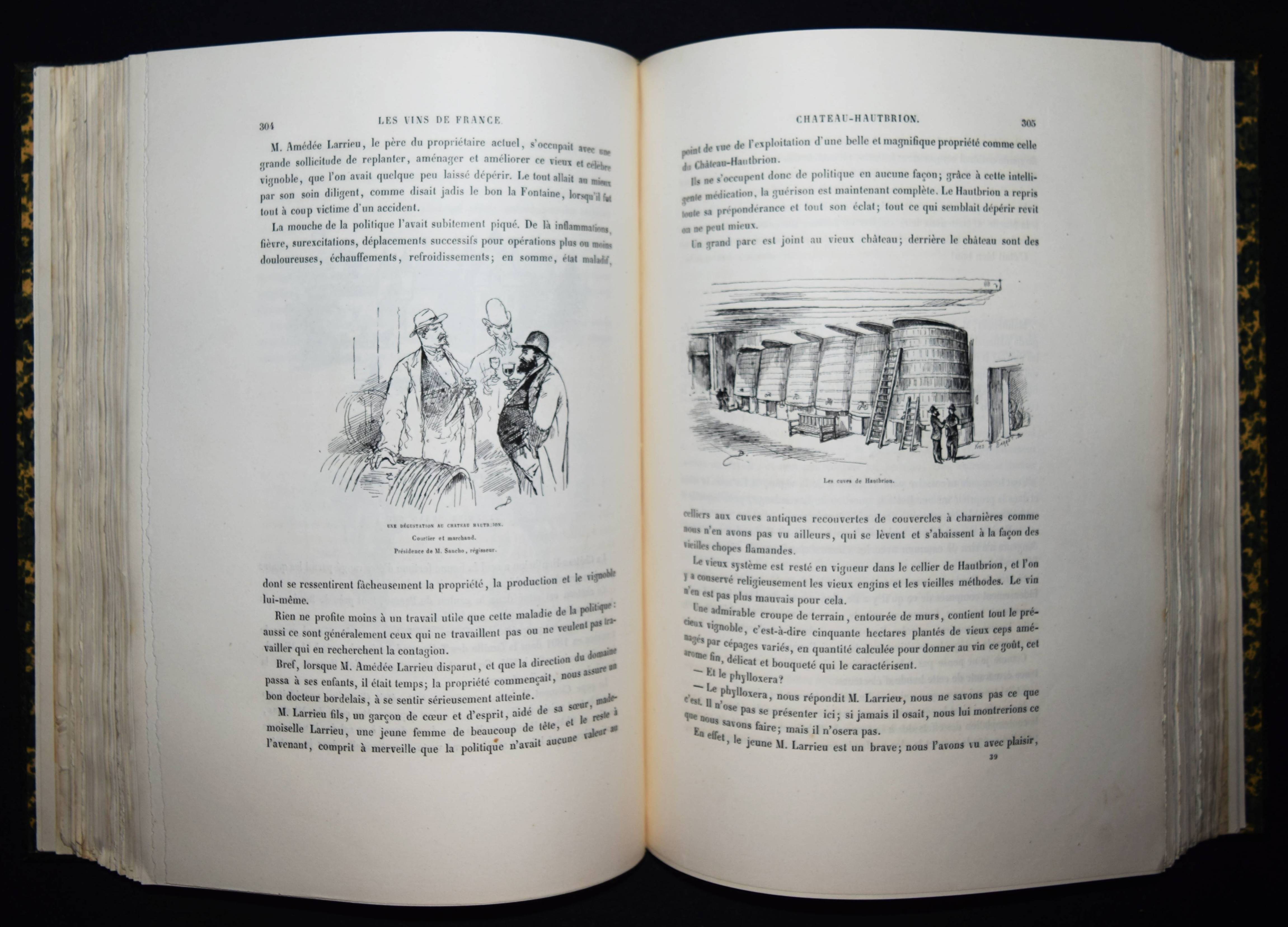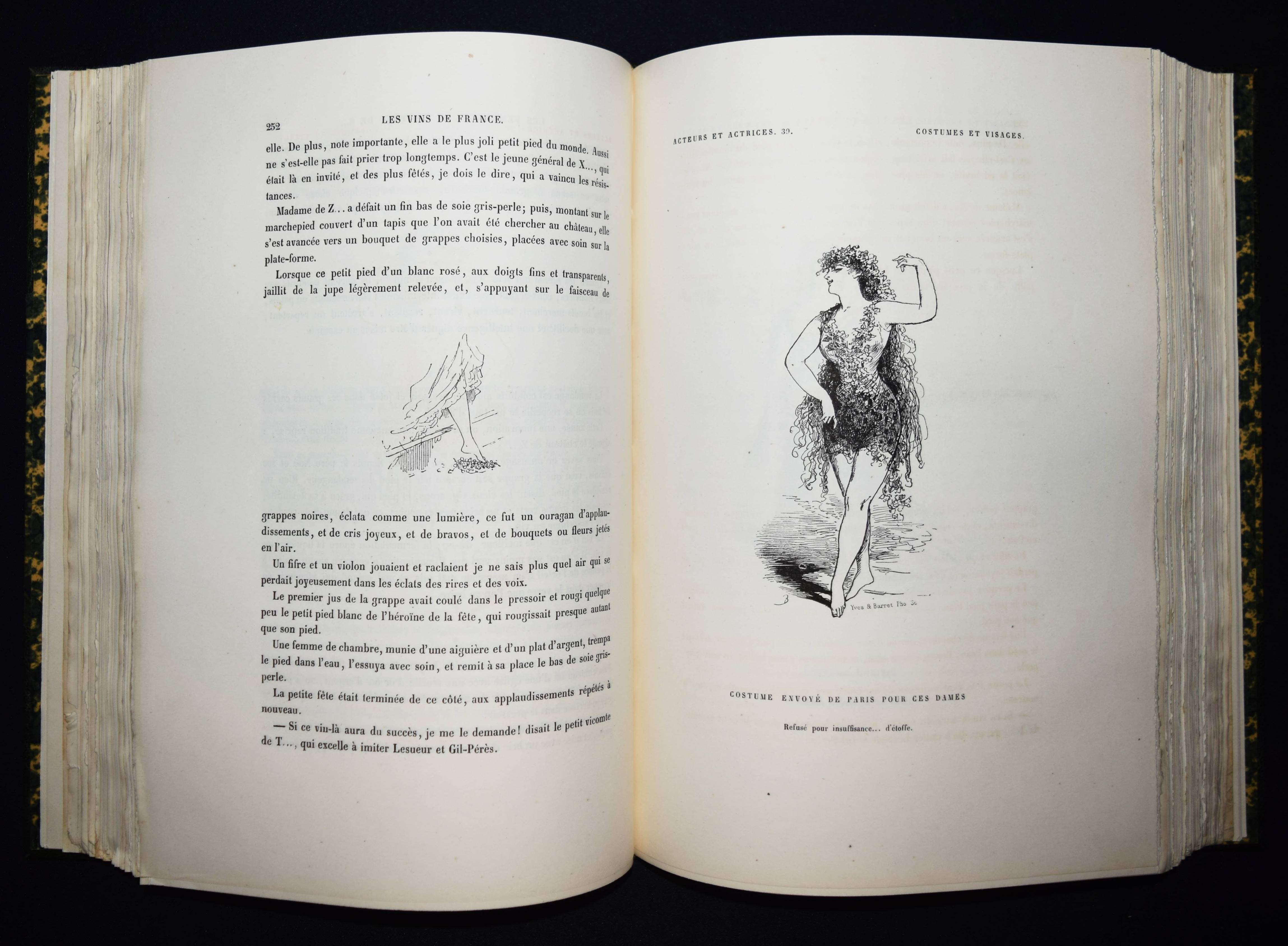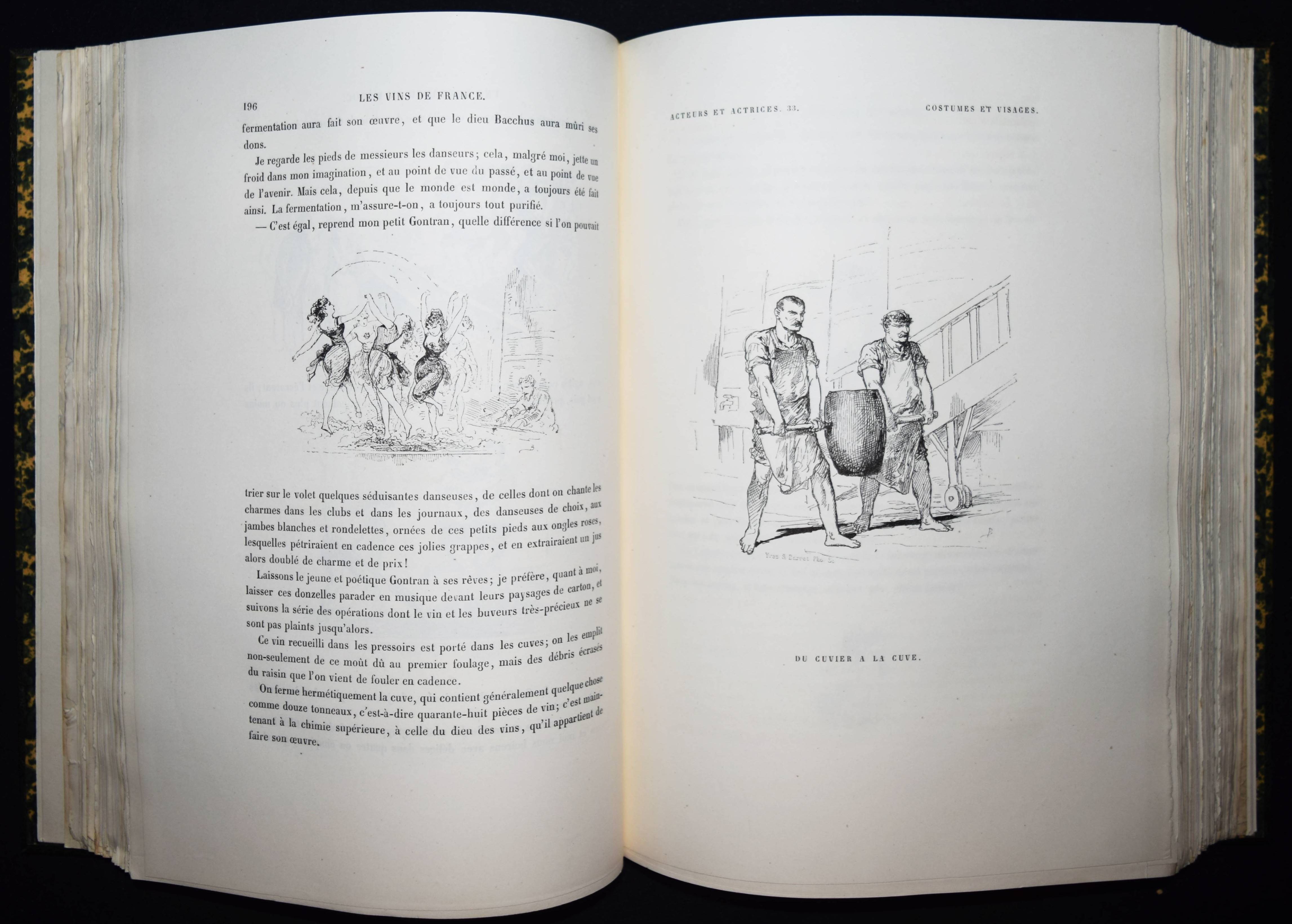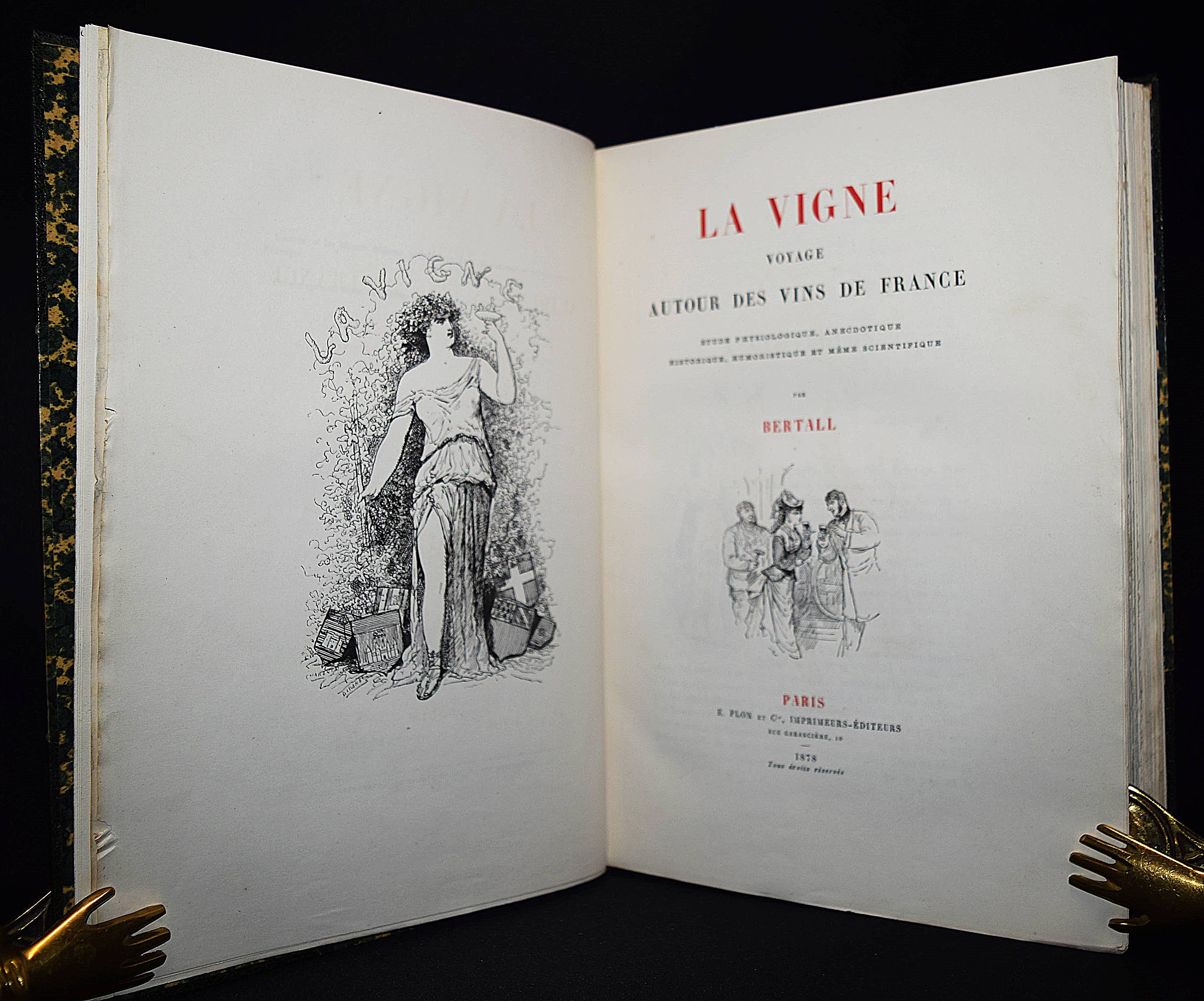 Bertall (d. i. Charles Albert d’Arnoult). La Vigne. Voyage autour des vins de France. Etude physiologique, anecdotique, historique, humoristique et meme scientifique. Paris, E. Plon et Cie. 1878. 4°. [2] Bl., 659 S. mit Frontispiz, Titel in Rot und Schwarz mit Titelvignette, 94 Holzschnitt-Tafeln und zahlr. Vignetten im Text. Dunkelgrüner Halbmaroquin-Ledereinband mit goldgepr. Rückenschild, Deckelfiletten und Kopfgoldschnitt (signiert: (Ateliers) Lobstein-Laurenchet, illustr. Orig-Umschlag beigebunden) in marm. Pappschuber. Bitting 38. Sander 99. Schraemli 50. Simon 110. Vicaire 87. Vicaire (XIXe) I, 440. Nicht bei Schoene. – Erste Ausgabe. – „The book is exceptional“ (Bitting). – „Le spirituel caricaturiste passe en revue les différents crus de la Bourgogne, de la Gironde et de la Champagne et conte avec beaucoup d’humour, une foule d’anecdotes amusantes sur les vins, les vignes, les vignerons, les propriétaires et les dégustateurs“ (G. Vicaire). – Sehr schönes Exemplar in einem prachtvollen Handeinband.