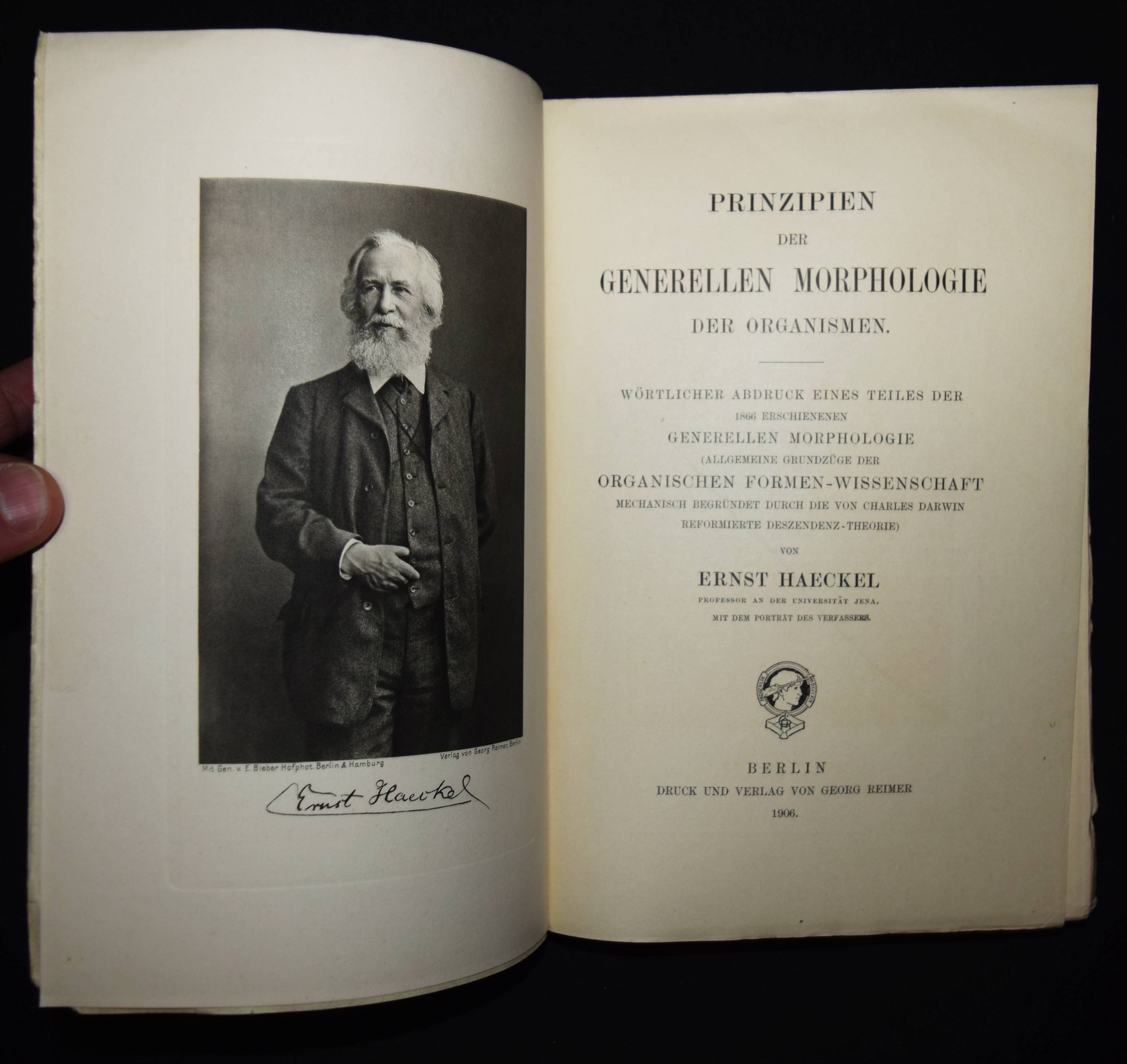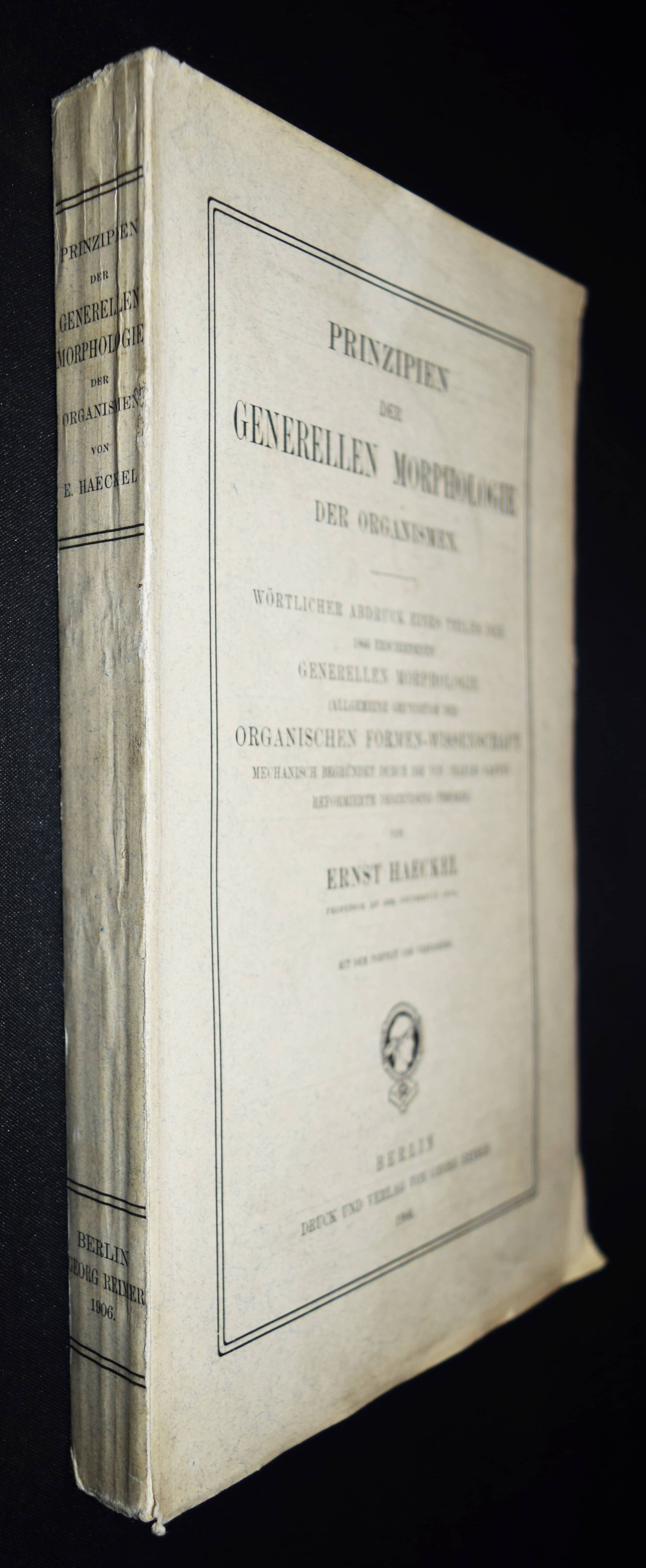 Haeckel, Ernst. Prinzipien der generellen Morphologie der Organismen. Wörtlicher Abdruck eines Teiles der 1866 erschienenen „Generellen Morphologie (Allgemeine Grundzüge der organischen Formen-Wissenschaft, mechanisch begründet durch die von Charles Darwin reformierte Deszendenz-Theorie)“. Berlin, Georg Reimer 1906. Gr.-8°. XVI, 447 S. mit Titel-Portrait. Typogr. OKart. Erste Ausgabe. – Erste Separat-Ausgabe. – Sehr gutes oben nicht aufgeschnittenes Exemplar.