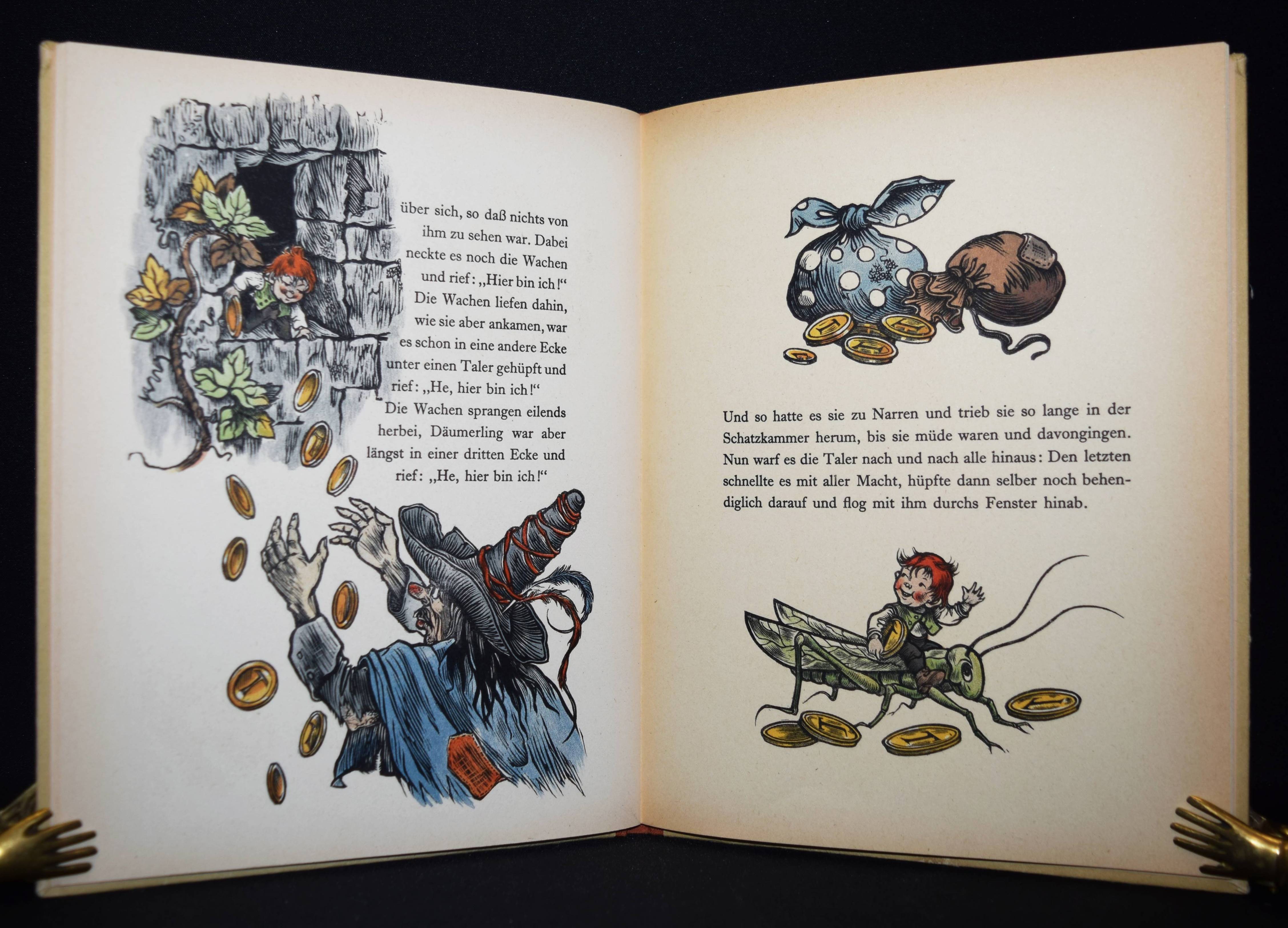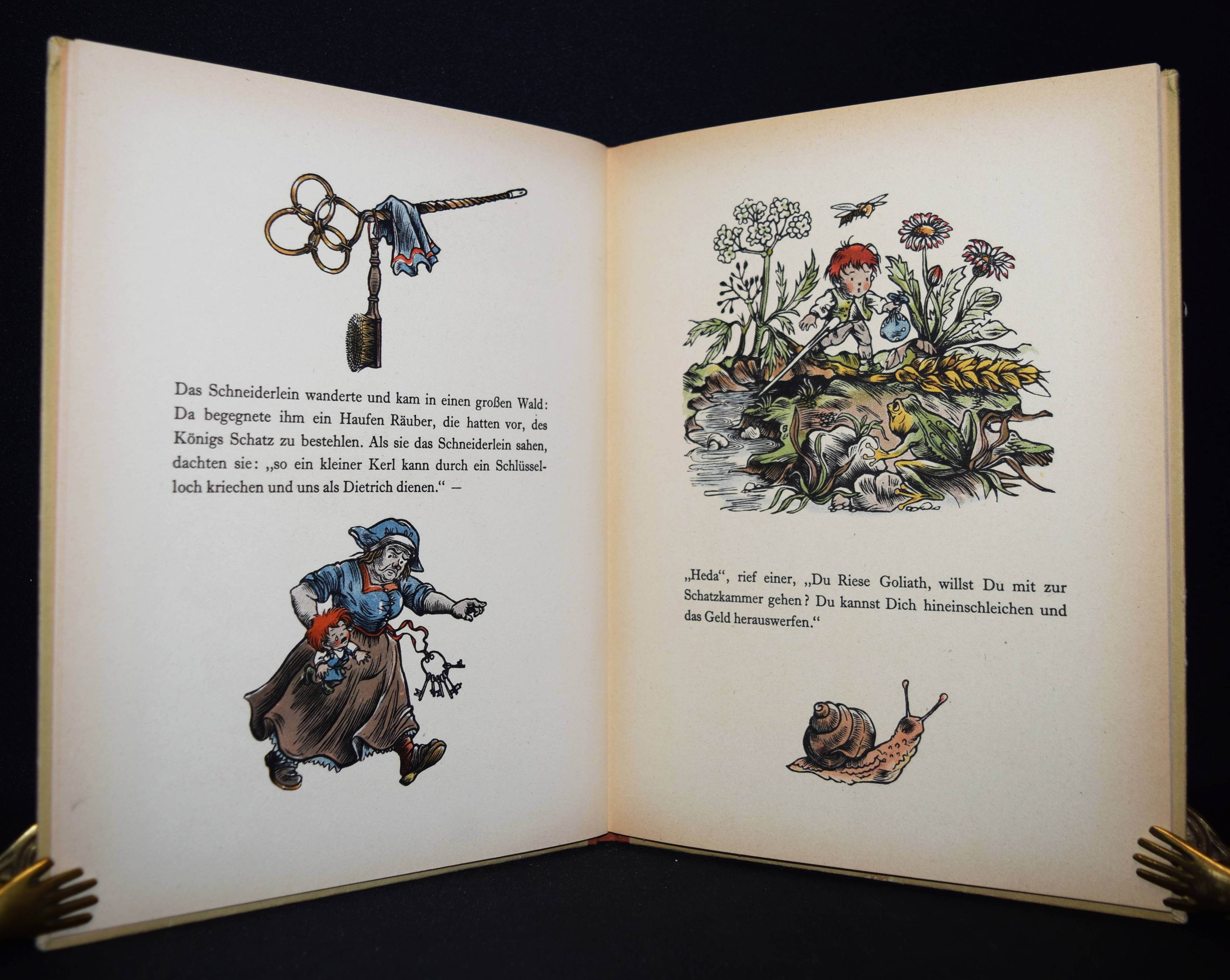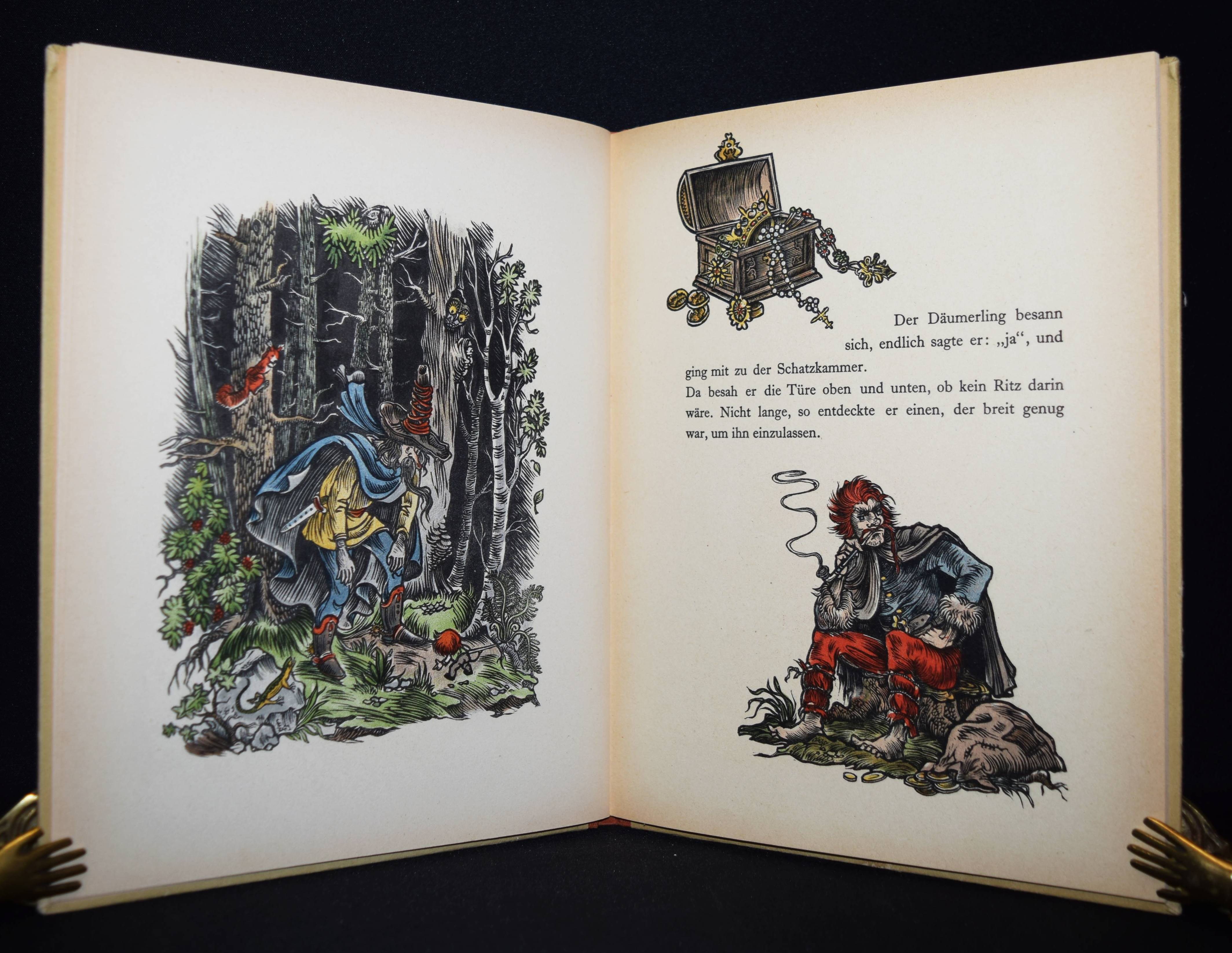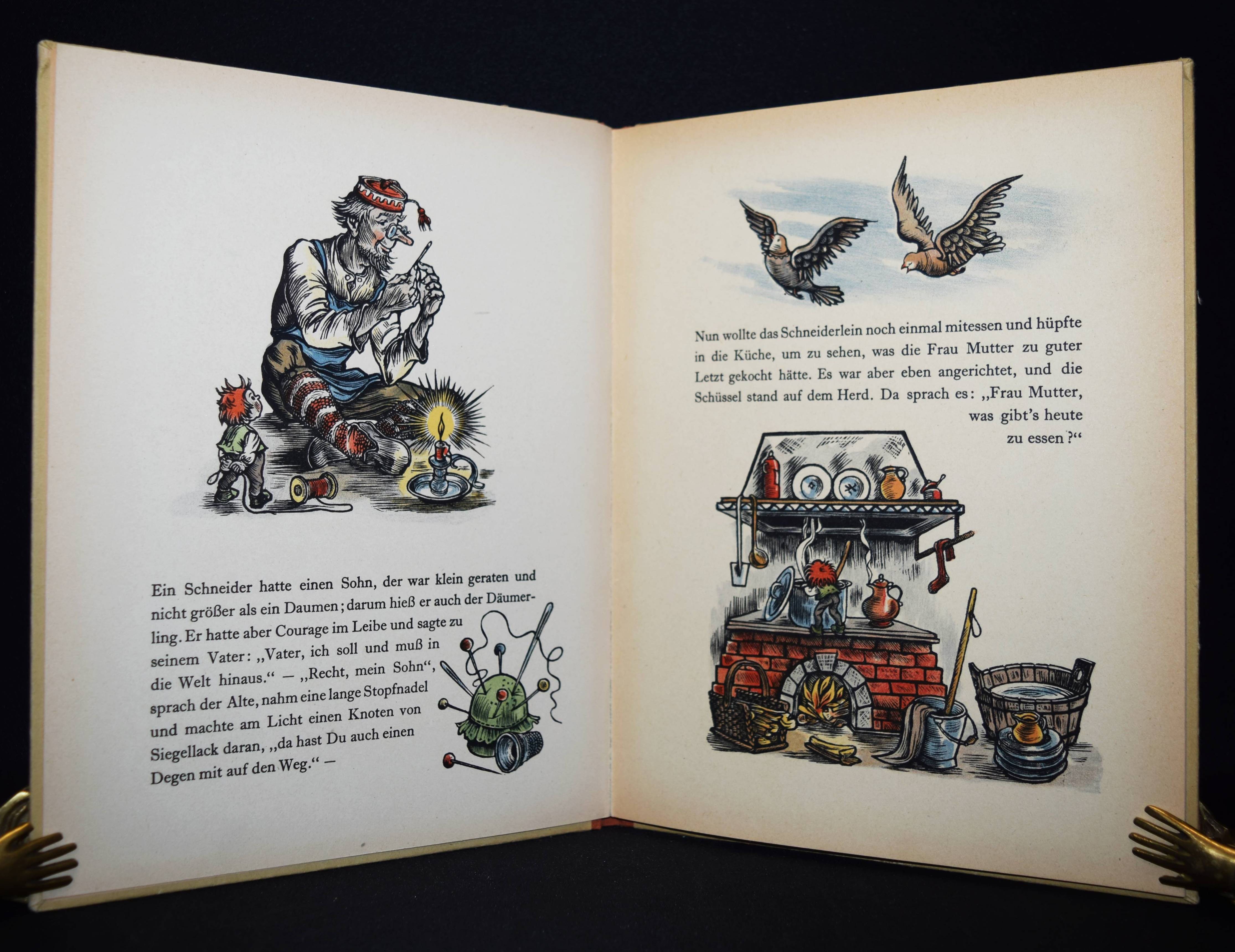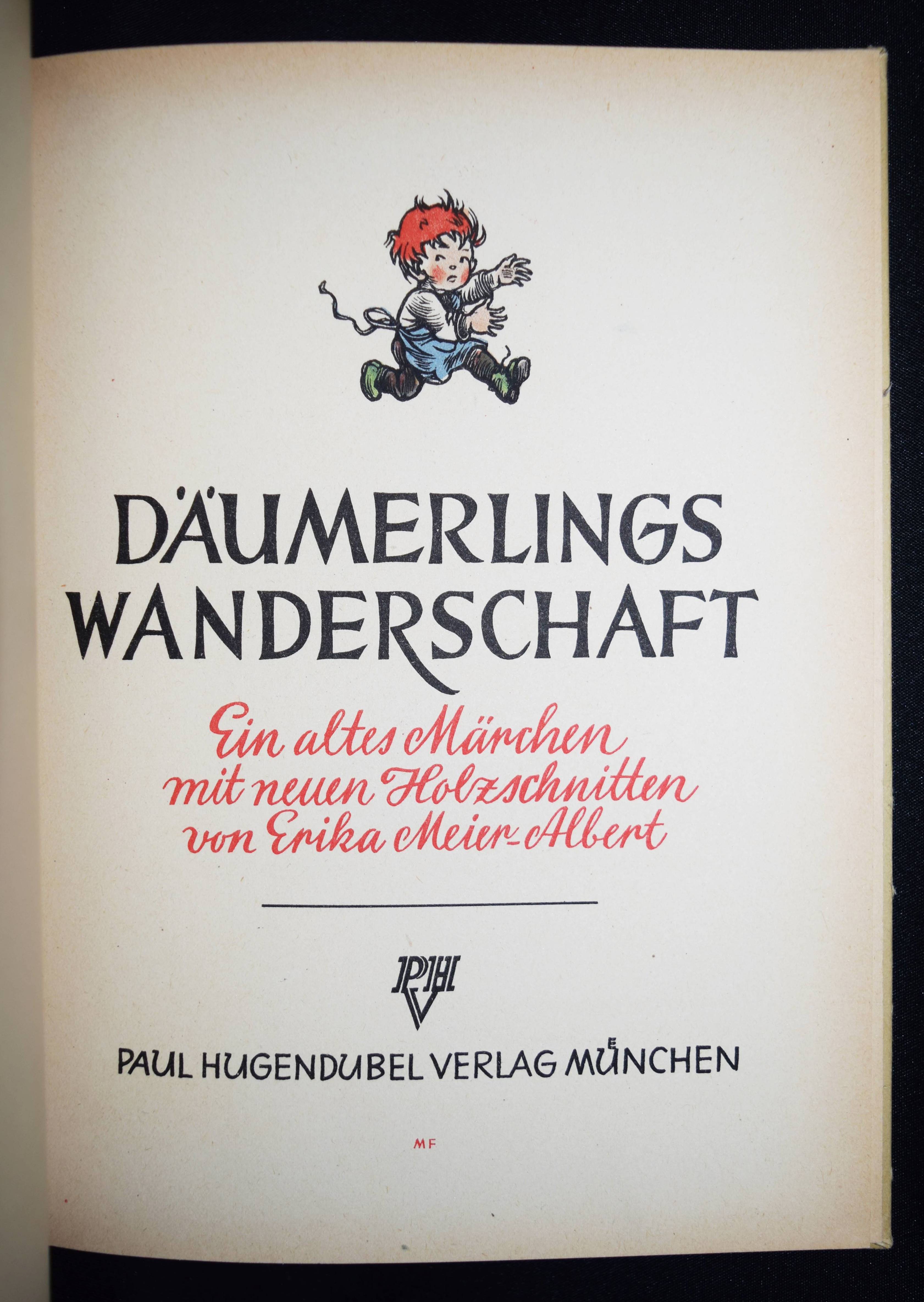 (Grimm, Jakob u. Wilhelm). Däumerlings Wanderschaft. Ein altes Märchen mit neuen Holzschnitten von Erika Meier-Albert. München, Paul Hugendubel (1949). Gr.-8°. [14] Bl. mit farb. Illustrationen. Farbig illustr. OHLn. Klotz, Bilderbücher II, 3684/1. Muck II,926. – Seltenes Märchenbilderbuch mit beeindruckenden Illustrationen nach kolorierten Holzschnitten. – Erika Meier-Albert (1921-?) hat in der Nachkriegszeit zahlreiche Kinderbücher ausgestattet. – Deckel etwas gebräunt, sehr gutes Exemplar.
