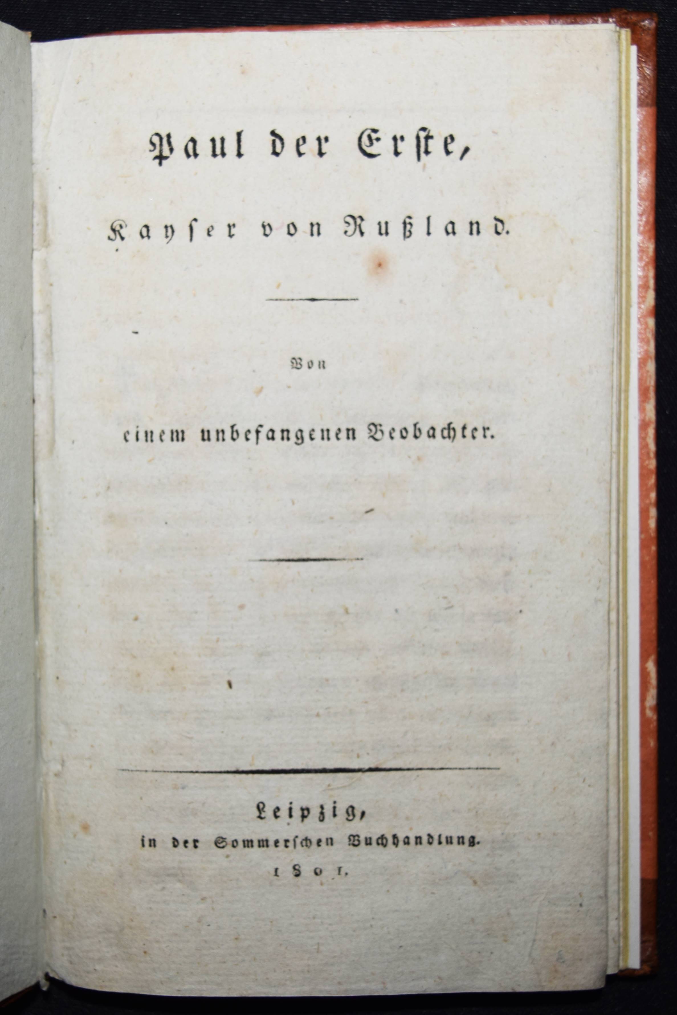 Paul I, Zar von Russland – Paul der Erste, Kayser von Rußland. Von einem unbefangenen Beobachter. Leipzig, Sommer 1801. Kl.-8°. 80 S., [4] Bl. (Verlagsanzeigen). HLdr. der Zeit mit goldgepr. Rückenschild und floraler Rückenvergoldung. GV 107. 8. Nicht bei Holzmann/Bohatta. – Sehr seltene erste deutschsprachige Biographie Pauls I. (1751-1801), kurz nach seiner Ermordung erschienen. Wir können nur wenige Exemplare in öffentlichen Sammlungen nachweisen. – Monarchisch gesinnt, bemüht sich der anonyme Verfasser um Objektivität, u. a. um Verständnis für den Schwenk Rußlands aus der zweiten Koalition gegen Frankreich, zu einem Bündnis der kleineren Seemächte gegen England an der Seite Frankreichs. Zu seinem Protektorat über den Malteser-Orden, dessen Großmeister er 1798 wurde, bemerkt der Verfasser: „Ein wichtiger Feind war aufgestanden, gegen welchen er den Orden führen wollte, und gegen welchen, seinem Dünken nach, alles, was adlichen Odem zöge, sich vereinigen müßte, nämlich gegen die Revolutionisten, die Demokraten, die Umstürzer der Thronen. Der Malteserorden sollte nun der Vereinigungspunkt alles europäischen Adels werden“ (S. 63). – „Als Sohn der Großfürstin Katharina, der späteren Kaiserin Katharina II. (Katharina die Große), wurde er von ihrem Gemahl Großfürst Peter, dem späteren Kaiser Peter III., als legitimer Nachkomme anerkannt. … Am Todestag Katharinas der Großen, dem 17. November 1796, erklärte sich der 42-jährige Paul zum Kaiser. Am 5. April 1797 erließ er, wohl aus Hass auf seine Mutter, die ihn zeitlebens gedemütigt hatte, ein Dekret, das nur noch männliche Nachkommen zur Thronfolge zuließ. Am 17. April erfolgte seine offizielle Krönung. … Aus Dankbarkeit für die Zuflucht in Russland setzten 1798 die Ritter des Malteserordens ihren Großmeister Hompesch ab und erklärten den Kaiser Paul zum Großmeister (de facto, nicht de jure); nach dessen Ermordung (1801) wurde 1803 wieder ordnungsgemäß ein römisch-katholischer Großmeister gewählt. … Nach sechs Jahren Bauzeit wurde der Palast am 1. November 1800 der offizielle Wohnsitz der Familie des Kaisers. Das moderne Schloss mit seinen Zugbrücken, Wachen, den vielen Räumen, Gängen, Ebenen und zahlreichen Sicherheitsanlagen half Paul jedoch nicht. In der Nacht des 11. März 1801 fiel Paul I. einem Attentat von Verschwörern aus Kreisen des Adels (Mörder Subow, von der Pahlen, Graf Bennigsen) zum Opfer: Sie erdrosselten ihn mit seiner eigenen Schärpe, nachdem er sich geweigert hatte, seine Abdankung zu unterschreiben. Die Absetzung, nicht jedoch der Mord, soll mit dem stillen Einverständnis von Pauls Sohn Alexander geschehen sein, der nach der Tat als Alexander I. auf den Thron kam. Nach der Ermordung des Kaisers zog sich seine Familie ins Winterpalais zurück. Paul wurde in der Peter-und-Paul-Kathedrale zu Sankt Petersburg beigesetzt“ (Wikipedia). – Schönes, dekorativ gebundenes Exemplar.