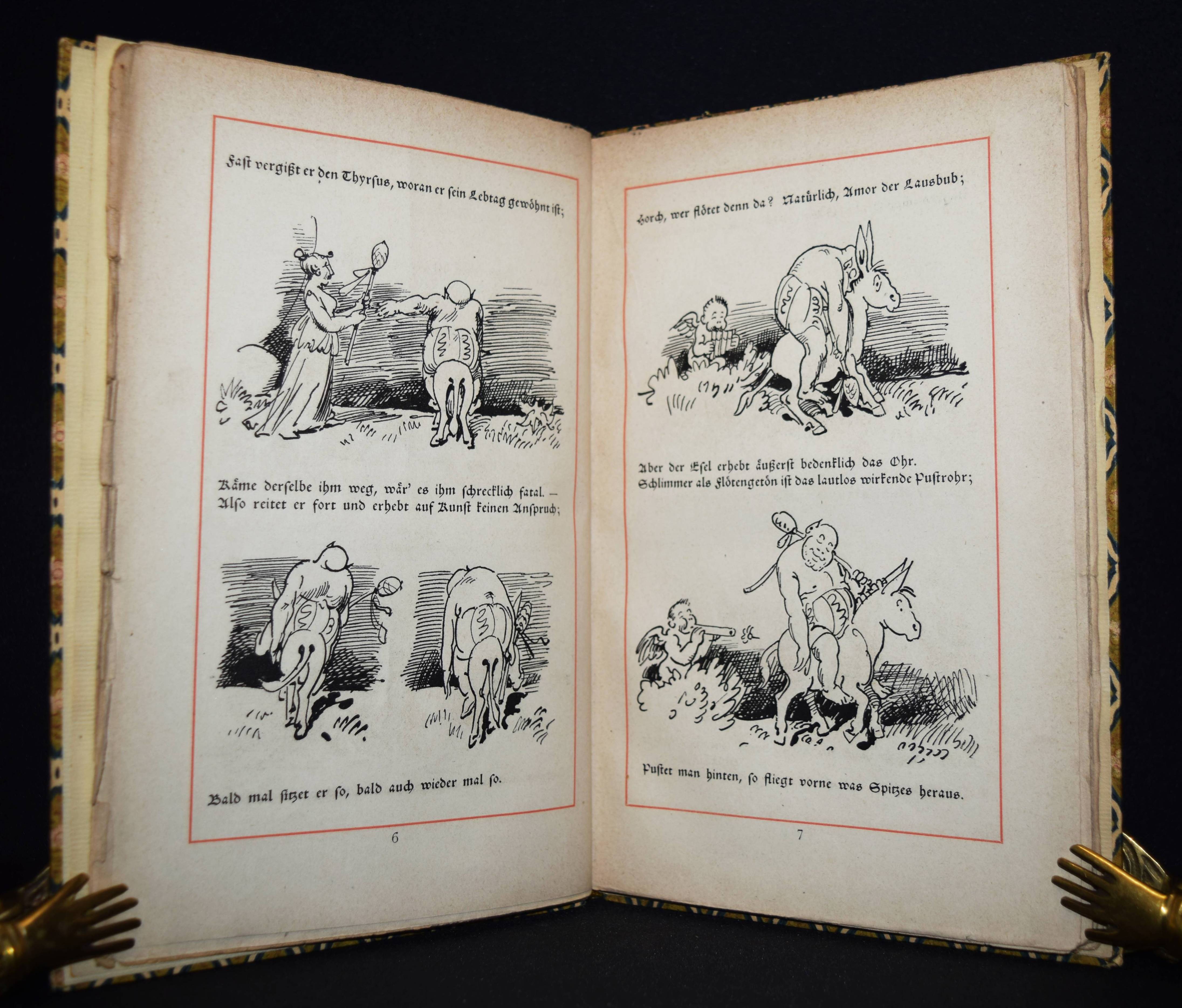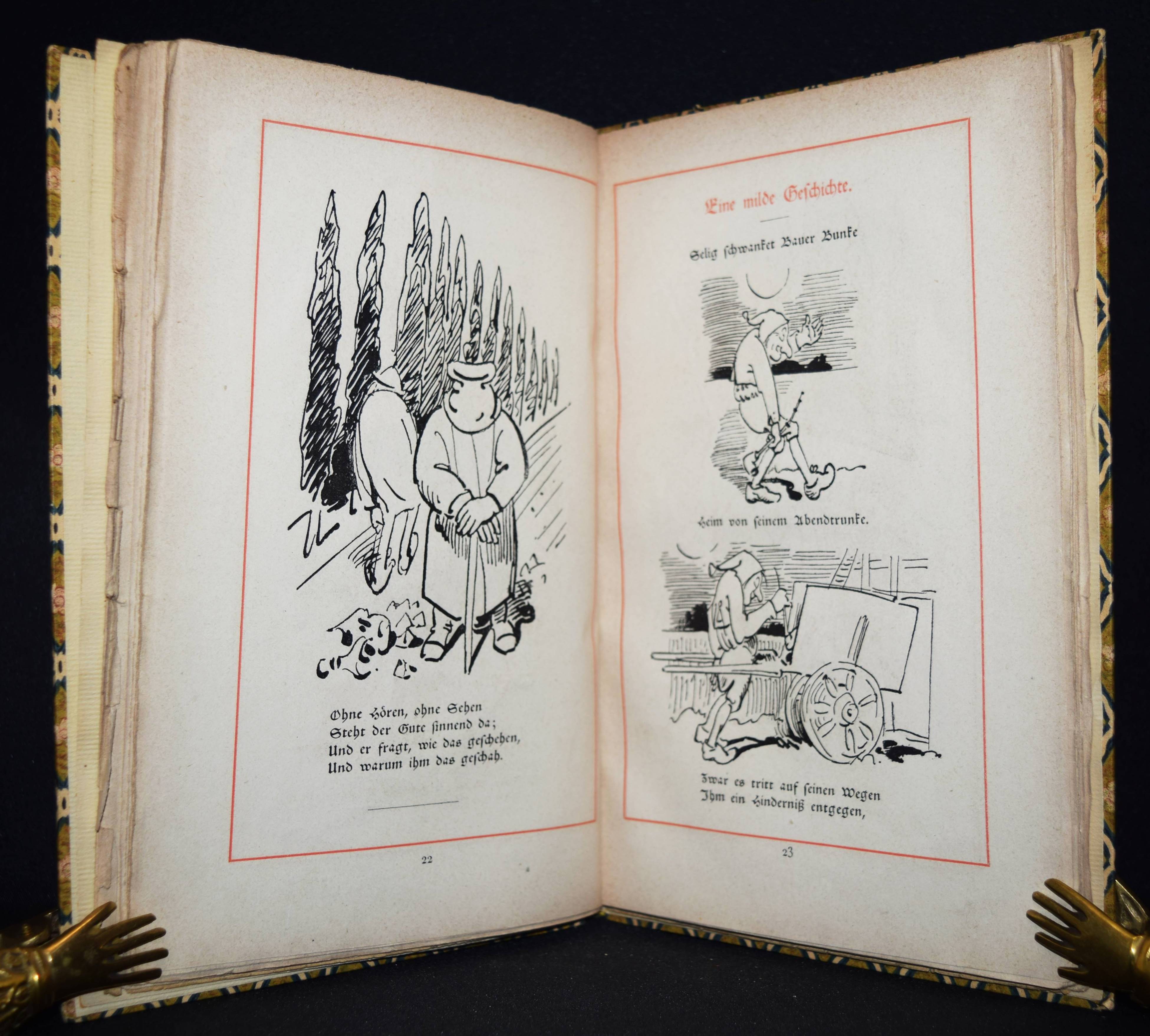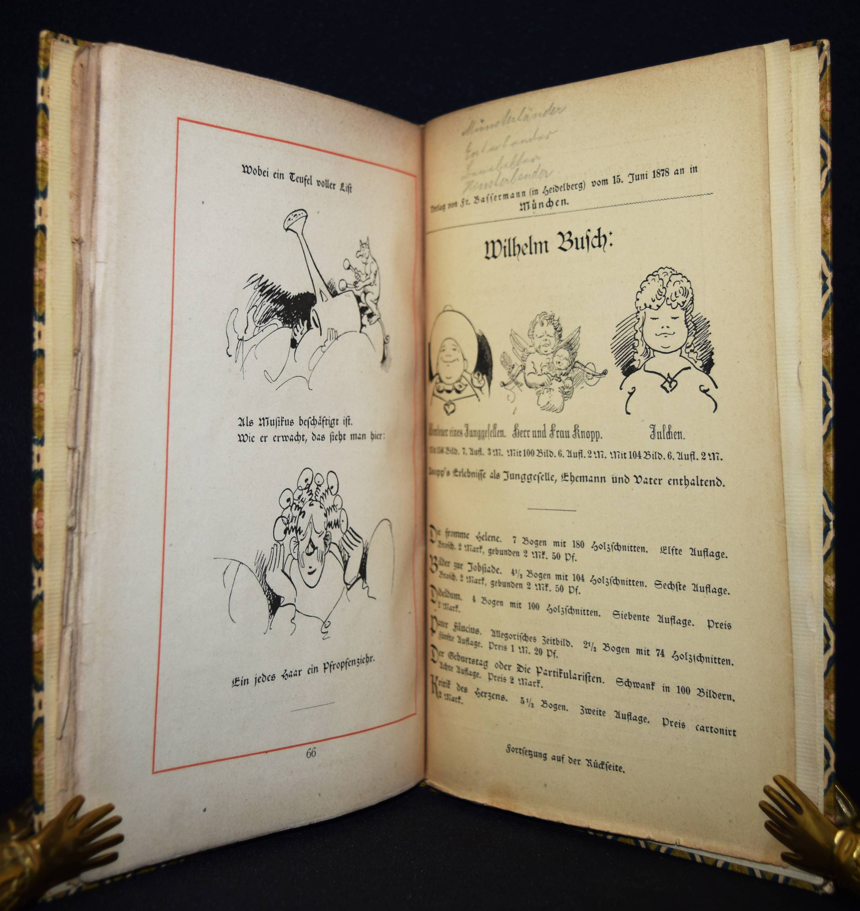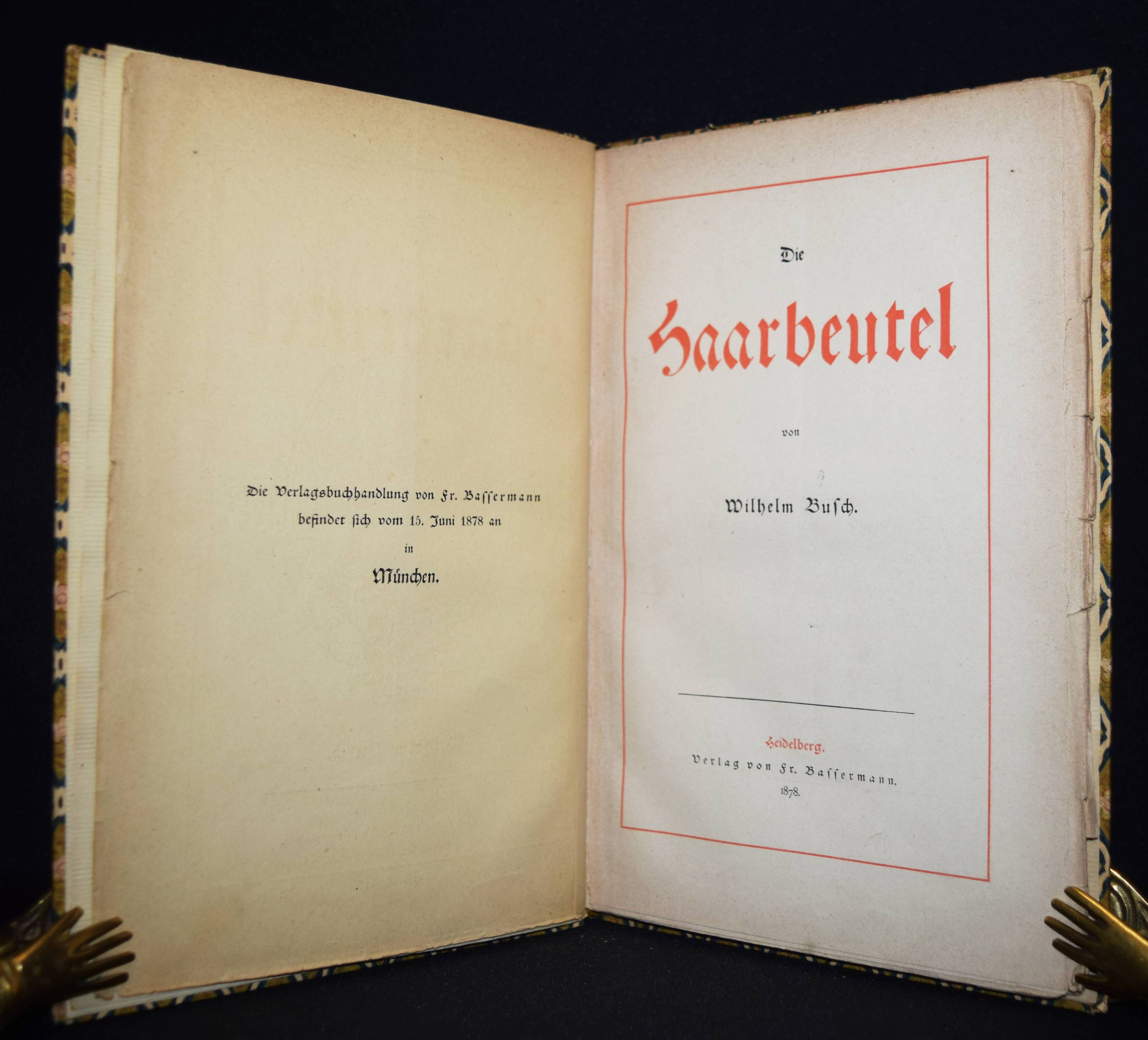 Busch, Wilhelm. Die Haarbeutel. Heidelberg, Fr. Bassermann 1878. 8°. 40 S. mit 113 Illustrationen (Zinkotypien). Pbd. um 1910 mit goldgepr. Rückenschild (illustr. Orig.-Umschlag beigebunden)). Vanselow 73. Ries, Bildergeschichten III, 830. W.-G.² 26. – Erster Druck der ersten Ausgabe. – Im Blattrand etwas angestaubt, gutes Exemplar.