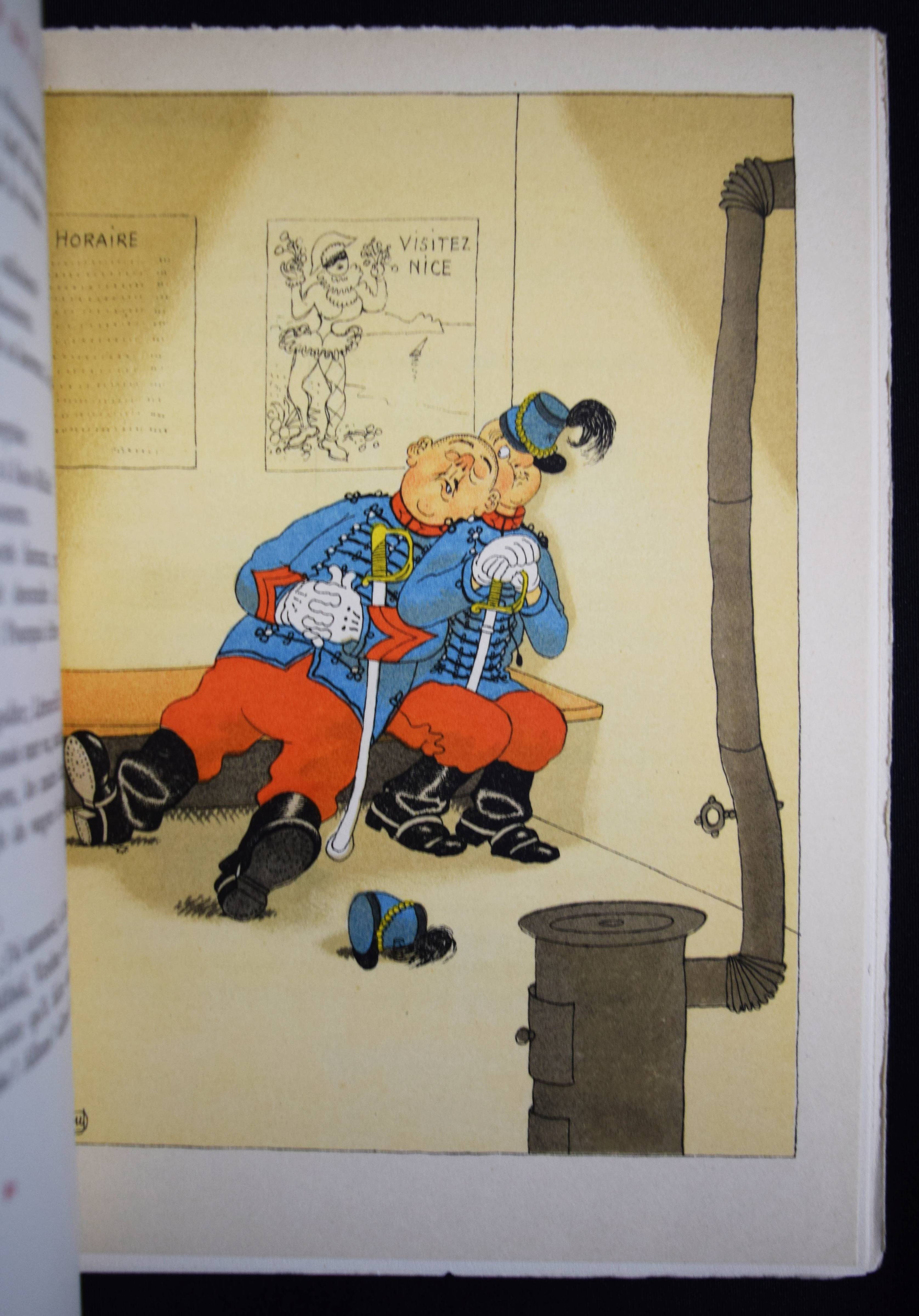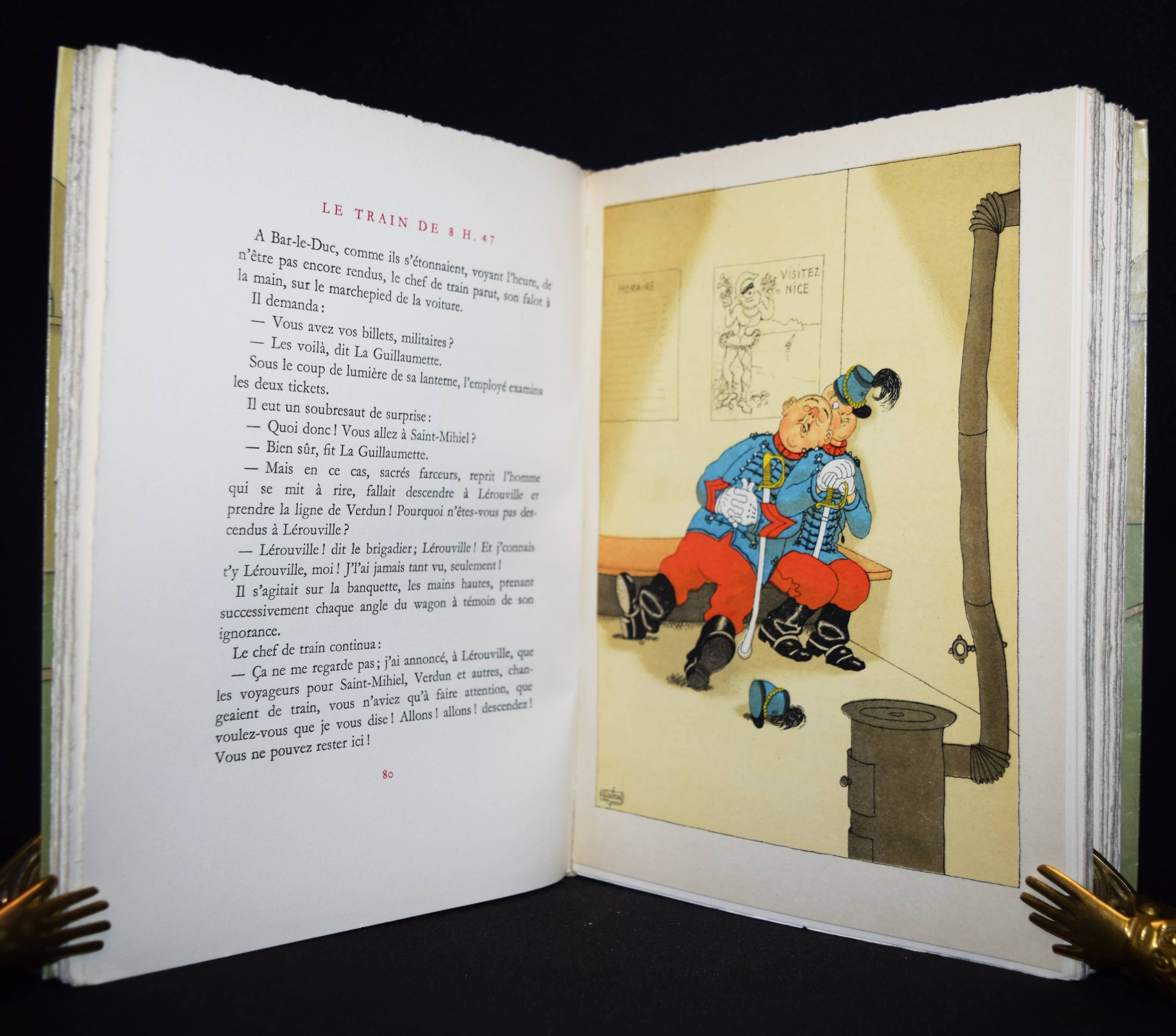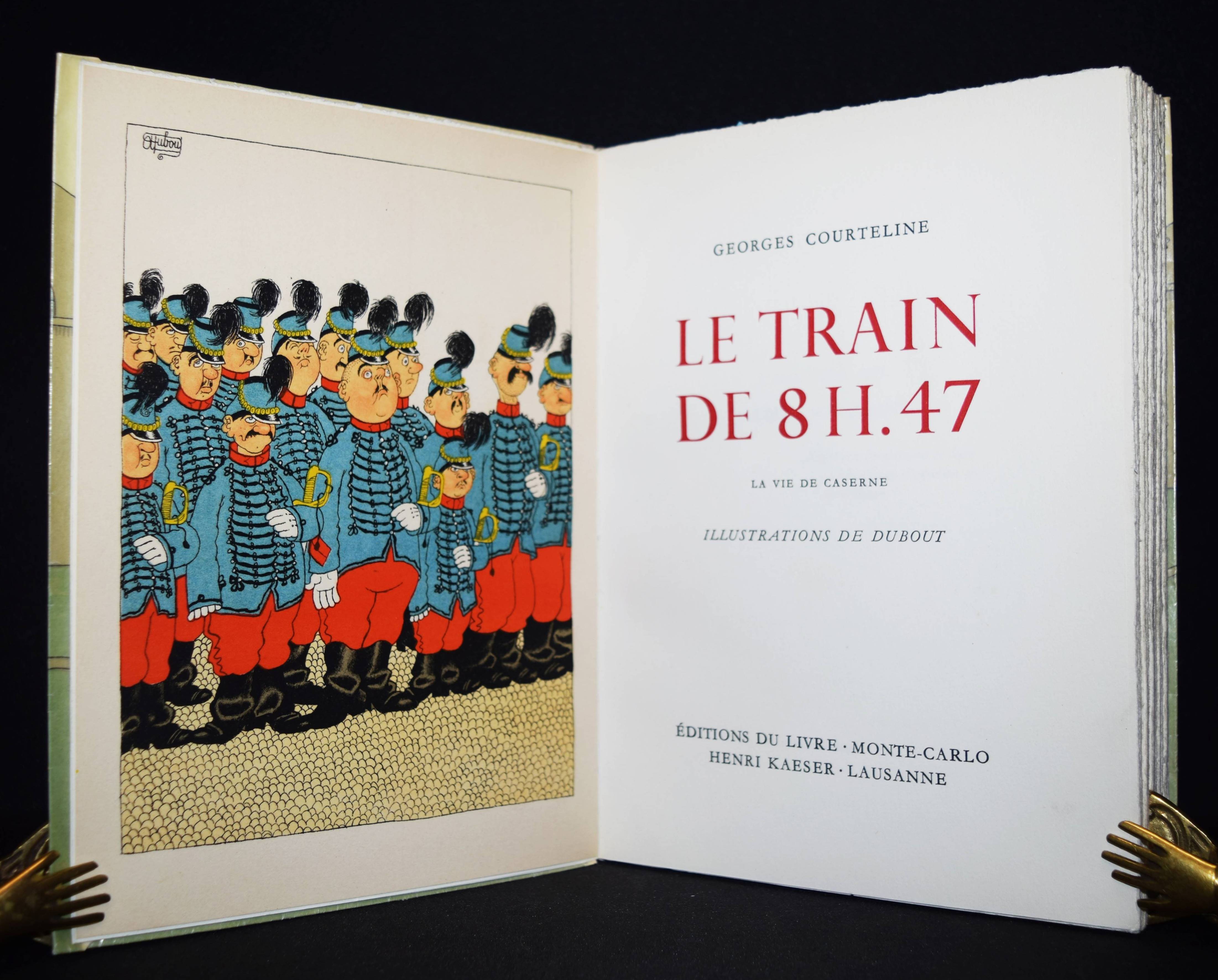 Courteline, Georges. Le train de 8 h. 47. La vie de caserne. Illustrations de (Albert) Debout. Monte-Carlo, Éditions du Livre et Lausanne, Henri Kaeser (1951). Gr.-8°. 195, (2) S. mit 32 (24 farb.) Illustrationen. Farbig illustr. OKart. mit Japanpapier-Schutzumschlag. Erste Ausgabe mit den humovollen des franz. Illustrators, Plakatkünstlers und Karikaturisten A. Dubout (1905-1976). – Eines von 1000 num. Exemplaren der Vorzugsausgabe für die Editions du Grand-Chêne, Lausanne (Gesamtauflage 4500 Exemplare). – Ohne den Pappschuber, der Japanpapierumschlag am Kapital mit kl. Fehlstelle, gutes Exemplar.