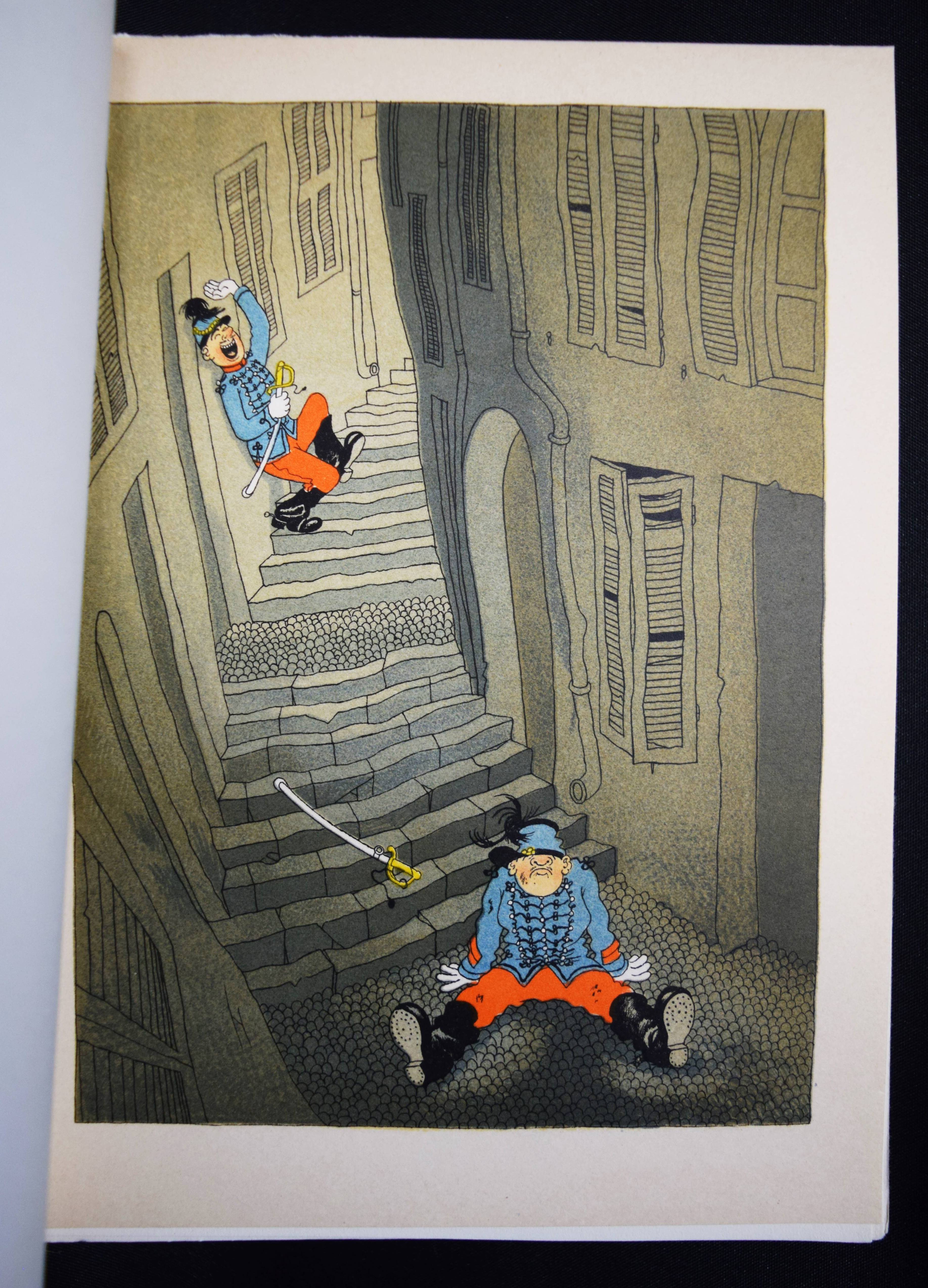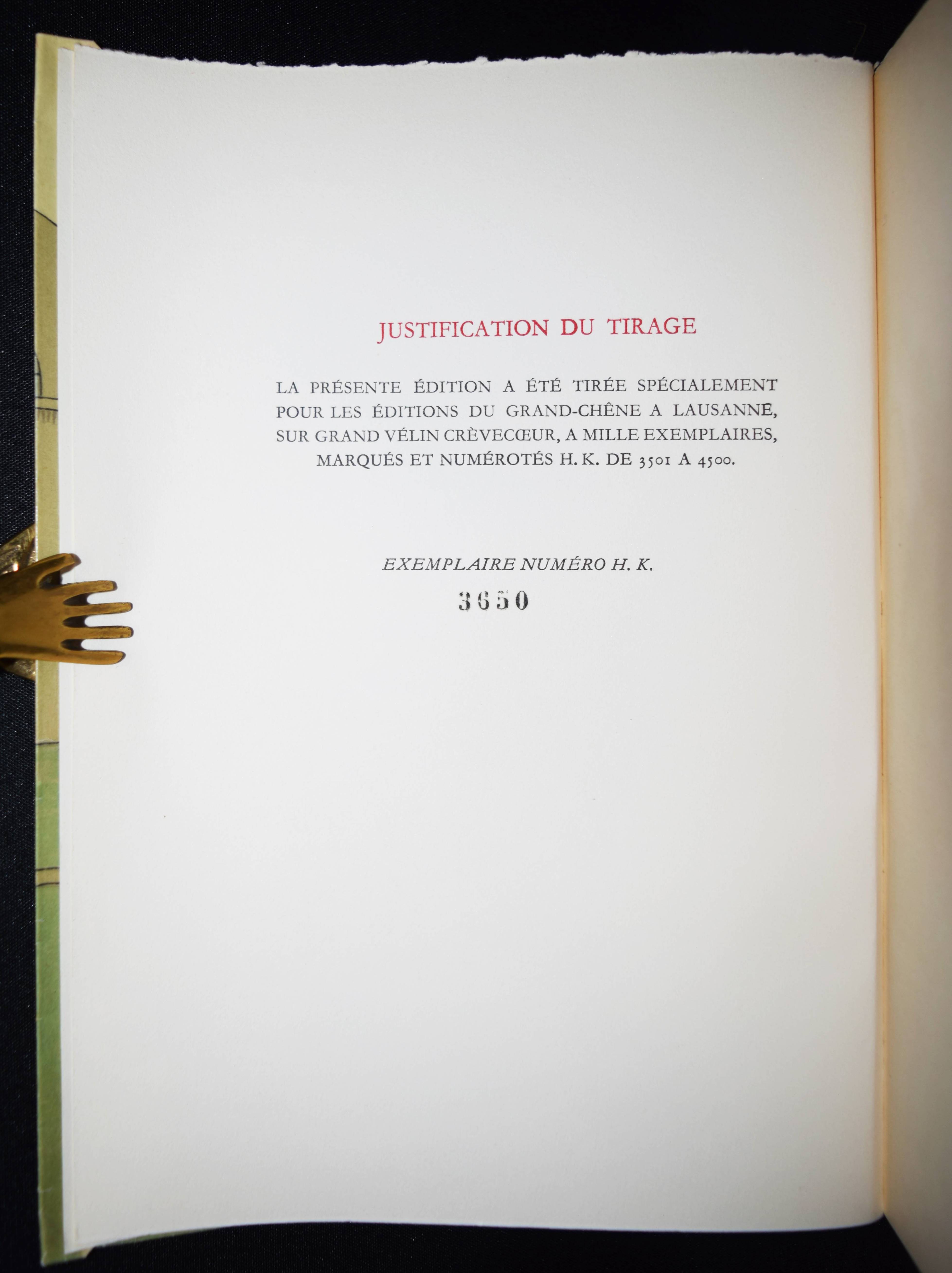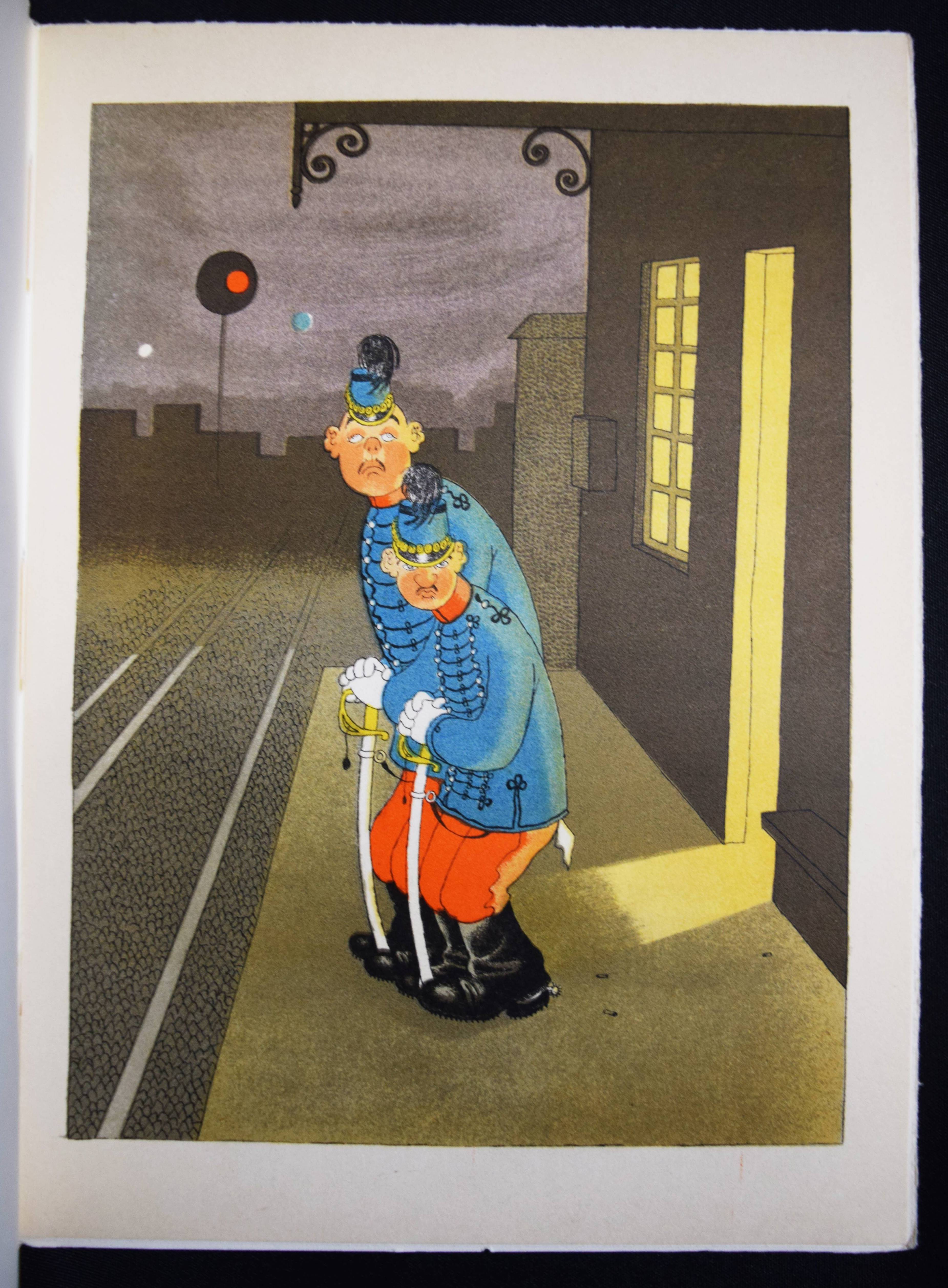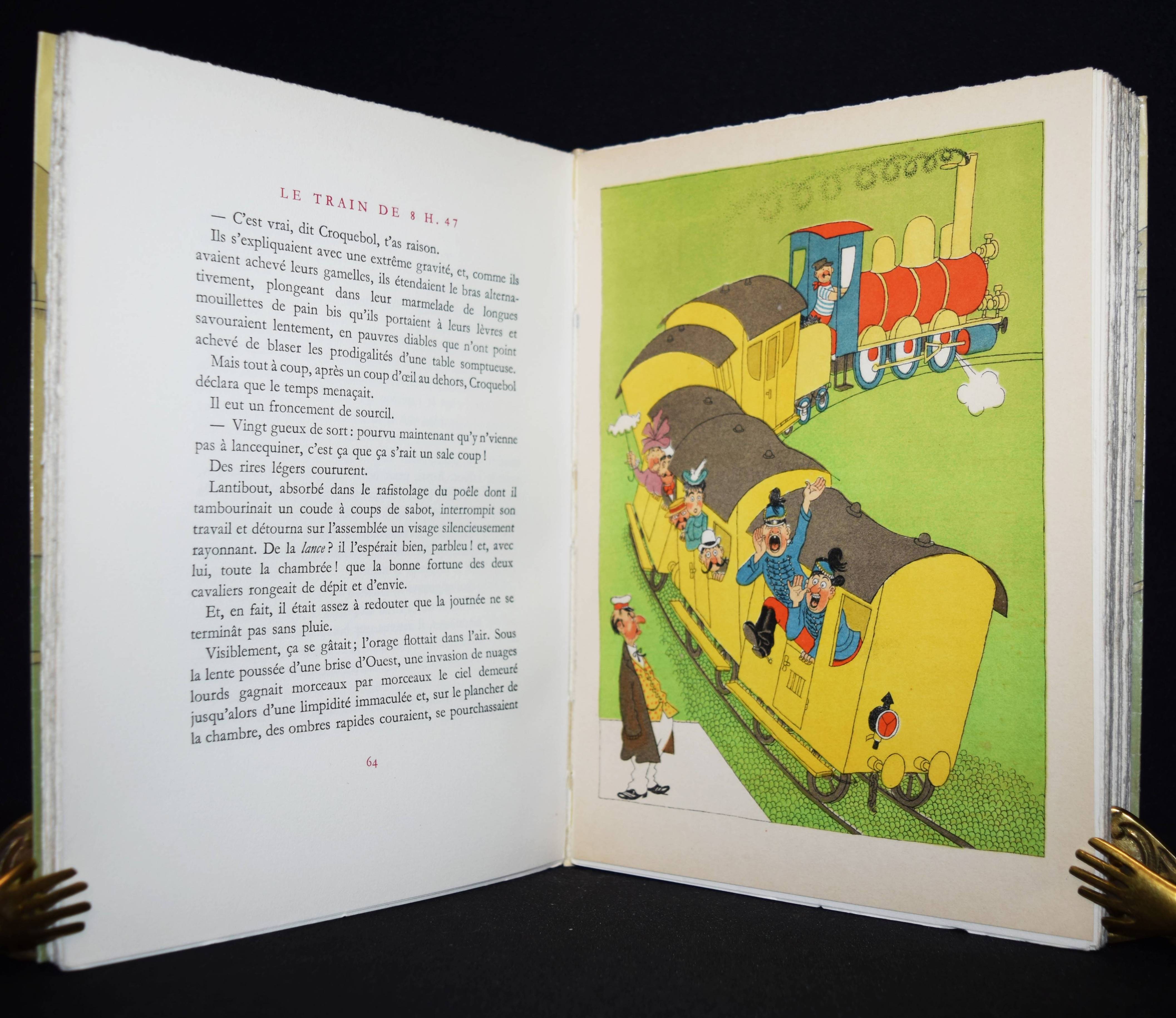 Courteline, Georges. Le train de 8 h. 47. La vie de caserne. Illustrations de (Albert) Debout. Monte-Carlo, Éditions du Livre et Lausanne, Henri Kaeser (1951). Gr.-8°. 195, (2) S. mit 32 (24 farb.) Illustrationen. Farbig illustr. OKart. mit Japanpapier-Schutzumschlag. Erste Ausgabe mit den humovollen des franz. Illustrators, Plakatkünstlers und Karikaturisten A. Dubout (1905-1976). – Eines von 1000 num. Exemplaren der Vorzugsausgabe für die Editions du Grand-Chêne, Lausanne (Gesamtauflage 4500 Exemplare). – Ohne den Pappschuber, der Japanpapierumschlag am Kapital mit kl. Fehlstelle, gutes Exemplar.