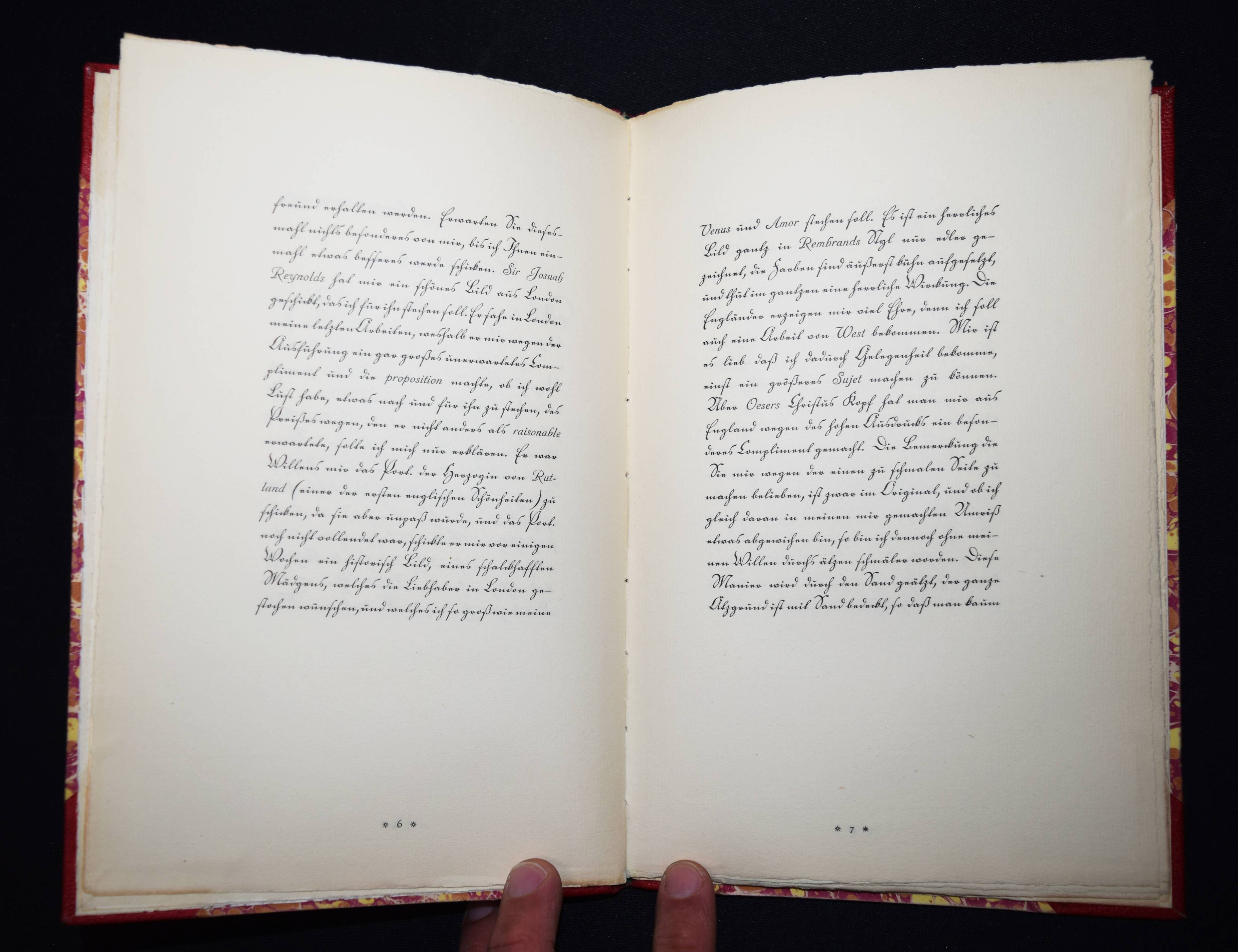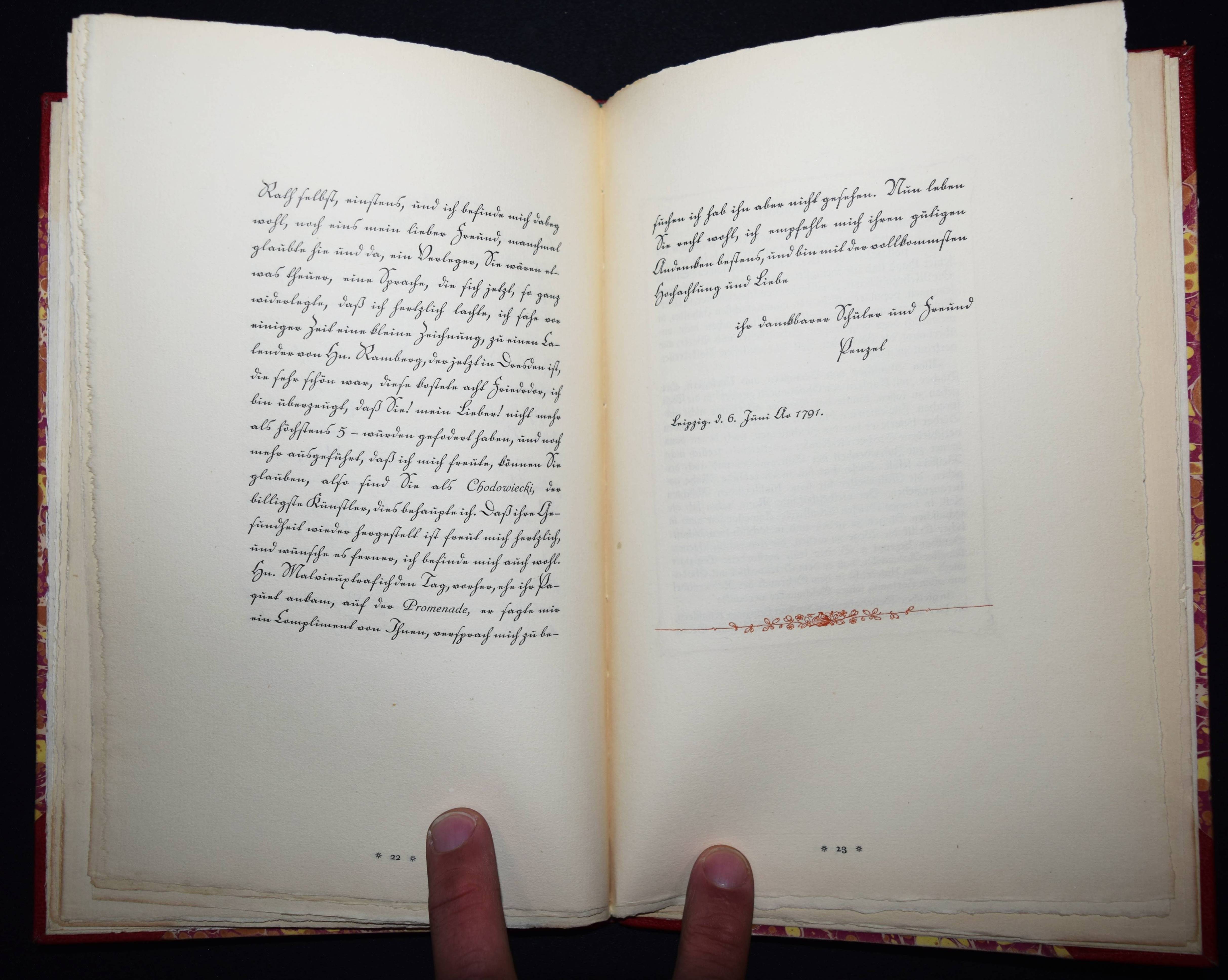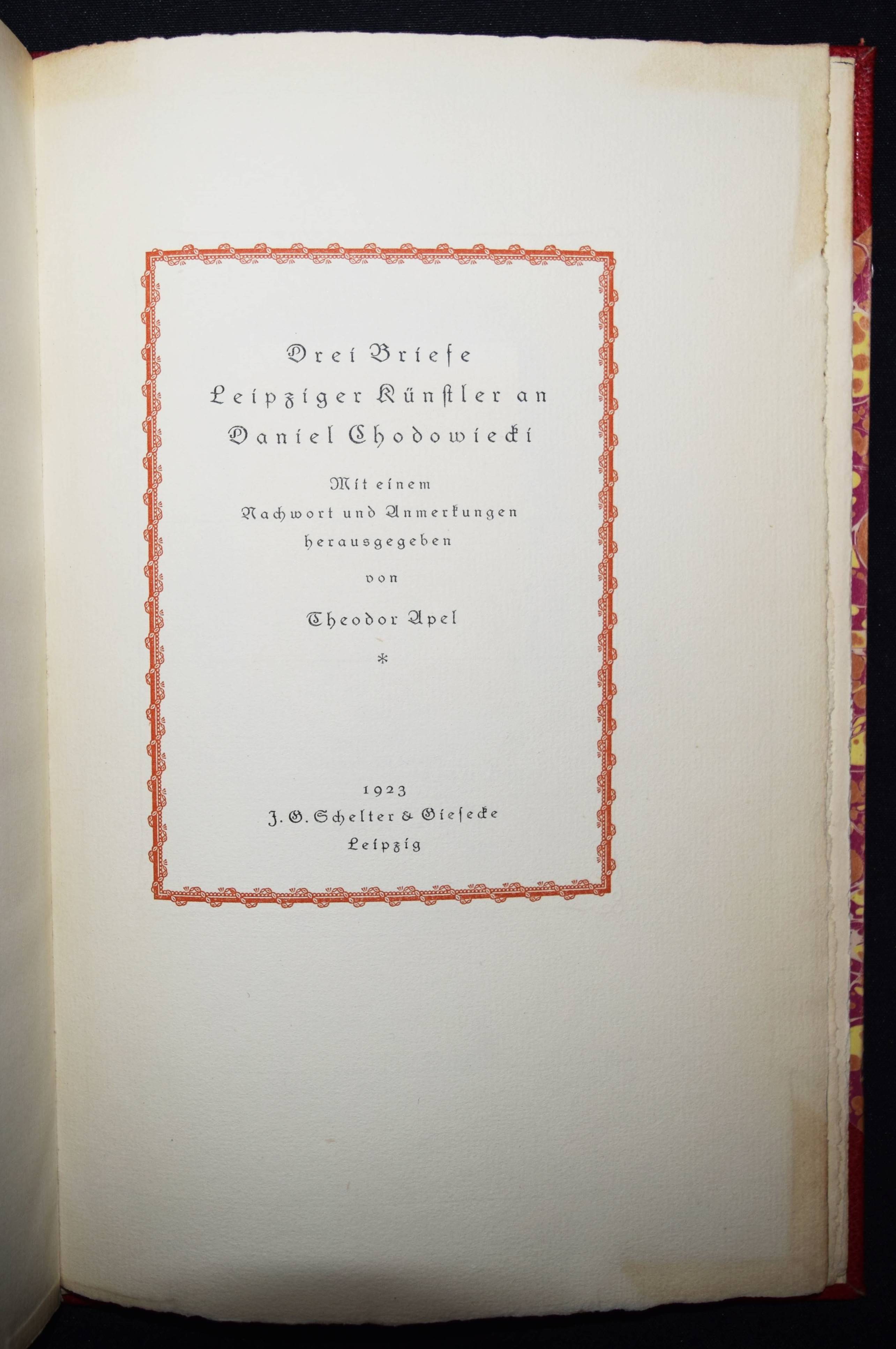 Chodowiecki – Apel, Theodor (Hrsg.). Drei Briefe Leipziger Künstler an Daniel Chodowiecki. Leipzig, Schelter & Giesecke 1923. Gr.-8°. 32 S. mit 3 mont. Farbtafeln. Weinroter OHldr. mit goldgepr. Rückentitel. (Veröffentlichung der Dienstags-Gesellschaft zu Leipzig, Band 1). Rodenberg 286. – Eines von 500 num. Exemplaren. – Mit Briefen von Johann Georg Penzel, Christian Gottlob Geyser und Johann Friedrich Bause. – Sehr schönes sauberes Exemplar.