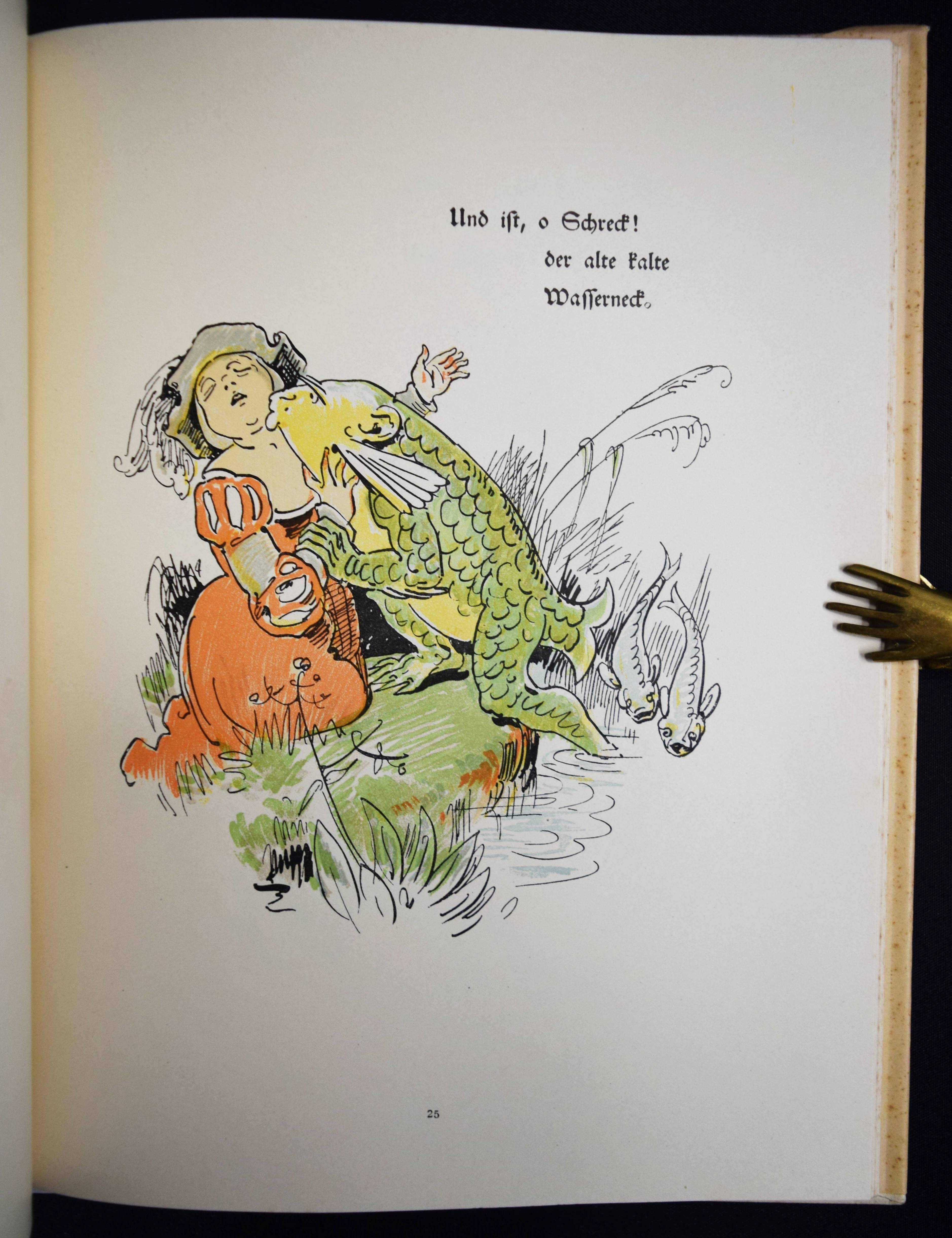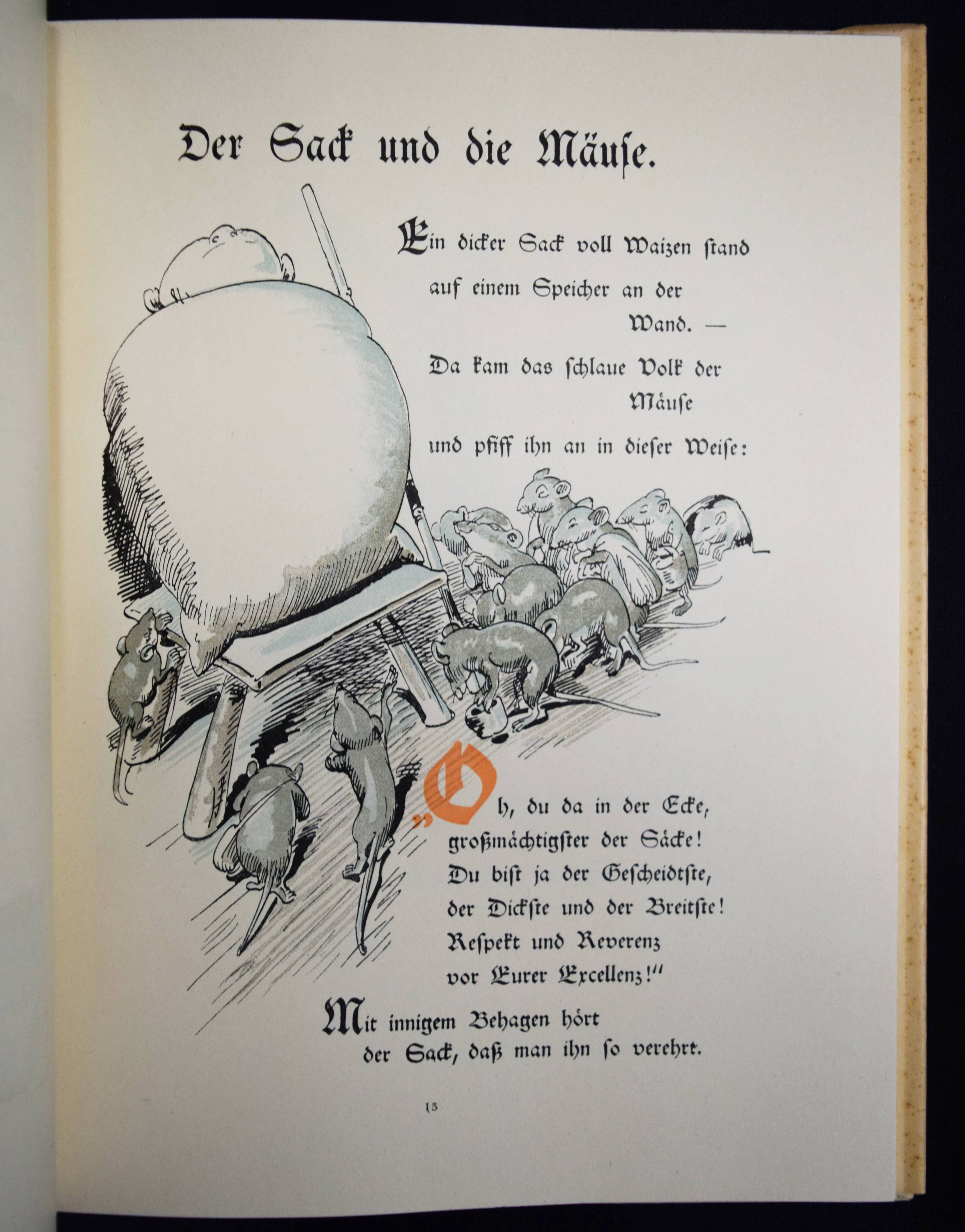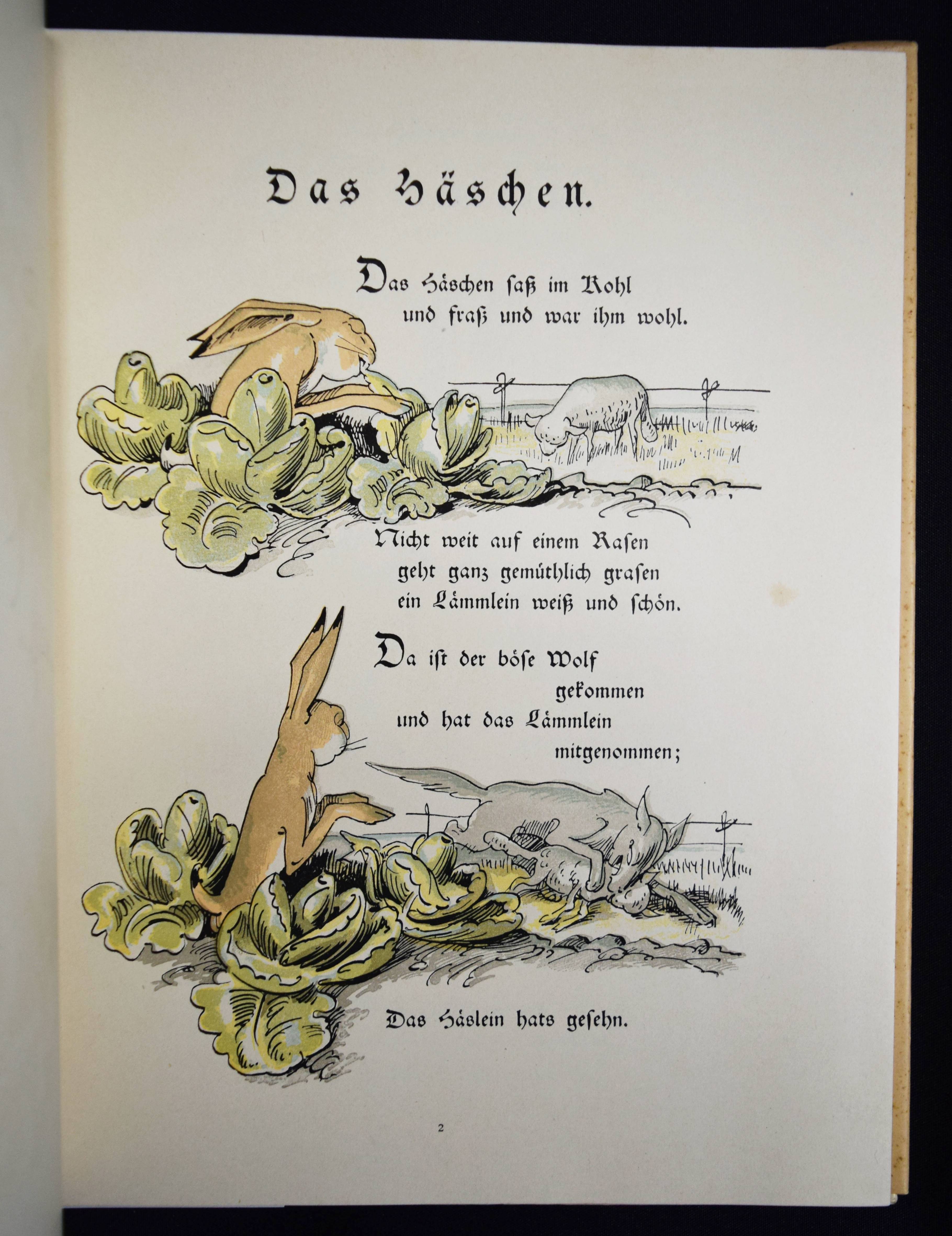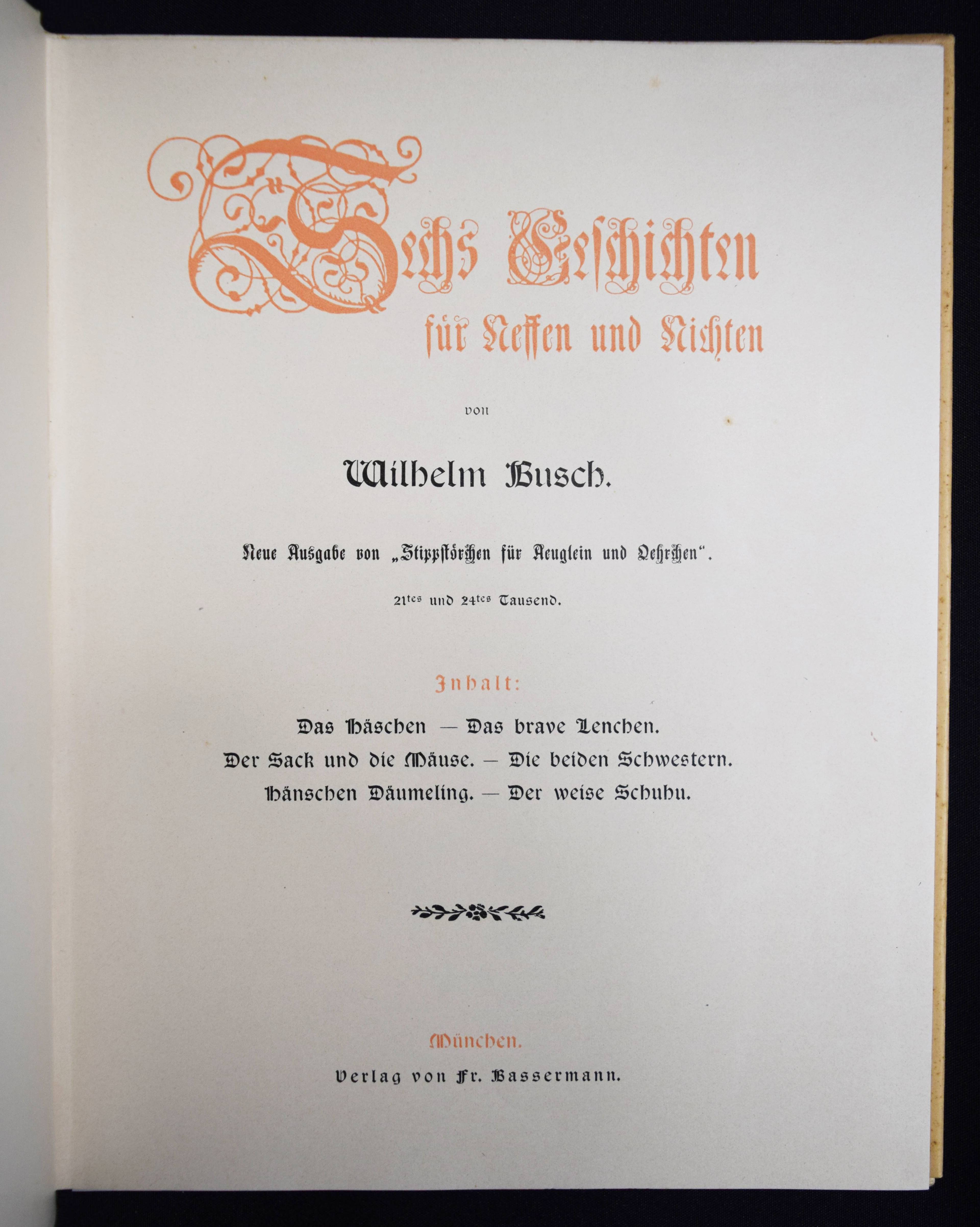 Busch, Wilhelm. Sechs Geschichten für Neffen und Nichten. Neue Ausgabe von „Stippstörchen für Aeuglein und Oerchen“. 21.-24. Tsd. München, Fr. Bassermann o. J. (1924). 4°. 48 S. mit farblithogr. Illustrationen. Farbig illustr. OHln. mit typogr. Orig.-Schutzumschlag. Ries, Bildergeschichten III, Sp. 1029. Vgl. Vanselow 75. – Mit den Geschichten: Das Häschen. – Das brave Lenchen. – Der Sack und die Mäuse. – Die beiden Schwestern. – Hänschen Däumeling. – Der weise Schuhu. – „Bei den späteren Auflagen (zuerst im Jahre 1900) hat Busch, um den hannoverschen Provinzialismus „Stippstörchen“ zu vermeiden, den Titel unter Beibehaltung der ursprünglichen Zeichnung in „Sechs Geschichten.“ umgeändert. Der Inhalt ist der gleiche geblieben“ (Vanselow). – Außergewöhnlich gut erhaltenes und sauberes Exemplar mit dem seltenen Schutzumschlag.