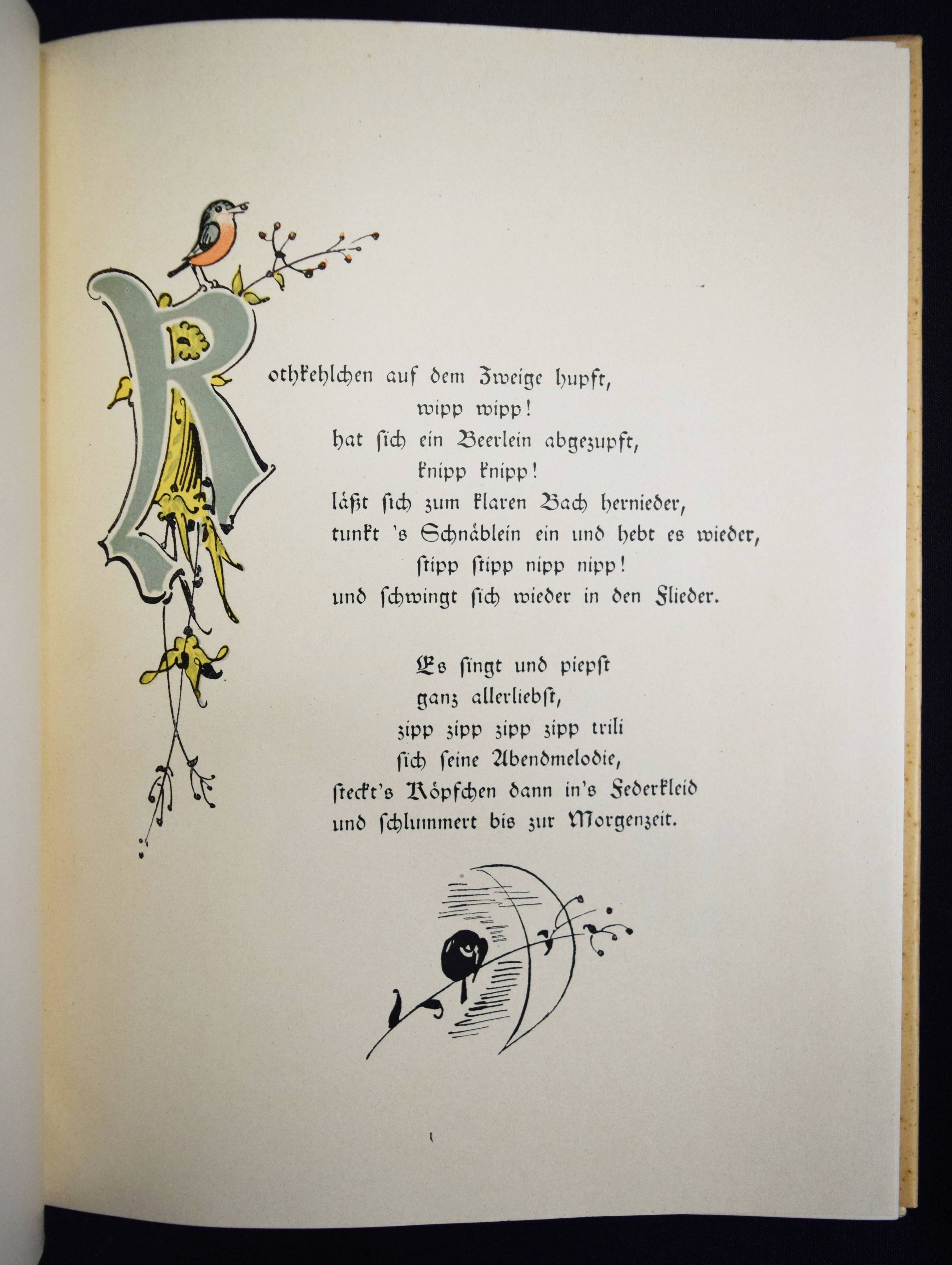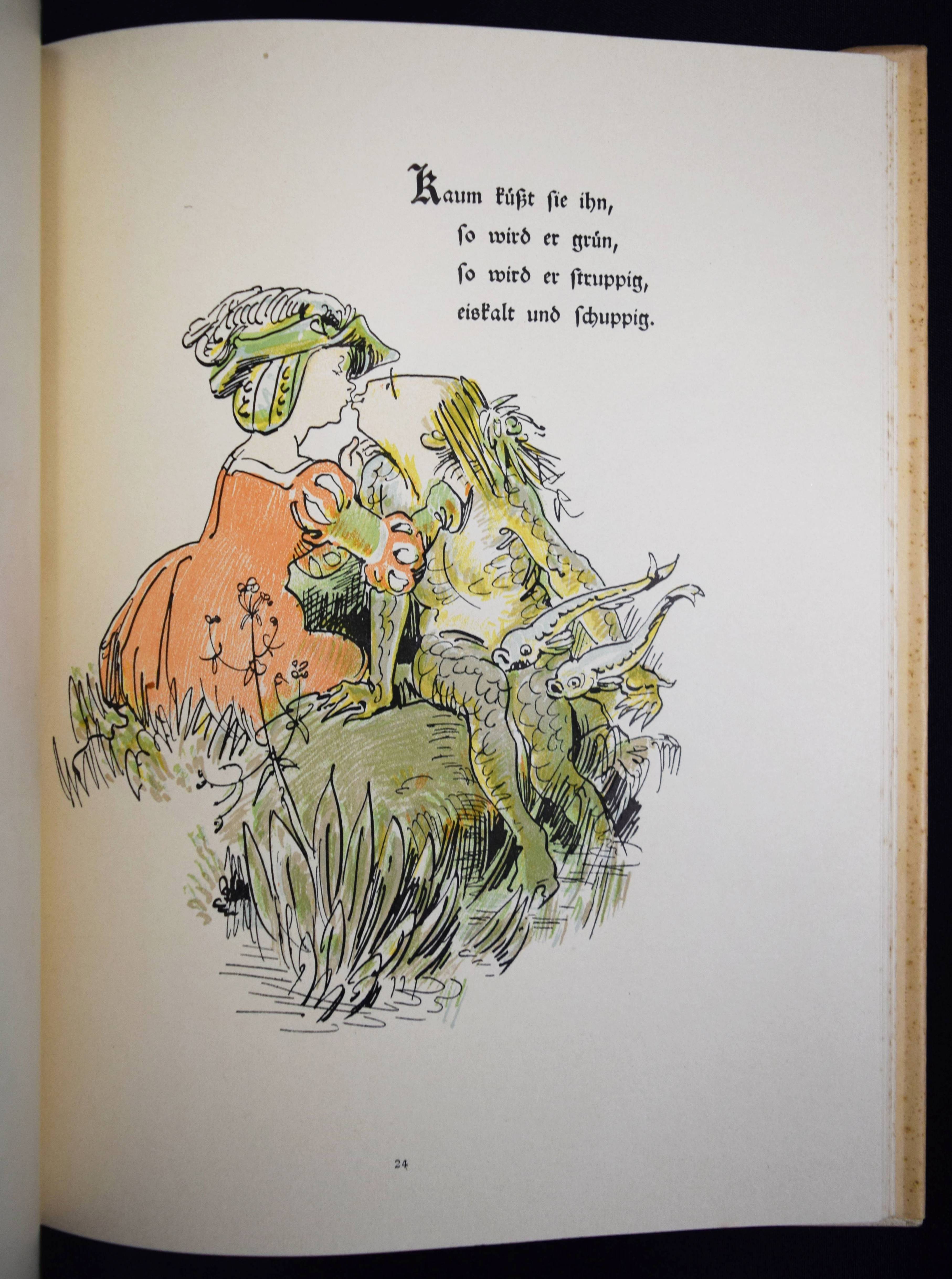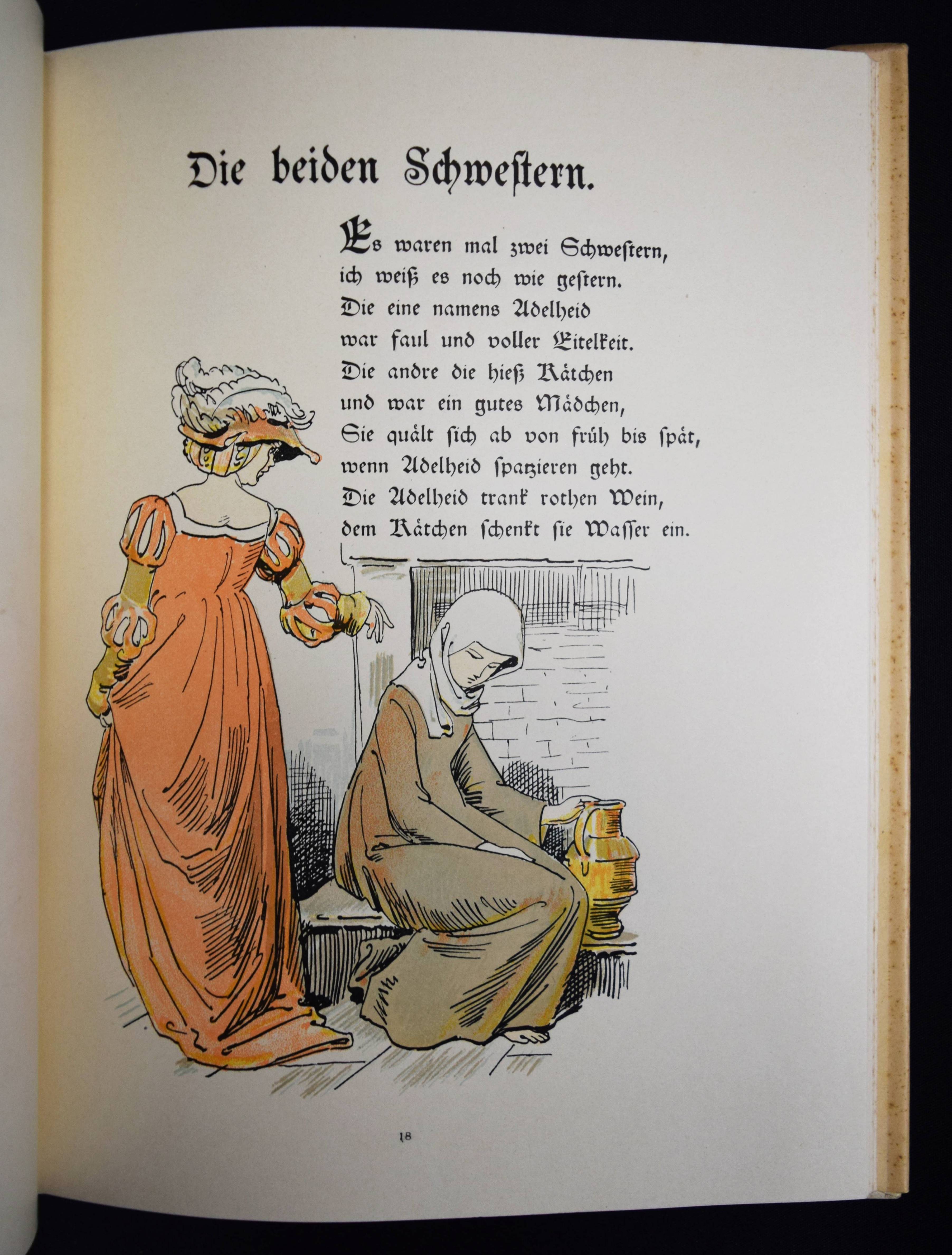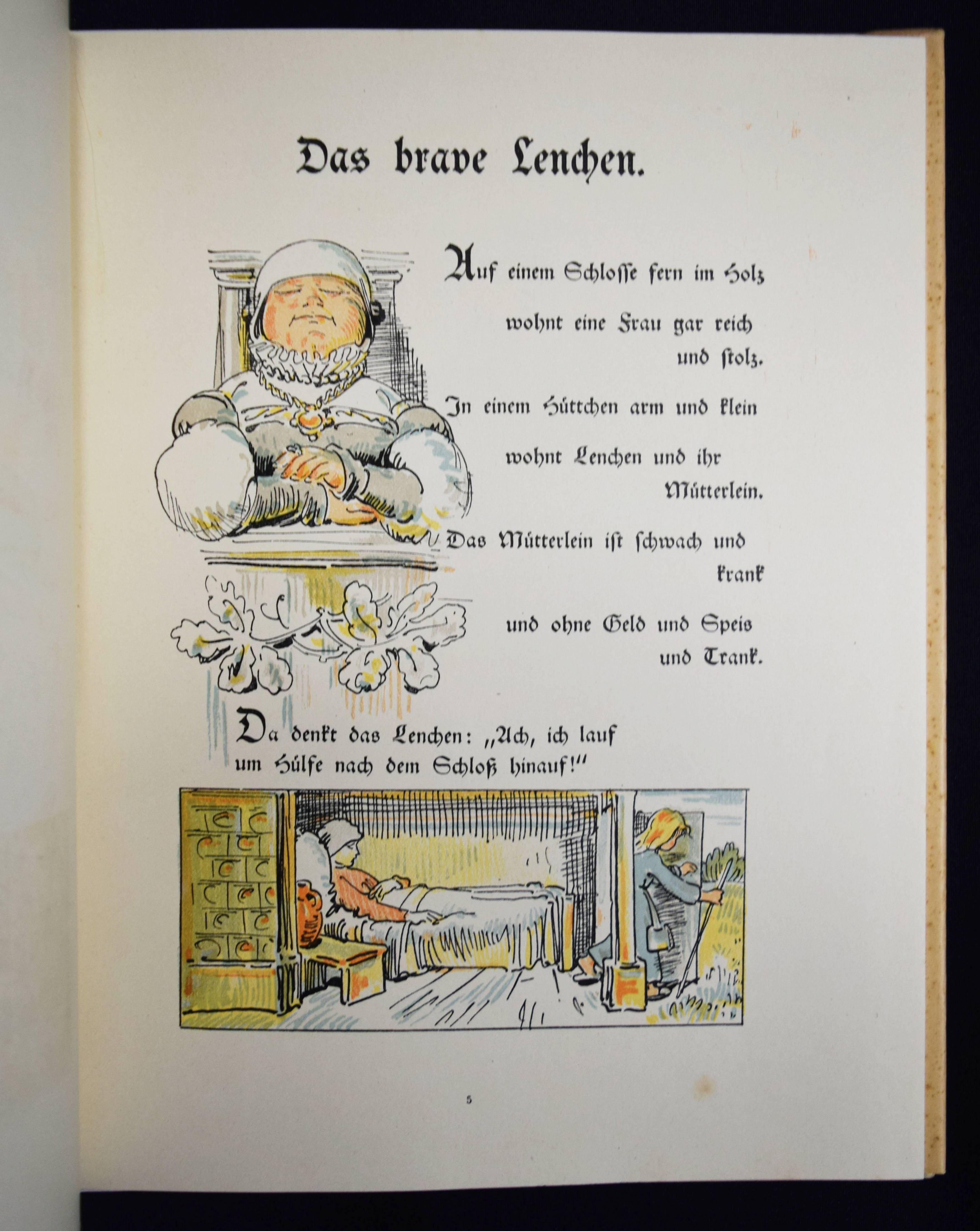 Busch, Wilhelm. Sechs Geschichten für Neffen und Nichten. Neue Ausgabe von „Stippstörchen für Aeuglein und Oerchen“. 21.-24. Tsd. München, Fr. Bassermann o. J. (1924). 4°. 48 S. mit farblithogr. Illustrationen. Farbig illustr. OHln. mit typogr. Orig.-Schutzumschlag. Ries, Bildergeschichten III, Sp. 1029. Vgl. Vanselow 75. – Mit den Geschichten: Das Häschen. – Das brave Lenchen. – Der Sack und die Mäuse. – Die beiden Schwestern. – Hänschen Däumeling. – Der weise Schuhu. – „Bei den späteren Auflagen (zuerst im Jahre 1900) hat Busch, um den hannoverschen Provinzialismus „Stippstörchen“ zu vermeiden, den Titel unter Beibehaltung der ursprünglichen Zeichnung in „Sechs Geschichten.“ umgeändert. Der Inhalt ist der gleiche geblieben“ (Vanselow). – Außergewöhnlich gut erhaltenes und sauberes Exemplar mit dem seltenen Schutzumschlag.