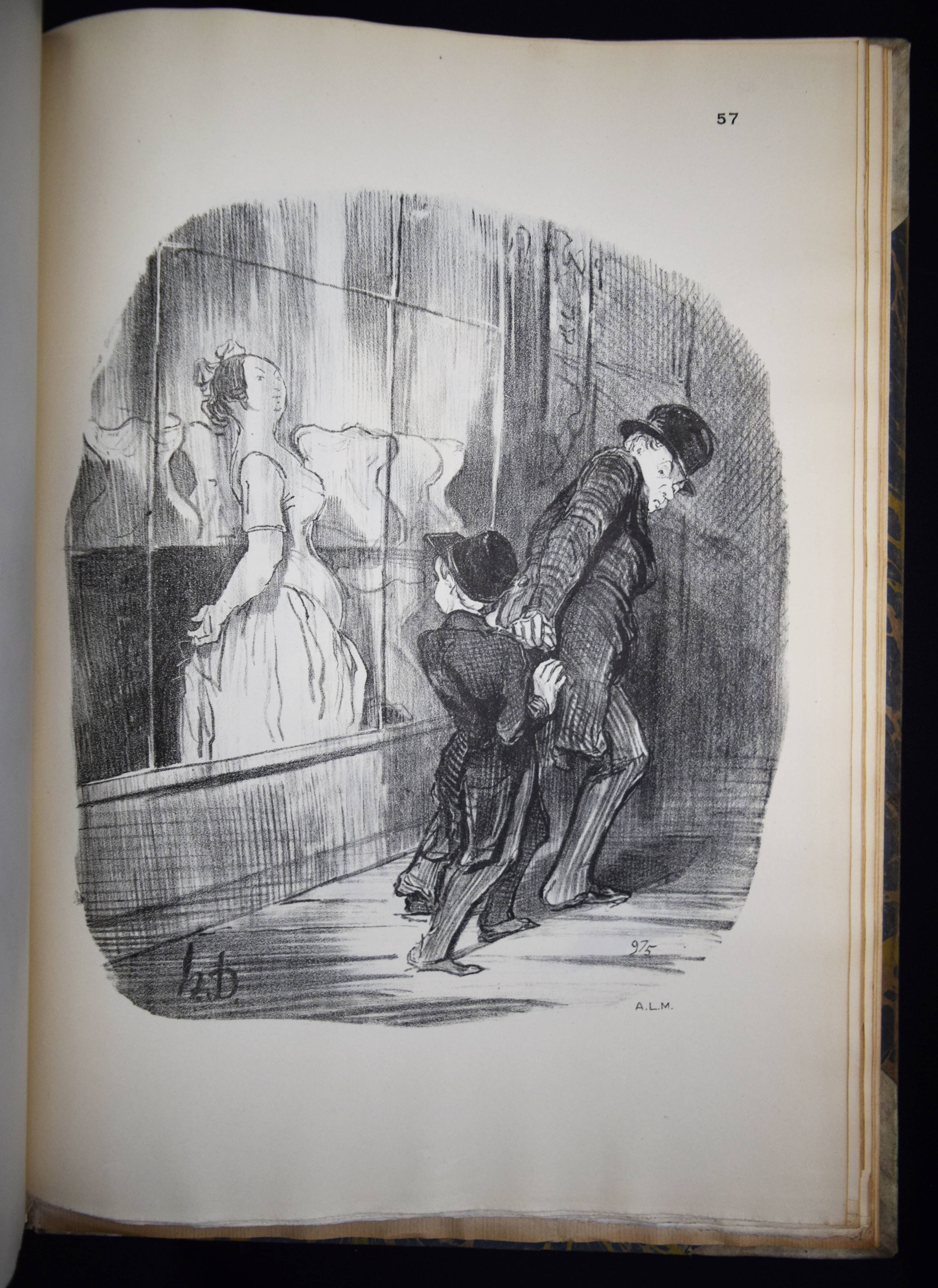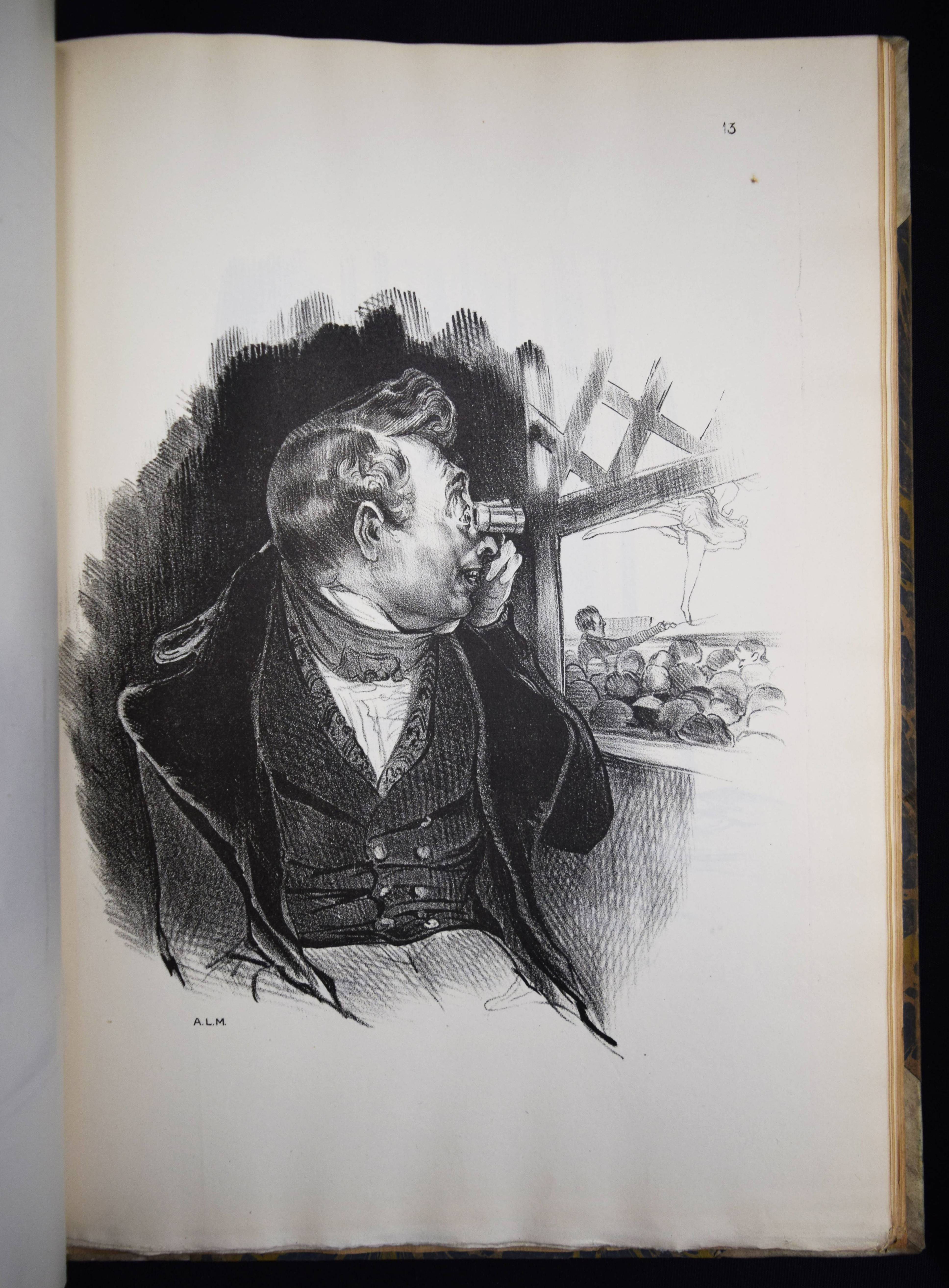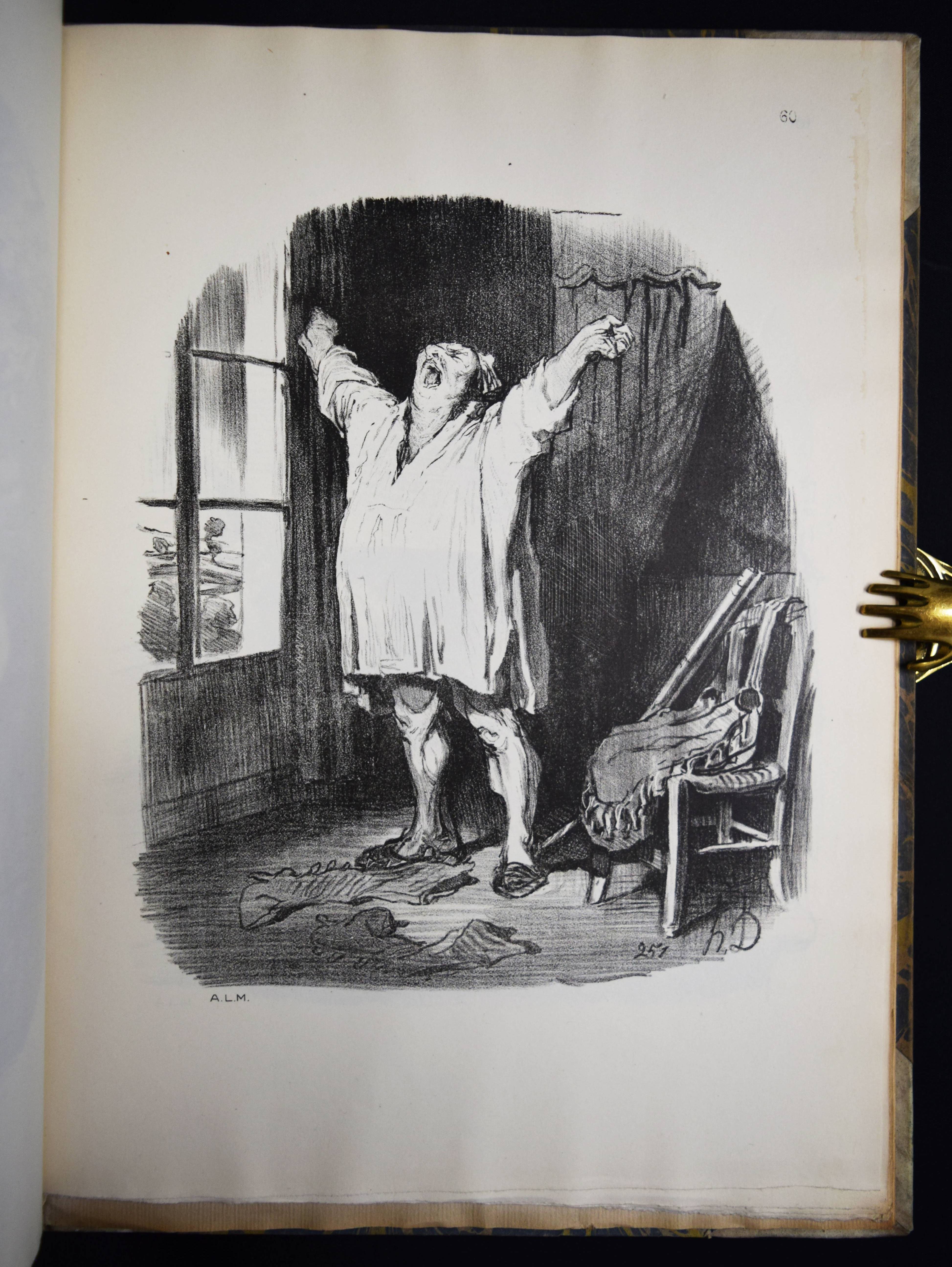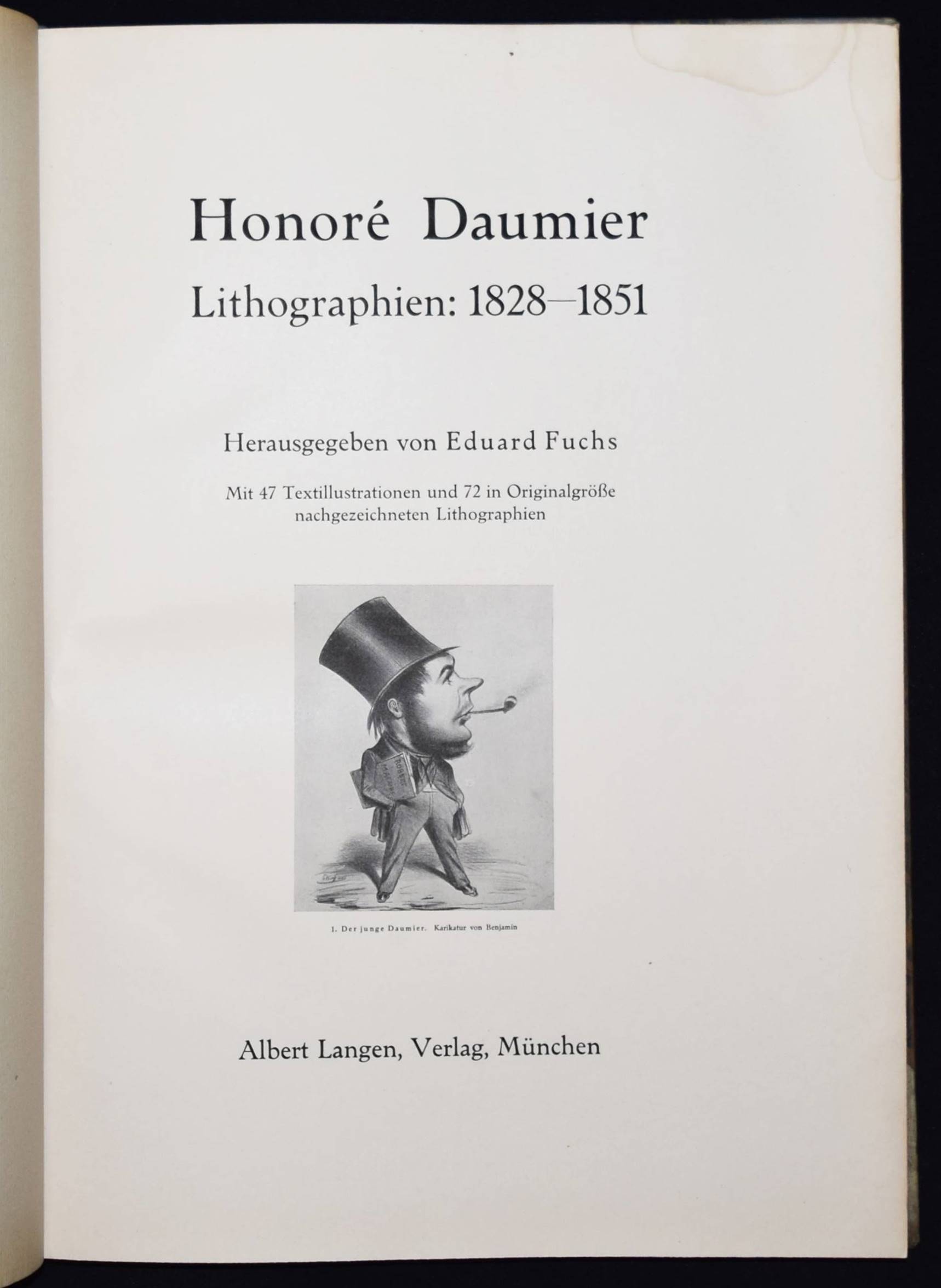 Daumier – Fuchs, Eduard (Hrsg.). Honoré Daumier. Lithographien 1828 – 1872. 3 Bände. München, Albert Langen 1921. Folio (38 x 29 cm.). 68 S.; 32 S.; 28 S. mit zus. 81 Abb. im Text und 216 Orig.-Lithographien von Paul Mechel nach H. Daumier. OHprgt. mit goldgepr. Rückentiteln und Kopfgoldschnitt. (Werke von Honoré Daumier, Band II-IV). Jeweils eines von 100 num. Exemplaren der Vorzugsausgabe auf besserem Papier und in dekorativen Halbpergamenteinbänden. – „Max Slevogt gewidmet“. – „Daumier besaß einen unerschöpflichen Reichtum an Phantasie … Seine Lithographien … sind jähe und kühne Niederschriften, vom inspiratorischen Augenblick geboren und … zur Reife und Vollendung gebracht“ (I, S. 7). – Es erschien noch Band I der Werkausgabe mit den Holzschnitten, dieser jedoch nicht in dem Halbpergamenteinband. – Sehr gutes sauberes Exemplar.