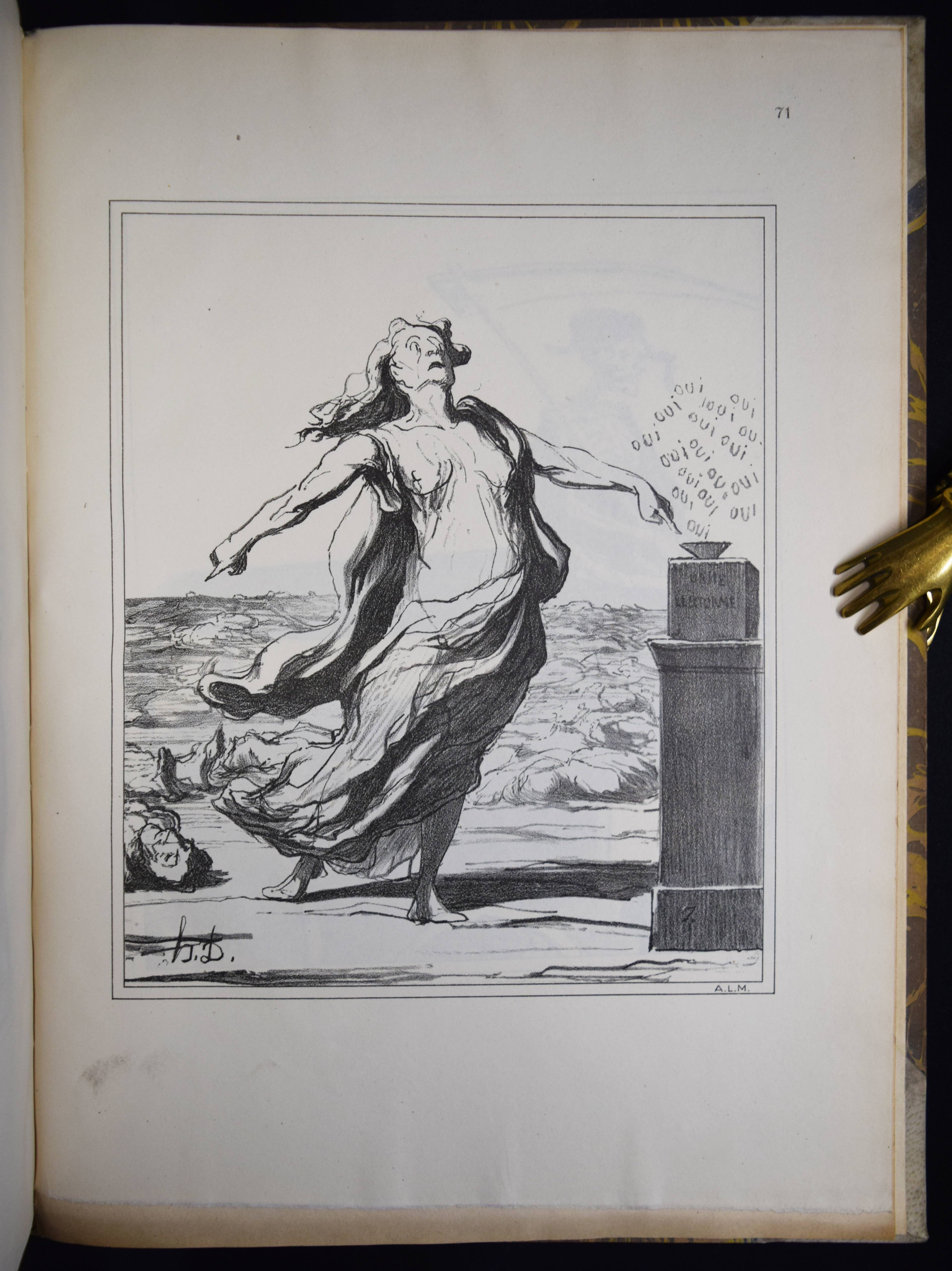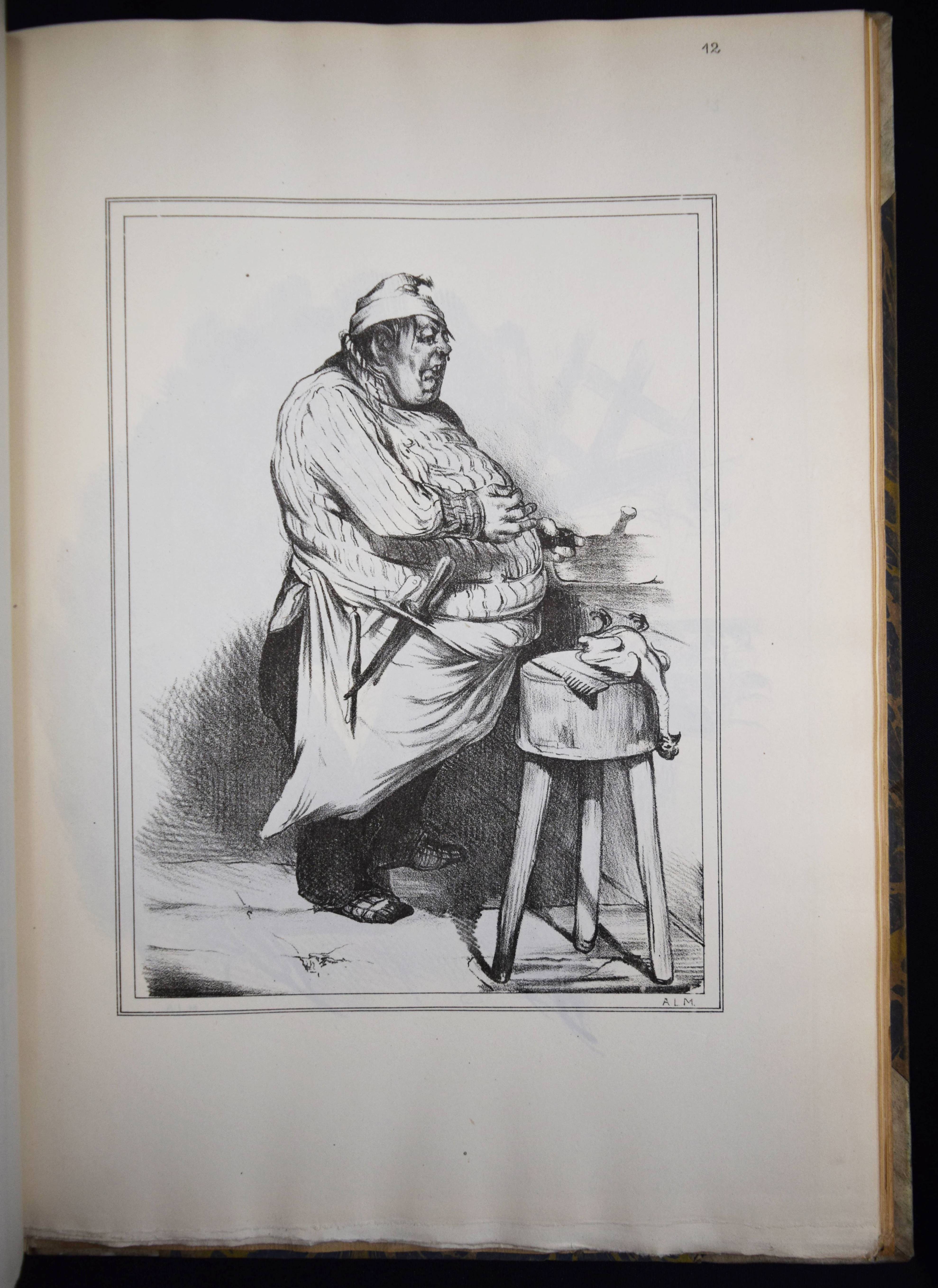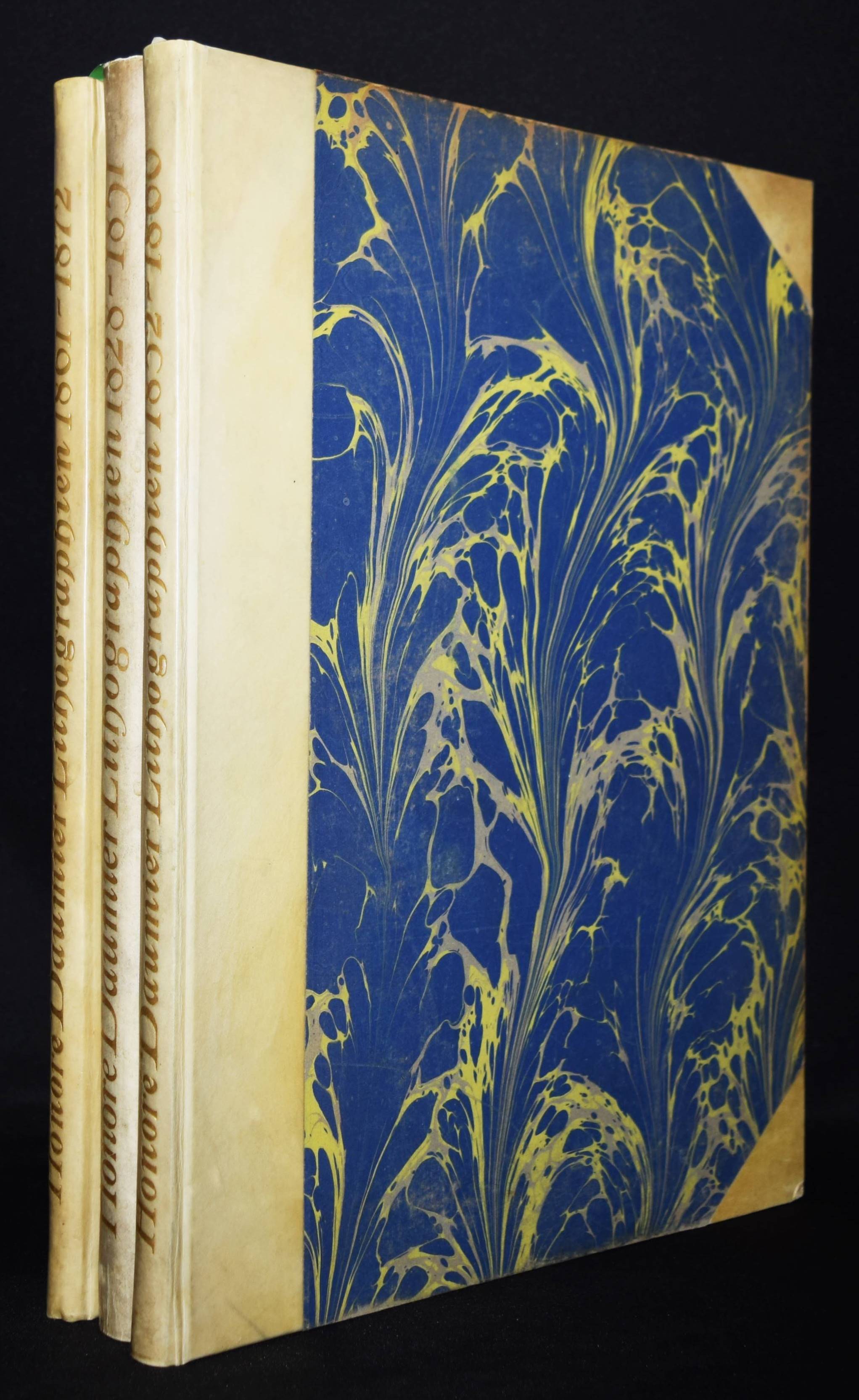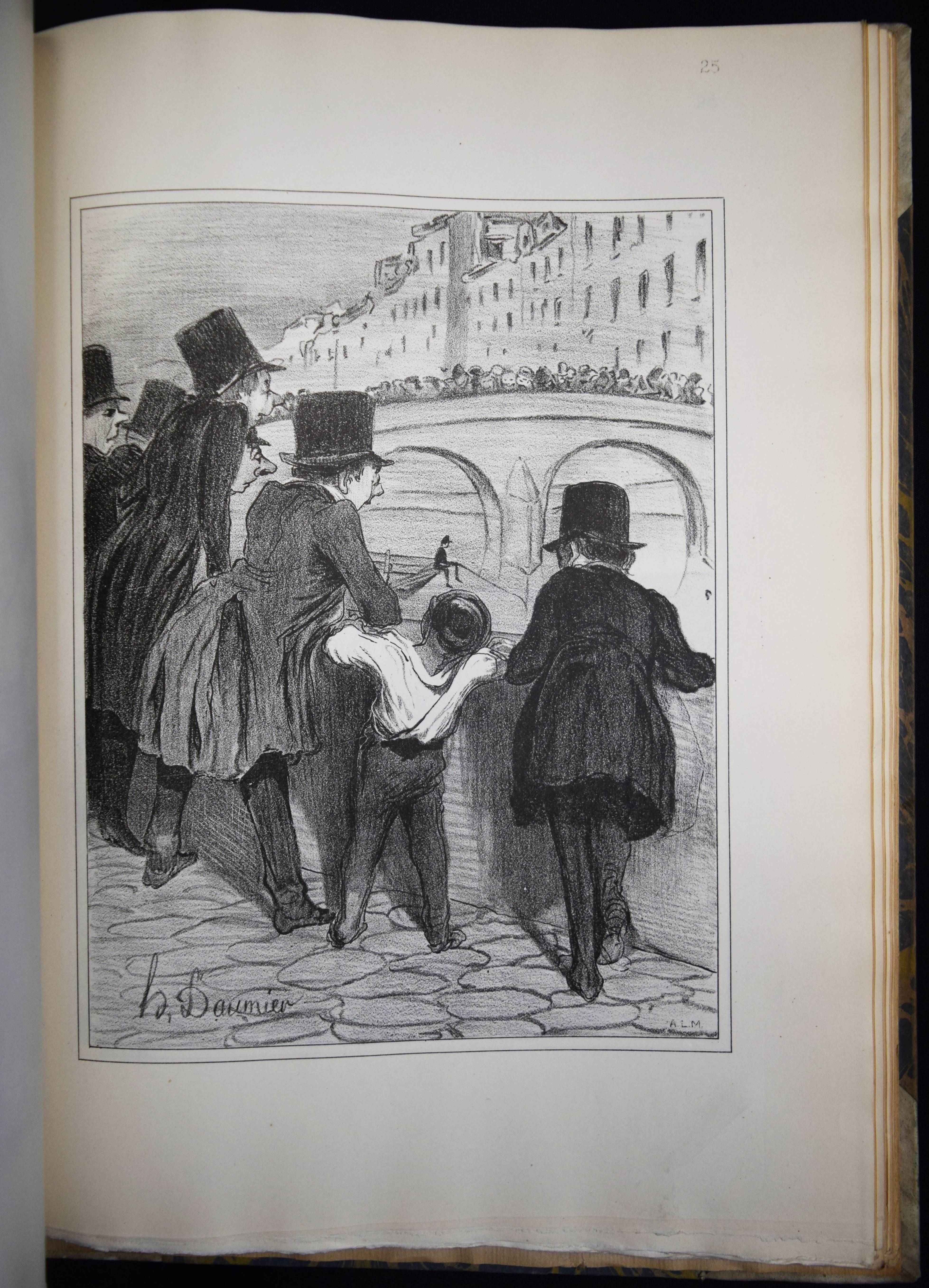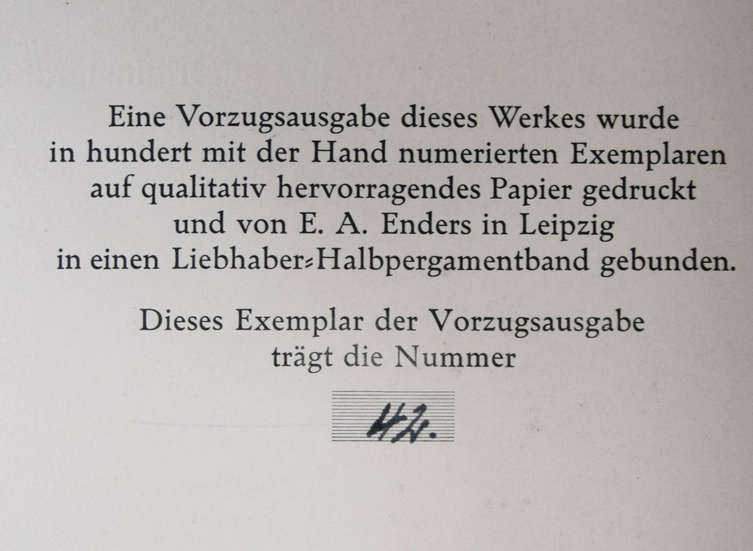 Daumier – Fuchs, Eduard (Hrsg.). Honoré Daumier. Lithographien 1828 – 1872. 3 Bände. München, Albert Langen 1921. Folio (38 x 29 cm.). 68 S.; 32 S.; 28 S. mit zus. 81 Abb. im Text und 216 Orig.-Lithographien von Paul Mechel nach H. Daumier. OHprgt. mit goldgepr. Rückentiteln und Kopfgoldschnitt. (Werke von Honoré Daumier, Band II-IV). Jeweils eines von 100 num. Exemplaren der Vorzugsausgabe auf besserem Papier und in dekorativen Halbpergamenteinbänden. – „Max Slevogt gewidmet“. – „Daumier besaß einen unerschöpflichen Reichtum an Phantasie … Seine Lithographien … sind jähe und kühne Niederschriften, vom inspiratorischen Augenblick geboren und … zur Reife und Vollendung gebracht“ (I, S. 7). – Es erschien noch Band I der Werkausgabe mit den Holzschnitten, dieser jedoch nicht in dem Halbpergamenteinband. – Sehr gutes sauberes Exemplar.