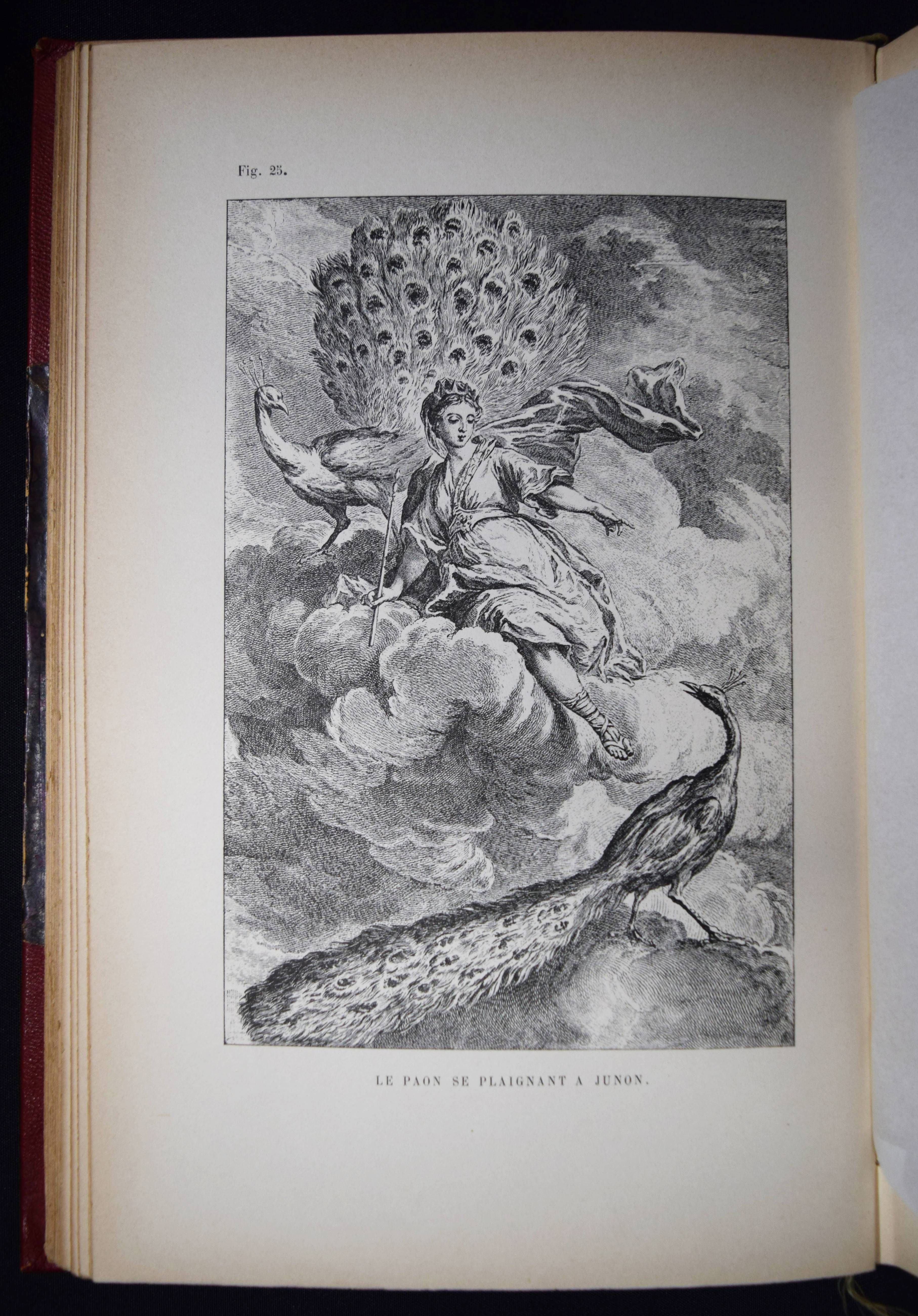 La Fontaine, (Jean de). Fables choisies de La Fontaine. Illustrées de 65 compositions hors texte par J(ean)-B(aptiste) Oudry. Paris, Librairie Theodore Levèvre et Cie. et Émile Guérin o. J. (1893). 4°. Titel, 287, (1) S. mit Titel in Rot und Schwarz, Titelvignette und 65 Holzstich-Tafeln nach Kupferstichen. Weinroter Halb-Maroquinband der Zeit mit goldgepr. Rückentitel, dekorativer Rückenvergoldung, Deckelfiletten und Kopfgoldschnitt. Nicht bei Bodemann. – Seltene Neuausgabe mit Holzstichen nach den wohl berühmtesten Illustrationen zu den Fabeln La Fontaines. – Deckel etwas berieben, St.a.T., schönes dekorativ gebundenes Exemplar.