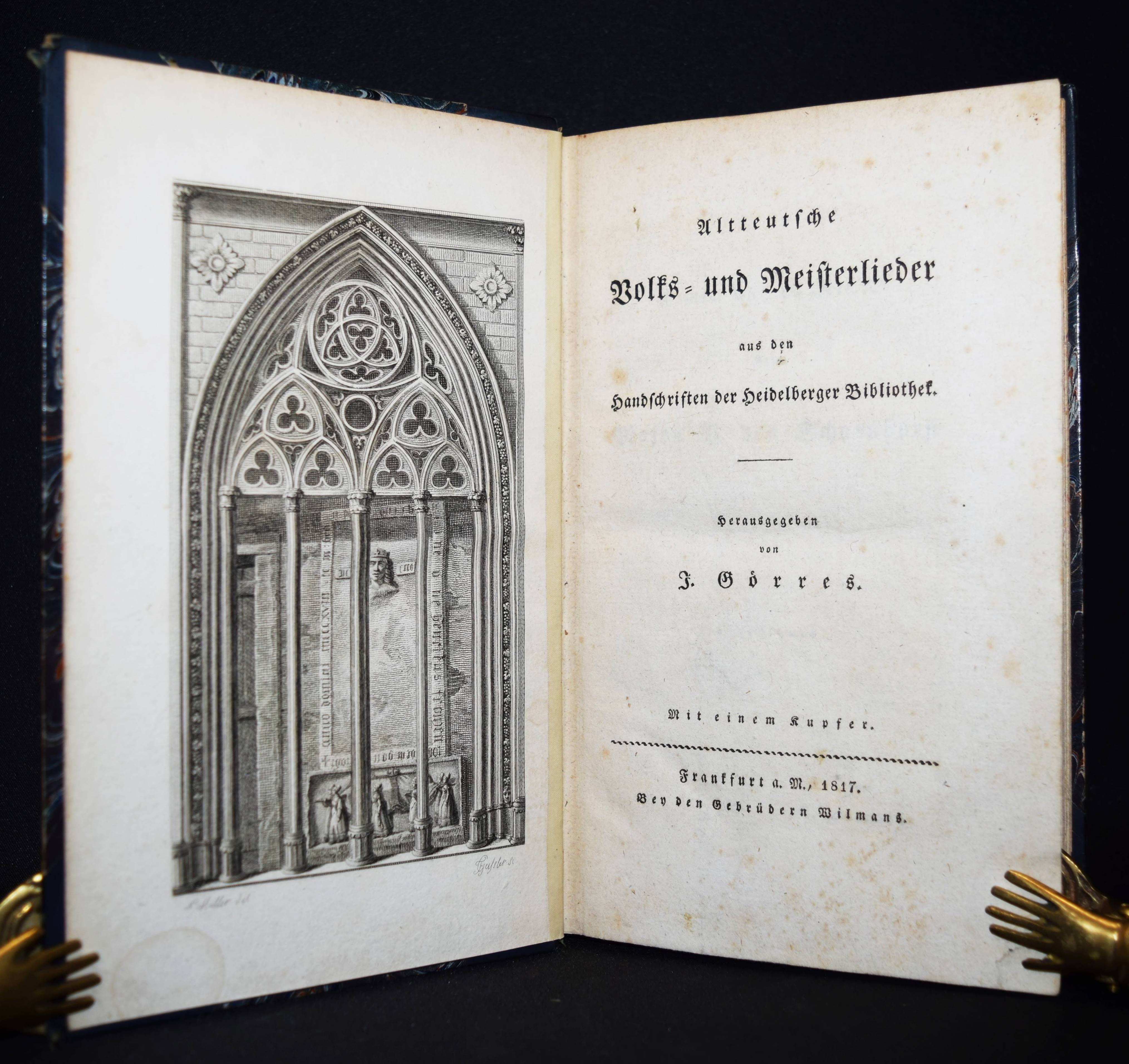 Görres, J(oseph) v. (Hrsg.). Altteutsche Volks- und Meisterlieder. Aus den Handschriften der Heidelberger Bibliothek. Frankfurt a. M., Gebrüder Wilmans 1817. 8°. LXVI, 336 S., [1] Bl. mit gestoch. Frontispiz von F. Geissler nach N(icolaus) Müller. Dunkelblauer Halblederband um 1920 mit goldgepr. Rückentitel und Rückenvergoldung. Slg. Borst 1269. Goed. I, 308 u. VI, 205, 24. – Erste Ausgabe der bedeutenden Sammlung. – „Seinem wackern Freunde dem Major W. v. Scharnhorst zugeeignet“. – Enthält: Liebeslieder; Scherzhafte Lieder und Neidharte; Romanzen und Balladen; Legenden und geistliche Lieder. – Stellenweise braunfleckig, gutes Exemplar.