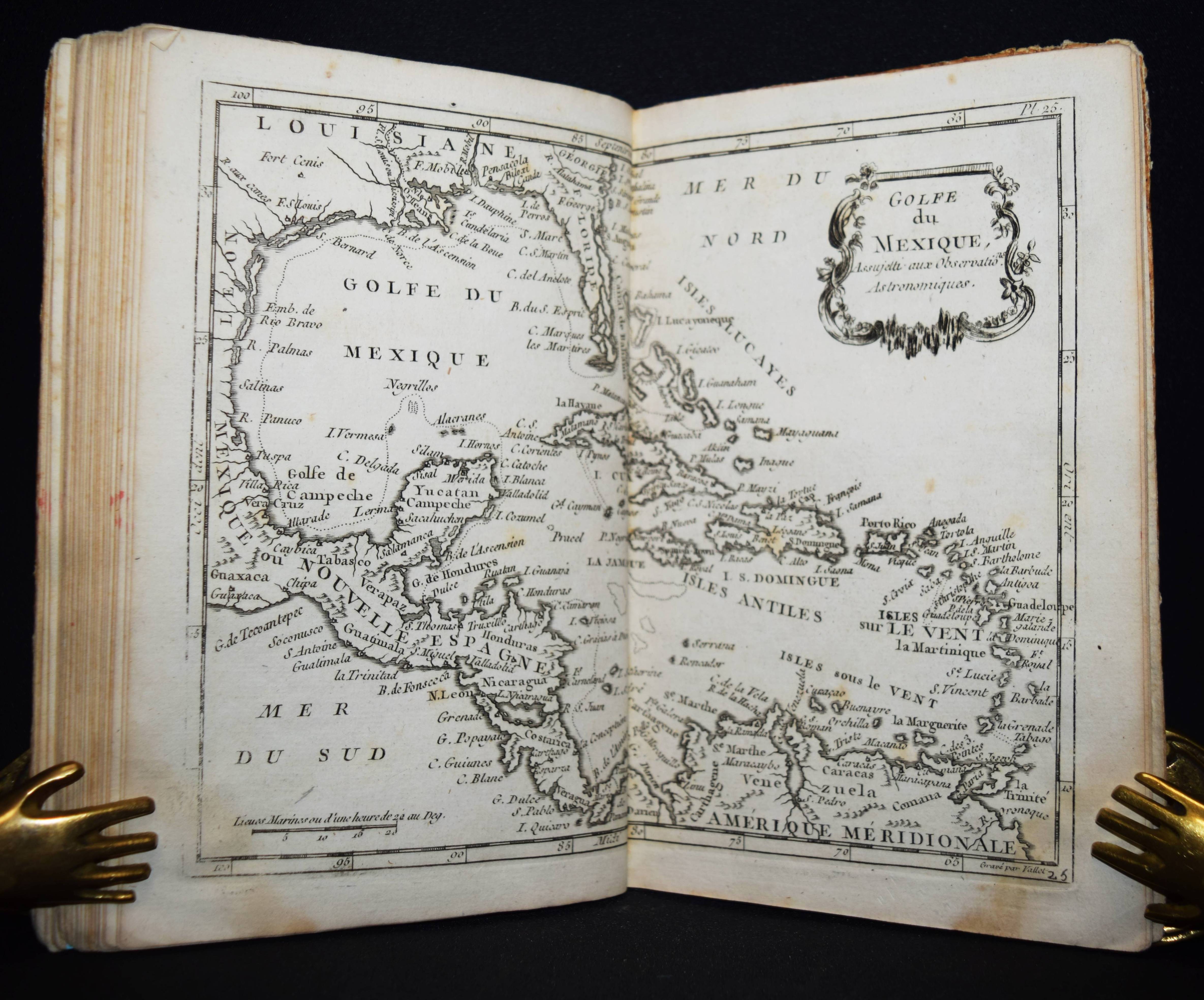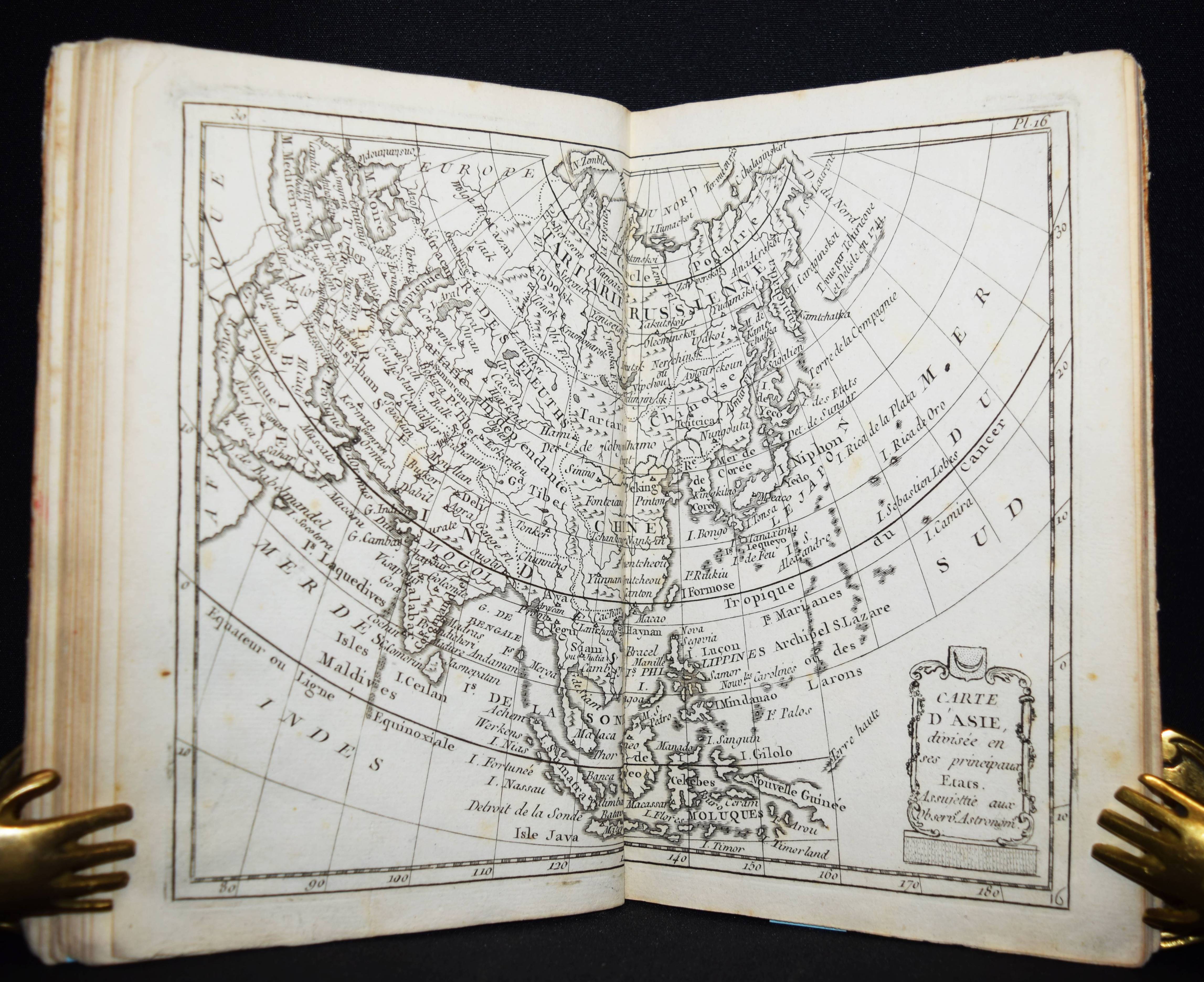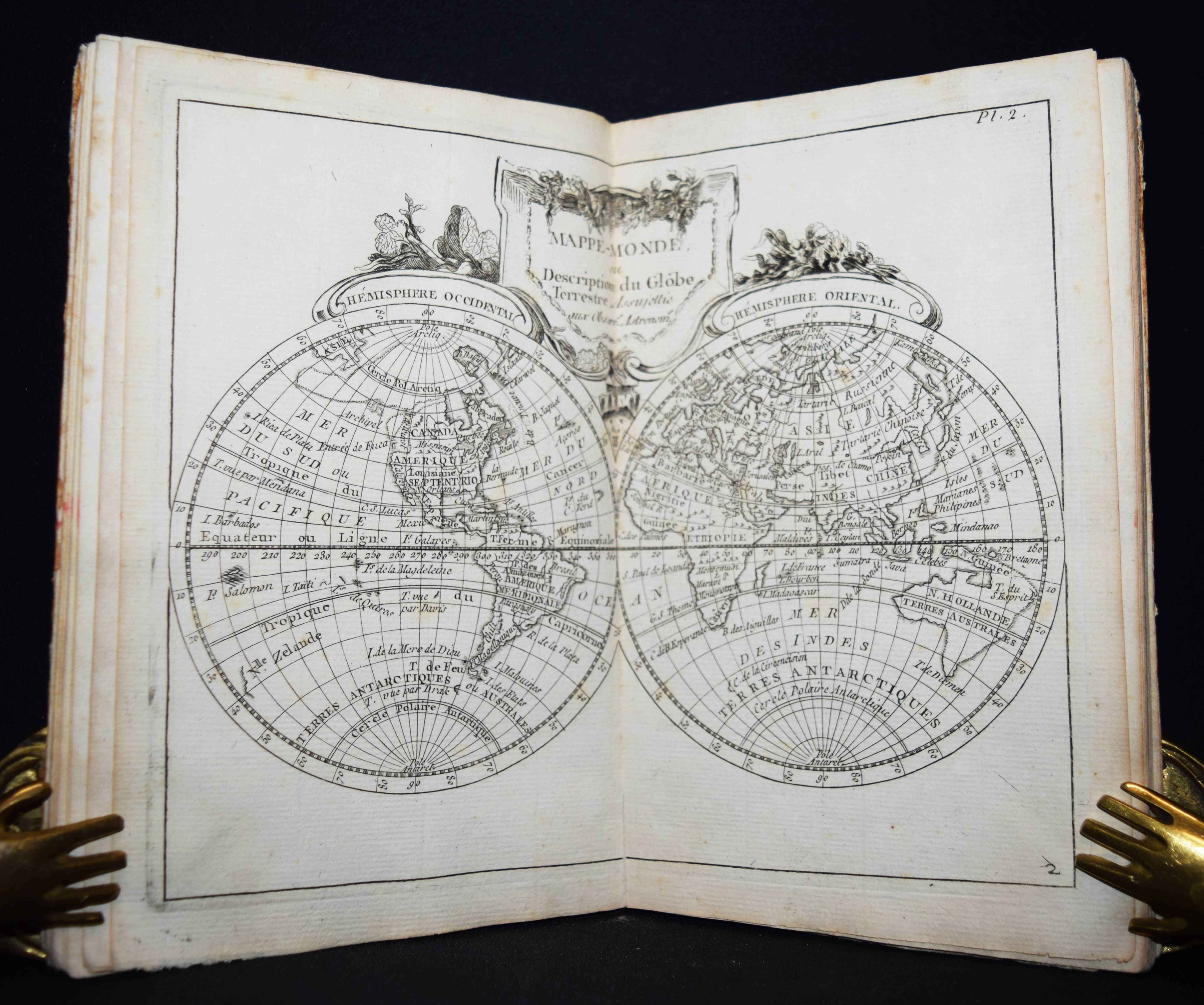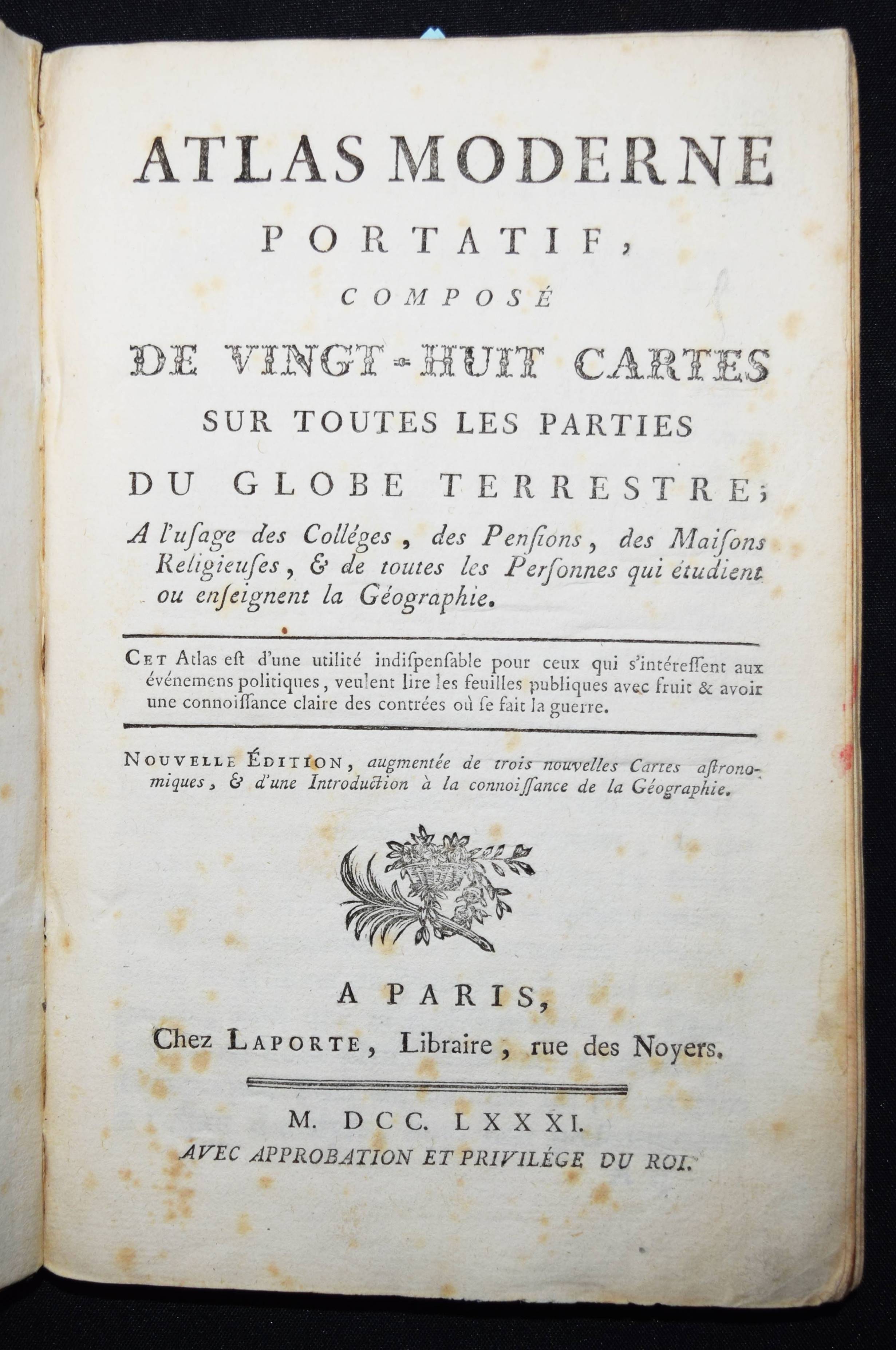 (Domairon, Louis). Atlas moderne portatif. Composé de vingt-huit cartes sur toutes les parties du globe terrestre. A l’usage des colléges, des pensions, des maisons religieuses, & de toutes les personnes qui étudient ou enseignent la géographie. Nouv. édition, augmentée de trois nouvelles cartes astronomiques… Paris, Laporte 1781. 8°. 16 S. und 28 doppelblattgr. gestoch. Karten. Pappband der Zeit. Mehrfach aufgelegter französischer Schul-Atlas mit 4 Schaubildern zur Astonomie, 2 Hemisphären-Himmelkarten, einer Sphären-Karte und einer Hemissphären-Karte, sowie Karten europäischer Länder, Amerika, Afrika, China und Japan, Golf von Mexiko etc. Alle Karten mit dekorativer Kartusche. – Rücken alt mit pergamentartigem Papierstreifen überklebt, stellenweise im unteren Blattrand etwas braunfleckig, sonst gut erhalten.