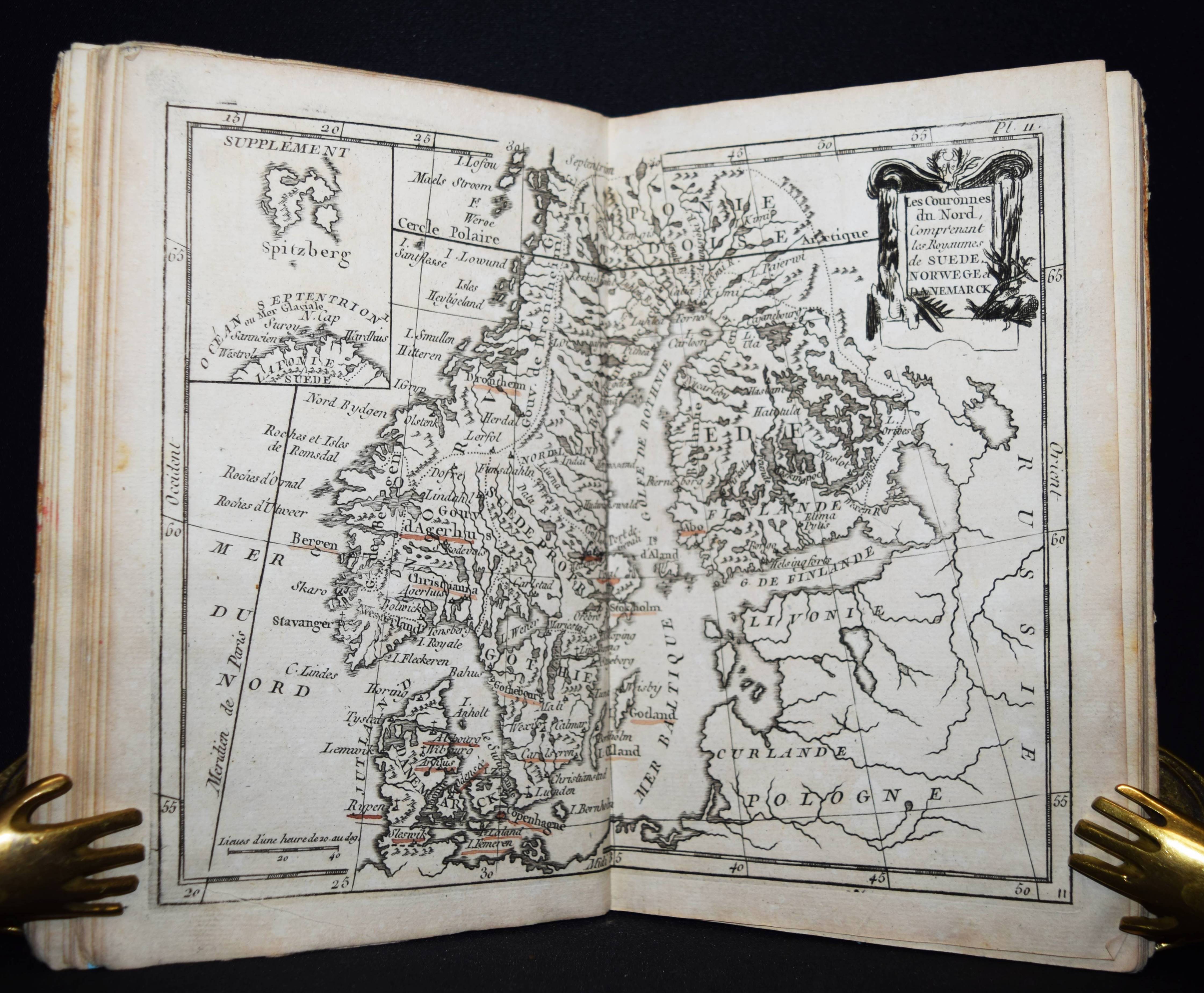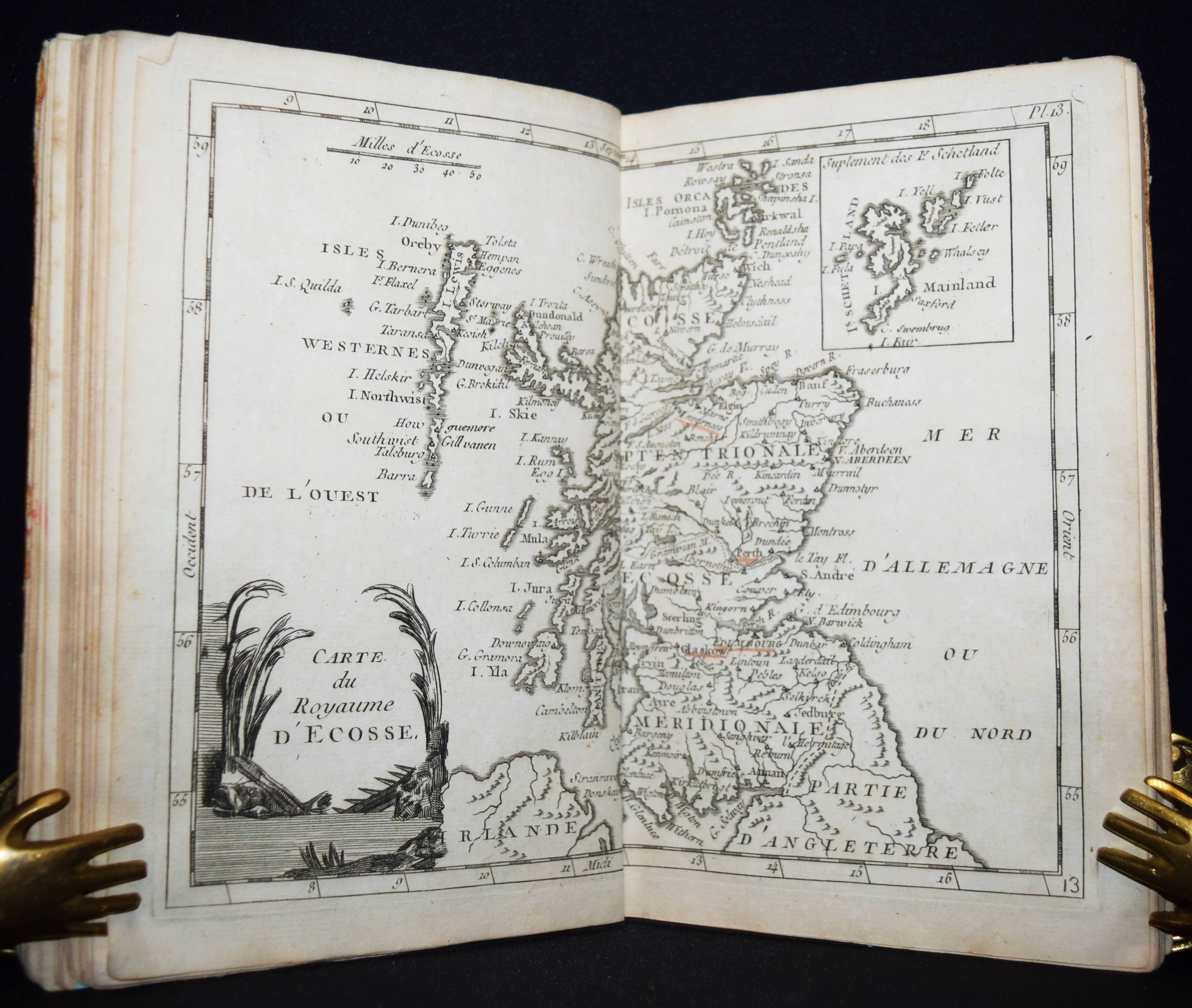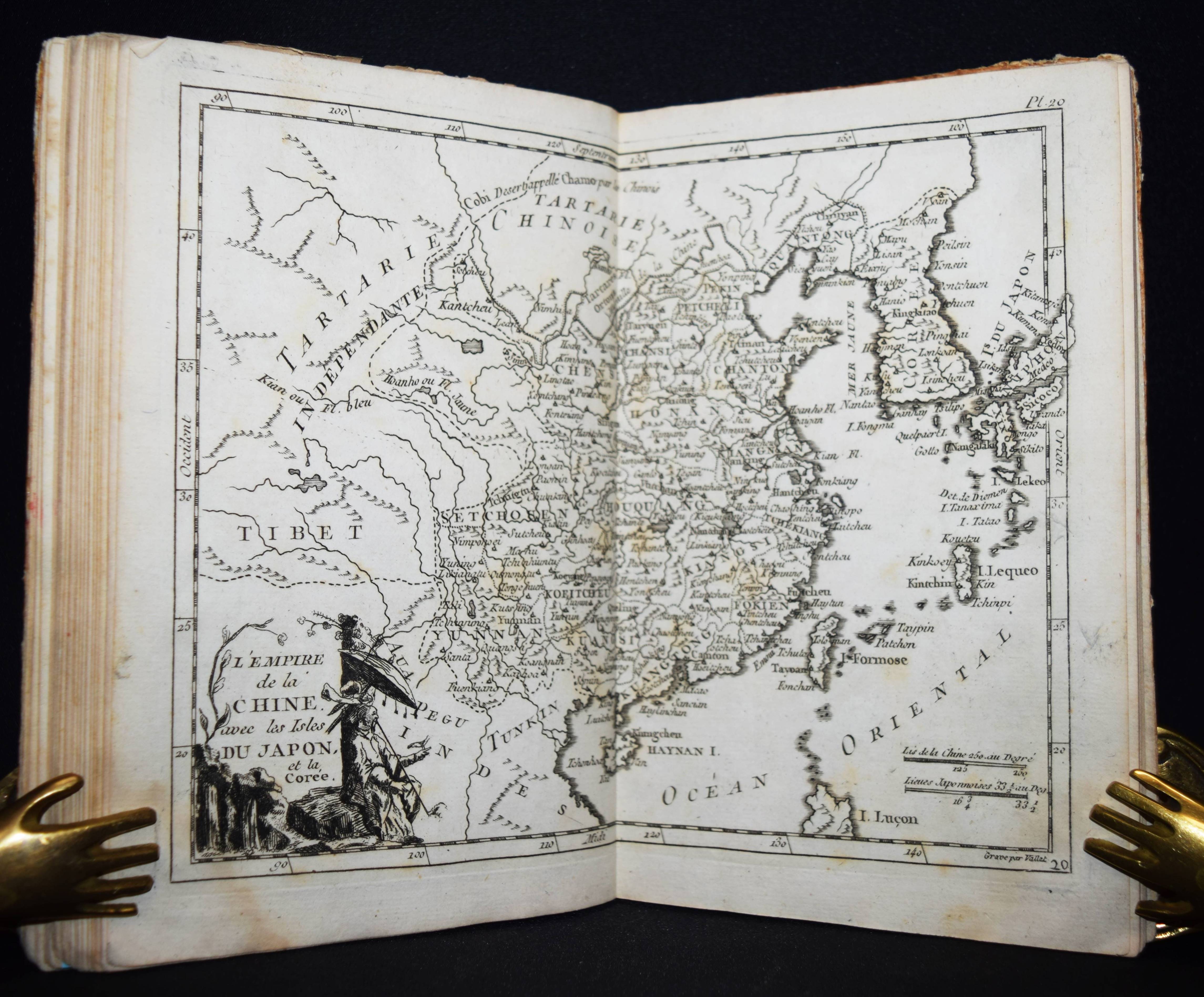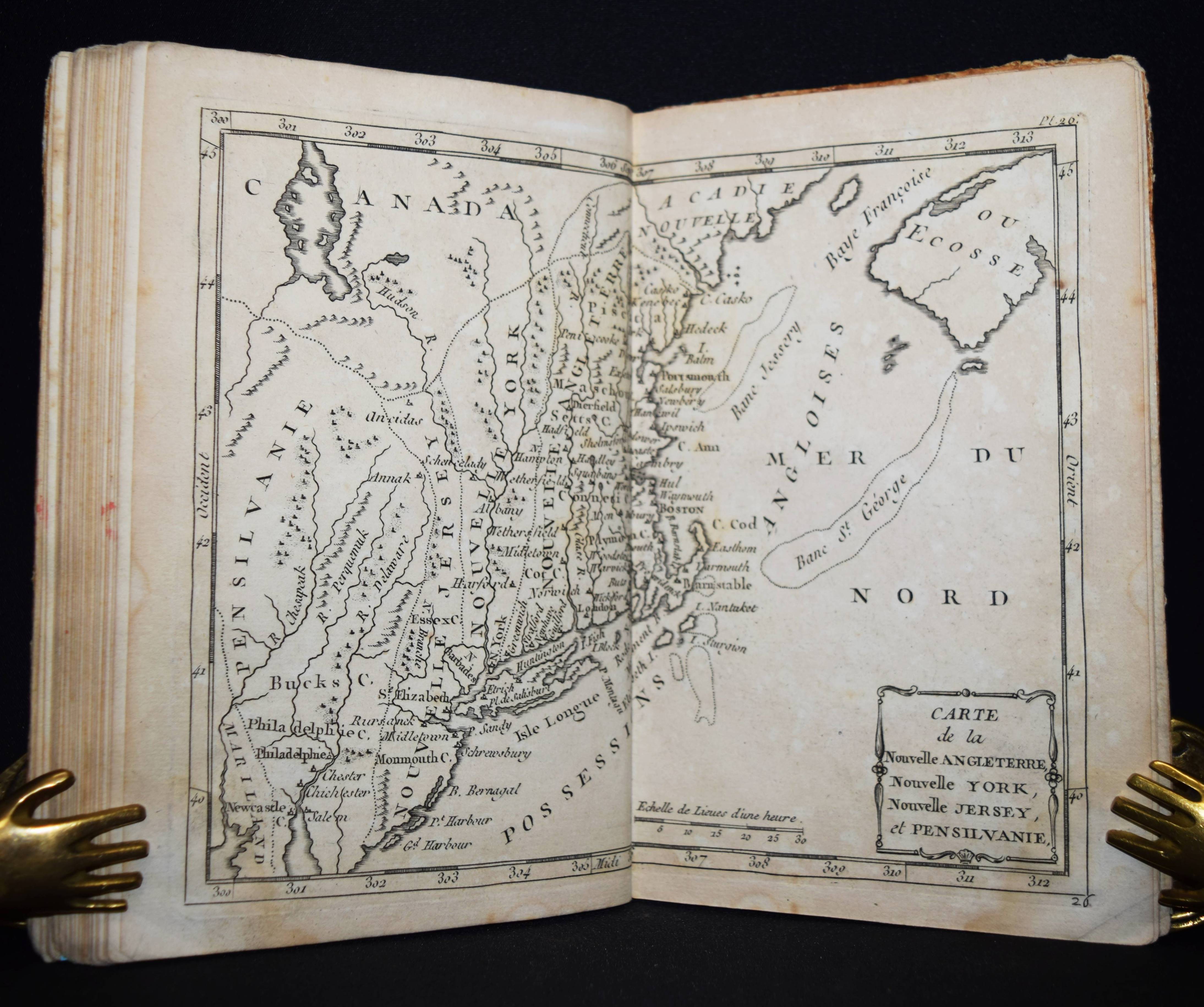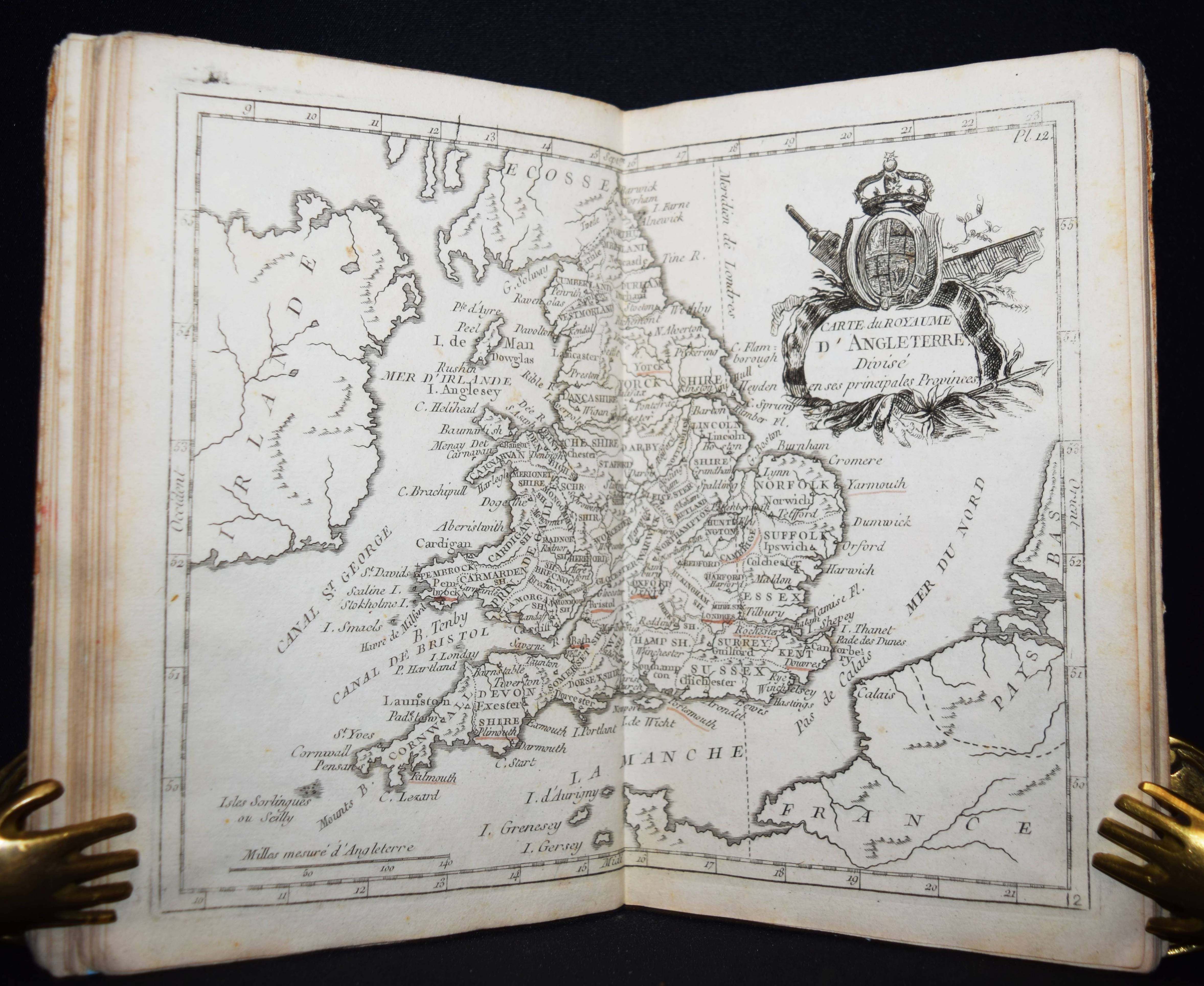 (Domairon, Louis). Atlas moderne portatif. Composé de vingt-huit cartes sur toutes les parties du globe terrestre. A l’usage des colléges, des pensions, des maisons religieuses, & de toutes les personnes qui étudient ou enseignent la géographie. Nouv. édition, augmentée de trois nouvelles cartes astronomiques… Paris, Laporte 1781. 8°. 16 S. und 28 doppelblattgr. gestoch. Karten. Pappband der Zeit. Mehrfach aufgelegter französischer Schul-Atlas mit 4 Schaubildern zur Astonomie, 2 Hemisphären-Himmelkarten, einer Sphären-Karte und einer Hemissphären-Karte, sowie Karten europäischer Länder, Amerika, Afrika, China und Japan, Golf von Mexiko etc. Alle Karten mit dekorativer Kartusche. – Rücken alt mit pergamentartigem Papierstreifen überklebt, stellenweise im unteren Blattrand etwas braunfleckig, sonst gut erhalten.