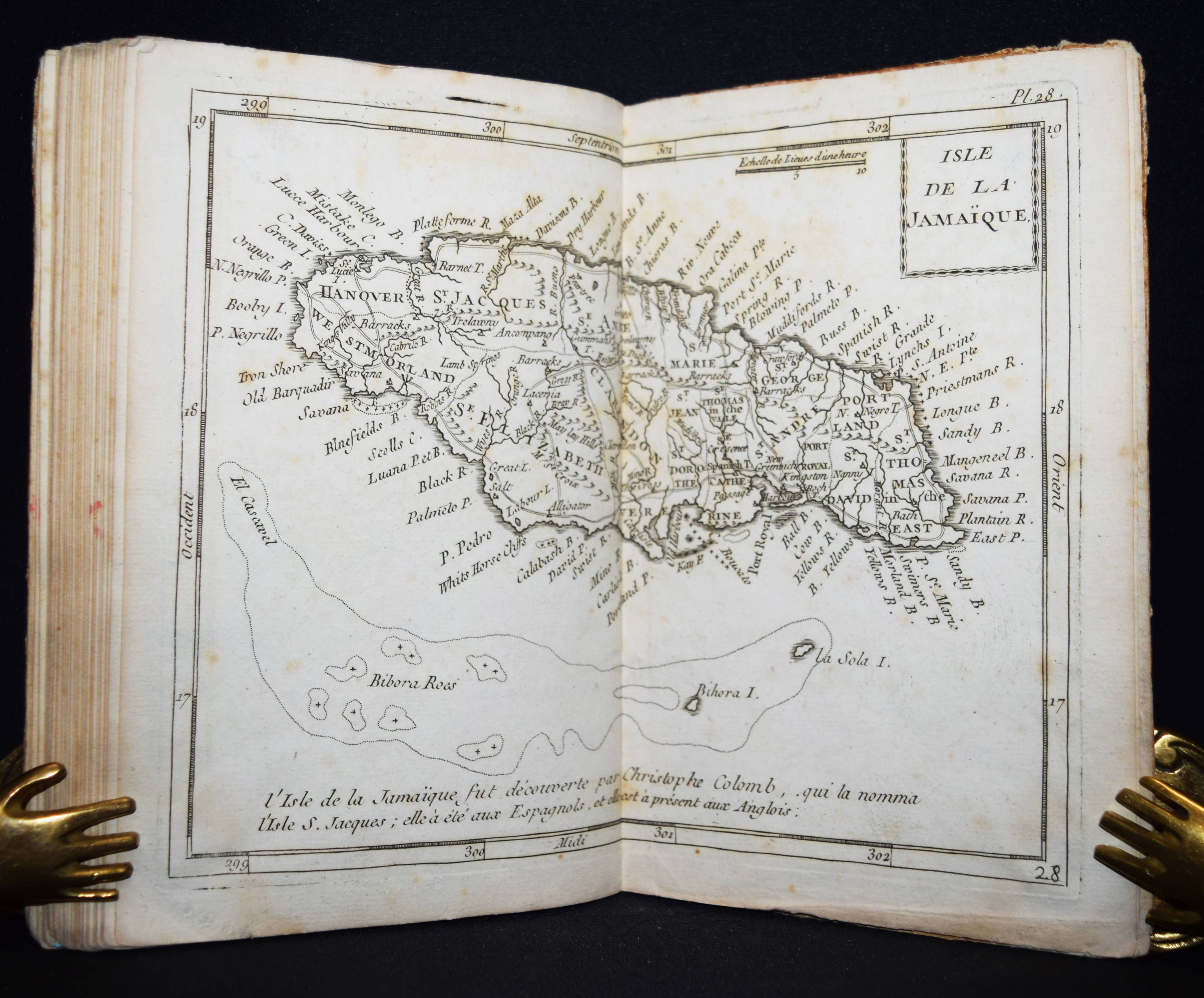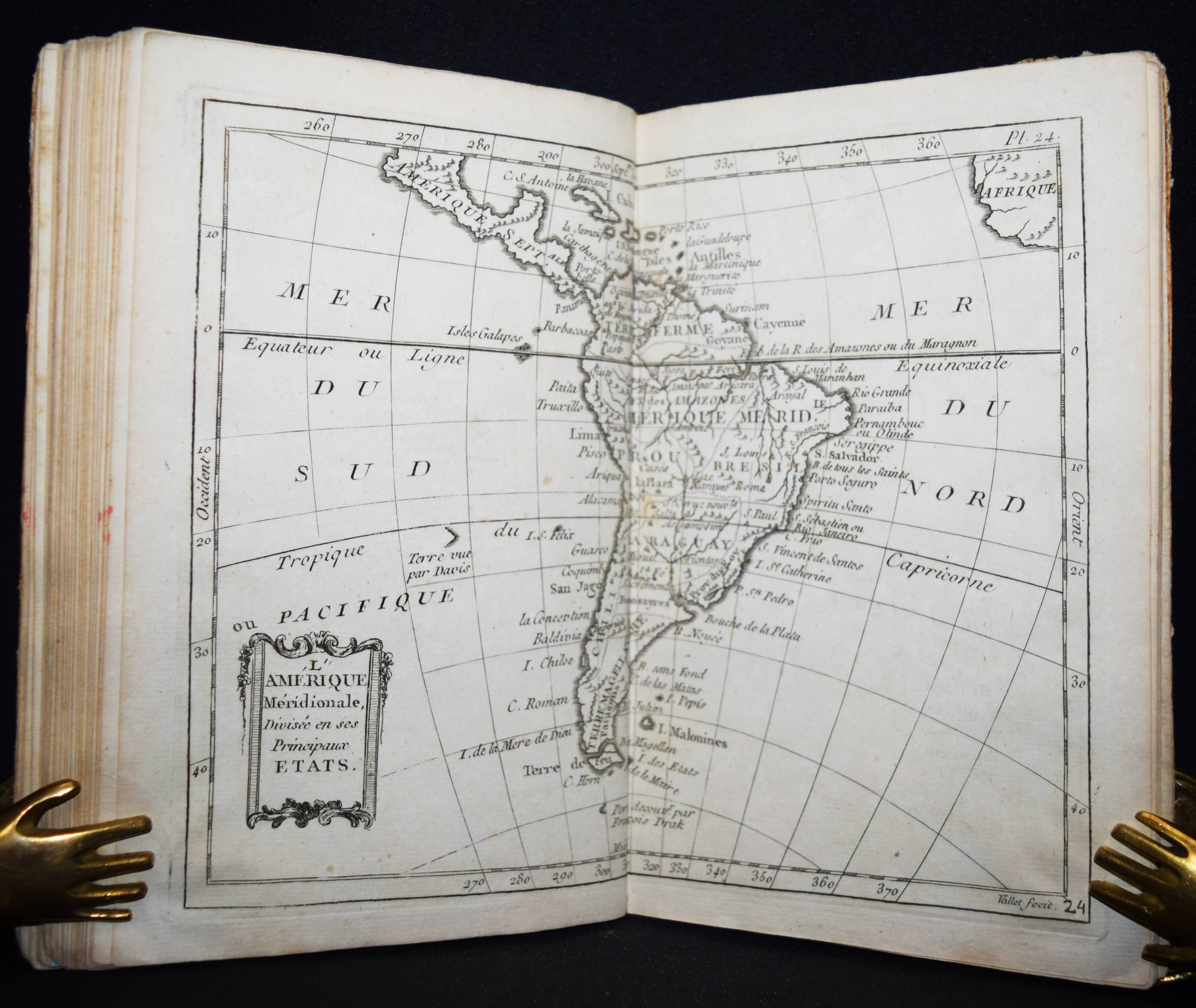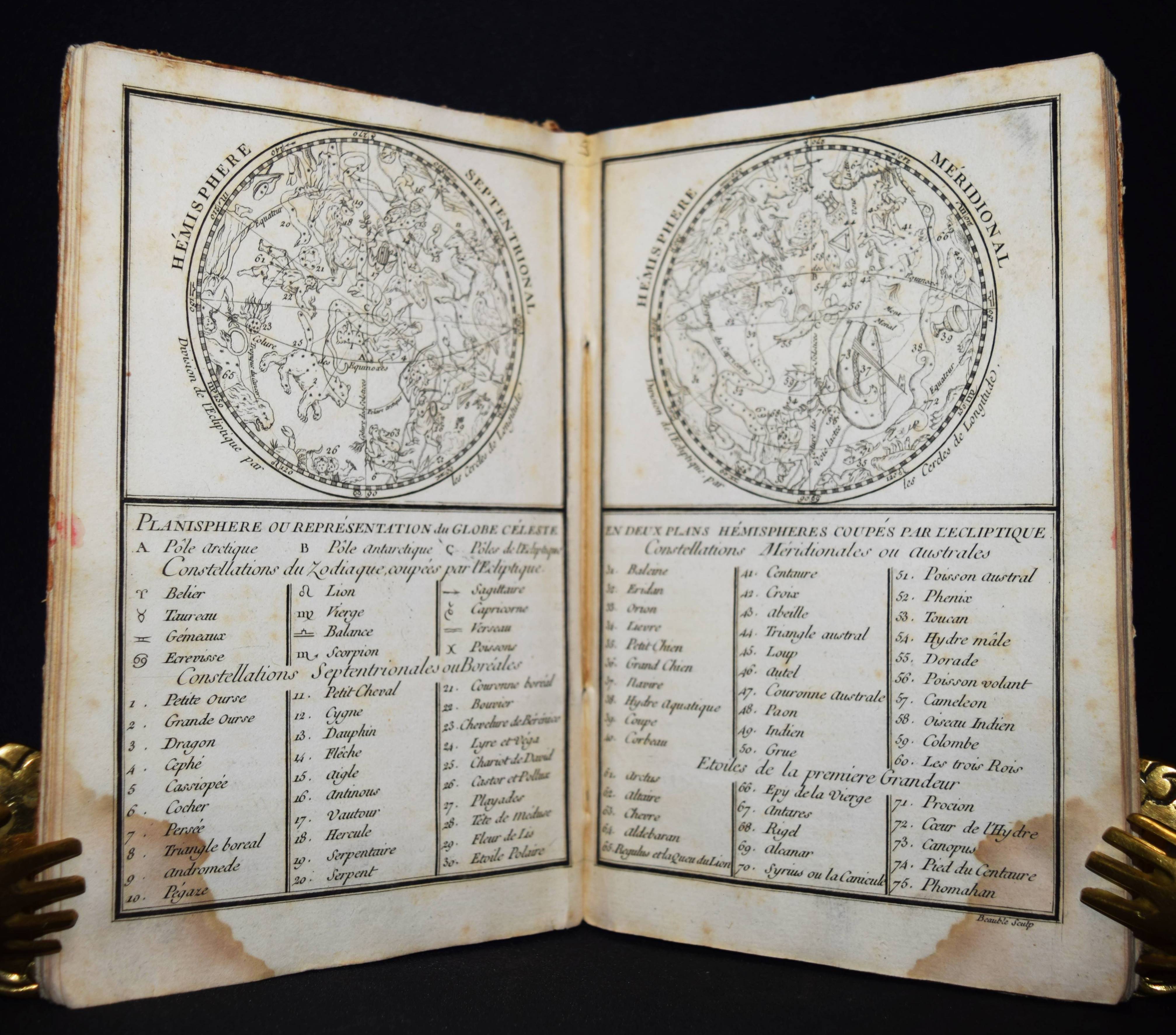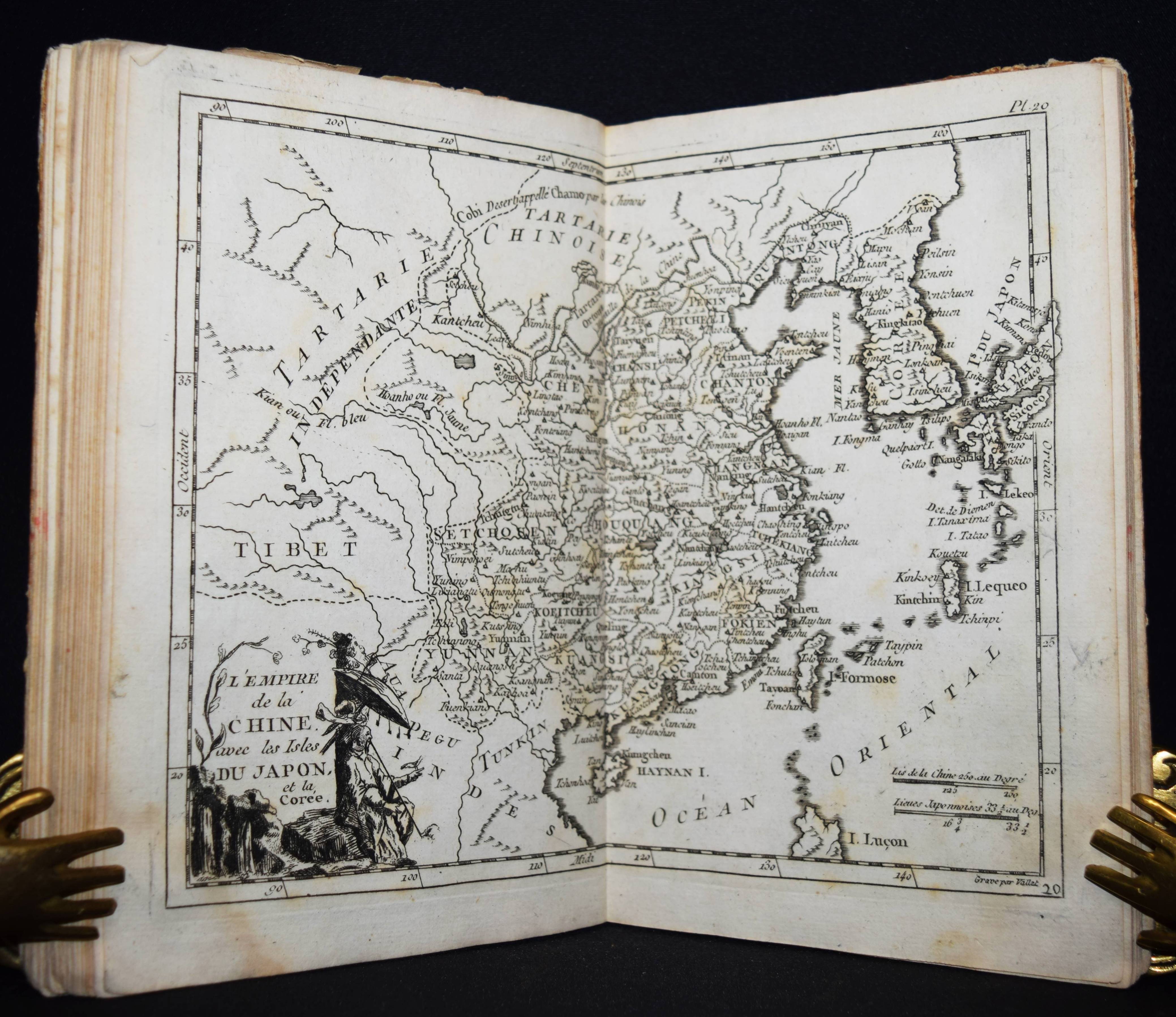 (Domairon, Louis). Atlas moderne portatif. Composé de vingt-huit cartes sur toutes les parties du globe terrestre. A l’usage des colléges, des pensions, des maisons religieuses, & de toutes les personnes qui étudient ou enseignent la géographie. Nouv. édition, augmentée de trois nouvelles cartes astronomiques… Paris, Laporte 1781. 8°. 16 S. und 28 doppelblattgr. gestoch. Karten. Pappband der Zeit. Mehrfach aufgelegter französischer Schul-Atlas mit 4 Schaubildern zur Astonomie, 2 Hemisphären-Himmelkarten, einer Sphären-Karte und einer Hemissphären-Karte, sowie Karten europäischer Länder, Amerika, Afrika, China und Japan, Golf von Mexiko etc. Alle Karten mit dekorativer Kartusche. – Rücken alt mit pergamentartigem Papierstreifen überklebt, stellenweise im unteren Blattrand etwas braunfleckig, sonst gut erhalten.