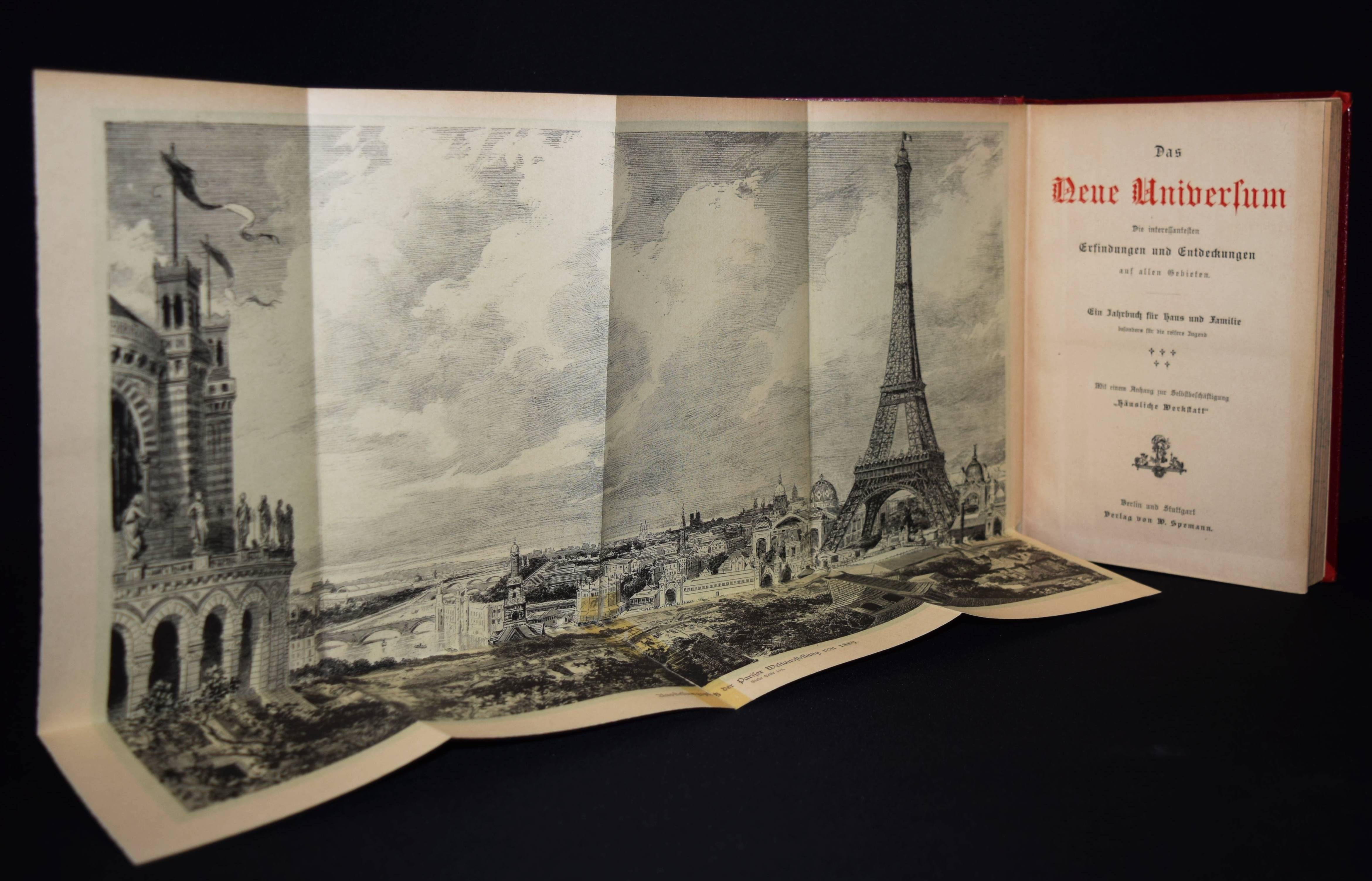 Das Neue Universum. Die interessantesten Erfindungen und Entdeckungen auf allen Gebieten. Ein Jahrbuch für Haus und Familie besonders für die reifere Jugend. (5. Jahrgang). Berlin und Stuttgart, W. Spemann o. J. (1890). Gr.-8°. Titel, 396 S. mit lithogr., gefalt. Frontispiz (″Ausstellungsplatz der Pariser Weltausstellung von 1889“) und zahlr. Illustrationen nach Holzstichen im Text und auf 12 Tafeln. Illustr. schwarzgepr. OHln. mit goldgepr. Rücken- u. Deckeltitel. Seltener zehnter Jahrgang des erfolgreichsten deutschsprachigen Jugend-Jahrbuchs. Mit interessanten Beiträgen zu Themen wie Länder- und Völkerkunde, Verkehrswesen, Militär, Marine, Flugwesen etc. – Das gefalt. Frontispiz im Falz stellenweise mit Japanpapier hinterlegt, papierbedingt etwas gebräunt, sehr gutes sauberes Exemplar.