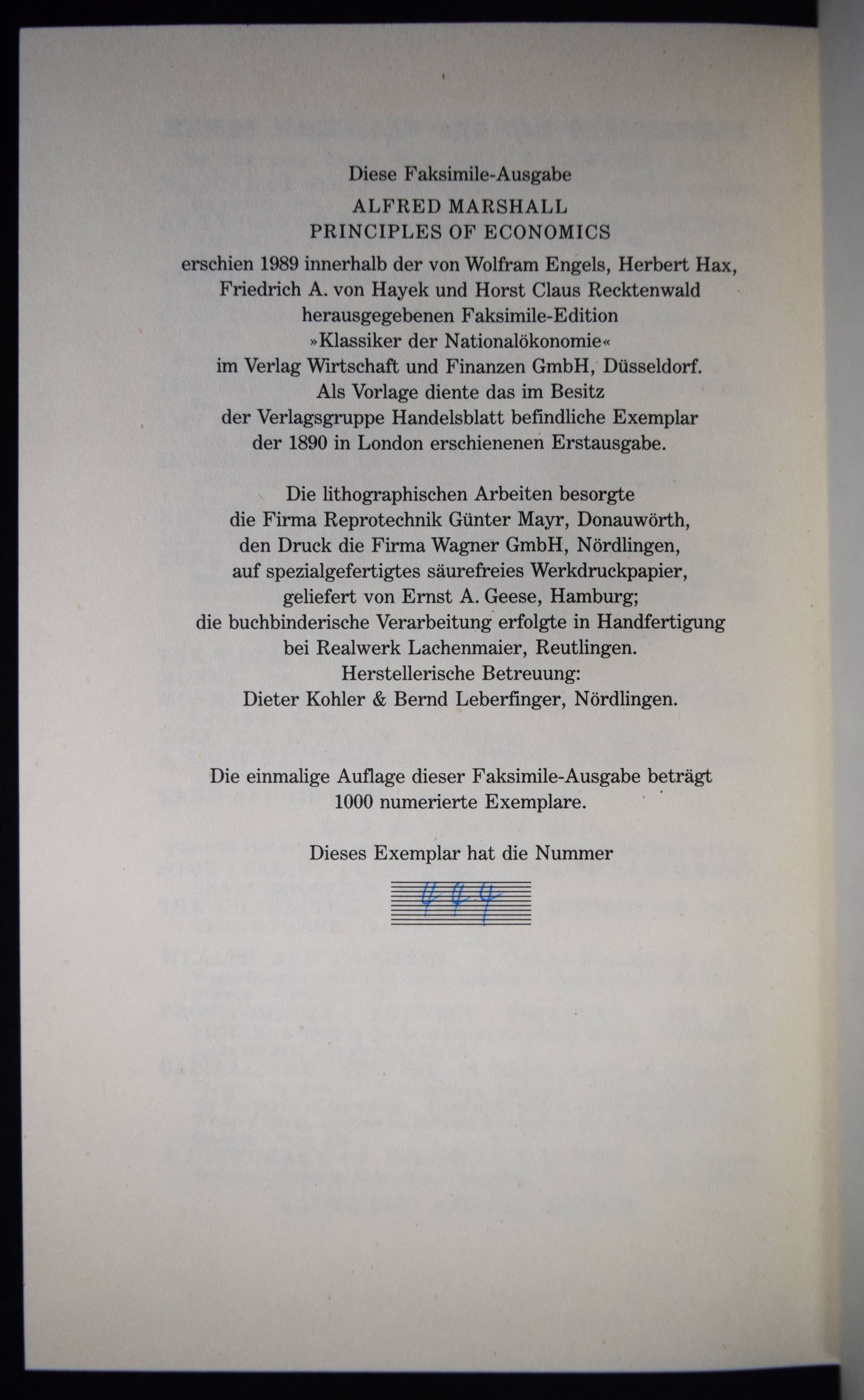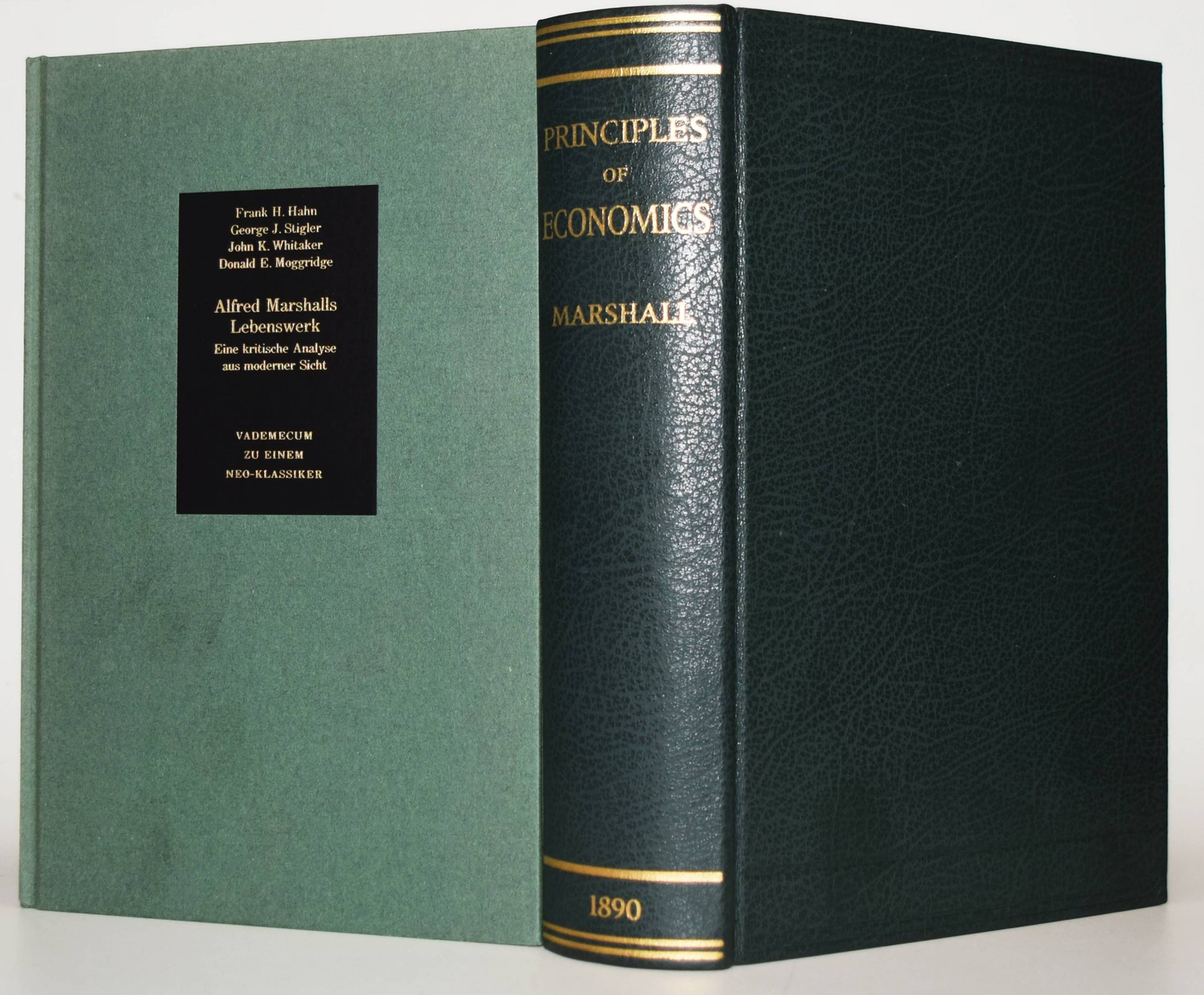 Marshall, Alfred. Principles of economics. Vol(ume) I (mehr nicht erschienen). (Faksimile-Ausgabe der Ausgabe London 1890). Mit dem Kommentarband: Hahn, Frank H., George J. Stigler, John K. Whitaker, Donald E. Moggridge. Alfred Marshalls Lebenswerk. Eine kritische Analyse aus moderner Sicht. Vademecum zu einem Neo-Klassiker. Düsseldorf, Verlag Wirtschaft und Finanzen (1989). 8°. XXVIII, 754 S., [2] Bl.; 117 S. Nachtblauer OLdr. mit goldgepr. Rückentitel und Linienvergoldung und OPbd. Eines von 1000 num. Exemplaren. – Sehr gutes Exemplar.