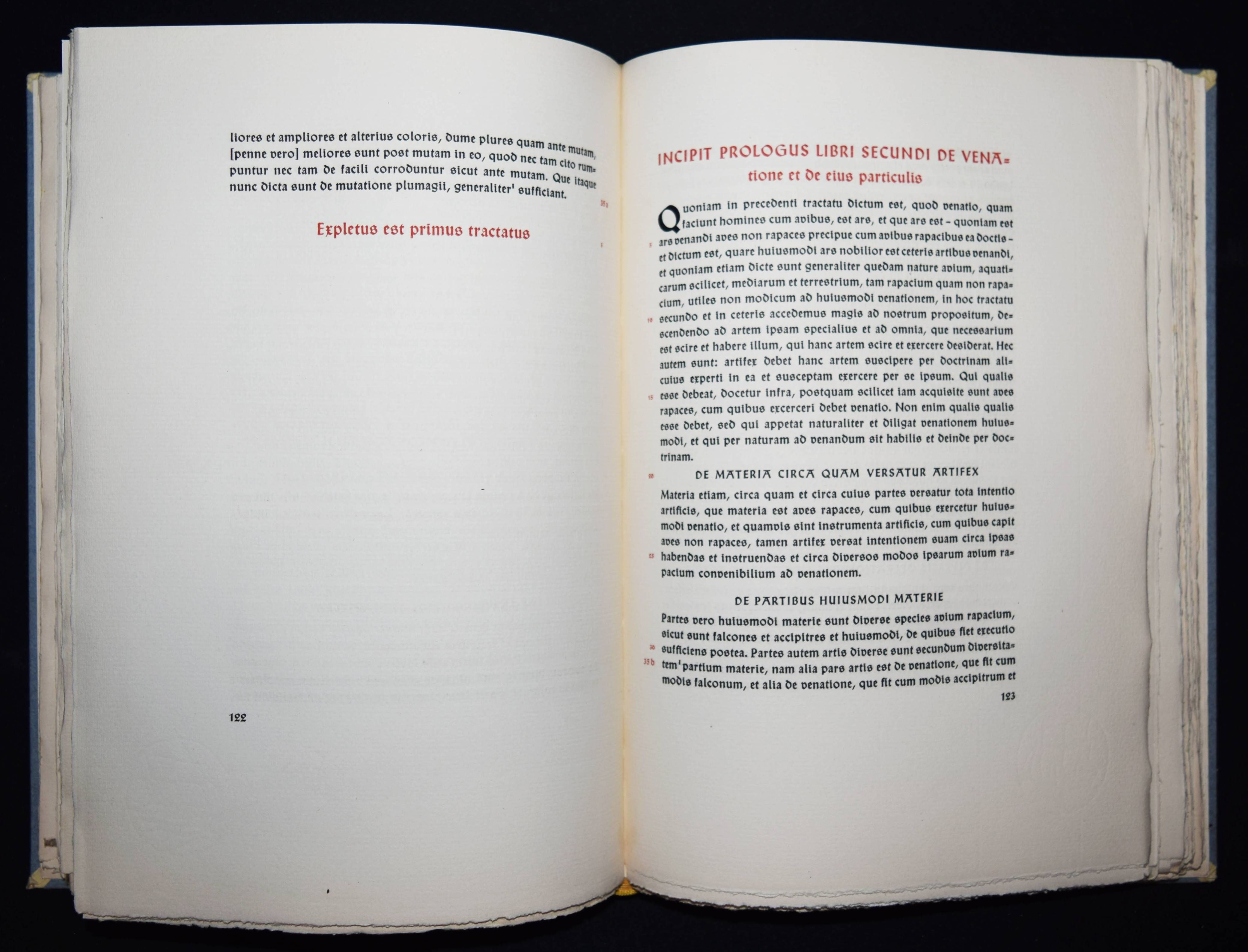 Friderici Romanorum Imperatoris (Friedrich II. von Hohenstaufen). Secundi De arte venandi cum avibus. Nunc primum integrum edit C. A. Willemsen. 2 Bände. Lipsiae (Leipzig), In aedibus Insulae (Insel-Verlag) (1942). 4°. 265 S.; 265 S. mit Titelvignetten. OHprgt. mit goldgepr. Rückenschildern und blindgepr. Deckelvignetten. Sarkowski 497. – Eines von 600 num. Exemplaren auf Insel-Bütten. – Druck in Schwarz und Rot in lateinischer Sprache. – „Die älteste Schrift im lateinischen Westen, in der ein Autor bemüht ist, sich bei der Beschreibung des Gegenstandes ausschließlich auf seine persönliche Erfahrung und eigene Experimente zu stützen. Friedrich II. war dabei so erfolgreich, daß seine Studie bis ins 18. Jahrhundert als maßgebliches Handbuch der Falknerei genutzt wurde“ (KNLL). – Gutes sauberes Exemplar.