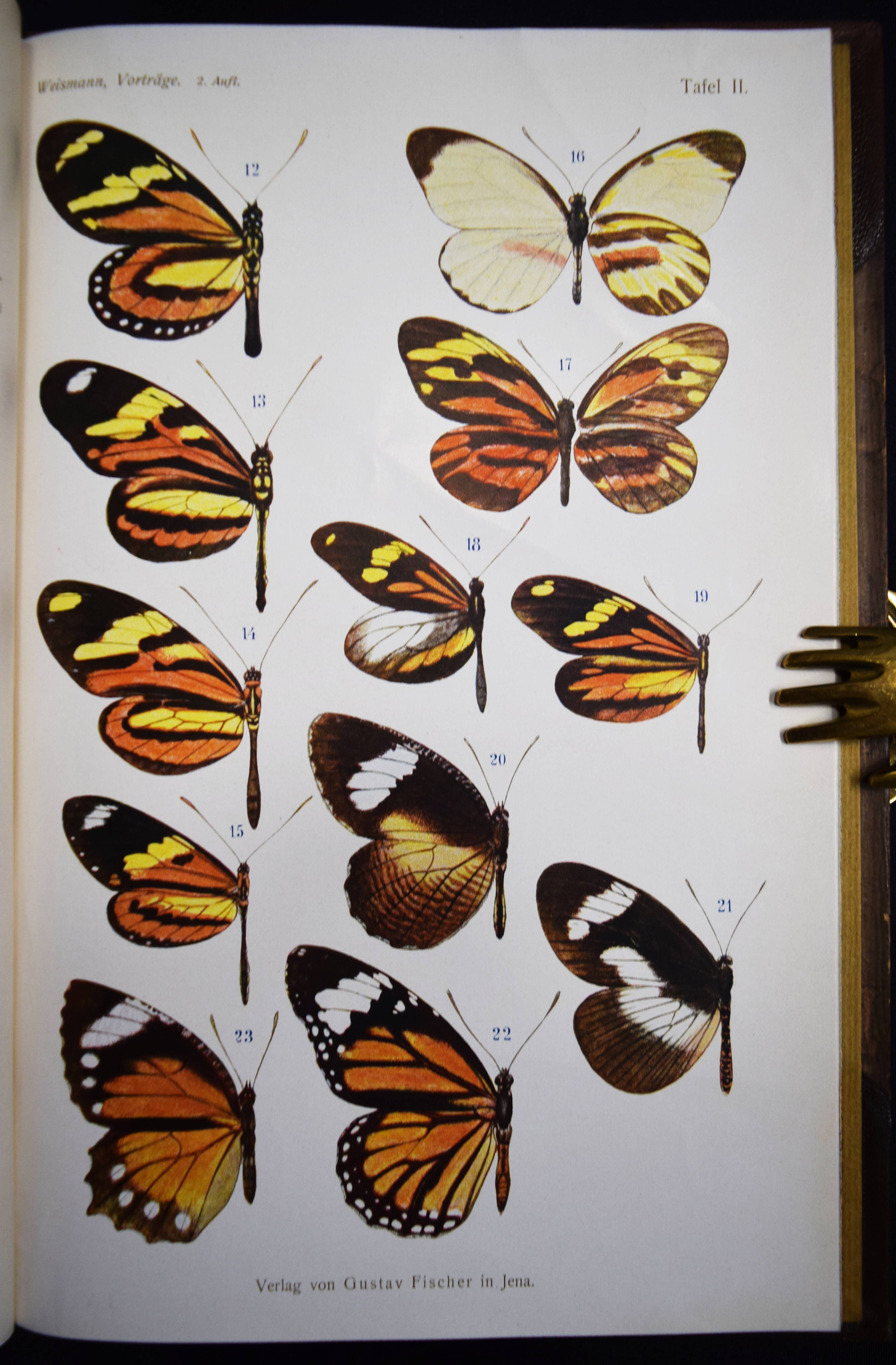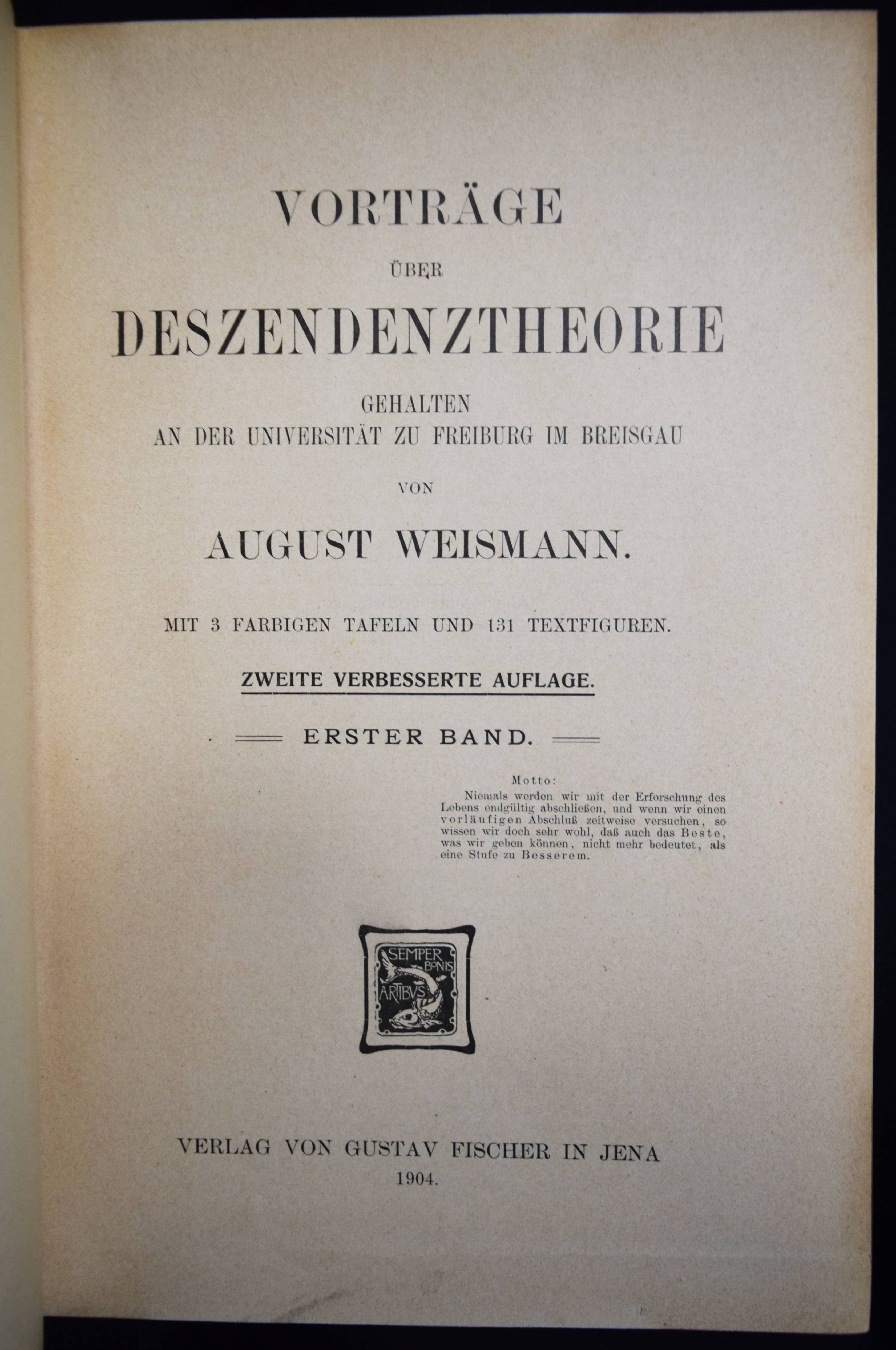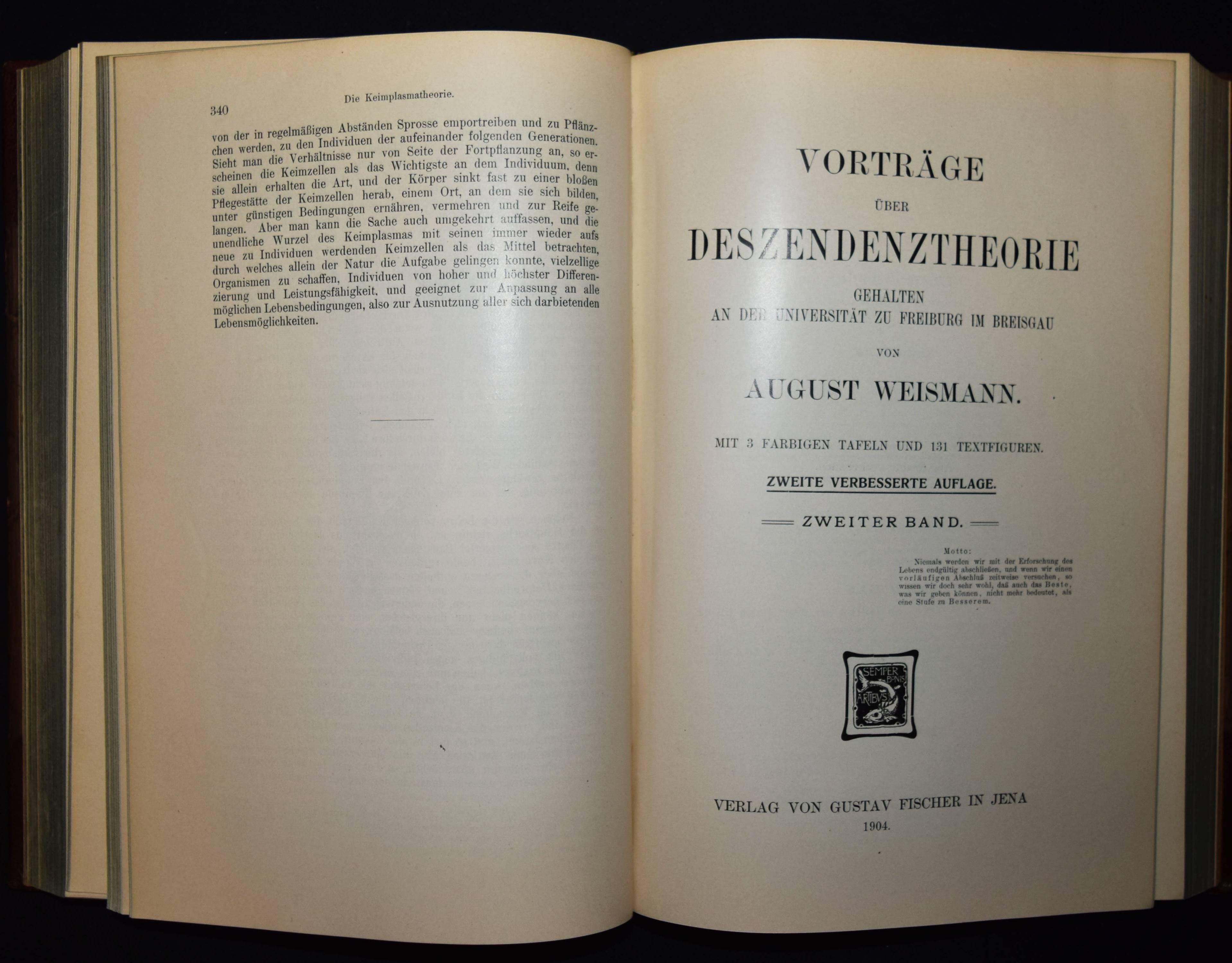 Weismann, August (Friedrich Leopold). Vorträge über Deszendenztheorie gehalten an der Universität zu Freiburg im Breisgau. 2. verb. Aufl. 2 Bände in 1. Jena, Gustav Fischer 1904. Gr.-8°. XII, 340 S.; VI, 344 S. mit 131 Textabb. und 3 farb. Tafeln. OHldr. mit goldgepr. Rückentitel und dezenter Rückenverg. NDB XXVII, 674 ff. – Wissenschaftliches Testament des bedeutenden Evolutionsforschers. Die Farbtafeln zeigen Schmetterlinge. – A. Weismann (1834-1914), seit 1866 ordentlicher Professor in Freiburg und seit 1874 erster Inhaber des Lehrstuhls für Zoologie ebda., fasst hier die Ergebnisse und Erfahrungen aus fast vierzigjähriger Forschung zusammen. – „W. gehörte zu den ersten Anhängern Darwins in Deutschland. Bereits in seiner Antrittsvorlesung „Über die Berechtigung der Darwin’schen Theorie“ 1868 charakterisierte er die Evolutionstheorie, die er Transmutationshypothese nannte, als „die einzige, heutzutage berechtigte wissenschaftliche Annahme über die Entstehung der organischen Formen“, Ausgangspunkt von W.s Überlegungen zu Fragen der Evolutionsmechanismen war die Selektionstheorie. Er war wohl der konsequenteste Vertreter der Theorie von der natürlichen Auslese im 19. Jh. W. sah, daß die Entstehung der erblichen Variabilität die zentrale offene Frage nach den Evolutionsmechanismen war und gab mit der Rekombination einen Teil der Antwort. Die Bedeutung von Befruchtung und Reduktionsteilung erkannte W. darin, daß durch sie eine Umverteilung der Erbanlagen bewirkt werde, die zu individuellen Unterschieden zwischen den Organismen führe. Den Vorgang der Keimplasmavereinigung bezeichnete er als „Amphimixis“ (zweiseitige Vermischung)“ (Uwe Hoßweld in NDB). – Rücken etwas aufgehellt, schönes Exlibris, gutes sauberes Exemplar.