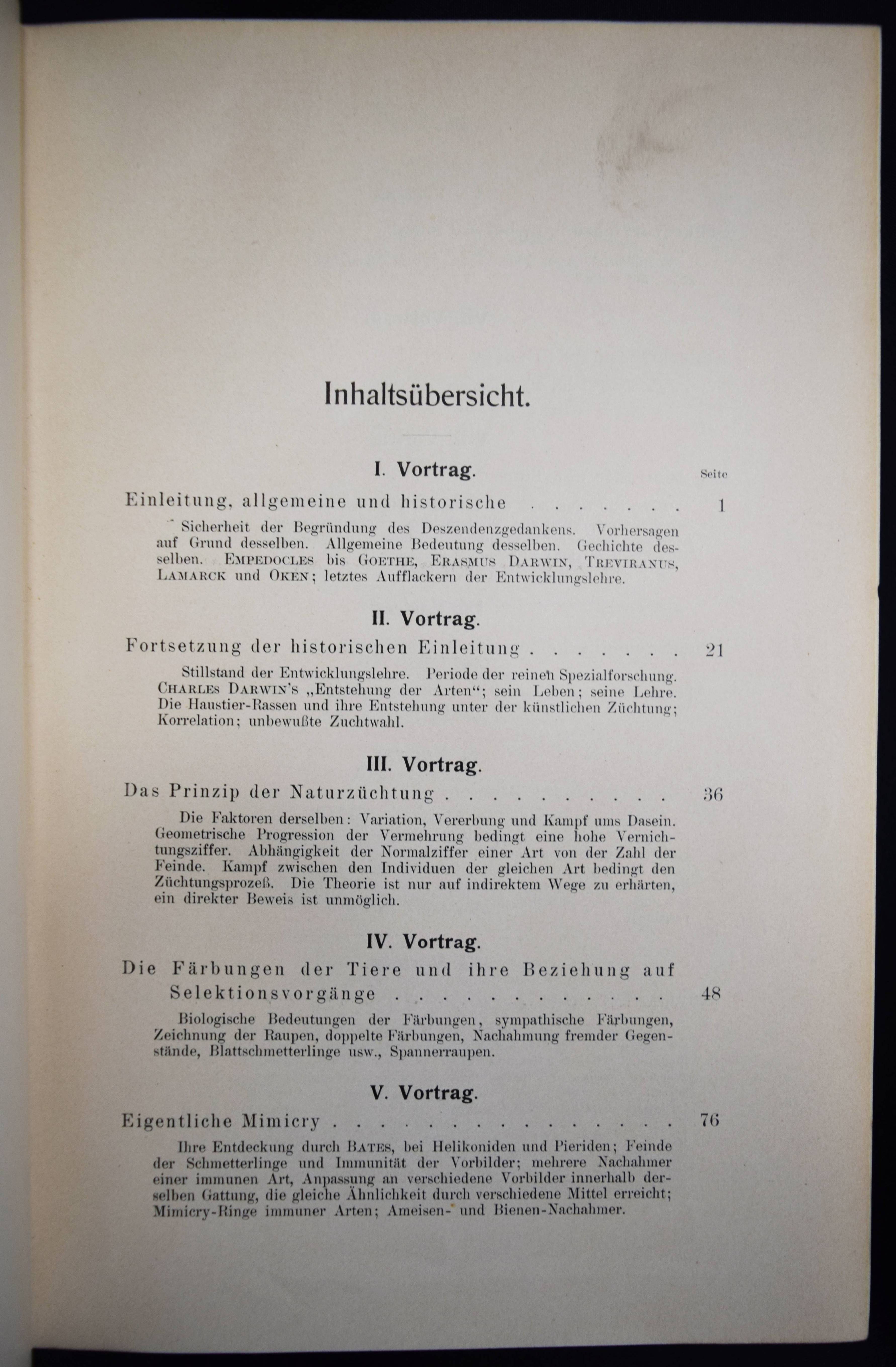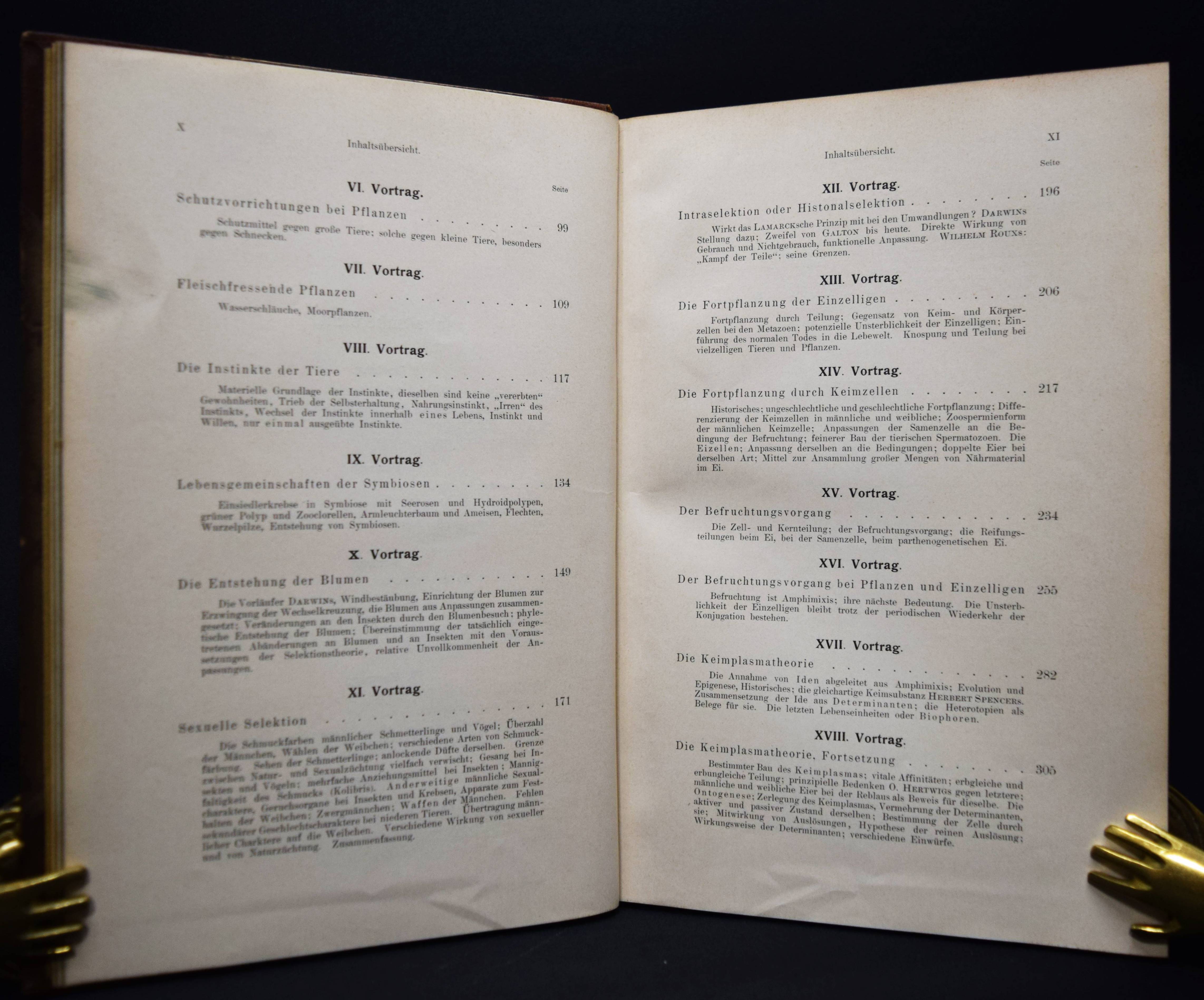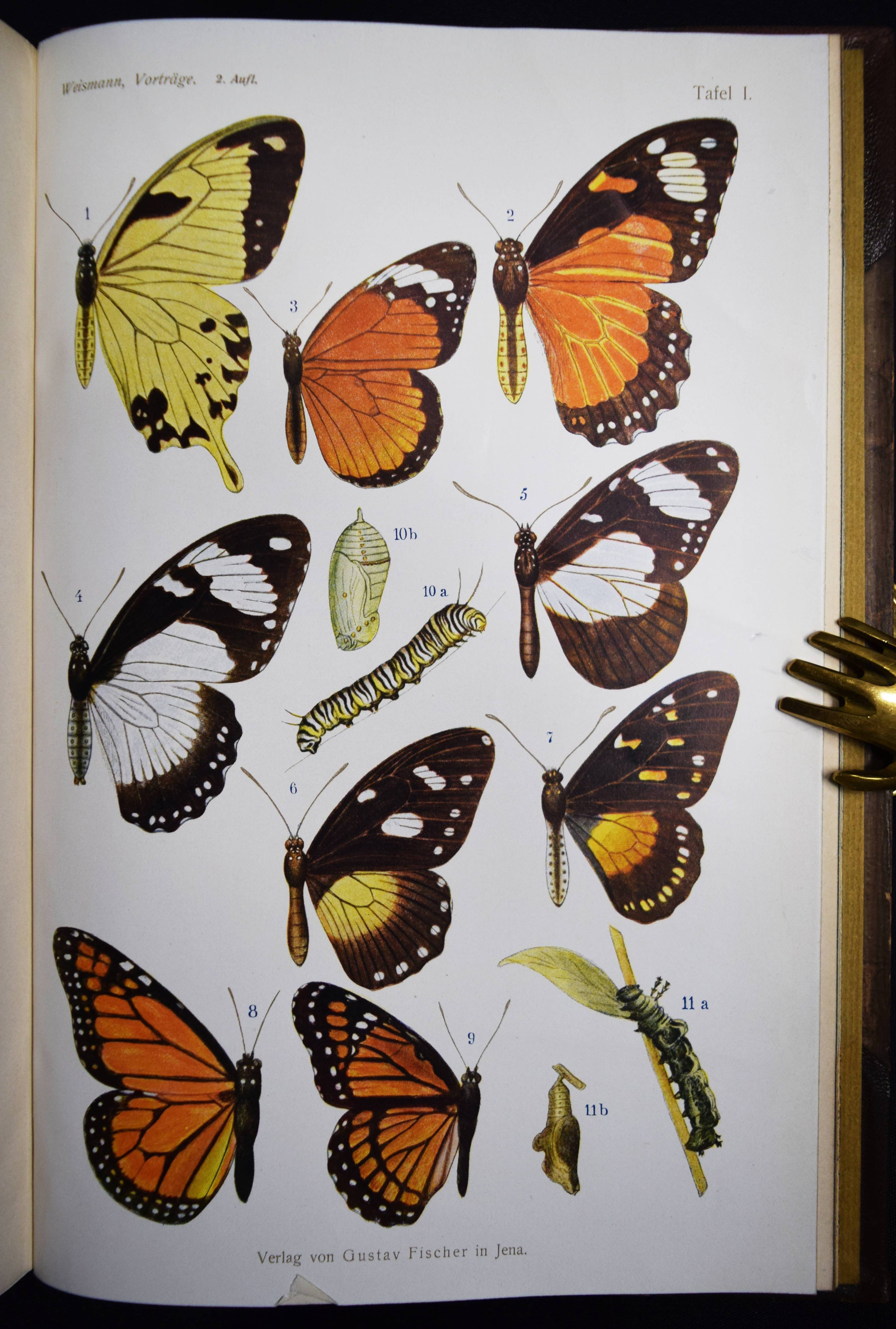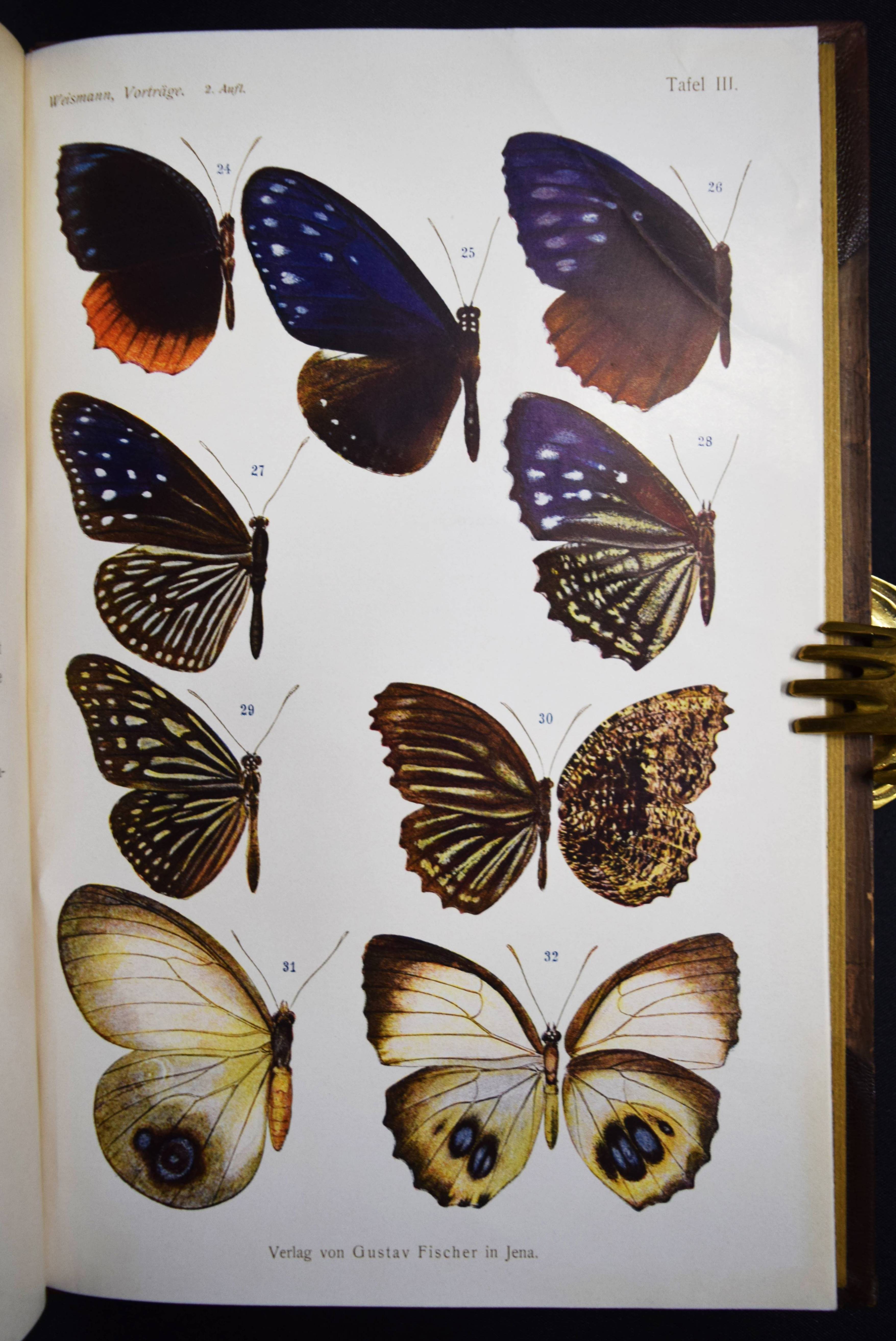 Weismann, August (Friedrich Leopold). Vorträge über Deszendenztheorie gehalten an der Universität zu Freiburg im Breisgau. 2. verb. Aufl. 2 Bände in 1. Jena, Gustav Fischer 1904. Gr.-8°. XII, 340 S.; VI, 344 S. mit 131 Textabb. und 3 farb. Tafeln. OHldr. mit goldgepr. Rückentitel und dezenter Rückenverg. NDB XXVII, 674 ff. – Wissenschaftliches Testament des bedeutenden Evolutionsforschers. Die Farbtafeln zeigen Schmetterlinge. – A. Weismann (1834-1914), seit 1866 ordentlicher Professor in Freiburg und seit 1874 erster Inhaber des Lehrstuhls für Zoologie ebda., fasst hier die Ergebnisse und Erfahrungen aus fast vierzigjähriger Forschung zusammen. – „W. gehörte zu den ersten Anhängern Darwins in Deutschland. Bereits in seiner Antrittsvorlesung „Über die Berechtigung der Darwin’schen Theorie“ 1868 charakterisierte er die Evolutionstheorie, die er Transmutationshypothese nannte, als „die einzige, heutzutage berechtigte wissenschaftliche Annahme über die Entstehung der organischen Formen“, Ausgangspunkt von W.s Überlegungen zu Fragen der Evolutionsmechanismen war die Selektionstheorie. Er war wohl der konsequenteste Vertreter der Theorie von der natürlichen Auslese im 19. Jh. W. sah, daß die Entstehung der erblichen Variabilität die zentrale offene Frage nach den Evolutionsmechanismen war und gab mit der Rekombination einen Teil der Antwort. Die Bedeutung von Befruchtung und Reduktionsteilung erkannte W. darin, daß durch sie eine Umverteilung der Erbanlagen bewirkt werde, die zu individuellen Unterschieden zwischen den Organismen führe. Den Vorgang der Keimplasmavereinigung bezeichnete er als „Amphimixis“ (zweiseitige Vermischung)“ (Uwe Hoßweld in NDB). – Rücken etwas aufgehellt, schönes Exlibris, gutes sauberes Exemplar.