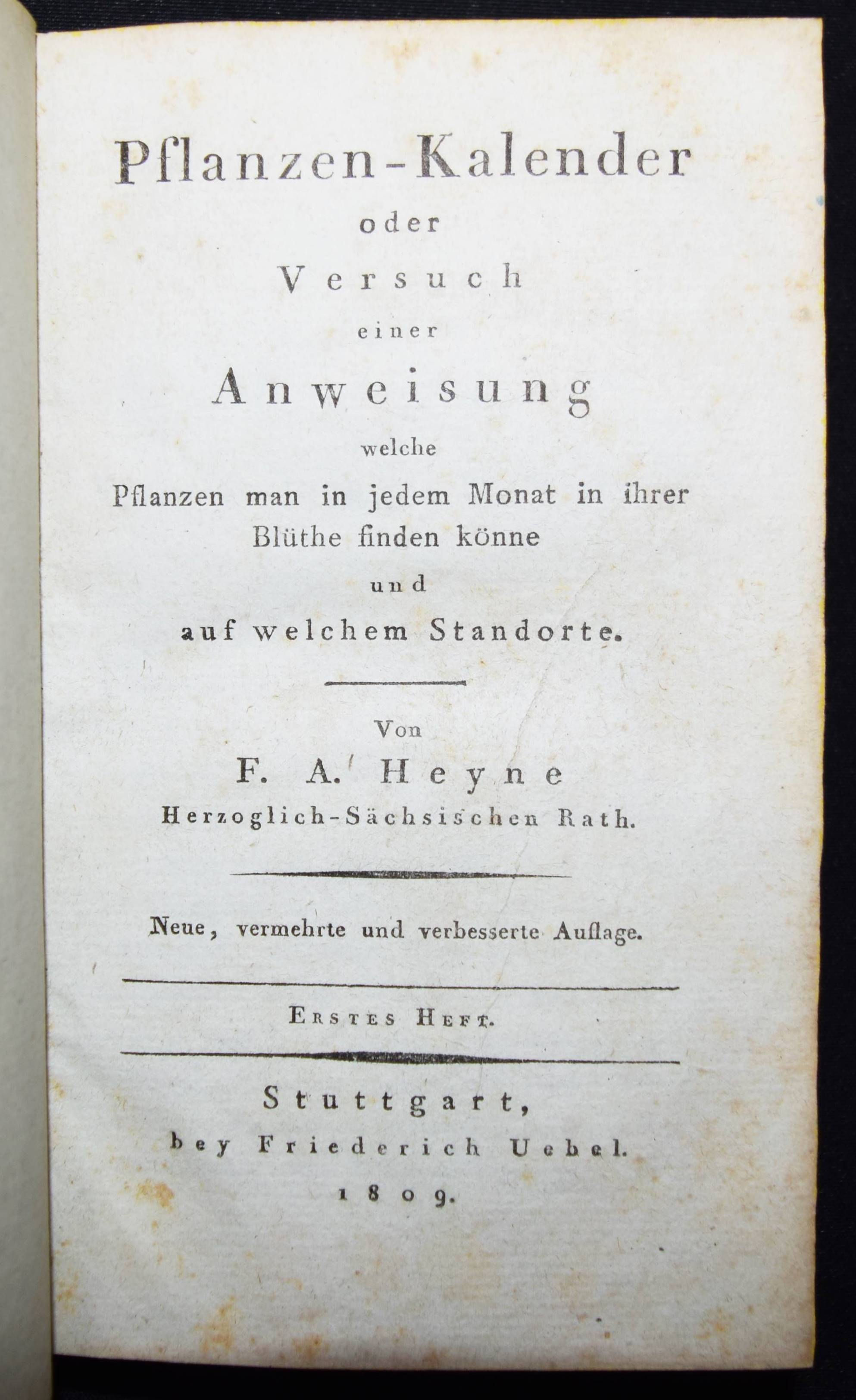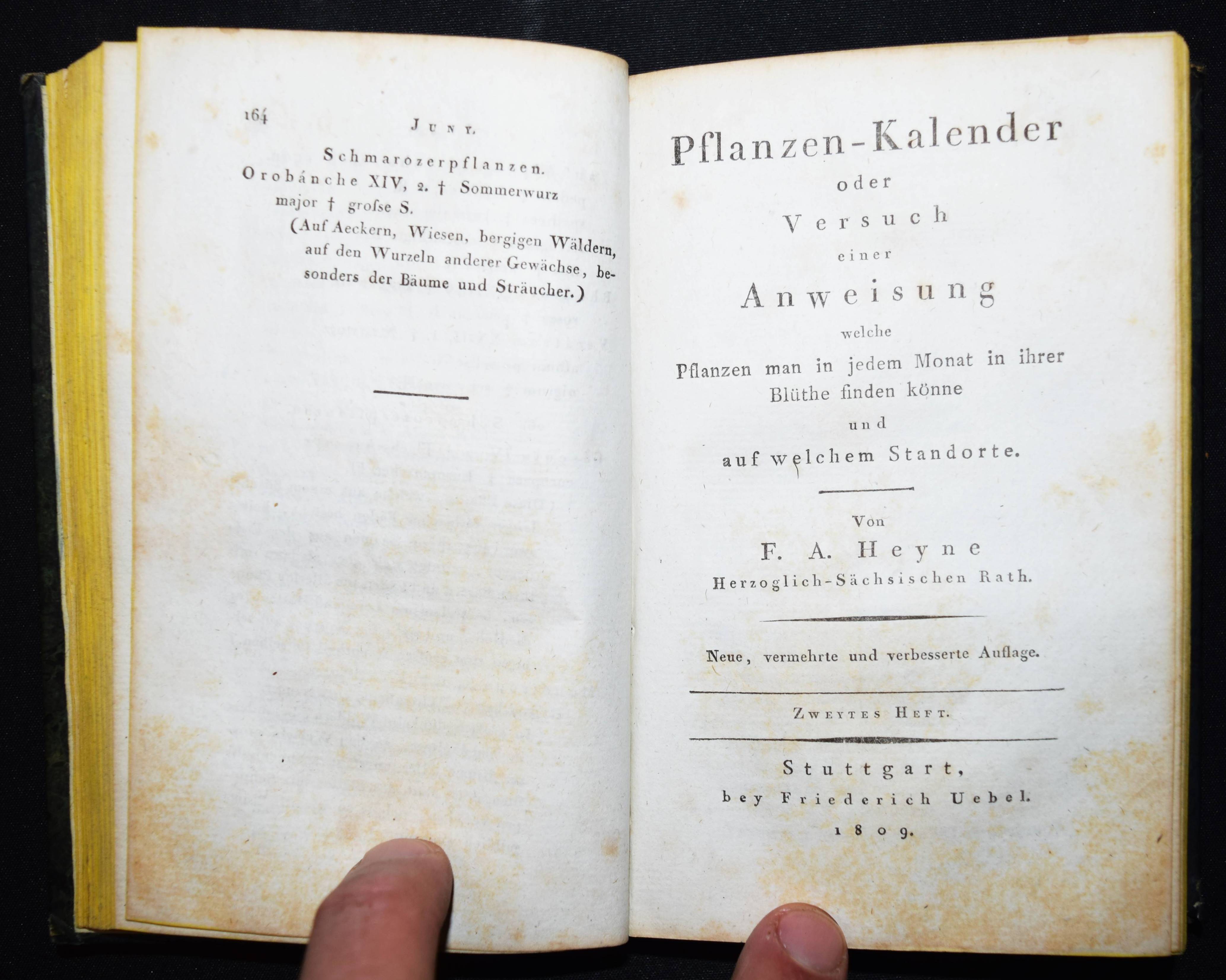 Heyne, Friedrich A(dolph). Pflanzen-Kalender oder Versuch einer Anweisung, welche Pflanzen man in jedem Monat in ihrer Blüthe finden könne und auf welchem Standorte. Erstes (und) zweites Heft (mehr nicht erschienen). Neue verm. u. verb. Aufl. 2 Teile in 1 Band. Stuttgart, Friedrich Uebel 1809. Kl.-8°. XII, 388, LIV S. Marm. Pbd. der Zeit mit handschr. Rückentitel. Pritzel 4450. Stafleu/C. 2736. – Verbesserte zweite Ausgabe des zuerst 1804 erschienenen Pflanzen-Kalender. Verzeichnet für jeden Monat die blühenden Pflanzen und ihre Herkunft. – Stellenweise etwas braunfleckig, gutes Exemplar.