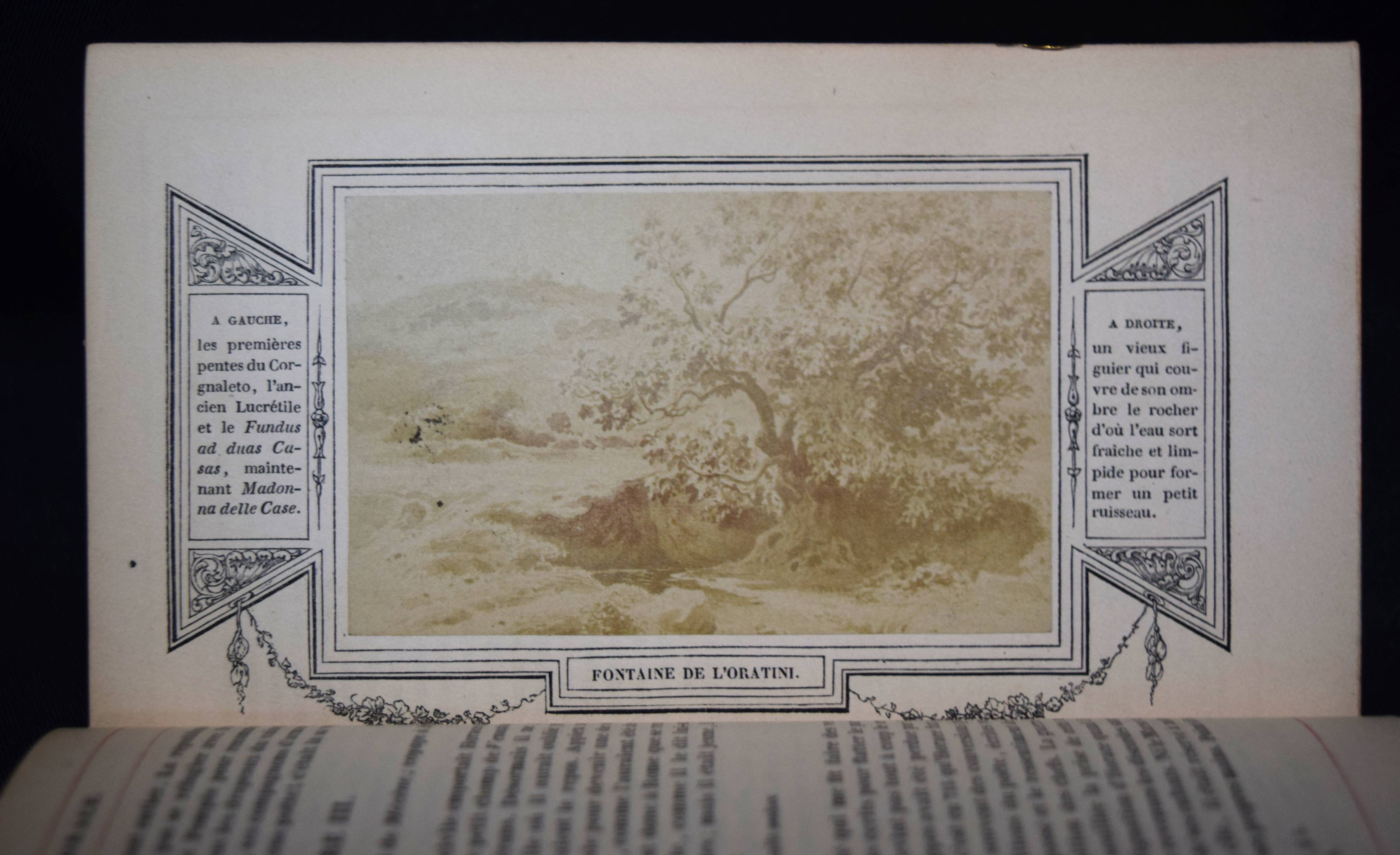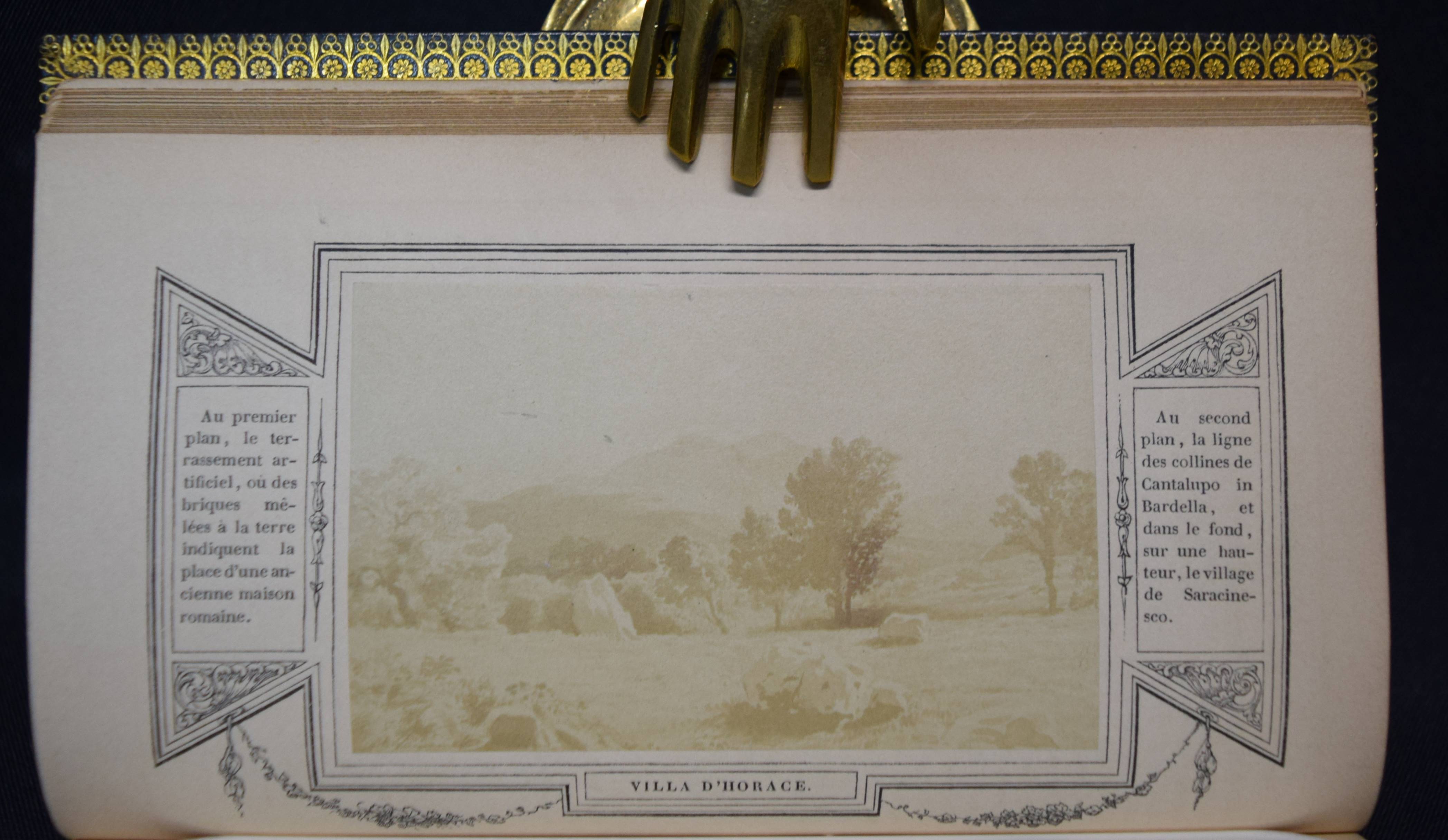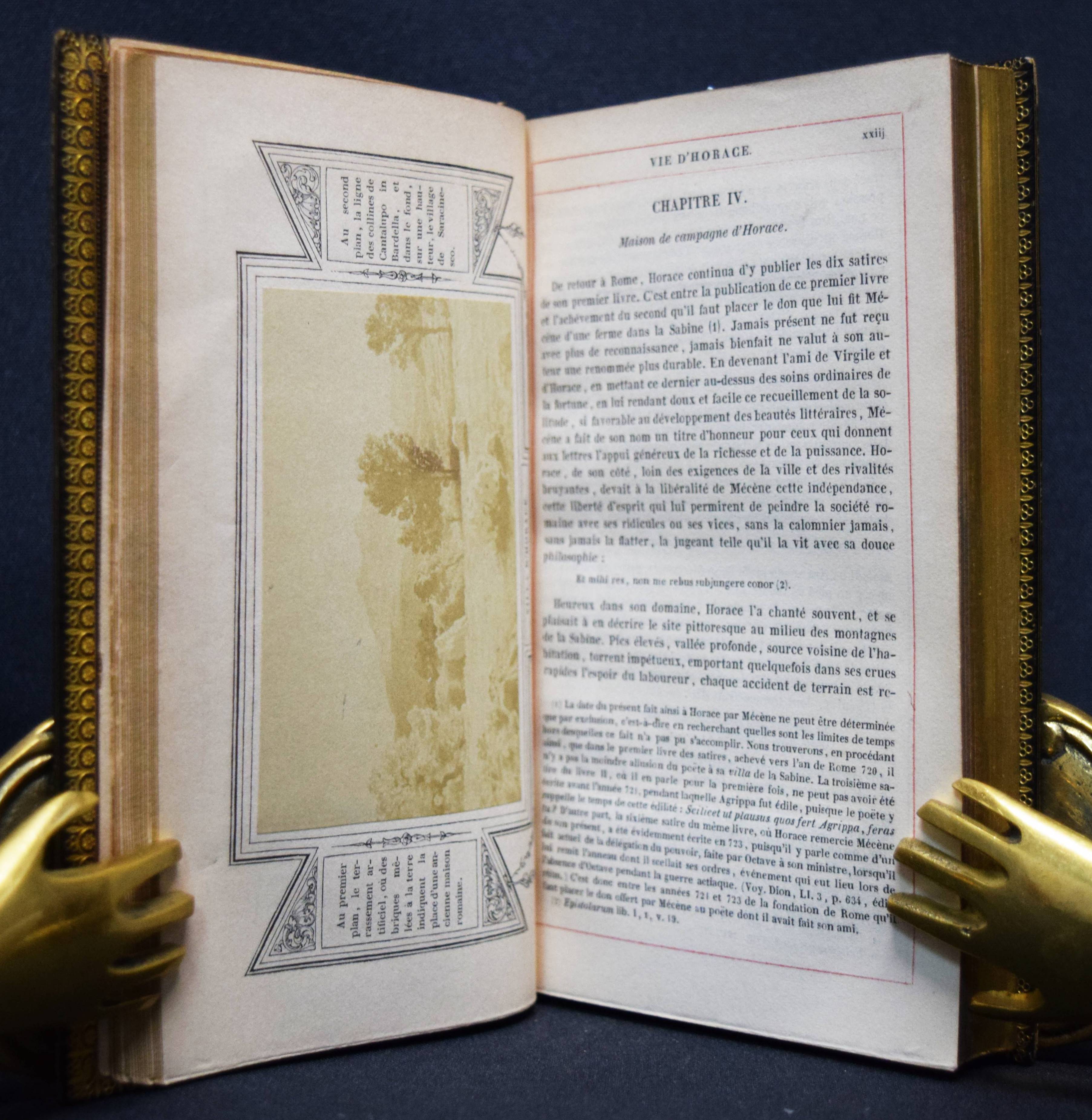 Horatius Flaccus, Quintus. Quinti Horatii Flacci Opera. Cum novo commentario ad modum Joannis Bond. Paris, Didot 1855. Kl.-8°. XLVI, 299 S. mit 18 (7 ganzs.) mont. Orig.-Photographien u. 2 photogr. doppelblattgr. Karten (Albuminabzüge). Schwarzer Maroquinlederband der Zeit mit goldgepr. Rückentitel, Rückenvergoldung und goldgepr. Deckelvignetten, Innenkantenvergoldung sowie Goldschnitt. Brunet III, 325. Engelmann-Preuss 284. Graesse III, 357. Roosens-Salu 5139. Vicaire IV, 167 f. – Erste Ausgabe der Luxusausgabe mit Seiteneinfassungen in Rot sowie mont. Landschaftsaufnahmen und Aufnahmen nach Zeichnungen von Felix Joseph Barrias statt der Holzstich-Illustrationen in der Normalausgabe. – Eines der frühesten Beispiele für die Verwendung von Photographien in der Buchillustration. – „Charmante édition présentant un exellent texte, un commentaire latin rédigé avec autant de savoir que de goût par M. Dübner, une vie d’Horace en français par M. Noël des Vergers, une préface intéressante de M. Ambroise-Firmin Didot. Le volume est décoré d’un joli frontispice et de vignettes pour chaque livre, par M. Barrias, et des exemplaires ont de plus les plans de la villa d’Horace et des campagnes environnantes, dressés par M. Rosa, et en outre les vues de ses campagnes, dessinées sur les lieux par M. Benouville“ (Brunet). – „The editor of the Horace refers to photography as the ‚marvel of our century‘ … occassionally photographs of engravings were vitilized in books of poems as a vehicle to reproduce drawings or engravings: the 1855 Horace … In both cases photographs replace engravings, assuming more of a functional than esthetic role“ (The truth of lens, N. Y. Grolier Club, 1980 Nr. 179). – Gelenke etwas berieben, die Fotografien wie immer etwas ausgebleicht, schönes Exemplar im dekorativen Verlagseinband aus der Bibliothek des franz. Politikers Jean Charles Marie Cruppi (1855-1933). Cruppi war Außen- und Justizminister im Kabinett Ernest Monis.