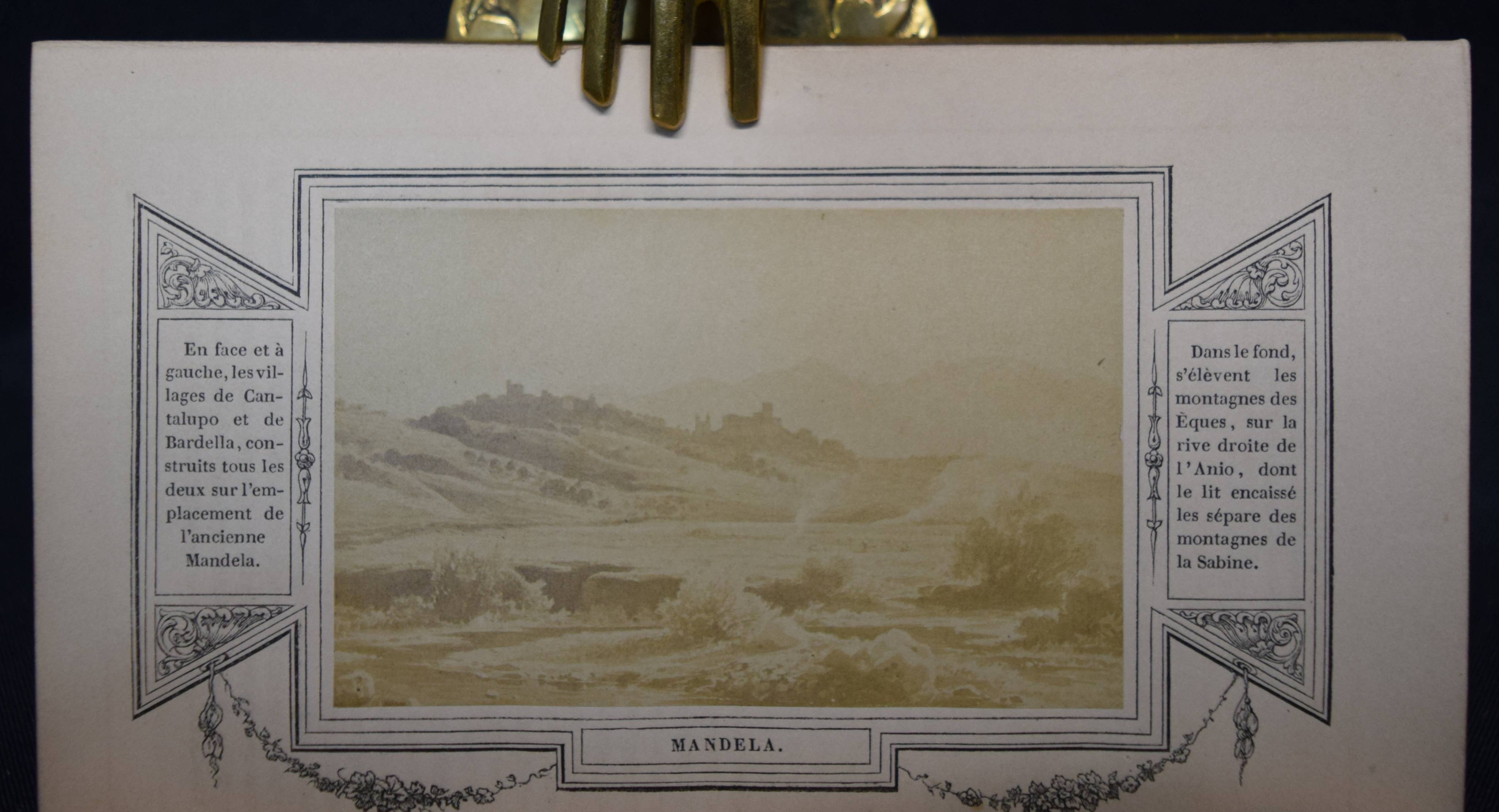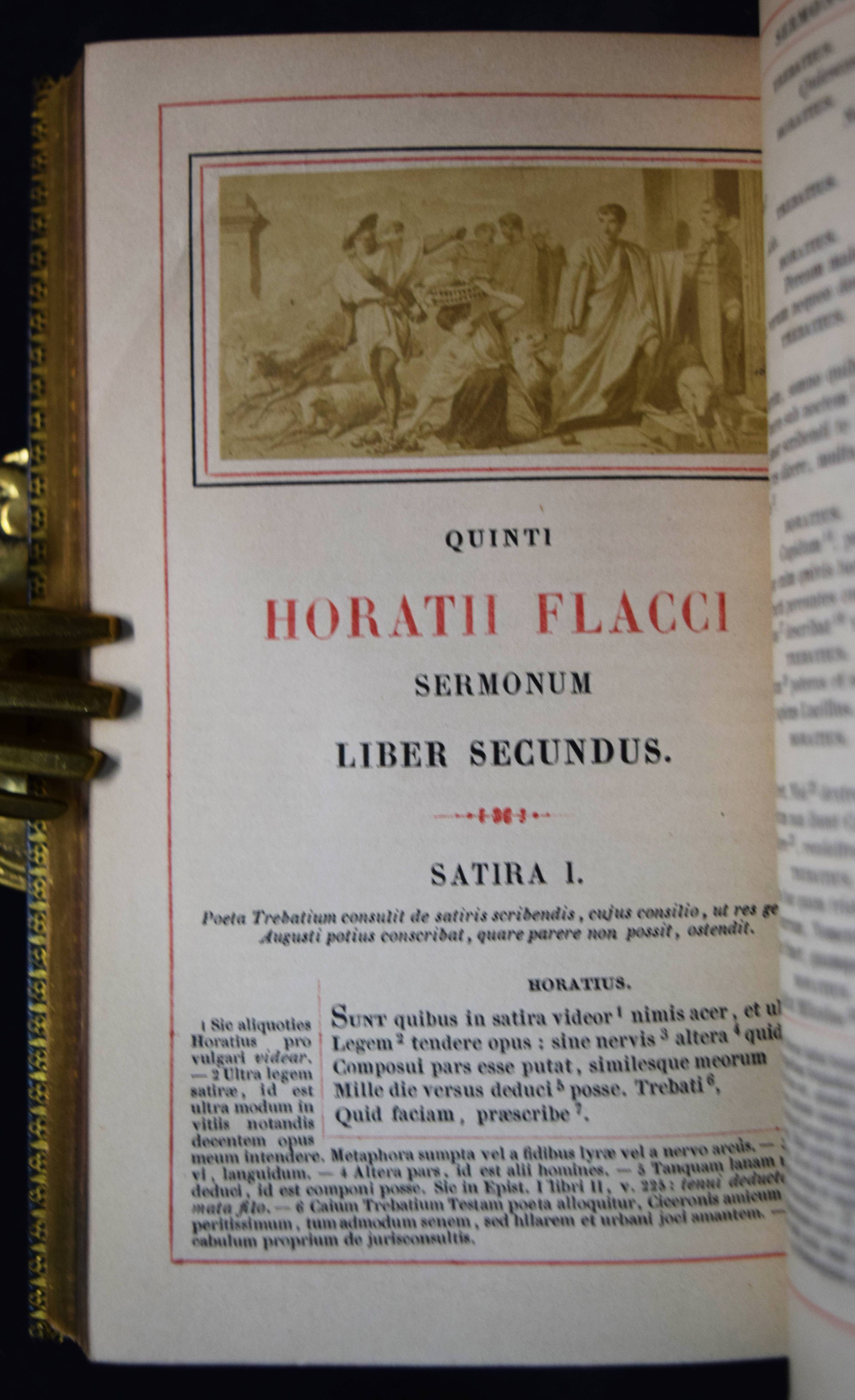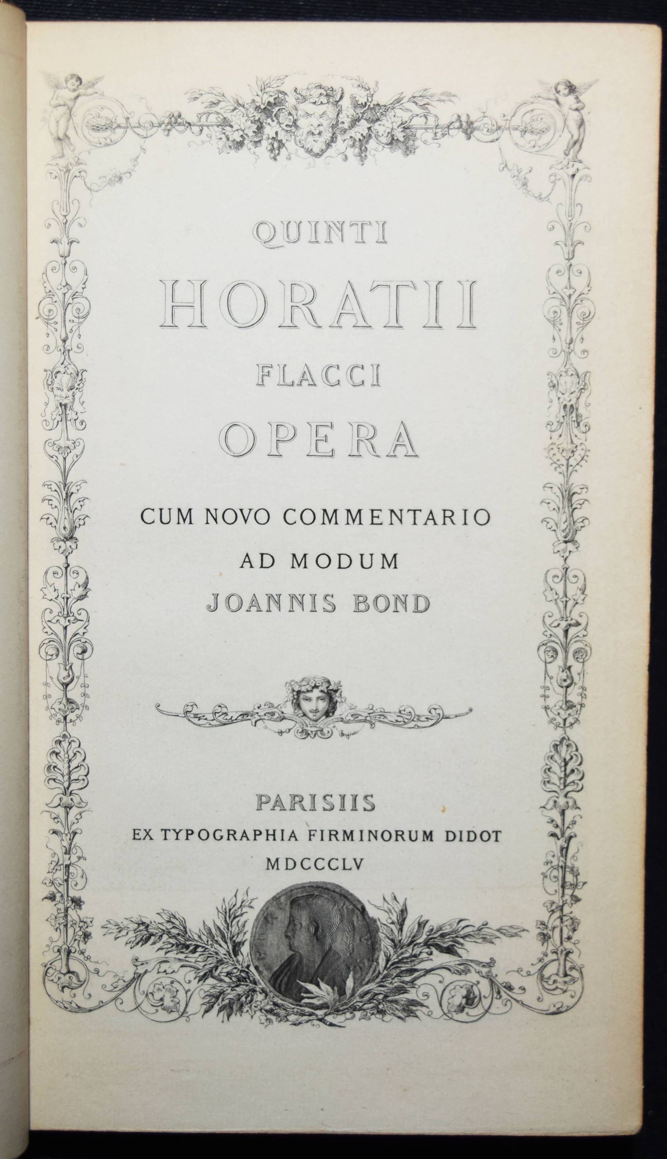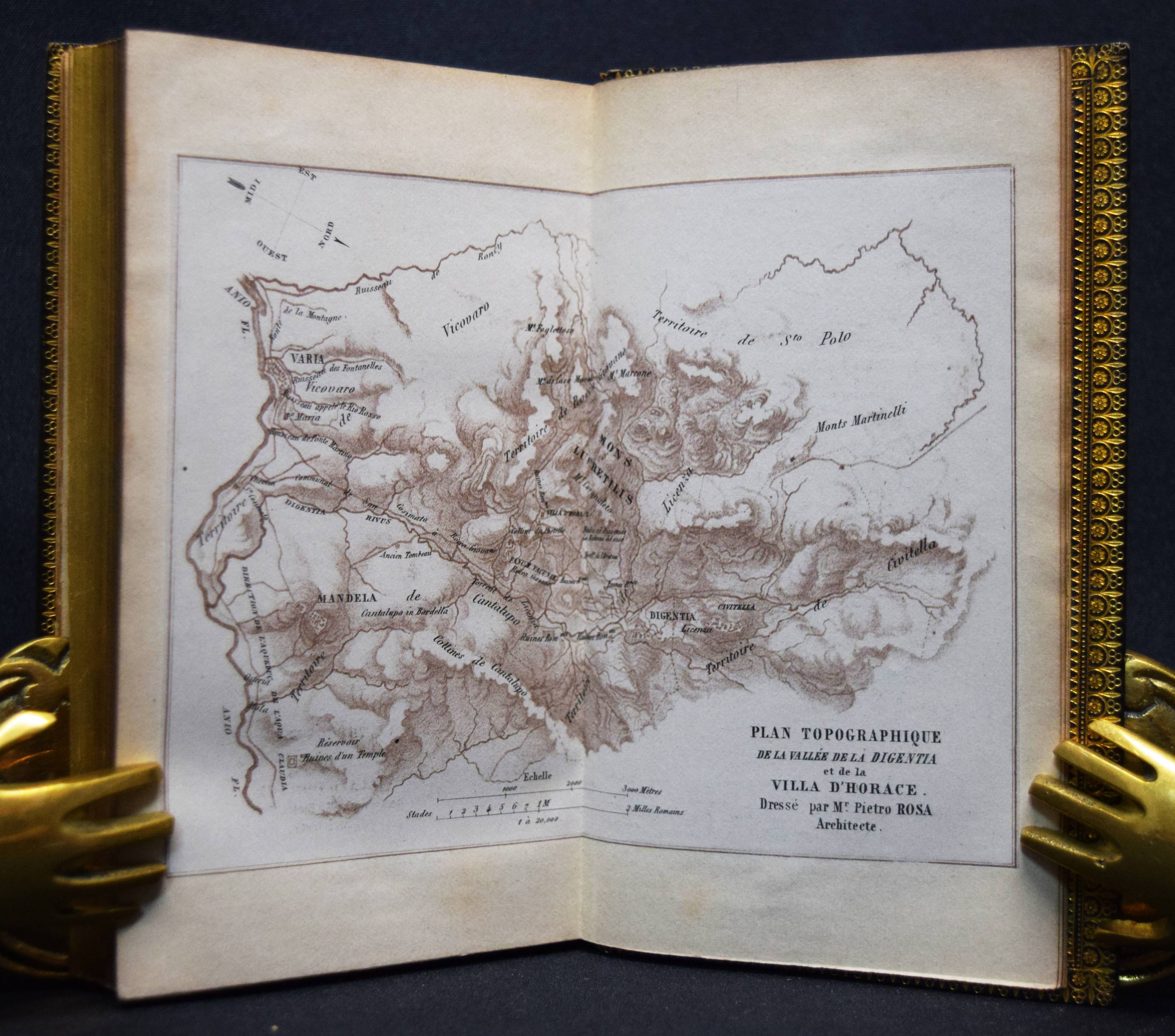 Horatius Flaccus, Quintus. Quinti Horatii Flacci Opera. Cum novo commentario ad modum Joannis Bond. Paris, Didot 1855. Kl.-8°. XLVI, 299 S. mit 18 (7 ganzs.) mont. Orig.-Photographien u. 2 photogr. doppelblattgr. Karten (Albuminabzüge). Schwarzer Maroquinlederband der Zeit mit goldgepr. Rückentitel, Rückenvergoldung und goldgepr. Deckelvignetten, Innenkantenvergoldung sowie Goldschnitt. Brunet III, 325. Engelmann-Preuss 284. Graesse III, 357. Roosens-Salu 5139. Vicaire IV, 167 f. – Erste Ausgabe der Luxusausgabe mit Seiteneinfassungen in Rot sowie mont. Landschaftsaufnahmen und Aufnahmen nach Zeichnungen von Felix Joseph Barrias statt der Holzstich-Illustrationen in der Normalausgabe. – Eines der frühesten Beispiele für die Verwendung von Photographien in der Buchillustration. – „Charmante édition présentant un exellent texte, un commentaire latin rédigé avec autant de savoir que de goût par M. Dübner, une vie d’Horace en français par M. Noël des Vergers, une préface intéressante de M. Ambroise-Firmin Didot. Le volume est décoré d’un joli frontispice et de vignettes pour chaque livre, par M. Barrias, et des exemplaires ont de plus les plans de la villa d’Horace et des campagnes environnantes, dressés par M. Rosa, et en outre les vues de ses campagnes, dessinées sur les lieux par M. Benouville“ (Brunet). – „The editor of the Horace refers to photography as the ‚marvel of our century‘ … occassionally photographs of engravings were vitilized in books of poems as a vehicle to reproduce drawings or engravings: the 1855 Horace … In both cases photographs replace engravings, assuming more of a functional than esthetic role“ (The truth of lens, N. Y. Grolier Club, 1980 Nr. 179). – Gelenke etwas berieben, die Fotografien wie immer etwas ausgebleicht, schönes Exemplar im dekorativen Verlagseinband aus der Bibliothek des franz. Politikers Jean Charles Marie Cruppi (1855-1933). Cruppi war Außen- und Justizminister im Kabinett Ernest Monis.