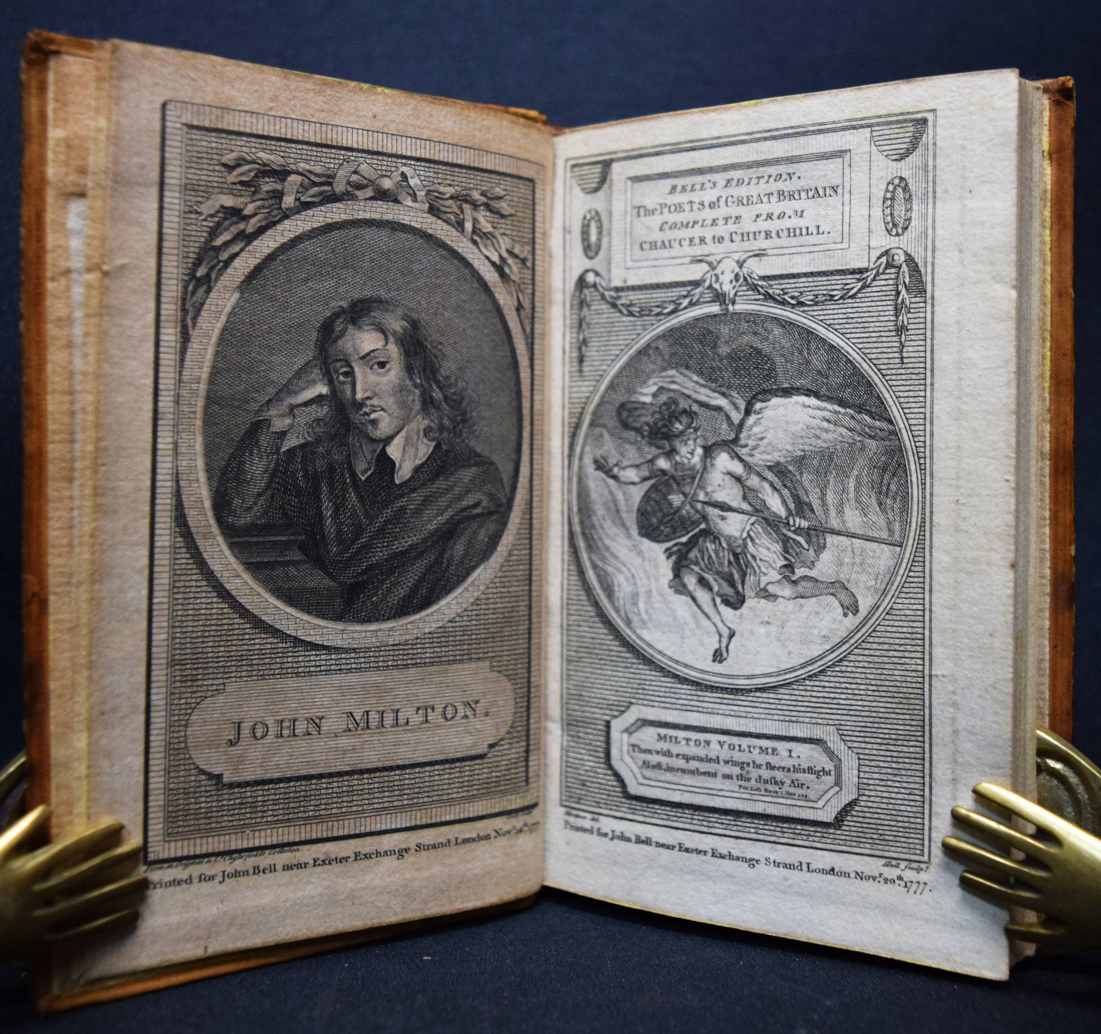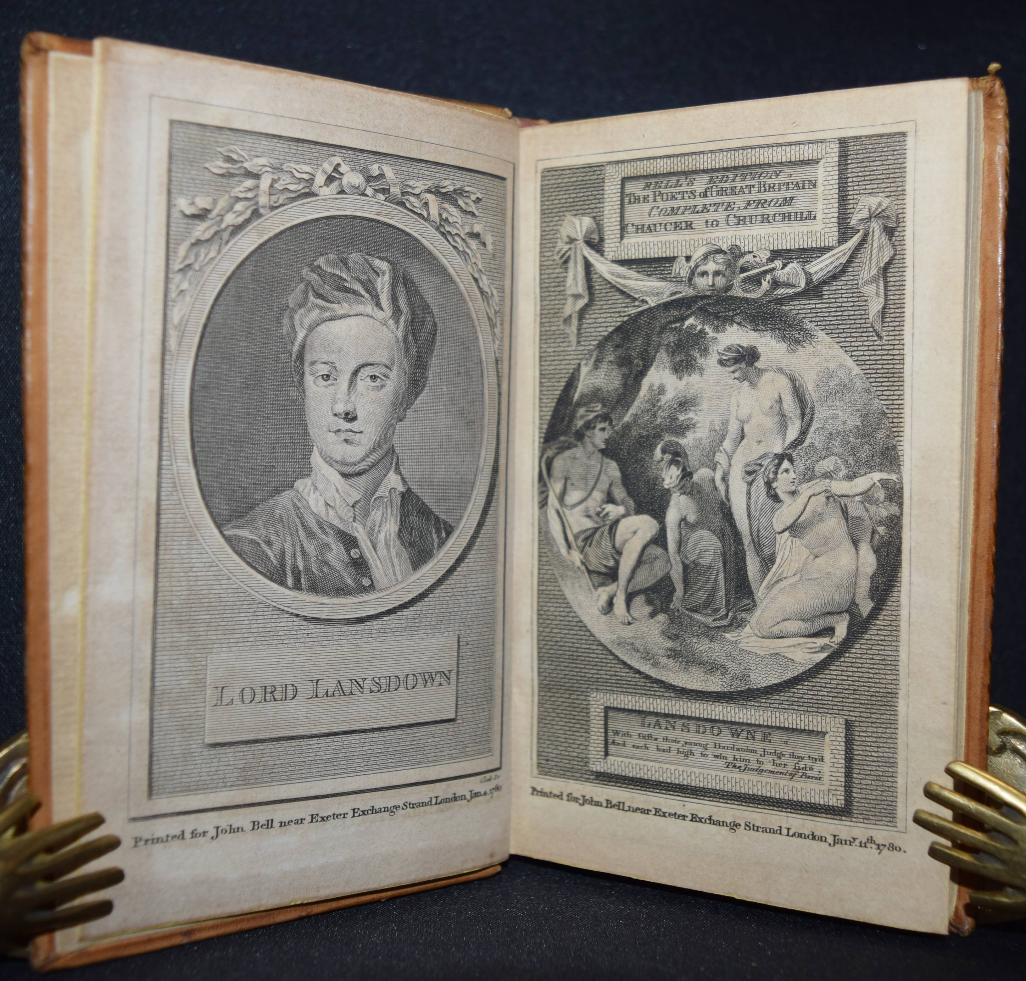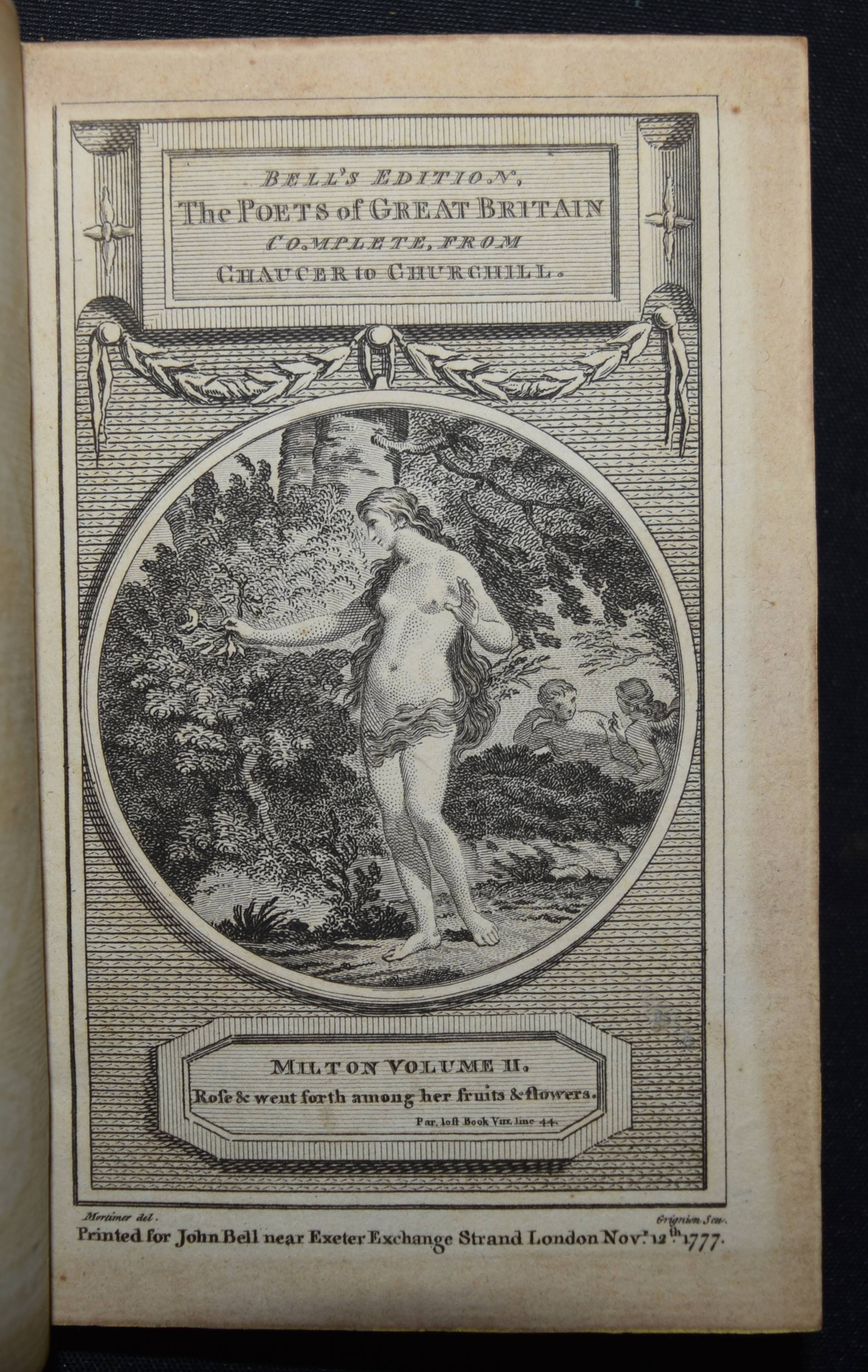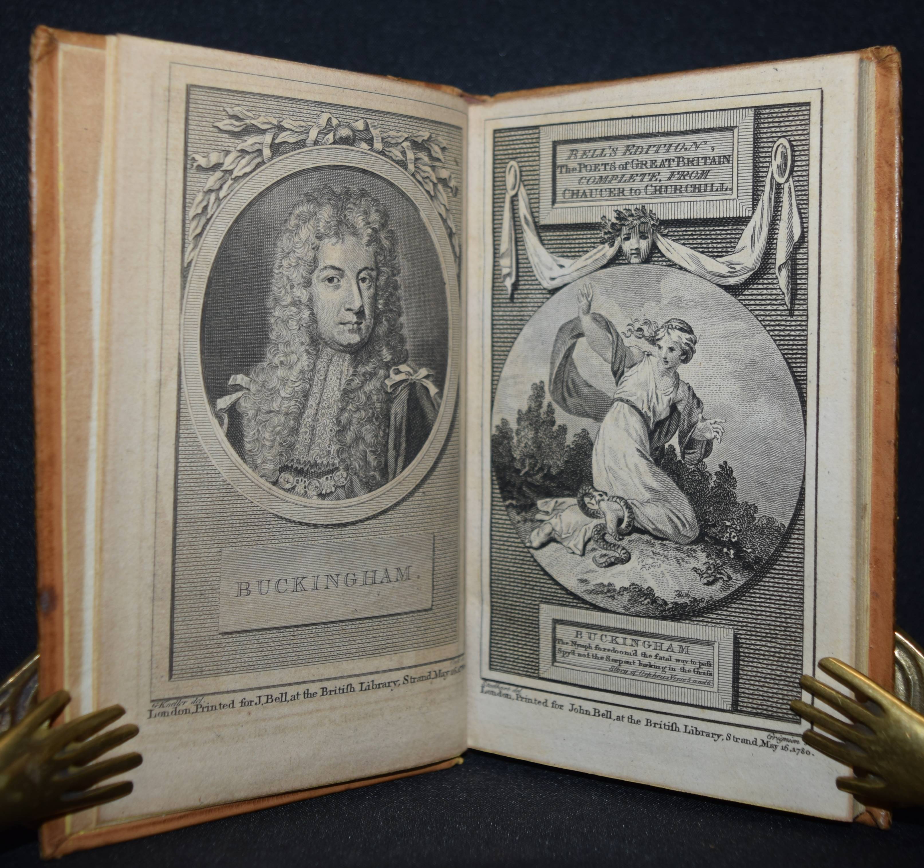 Bell, John (Ed.). Bell’s Edition. The poets of Great Britain complete from Chaucer to Churchill. Vol. 28-31, 35, 40-42, 44, 50, 57, 66, 76-78. Zus. 15 Bände. Edinburg and London, John Bell for The Apollo Press 1778-1781. 12° (13 x 8 cm.). Mit 8 gestoch. Portrait-Frontisp. und 15 gestoch. illustr. Titelblättern. Kalbslederbände der Zeit mit zweifarb. goldgepr. Rückenschildern und reicher Rückenvergoldung und Kantenvergoldung. Seltene schön ausgestattete Taschenausgabe der britischen Klassiker des 18. Jahrhunderts. – Dabei: I. Milton, John. The poetical works. From the text of Dr. Newton. In four volumes. With the life of the author. And a critique on Paradise Lost, by Joseph Addison. – II. Denham, John. The poetical works. With the life of the author. – III. Dryden, John. The poetical works in three volumes. With the life of the author. – IV. Sheffield, John, Duke of Buckingham. The poetical works. With the life of the author. – V. Granville, Geo, Lord Lansdowne. The poetical works. With the life of the author. – VI. Addison, Joseph. The poetical works. With the life of the author. – VI. Philips, John. The poetical works. With the life of the author. – VII. Pope, Alexander. The poetical works. With his last corrections, additions, and improvements. In four volumes. From the text of Dr. Warburton. With the life of the author. – Insgesamt erschienen von 1777 bis 1784 109 Bände. – Einbände geringfügig berieben, Band 76 mit kl. Wurmspuren, nur vereinzelt leicht braunfleckig, außergewöhnlich dekorativ gebundene Reihe.