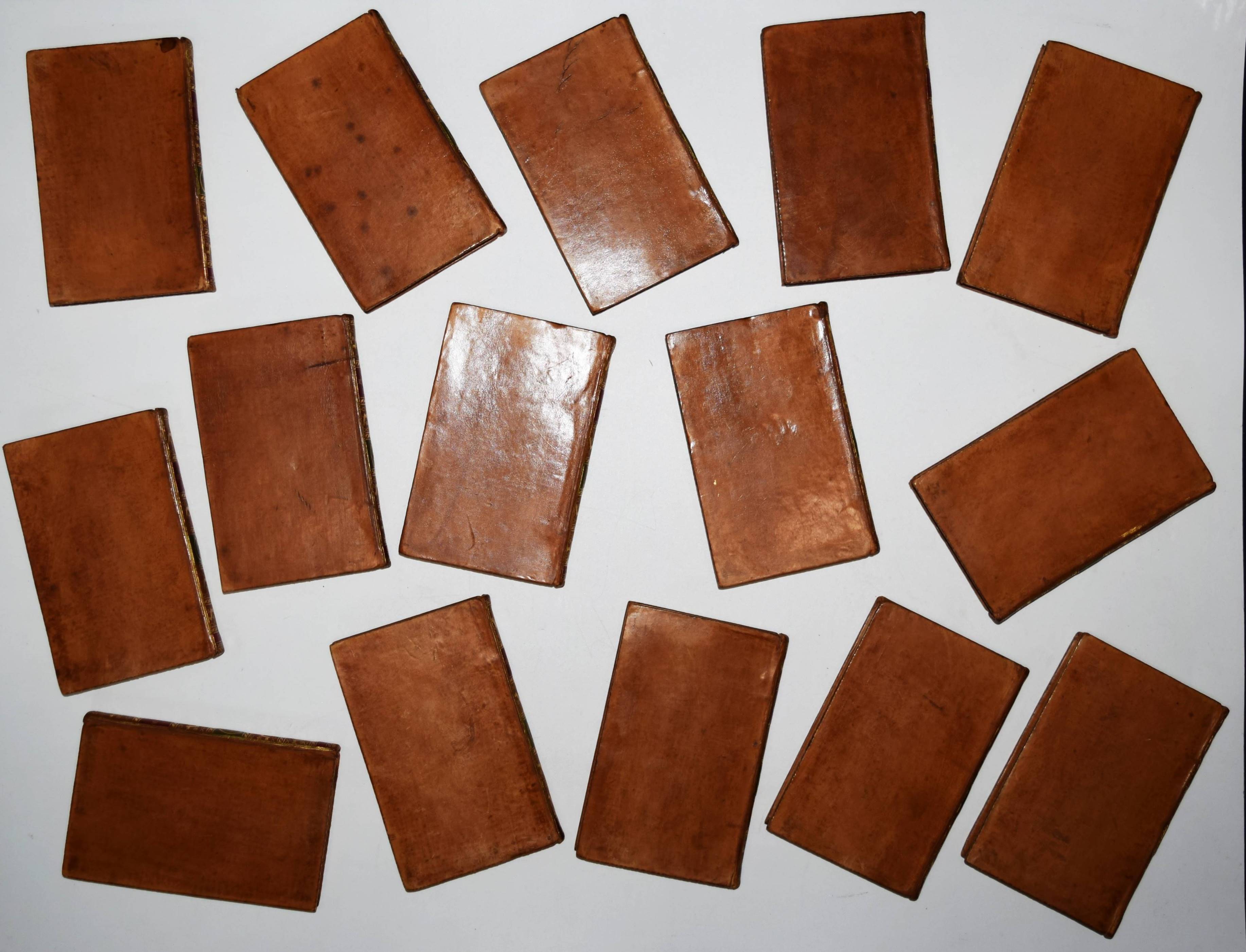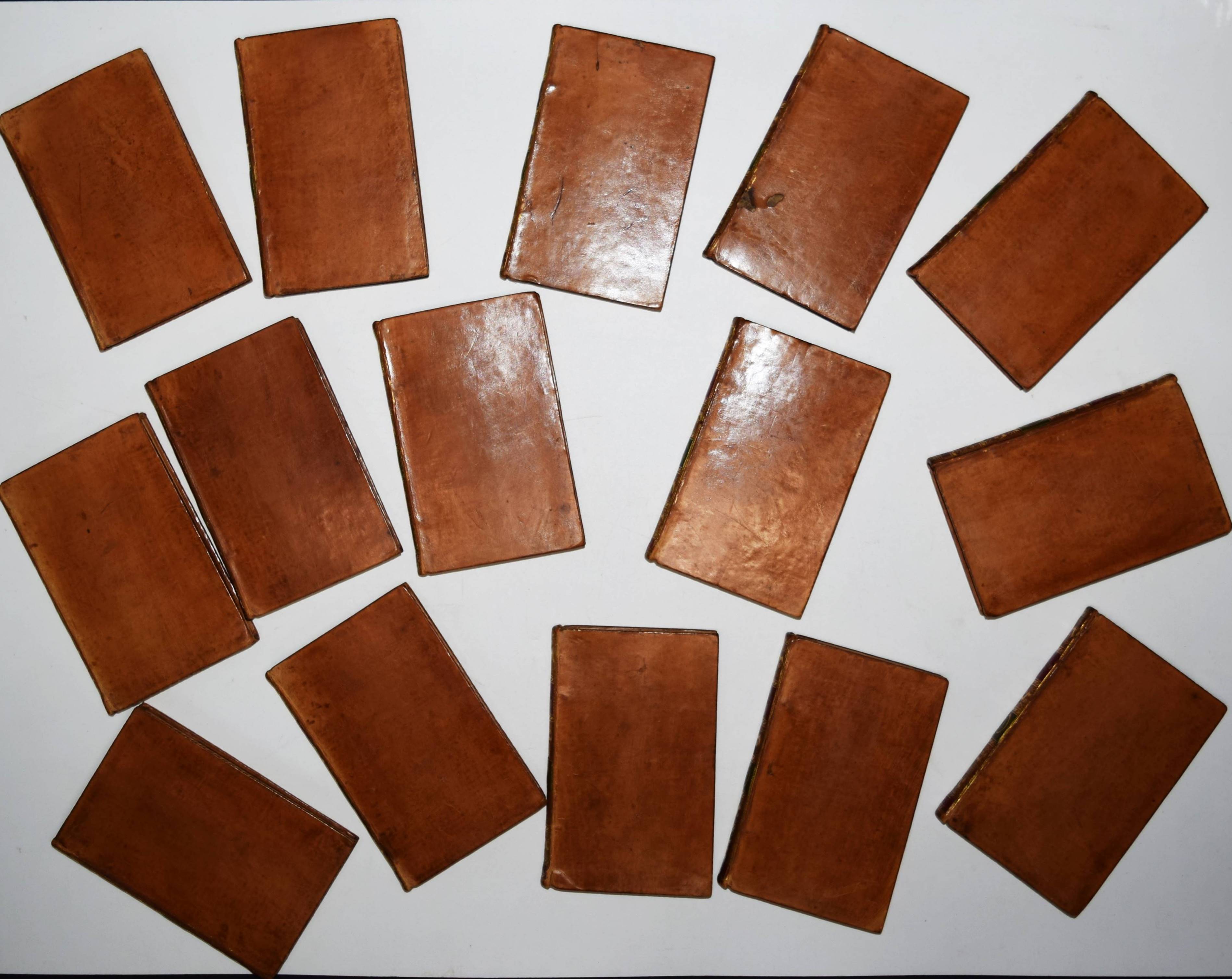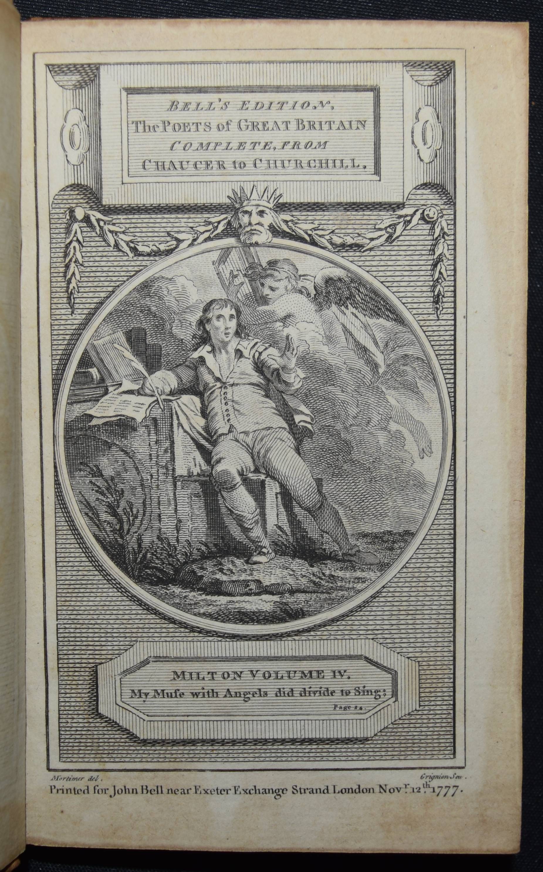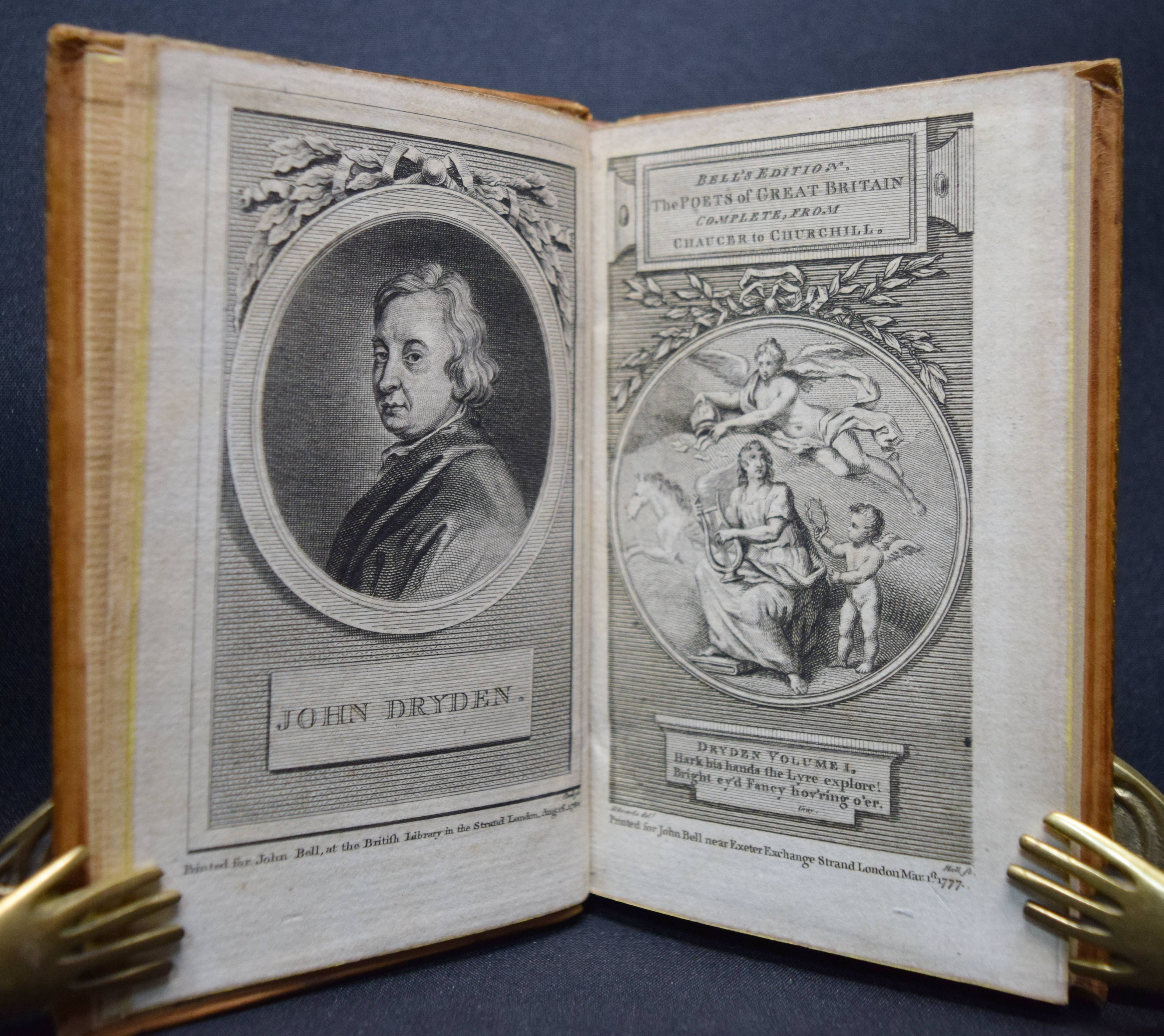 Bell, John (Ed.). Bell’s Edition. The poets of Great Britain complete from Chaucer to Churchill. Vol. 28-31, 35, 40-42, 44, 50, 57, 66, 76-78. Zus. 15 Bände. Edinburg and London, John Bell for The Apollo Press 1778-1781. 12° (13 x 8 cm.). Mit 8 gestoch. Portrait-Frontisp. und 15 gestoch. illustr. Titelblättern. Kalbslederbände der Zeit mit zweifarb. goldgepr. Rückenschildern und reicher Rückenvergoldung und Kantenvergoldung. Seltene schön ausgestattete Taschenausgabe der britischen Klassiker des 18. Jahrhunderts. – Dabei: I. Milton, John. The poetical works. From the text of Dr. Newton. In four volumes. With the life of the author. And a critique on Paradise Lost, by Joseph Addison. – II. Denham, John. The poetical works. With the life of the author. – III. Dryden, John. The poetical works in three volumes. With the life of the author. – IV. Sheffield, John, Duke of Buckingham. The poetical works. With the life of the author. – V. Granville, Geo, Lord Lansdowne. The poetical works. With the life of the author. – VI. Addison, Joseph. The poetical works. With the life of the author. – VI. Philips, John. The poetical works. With the life of the author. – VII. Pope, Alexander. The poetical works. With his last corrections, additions, and improvements. In four volumes. From the text of Dr. Warburton. With the life of the author. – Insgesamt erschienen von 1777 bis 1784 109 Bände. – Einbände geringfügig berieben, Band 76 mit kl. Wurmspuren, nur vereinzelt leicht braunfleckig, außergewöhnlich dekorativ gebundene Reihe.