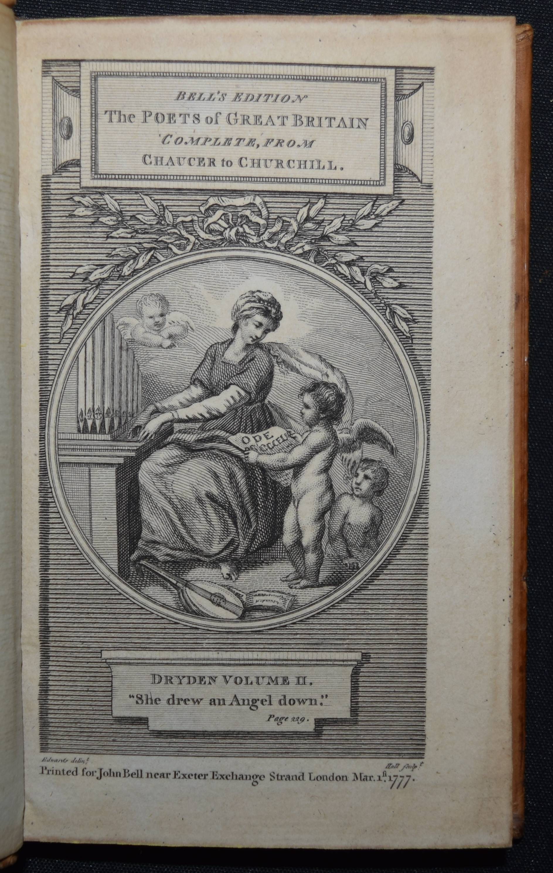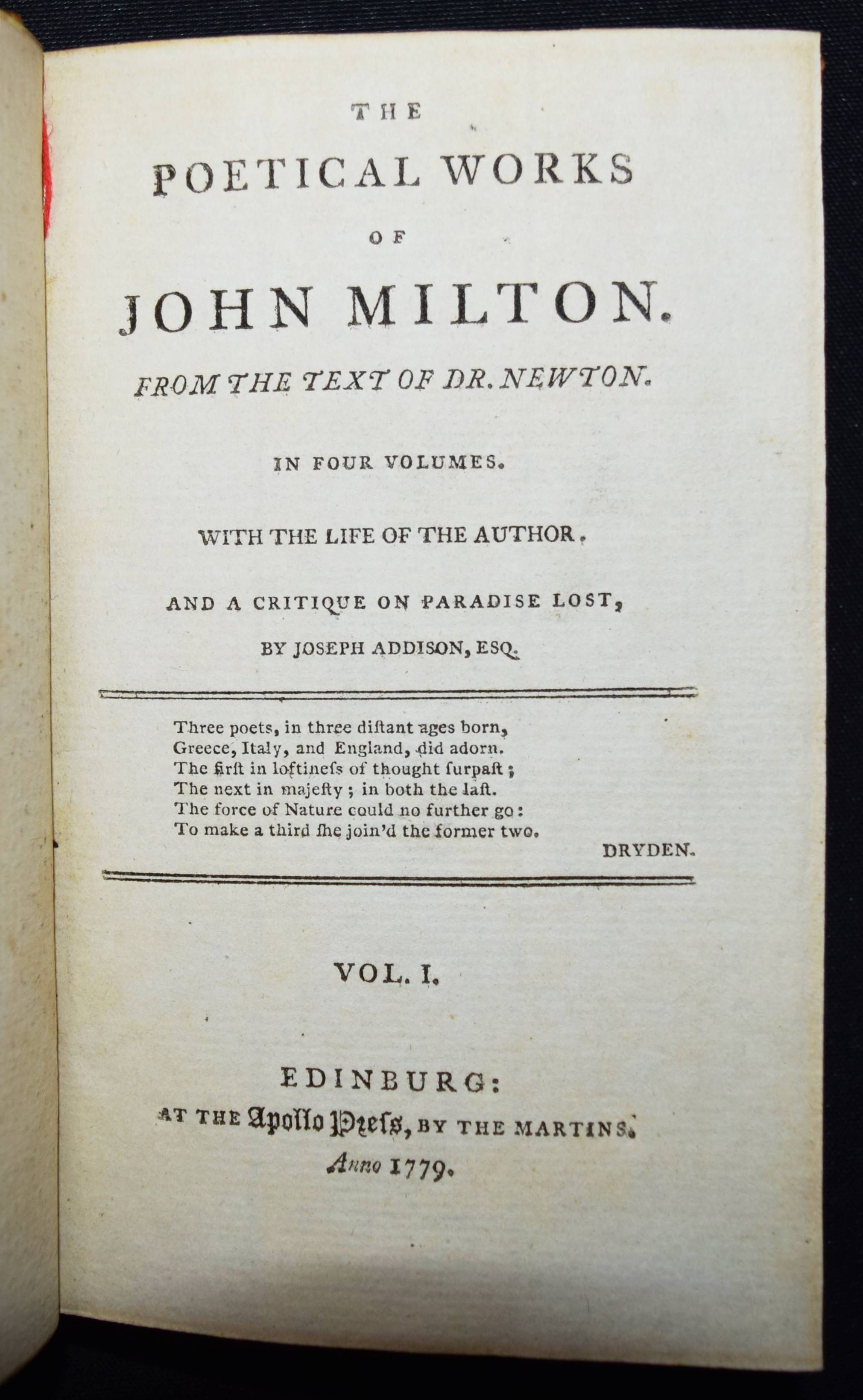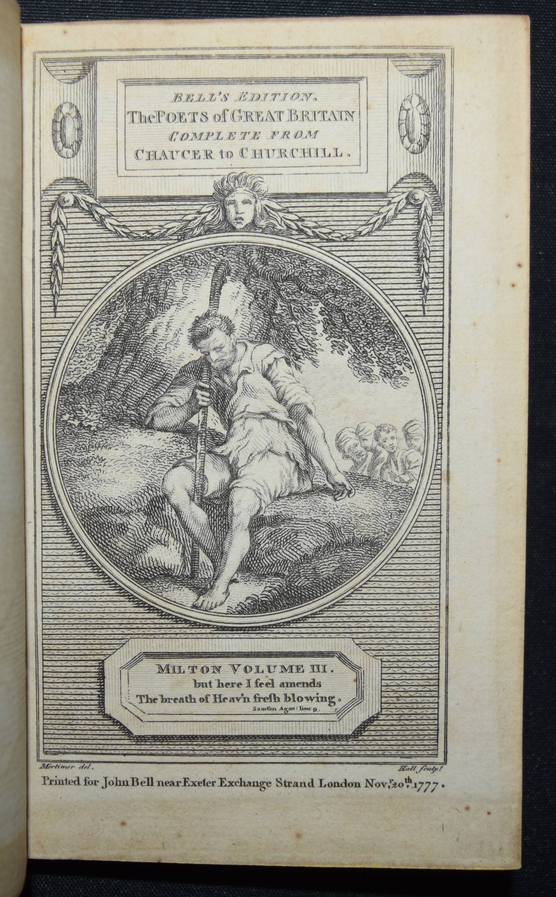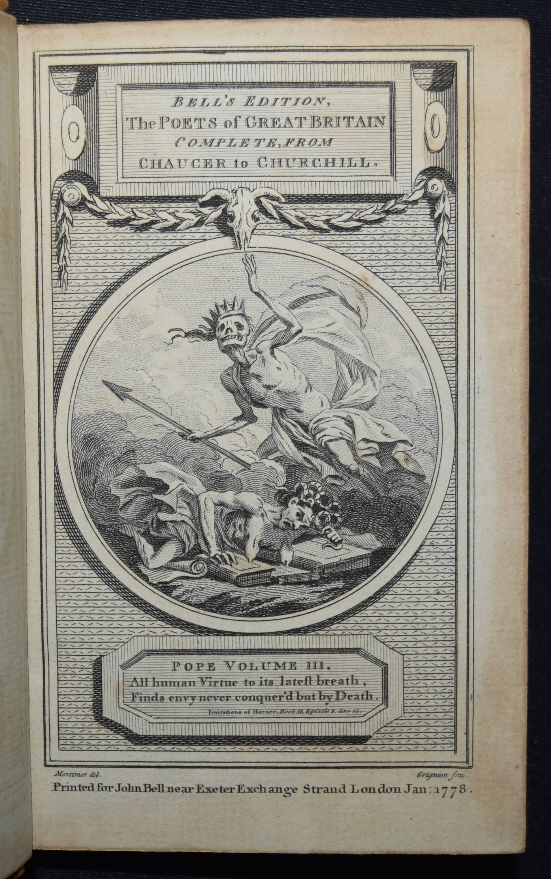 Bell, John (Ed.). Bell’s Edition. The poets of Great Britain complete from Chaucer to Churchill. Vol. 28-31, 35, 40-42, 44, 50, 57, 66, 76-78. Zus. 15 Bände. Edinburg and London, John Bell for The Apollo Press 1778-1781. 12° (13 x 8 cm.). Mit 8 gestoch. Portrait-Frontisp. und 15 gestoch. illustr. Titelblättern. Kalbslederbände der Zeit mit zweifarb. goldgepr. Rückenschildern und reicher Rückenvergoldung und Kantenvergoldung. Seltene schön ausgestattete Taschenausgabe der britischen Klassiker des 18. Jahrhunderts. – Dabei: I. Milton, John. The poetical works. From the text of Dr. Newton. In four volumes. With the life of the author. And a critique on Paradise Lost, by Joseph Addison. – II. Denham, John. The poetical works. With the life of the author. – III. Dryden, John. The poetical works in three volumes. With the life of the author. – IV. Sheffield, John, Duke of Buckingham. The poetical works. With the life of the author. – V. Granville, Geo, Lord Lansdowne. The poetical works. With the life of the author. – VI. Addison, Joseph. The poetical works. With the life of the author. – VI. Philips, John. The poetical works. With the life of the author. – VII. Pope, Alexander. The poetical works. With his last corrections, additions, and improvements. In four volumes. From the text of Dr. Warburton. With the life of the author. – Insgesamt erschienen von 1777 bis 1784 109 Bände. – Einbände geringfügig berieben, Band 76 mit kl. Wurmspuren, nur vereinzelt leicht braunfleckig, außergewöhnlich dekorativ gebundene Reihe.