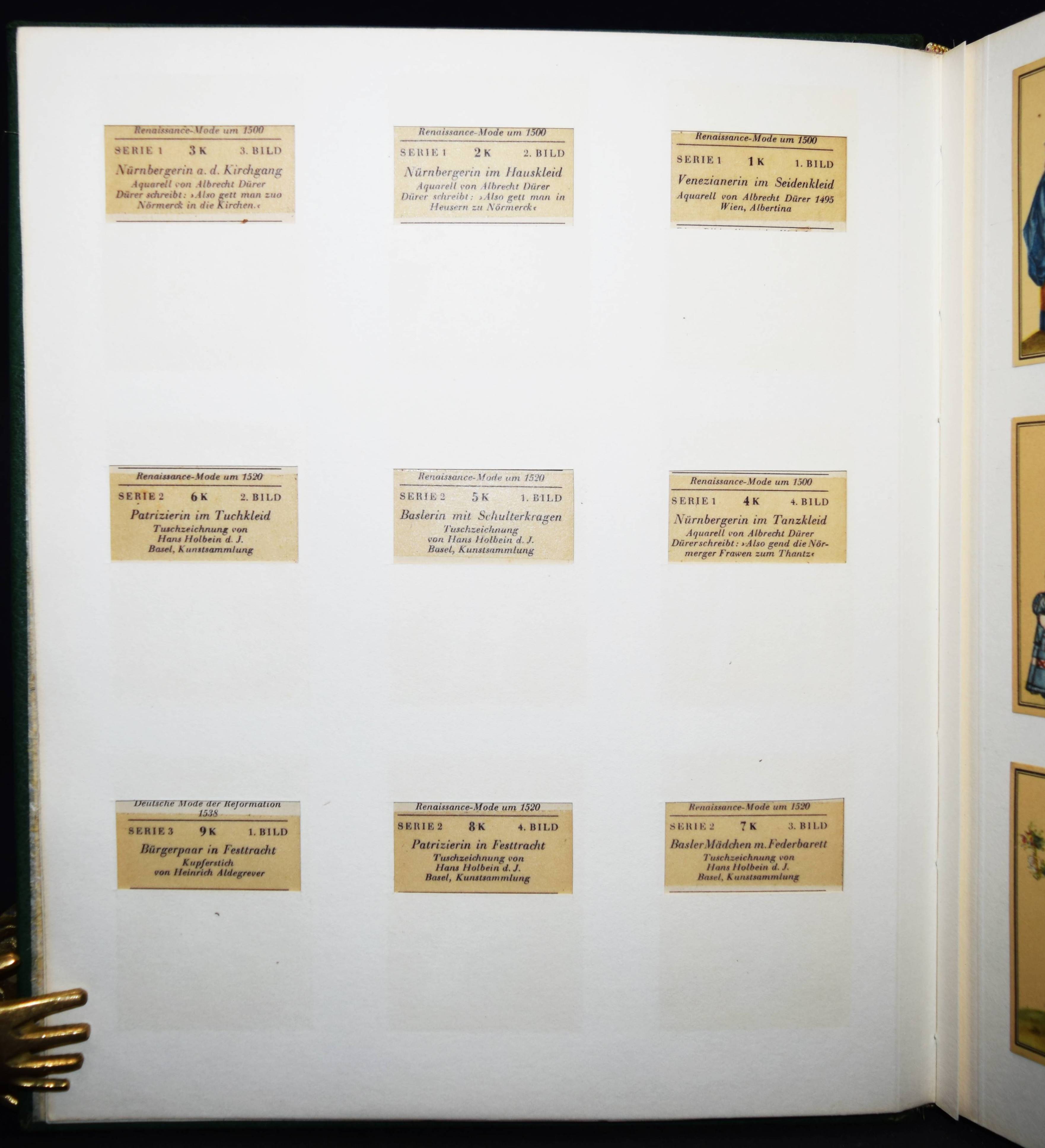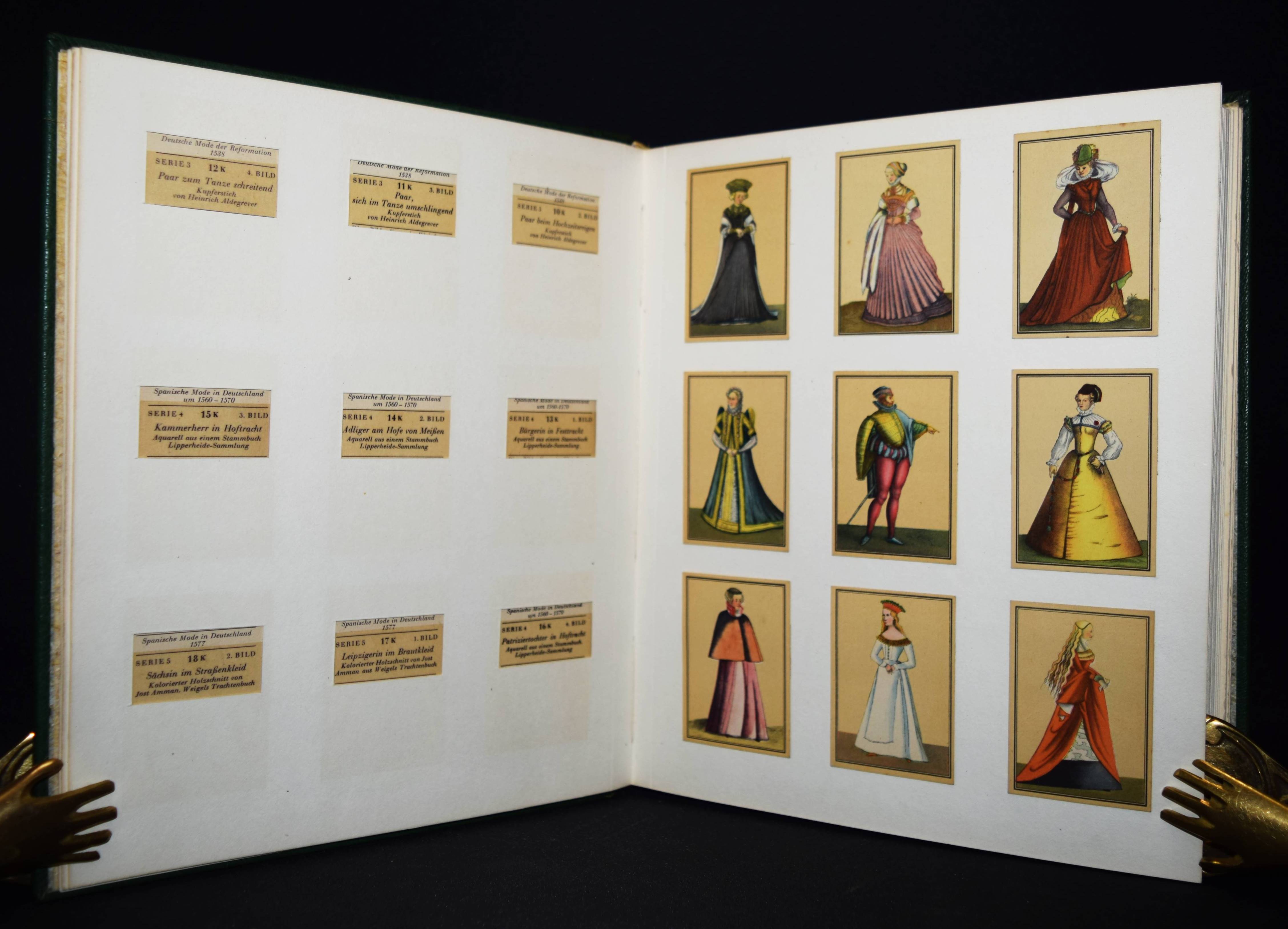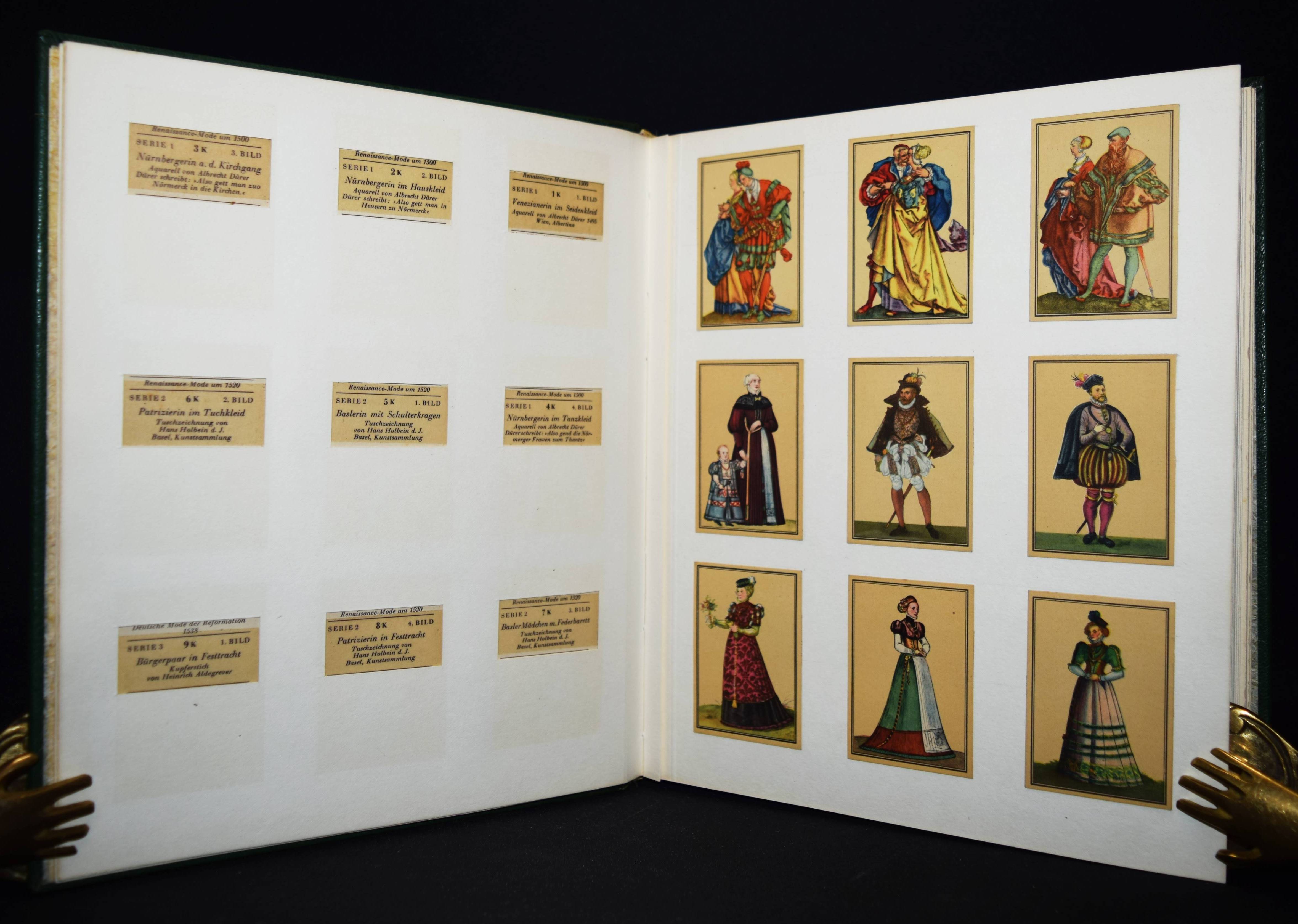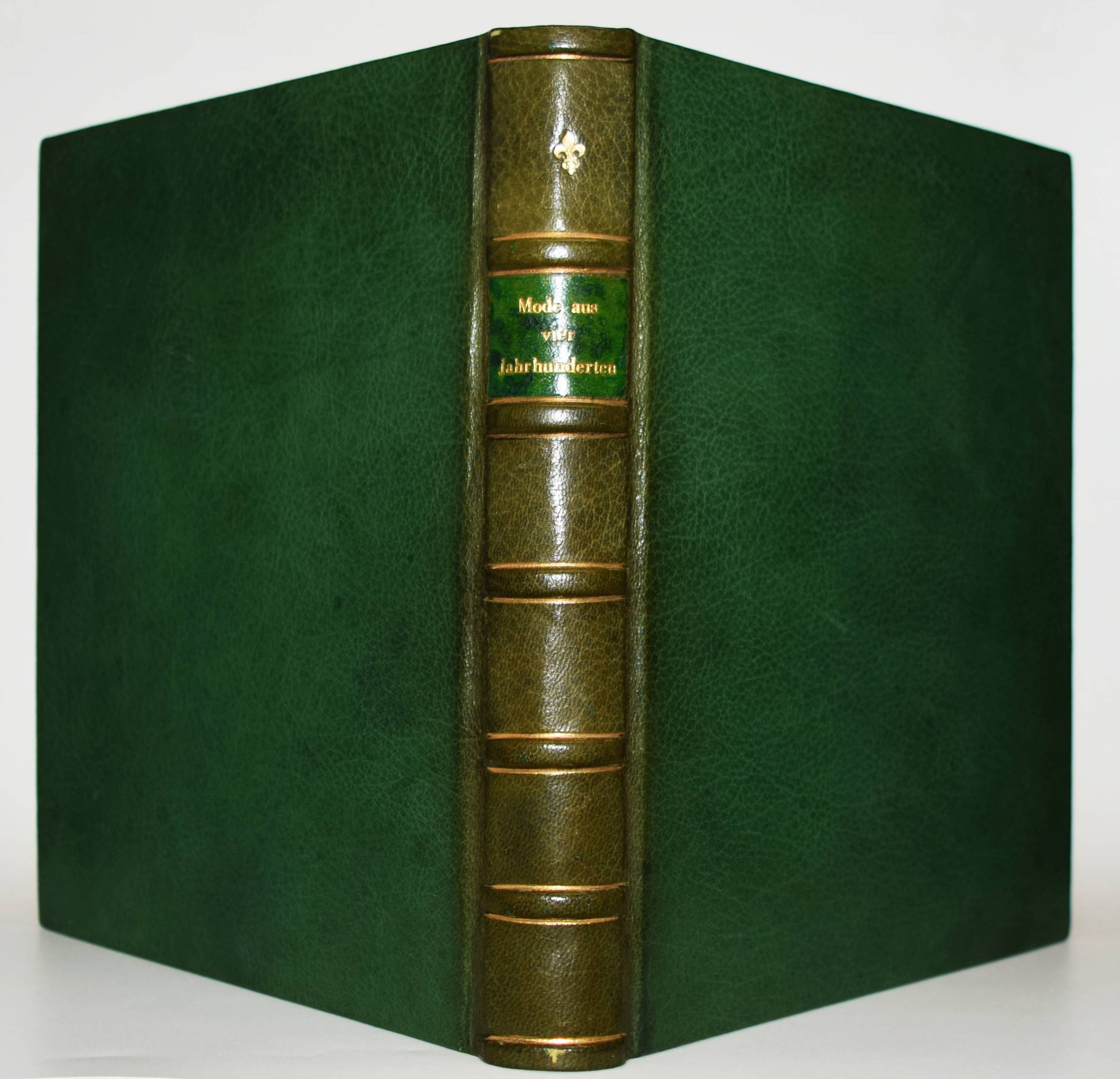 (Bruhn, Wolfgang, Hrsg.). (Moden Almanach). Mode aus vier Jahrhunderten. (Köln, Zigarettenfabrik Haus Neuerbuch 1933). 4° (25 x 21,5 cm.). [50] Bl. mit mont. goldgepr. Titelschild in grünem Leder und 288 farb. mont. Sammelbildern (jeweils 6,5 x 4,5 cm.) und 17 w. Bl. Grüner Maroquin-Lederband der Zeit mit goldgepr. Rückenschild, 7 Bünden und Linienvergoldung. Zusammenstellung der Sammelbilder aus dem Zigarettenbild-Sammelalbum in einem prachtvollen Handeinband. Aus der Bibliothek des Bergwerksdirektors Wilhelm Kesten (1875-1958) mit dessen gestoch. und handkol. Exlibris von Hermann Kätelhön (1884-1940).