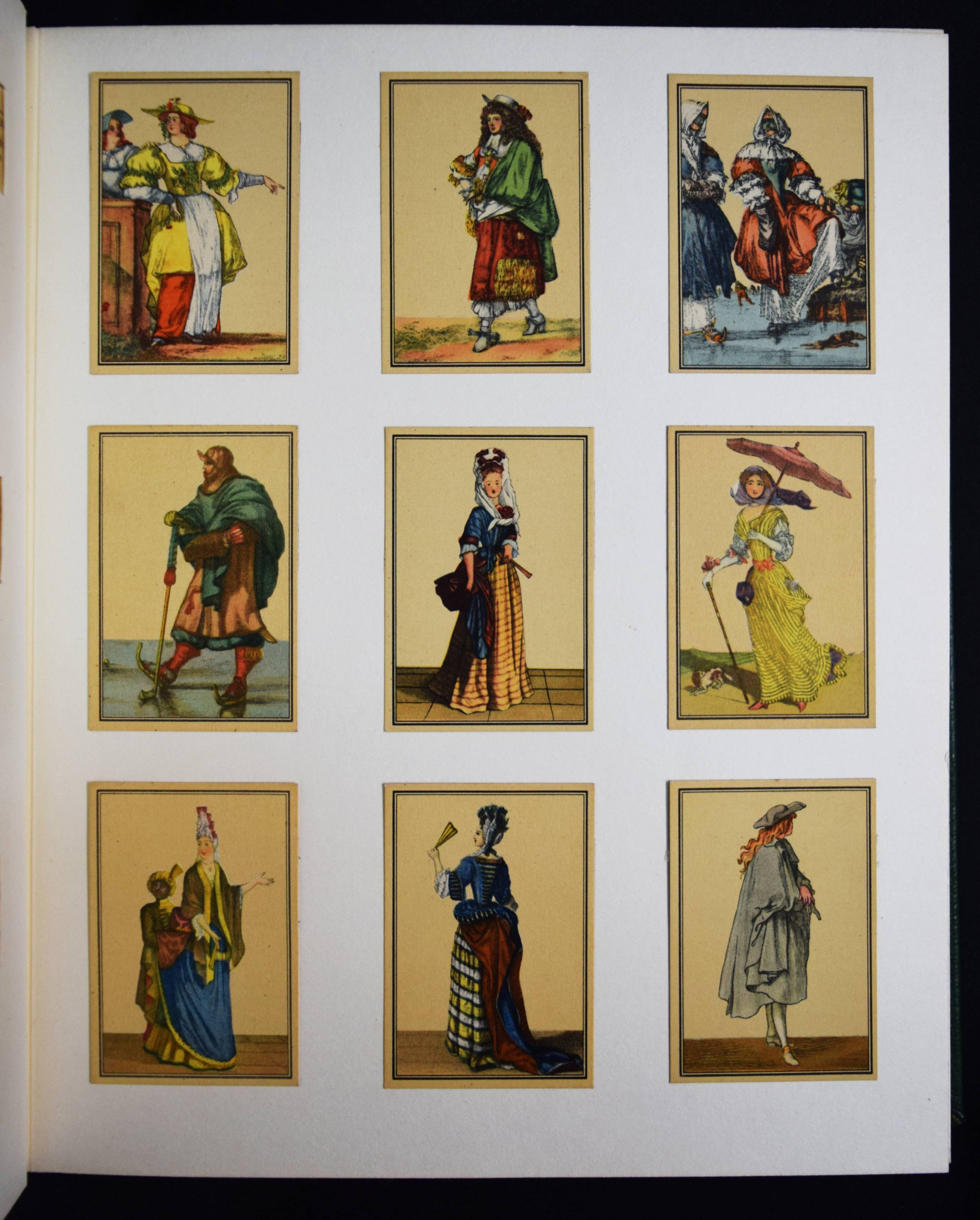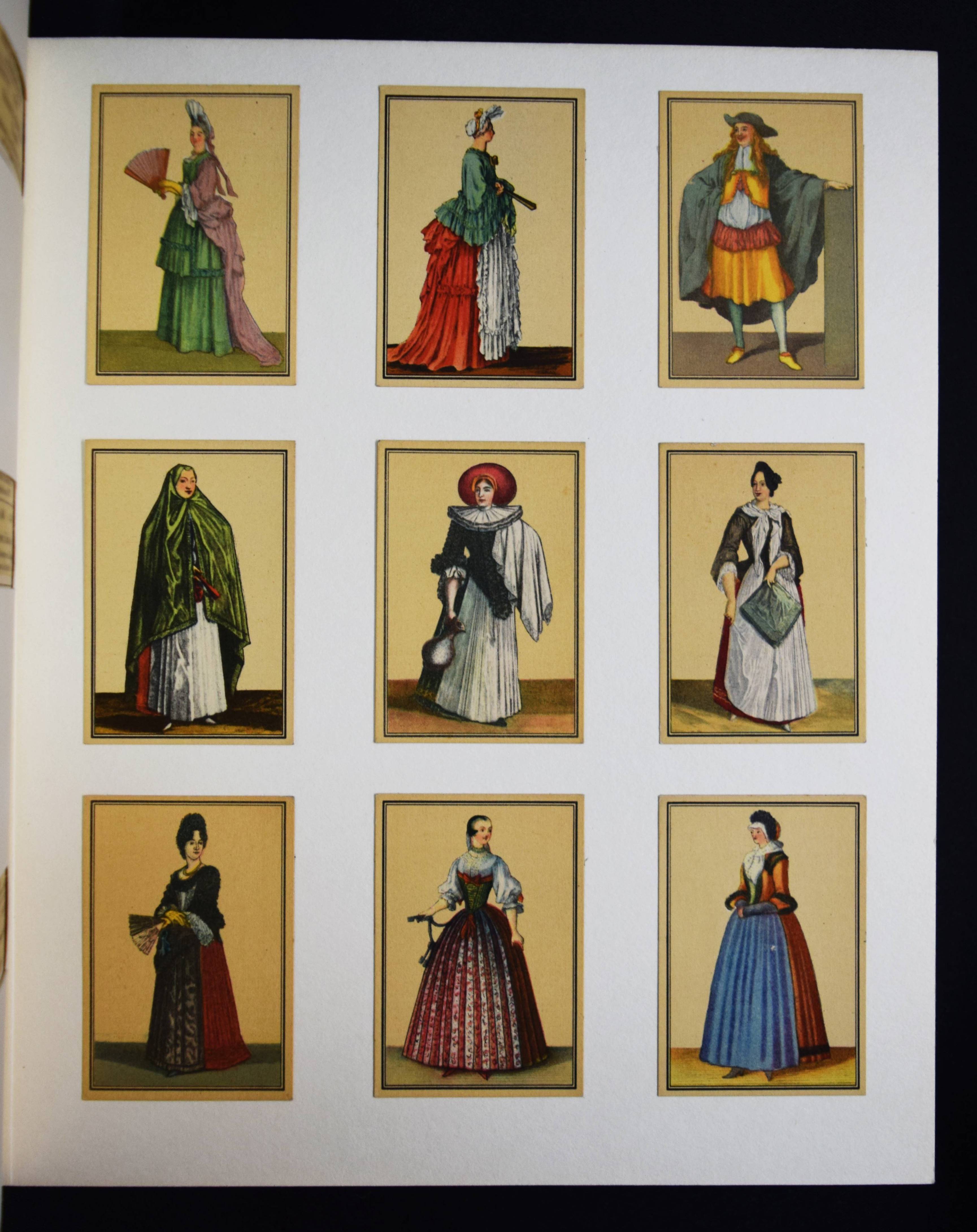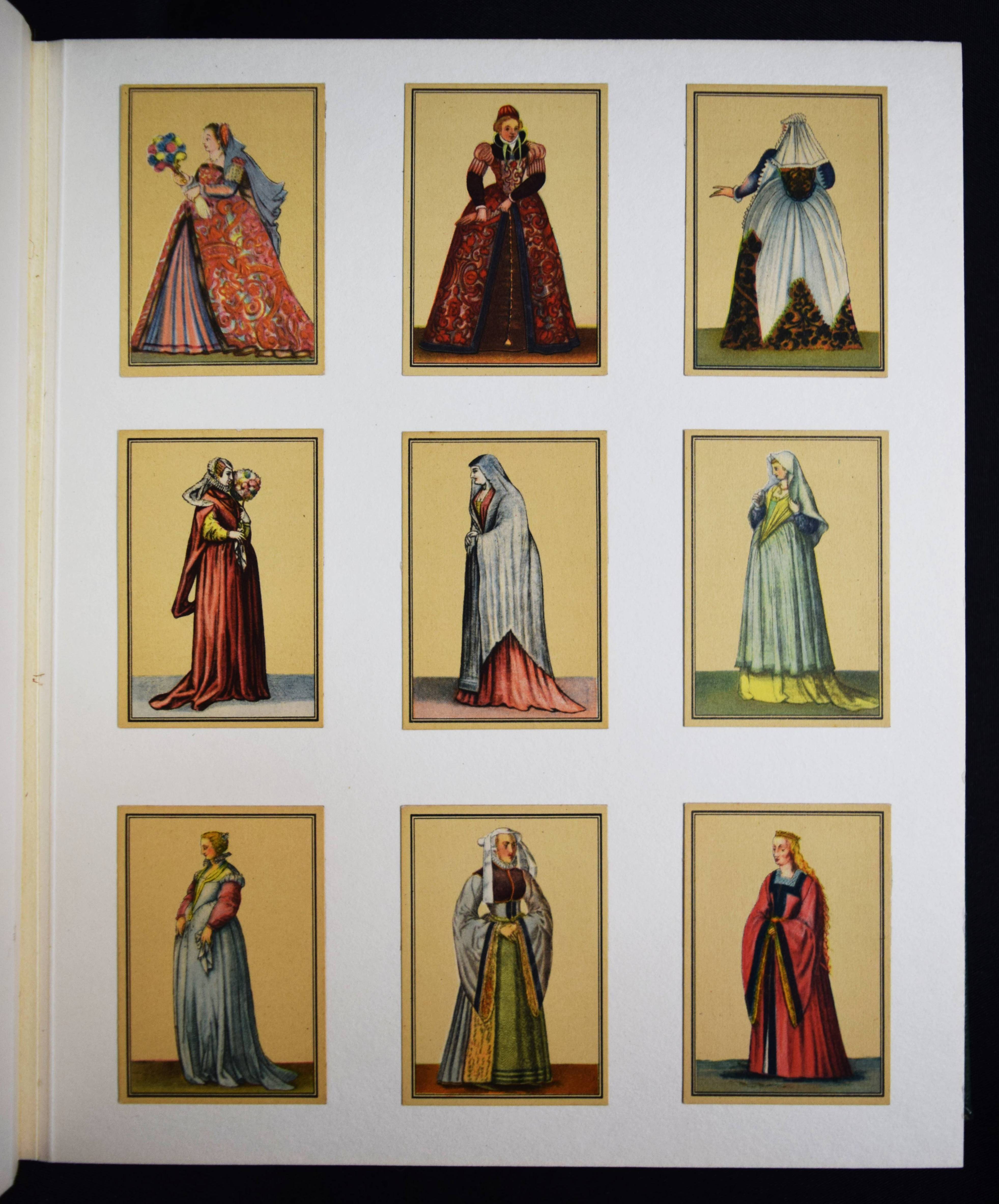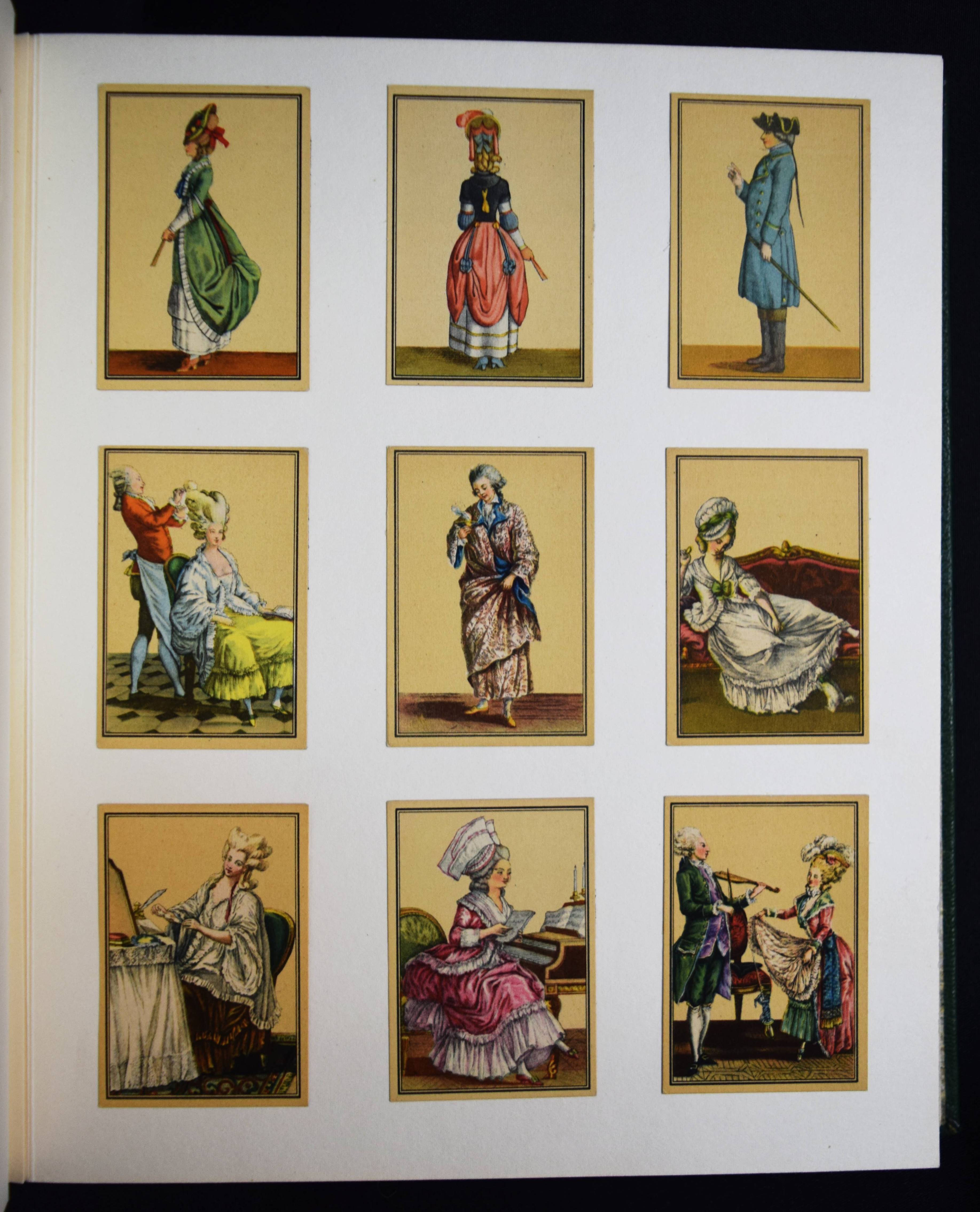 (Bruhn, Wolfgang, Hrsg.). (Moden Almanach). Mode aus vier Jahrhunderten. (Köln, Zigarettenfabrik Haus Neuerbuch 1933). 4° (25 x 21,5 cm.). [50] Bl. mit mont. goldgepr. Titelschild in grünem Leder und 288 farb. mont. Sammelbildern (jeweils 6,5 x 4,5 cm.) und 17 w. Bl. Grüner Maroquin-Lederband der Zeit mit goldgepr. Rückenschild, 7 Bünden und Linienvergoldung. Zusammenstellung der Sammelbilder aus dem Zigarettenbild-Sammelalbum in einem prachtvollen Handeinband. Aus der Bibliothek des Bergwerksdirektors Wilhelm Kesten (1875-1958) mit dessen gestoch. und handkol. Exlibris von Hermann Kätelhön (1884-1940).