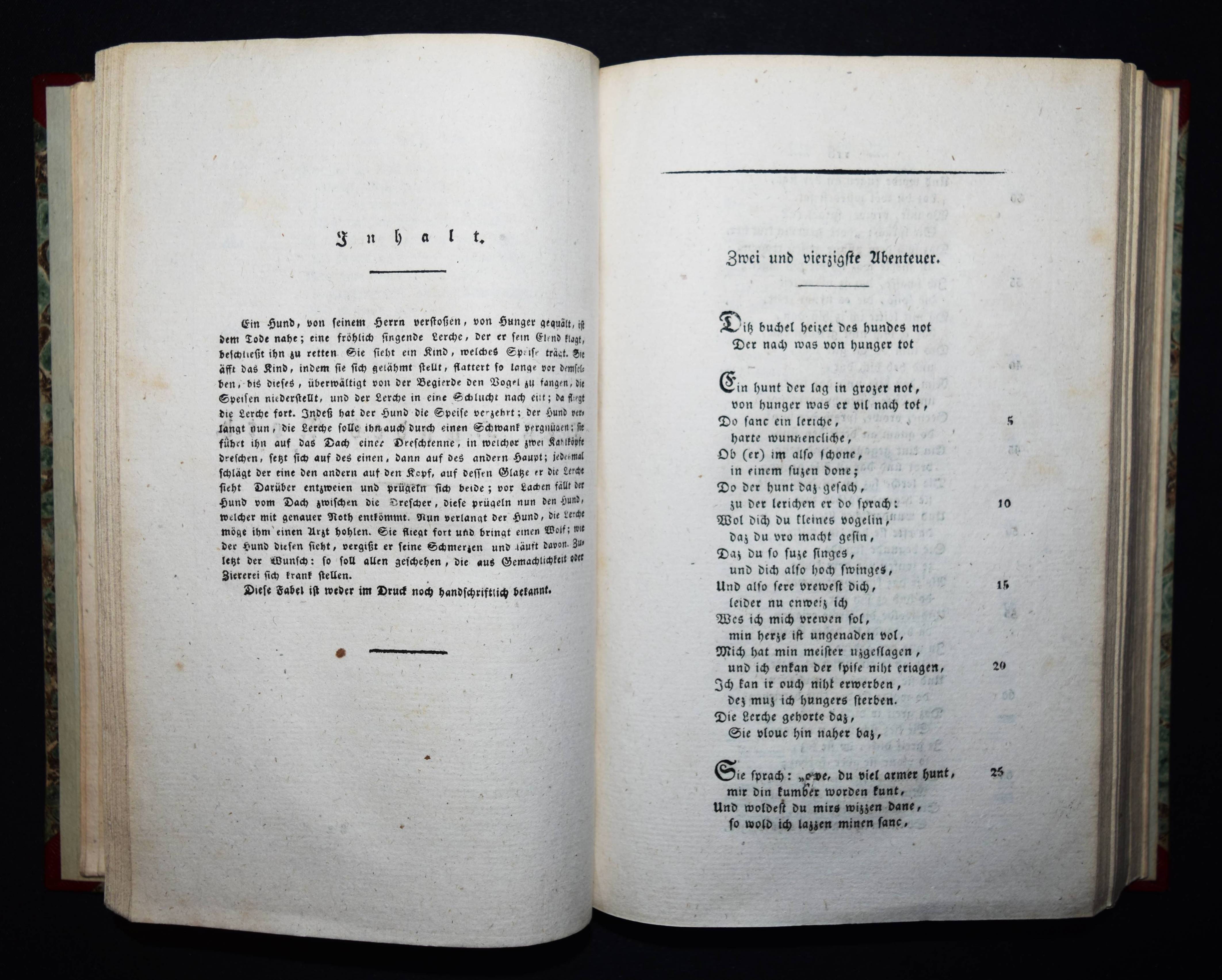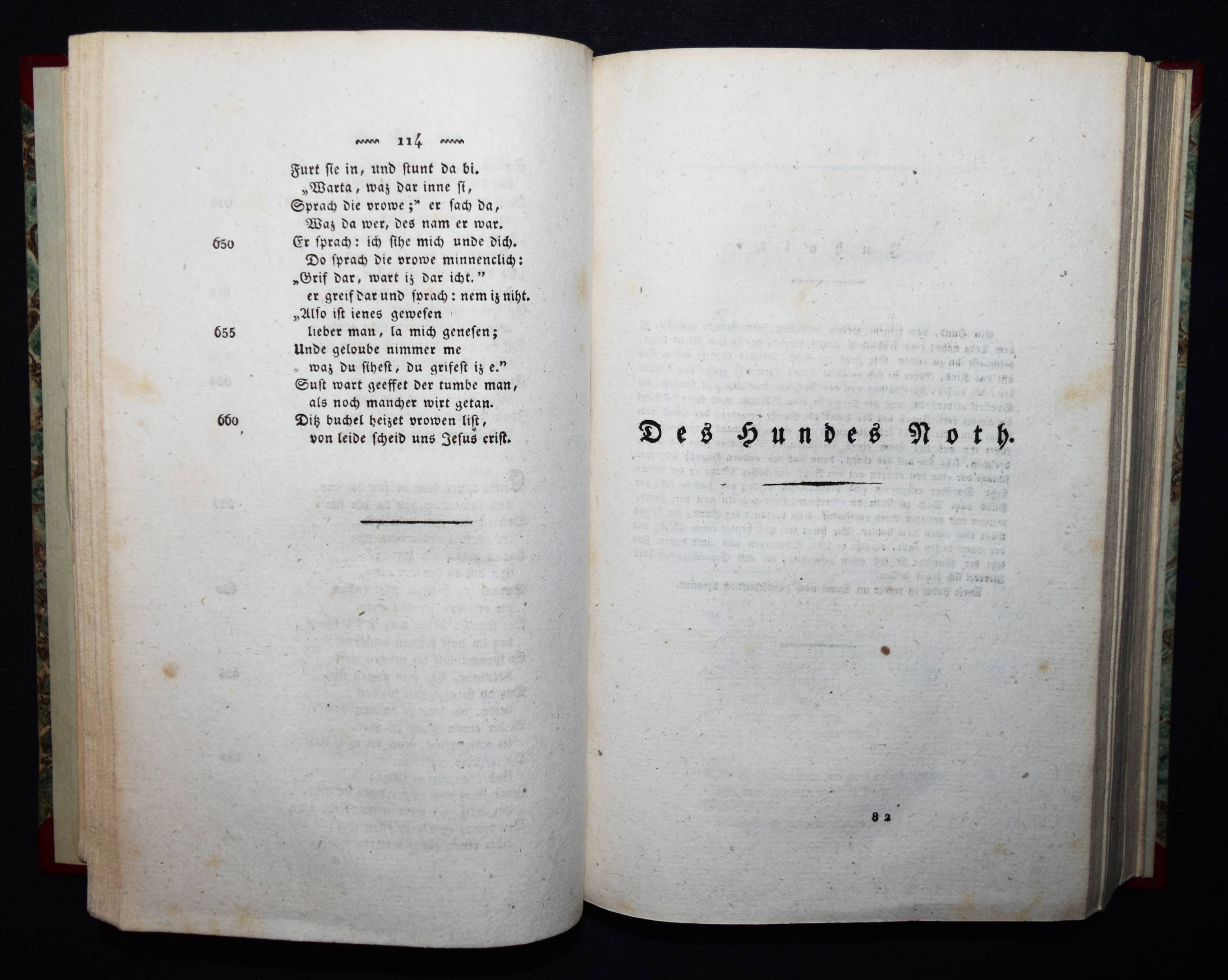 Mailáth (von Székhely), Johann und Johann Paul Köffinger (Hrsg.). Koloczaer Codex altdeutscher Gedichte. Pesth, Konrad Adolf Hartleben 1817. 8°. XX, 464 S. Weinroter Halb-Maroquinlederband mit goldgepr. Rückenschild und dekorativer Rückenvergoldung. Hayn-Gotendorf III, 603. – Erste Ausgabe. – Der bedeutende ungarische Codex aus der Kapitularbibliothek von Kolocza (Kalocsa), ursprünglich wohl „für die Corvinische Bibliothek zusammen geschrieben“, enthält Dichtungen von Konrad v. Würzburg, Rüdiger v. Hunthover, Meister Wunnenhoven, dem Stricker, Heinrich v. Glichsenere, Hartmann von der Aue u. a. Das von Ludwig Bechstein in sein „Deutsches Märchenbuch“ aufgenommene Tiermärchen „Des Hundes Not“ ist durch das hier enthaltene Schwankgedicht „XLII. Diß buchel heiset des hundes not, der nach was von hunger tot“ (S. 115 ff) und durch Grimms „Der Hund und der Sperling“ (KHM 58) inspiriert. – Nur vereinzelt leicht braunfleckig, sehr schönes dekorativ gebundenes Exemplar.