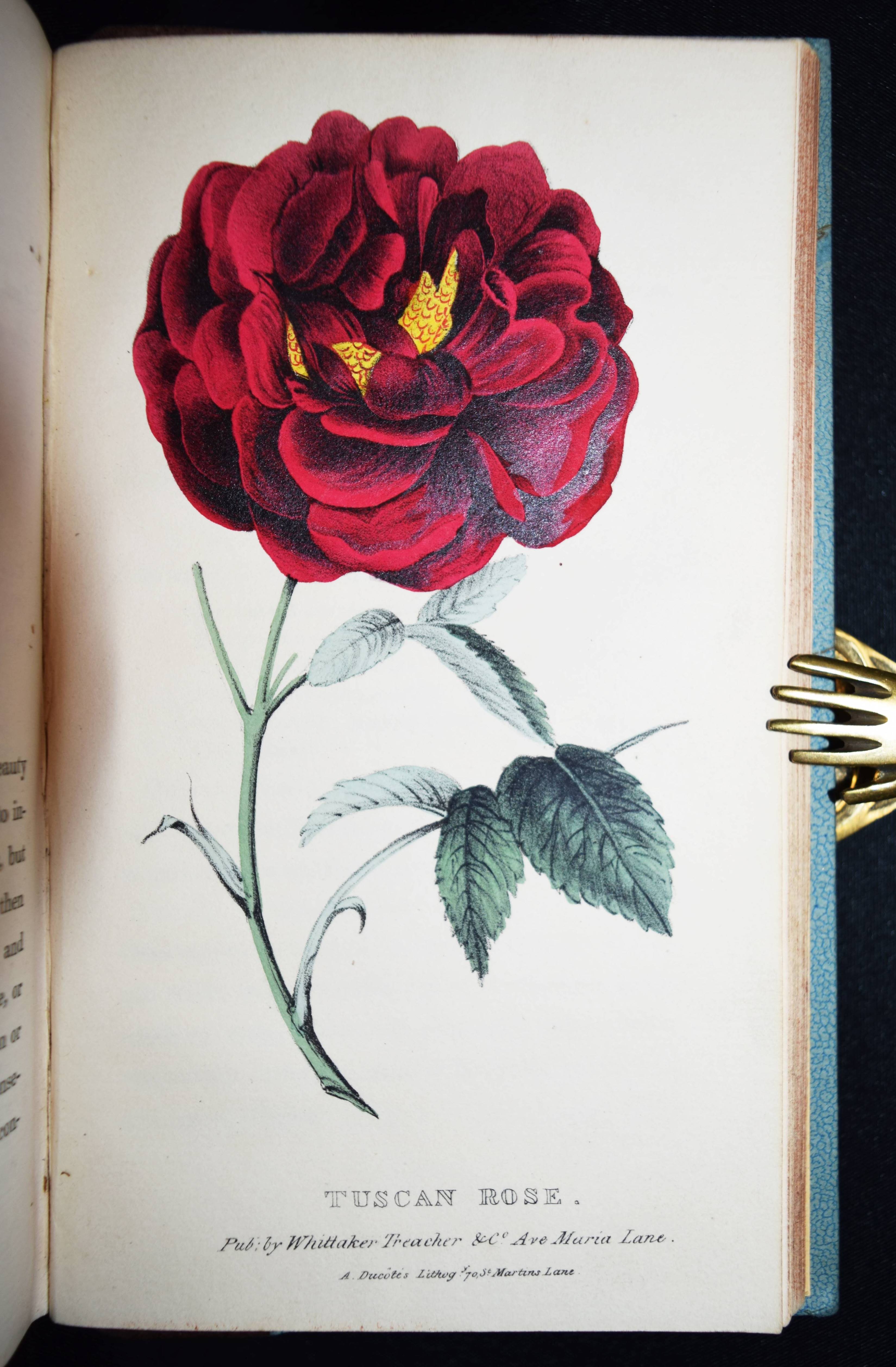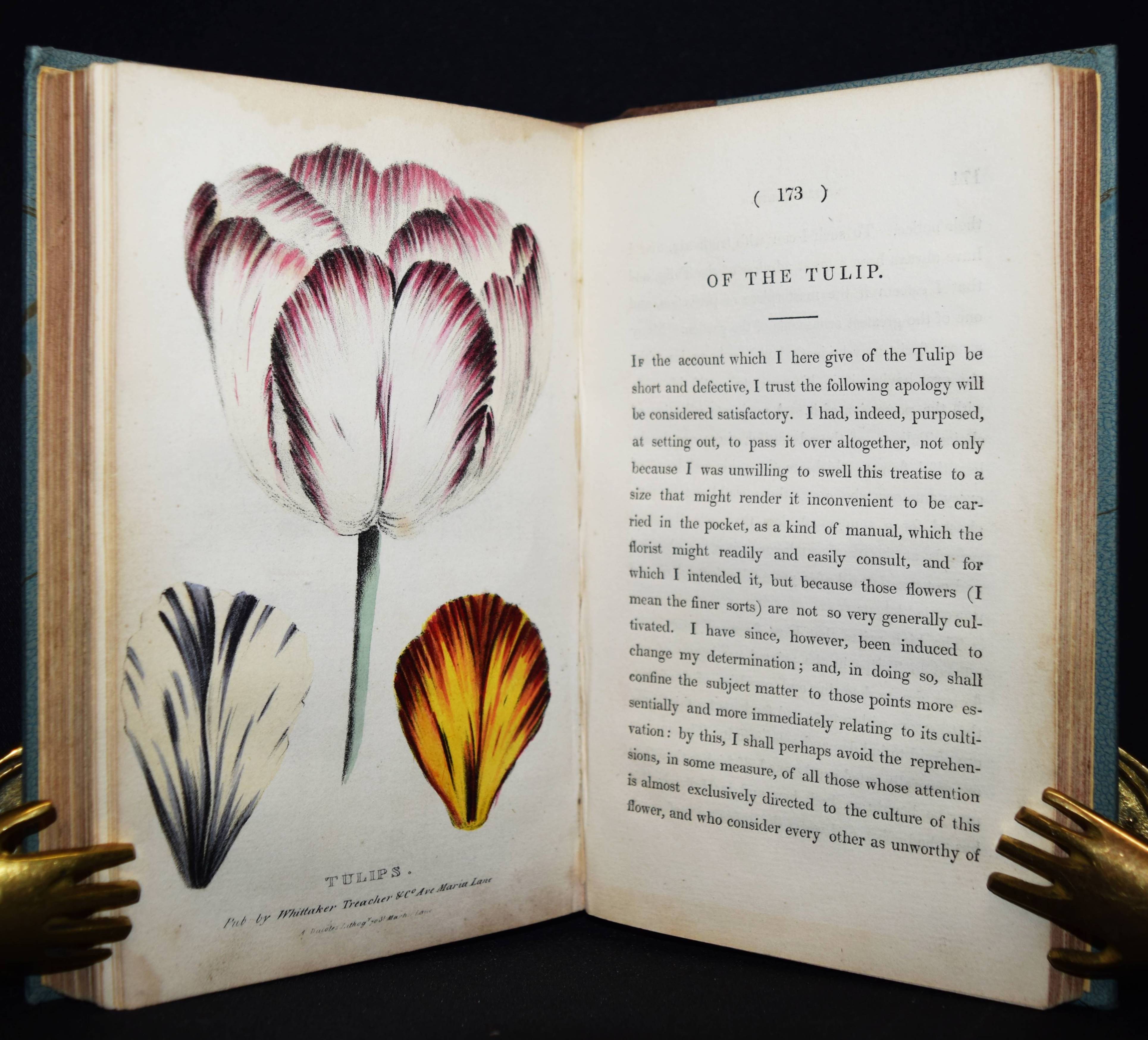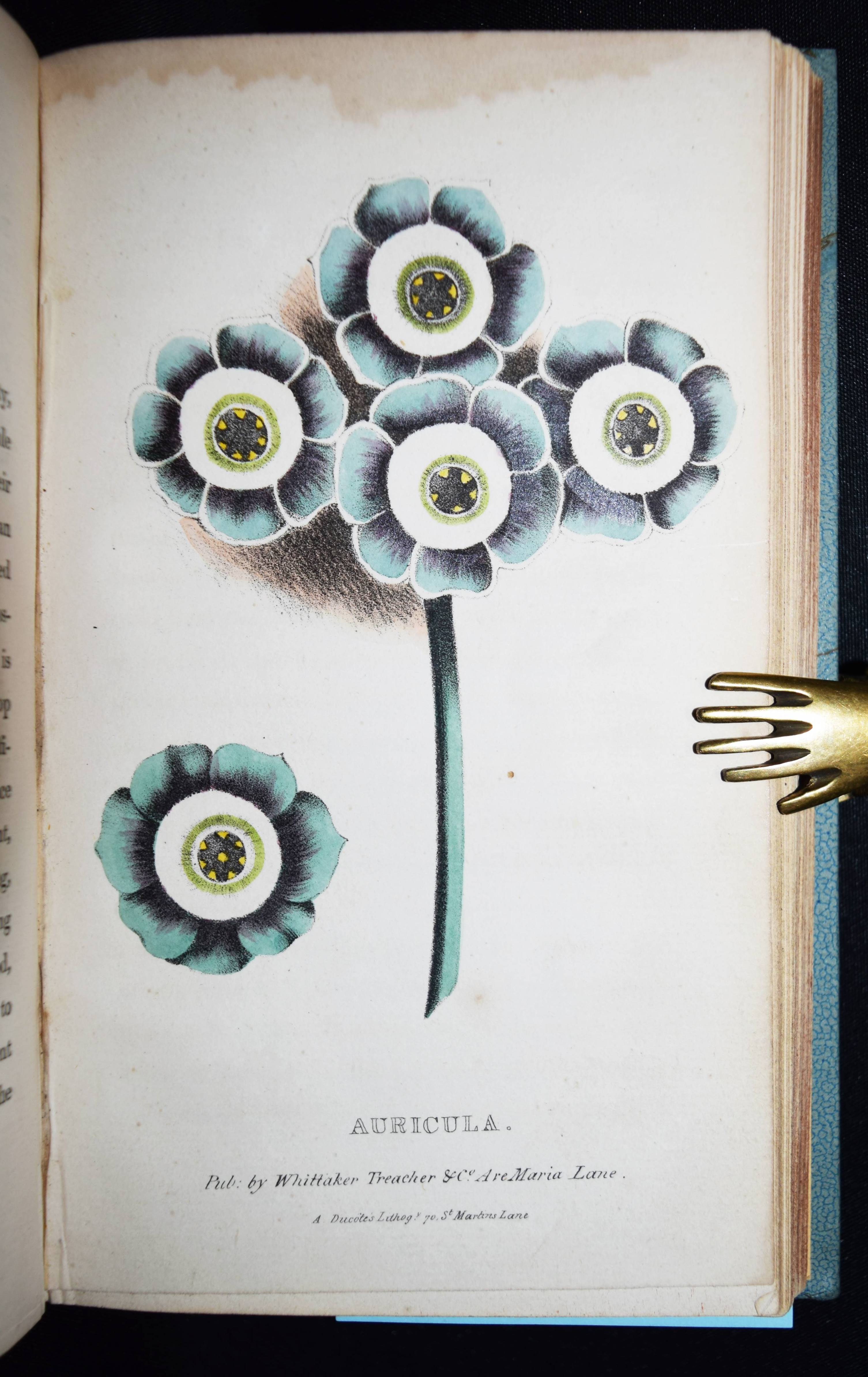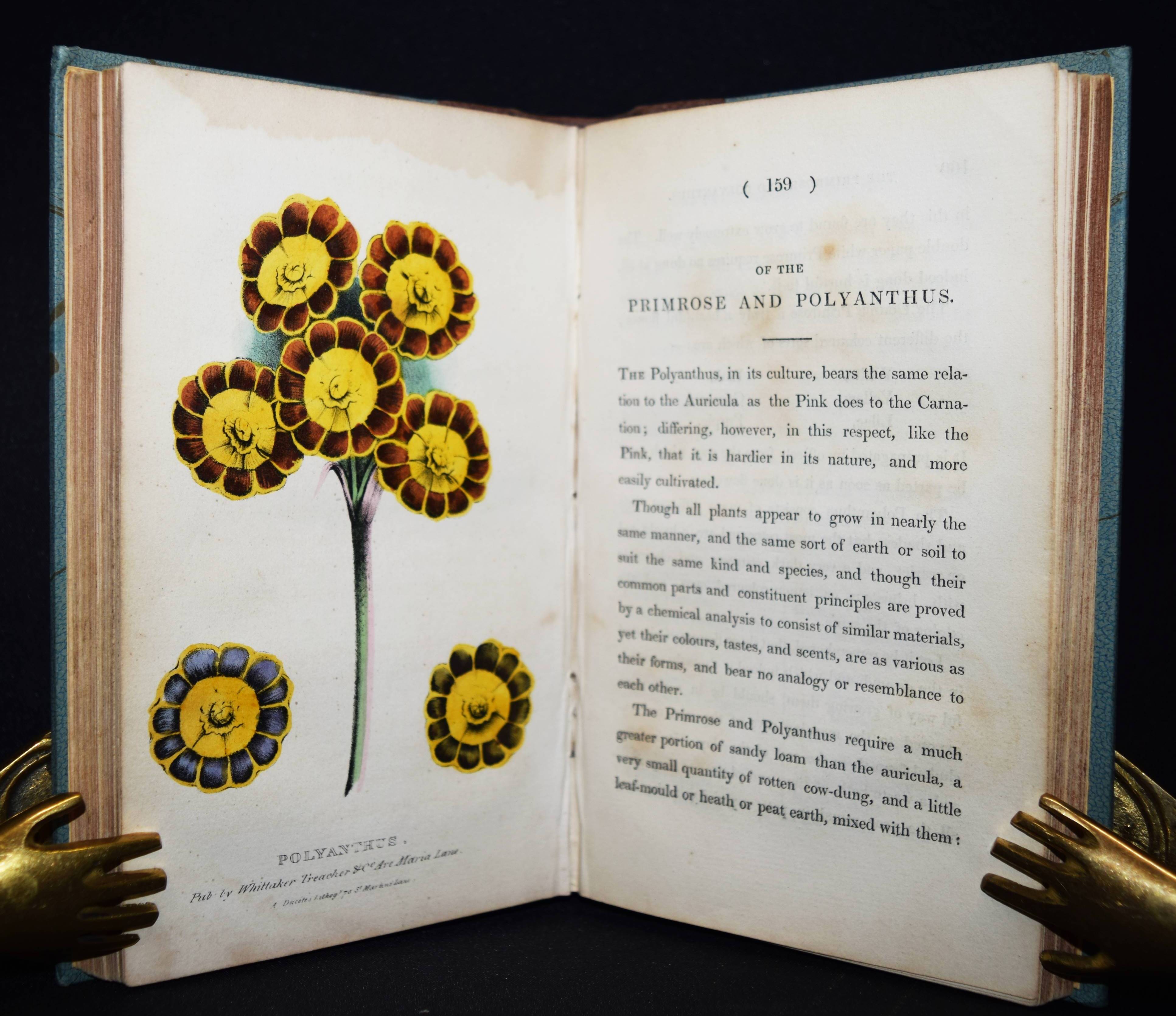 Hogg, Thomas. A concise and practical treatise on the growth and culture of the carnation, Pink, Auricula, Polyanthus, Ranunculus, Tulip and other flowers. With a dissertation on soils and manures, and catalogues of the most esteemed variaties of each flower. Sixth edition with coloured illustrations. London, Whittaker and Co. 1839. 8°. XXXI, 275, (1) S. nit 6 handkol. lithogr. Tafeln. Hldr. um 1920 mit goldgepr. Rückenschild. Nicht bei Nissen u. Pritzel. – Oft aufgelegtes zuerst 1820 erschienenes Handbuch zur Blumen-Kultur. Die schönen, teils mit Eiweiß gehöhten Tafeln zeigen: „A bizzare carnation“ (Frontispiz), „Yellow Picote“, „Auricula“, „Polyanthus“, „Tulips“ und „Tuscan Rose“. – Frontispiz und Titelblatt braunfleckig, sonst meist nur im Blattrand etwas braunfleckig, gutes Exemplar.