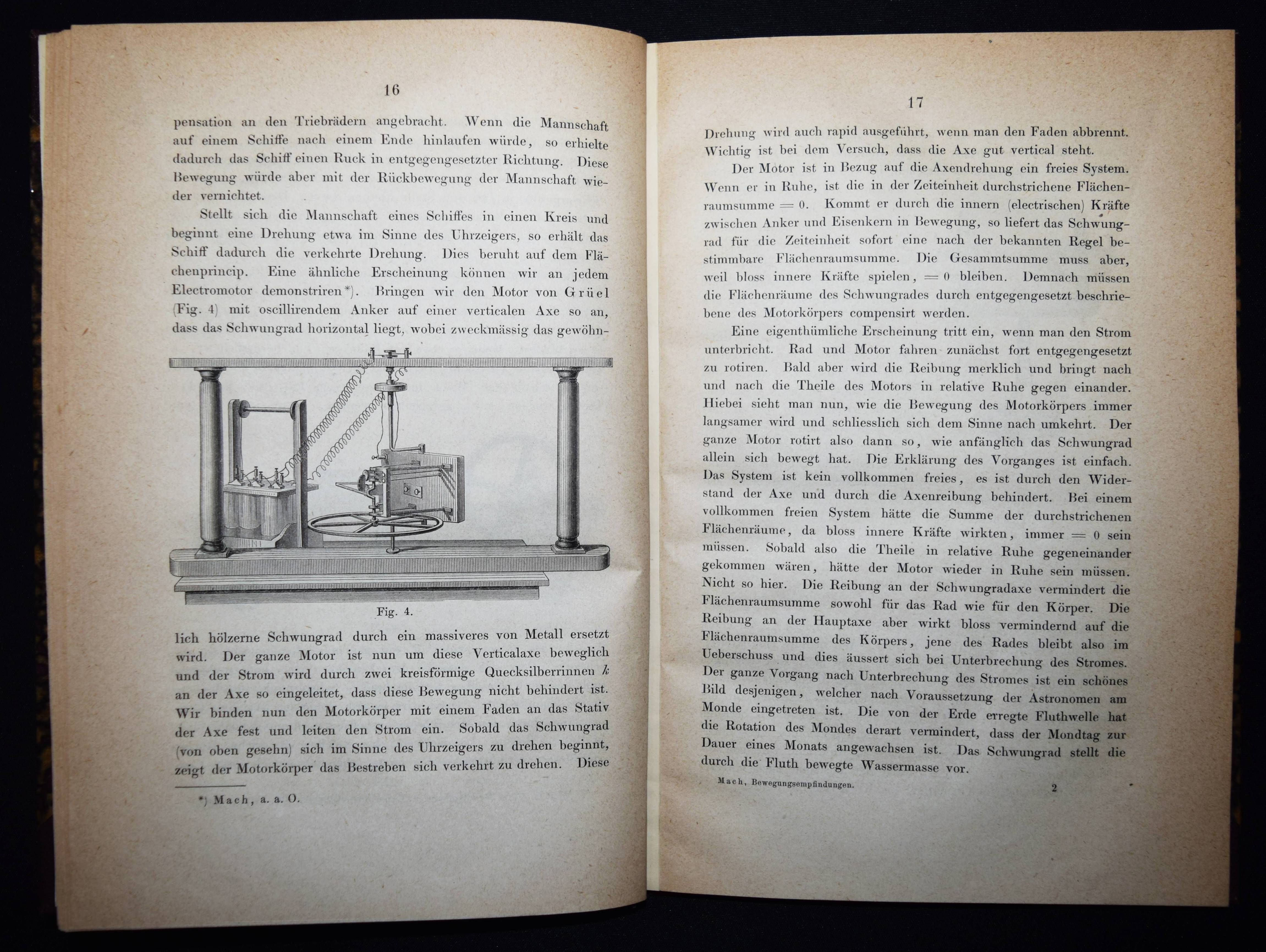 Mach, E(rnst). Grundlinien der Lehre von den Bewegungsempfindungen. Leipzig, Wilhelm Engelmann 1875. 8°. IV, 127, [1] S. mit 18 Holzschnitten im Text. Halbleinenband der Zeit mit goldgepr. Rückentitel. DSB VIII, 595. ÖBL V, 388 f. – Erste und einzige Ausgabe, selten. – Der böhmische Physiker und Philosoph E. Mach (1838-1916), seit 1866 Prof. für Physik in Graz, Prag und später in Wien, „lehnte … die Annahme von Atomen ab, die grundsätzlich nicht beobachtbar seien. Trotz dieser metaphysikfeindlichen Einstellung behauptete er die Existenz der Empfindungen, auch wenn sie uns nicht bewußt sind, womit er ein metaphys. „Ding an sich“ wieder einführte. Körper, Bewußtsein (Ich), Seele sind Komplexe von Empfindungen, Phänomene Änderungen solcher Komplexe. Kausalität ist der Glaube an das Wiedereintreten beobachteter Regelmäßigkeiten. Naturgesetze sprechen funktionale Abhängigkeiten zwischen Zustandsänderungen aus. Sie stützen sich auf wiederholte Beobachtungen und ermöglichen infolge ihres hypothet. Charakters die Voraussage weiterer funktionaler Beziehungen zwischen beobachtbaren Daten. Die Deutung der Naturgesetze als funktionale Relationen hat sich die moderne Naturwiss. zu eigen gemacht. Das positivist. Prinzip, alle Aussagen auf Beobachtungsdaten („Empfindungsreihen“) zu beziehen, wandte M. auf die Bewegungsgesetze der Newtonschen Mechanik an. Bewegungen als Ortsveränderungen haben relativen Charakter. Die Kennzeichnung von Bewegungen durch Trägheitskräfte stützt sich auf eine zweite, von der Ortsveränderung unabhängige Datenreihe. Folglich sind kräftefreie beschleunigte Bewegungen denkbar. Der „absolute“ Raum als Ursache der Trägheitskräfte ist nicht nachweisbar, mithin eine metaphys. sinnleere Annahme. Wie die Gravitationskraft sind Trägheitskräfte Beziehungen zwischen Massen, etwa der Masse der Fixsterne zu relativ zu ihnen beschleunigt bewegten Massen (Machsches Prinzip). Das M.sche Prinzip wurde zu einem grundlegenden Element der Allg. Relativitätstheorie. M. berechnete die akust. Effekte, die bei Durchbrechung der Schallmauer auftreten. In der Flugtechnik galt „1 Mach“ als neue Maßeinheit für Geschwindigkeiten“ (Juhos in ÖBL). – St.a.T., papierbedingt etwas gebräunt, sehr gutes Exemplar.