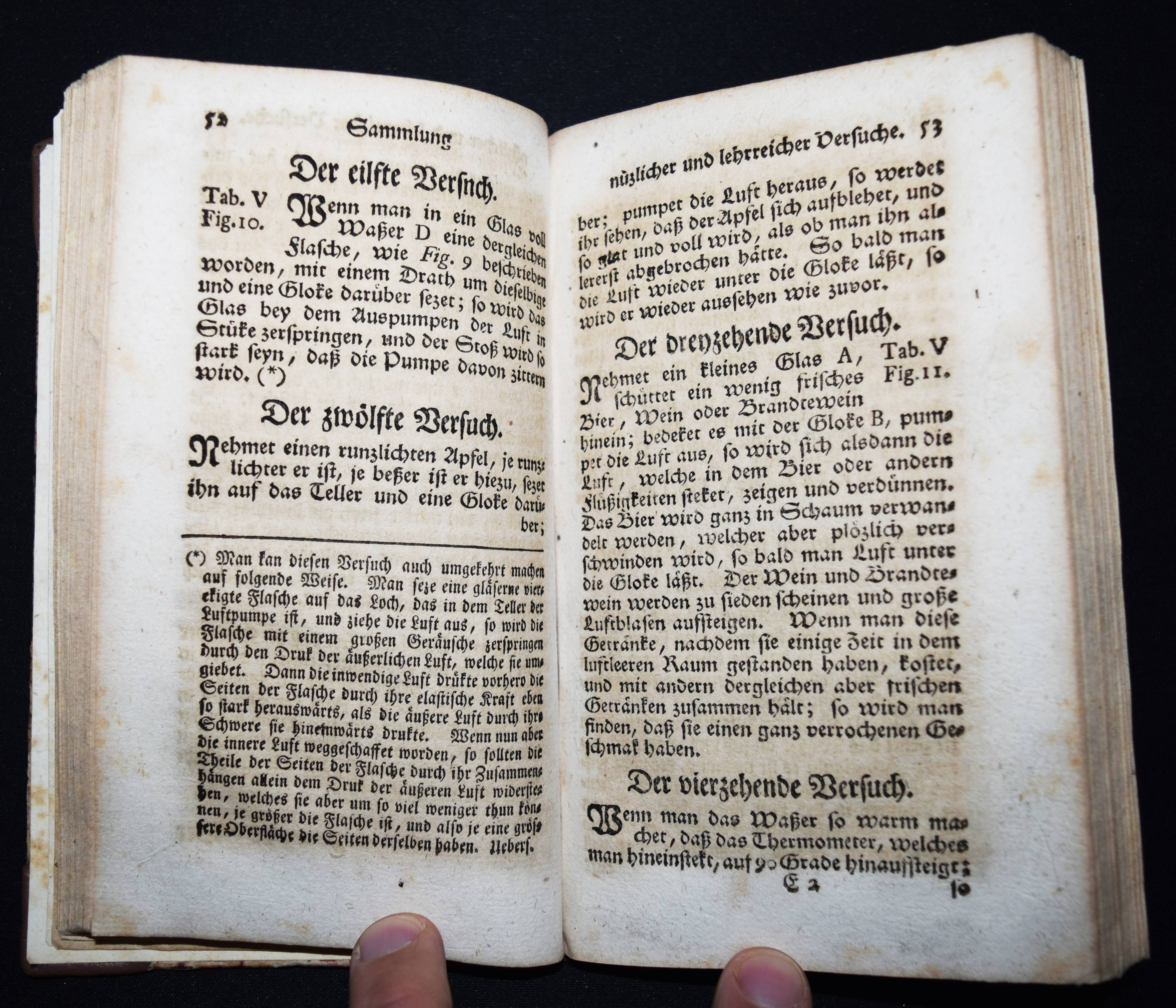 Muschenbroek, Jan van. Beschreibung der doppelten und einfachen Luftpumpe. Nebst einer Sammlung von verschiedenen nüzlichen und lehrreichen Versuchen, welche man mit der Luftpumpe machen kan. Aus dem Französischen übersetzt und mit vielen neuen Zusätzen und Kupfern vermehret von Johann Christoph Thenn. Augsburg, Eberhard Klett, Wittwe 1765. Kl.-8°. [7] Bl., 150 S. und 6 gefalt. Kupfertafeln. Moderner Halblederband mit Deckelschild. Engelmann, Bibl.-Techn. 261. VD18 11077050. – Erste deutsche Ausgabe. – Johann van Musschenbroek (1687–1748) „war Mechanicus in Leiden. Sein Vater Johann Joosten betrieb die erste Werkstätte für physikalische Instrumente auf dem Kontinent, sein Bruder Pieter war maßgeblich an der Rezeption von Newtons Physik und ihrer Fortentwicklung zu einer nicht-mathematischen Experimentalwissenschaft beteiligt. Tab. IV (Kat. Nr. 2, Abb. S. 7) zeigt die Brandersche „verticalstehende Luftpumpe“, Tab. VI einige der in der Schrift beschriebenen Experimente im luftleeren Rezipienten. Die kleine Schrift erschien zuerst auf holländisch im Essay de physique (Leiden 1739) seines Bruders Pieter. Die freie Übersetzung des Augsburger Pfarrers Johann Christoph Thenn (1729–1784) diente zugleich als Werbeschrift für die Werkstatt von Brander, dessen verbesserte Konstruktionen vom Übersetzer gelobt und „zu der Beförderung eines vernünftigen Vergnügens der Liebhaber der Naturlehre“ empfohlen wurden“ (C. Meinel, Die Luftpumpe, das Vakuum und die Anfänge der Physik in Regensburg, Regensburg 2004, S. 9). – Einband fachgerecht erneuert, Text stellenweise etwas braunfleckig, gutes Exemplar.