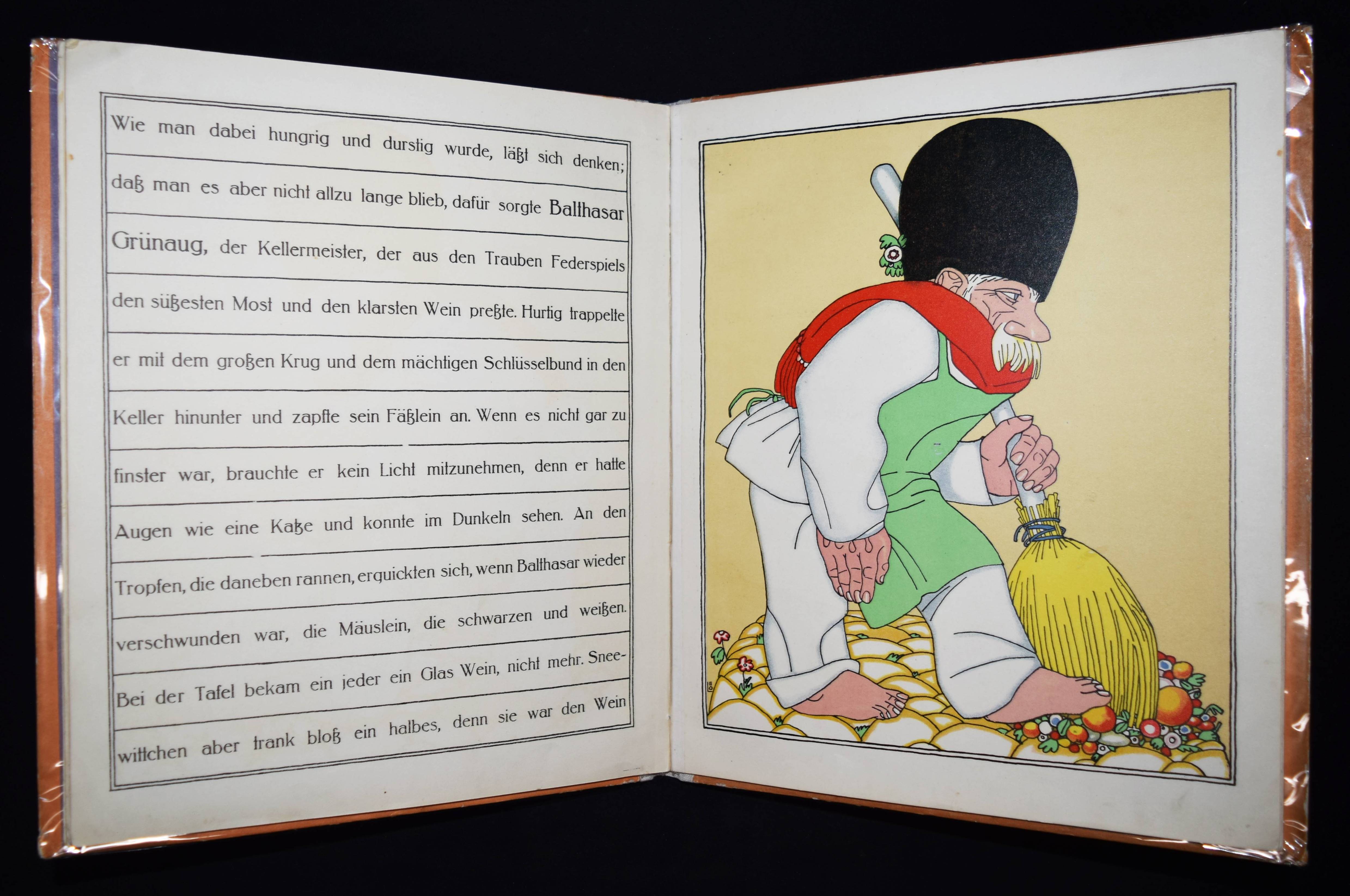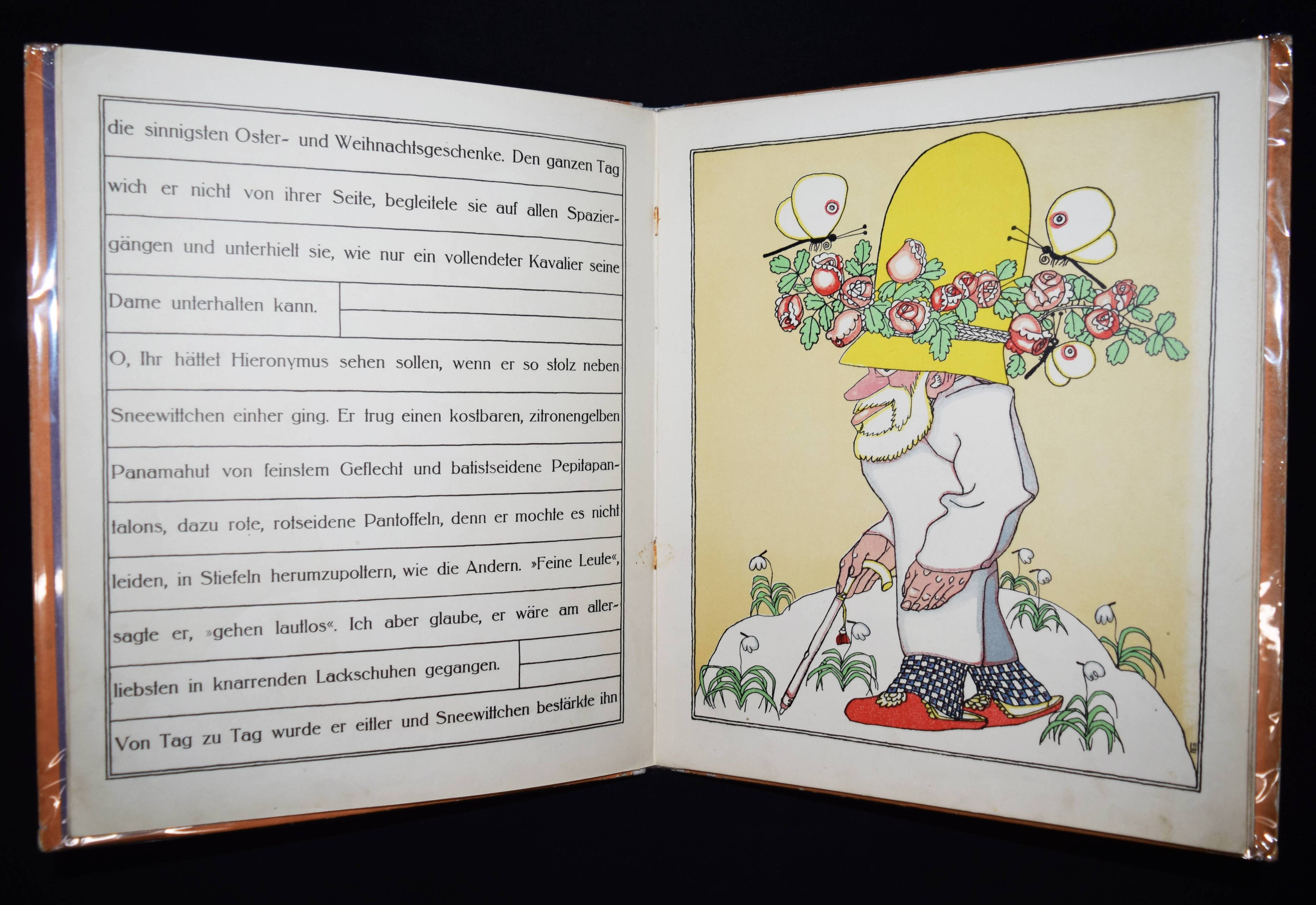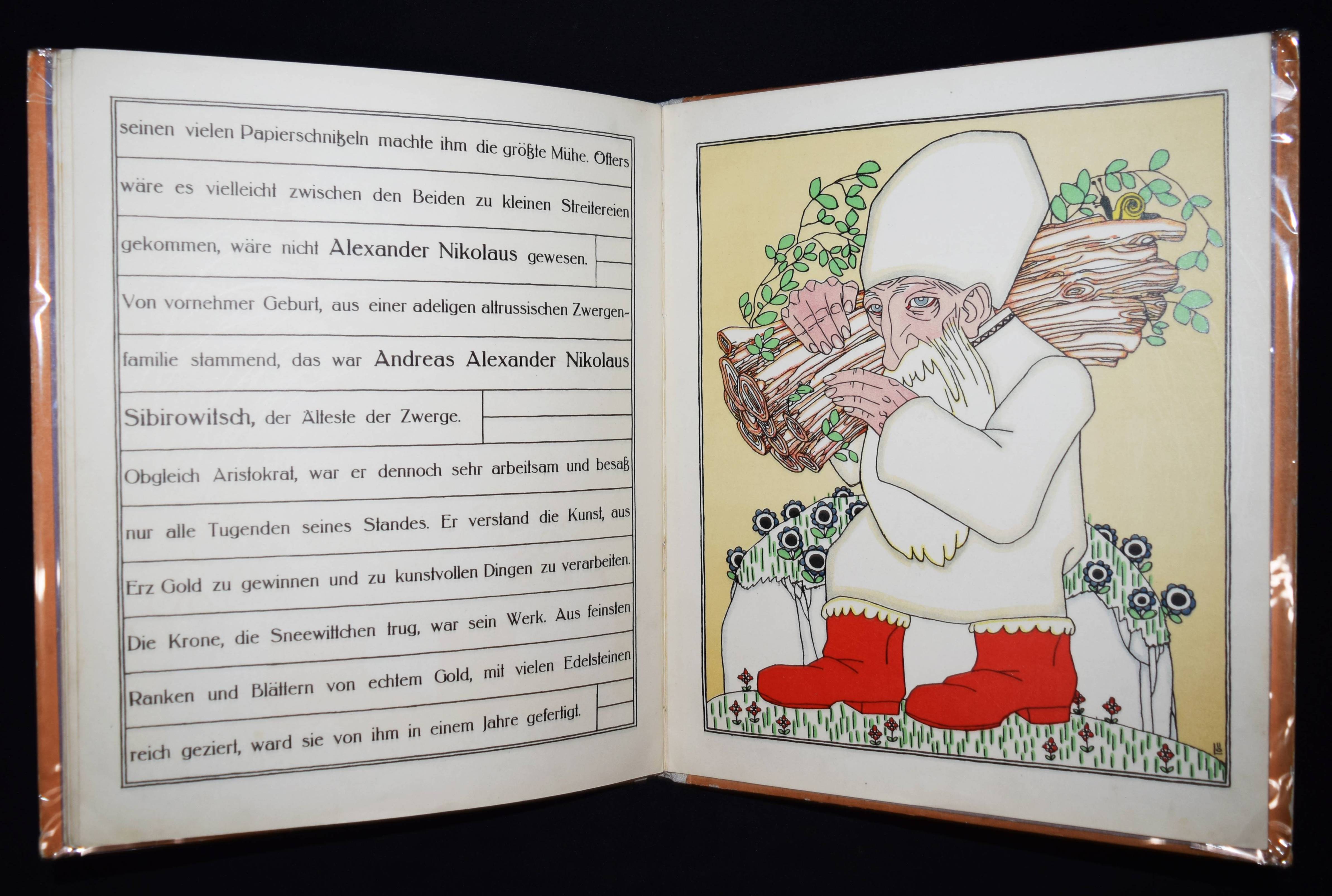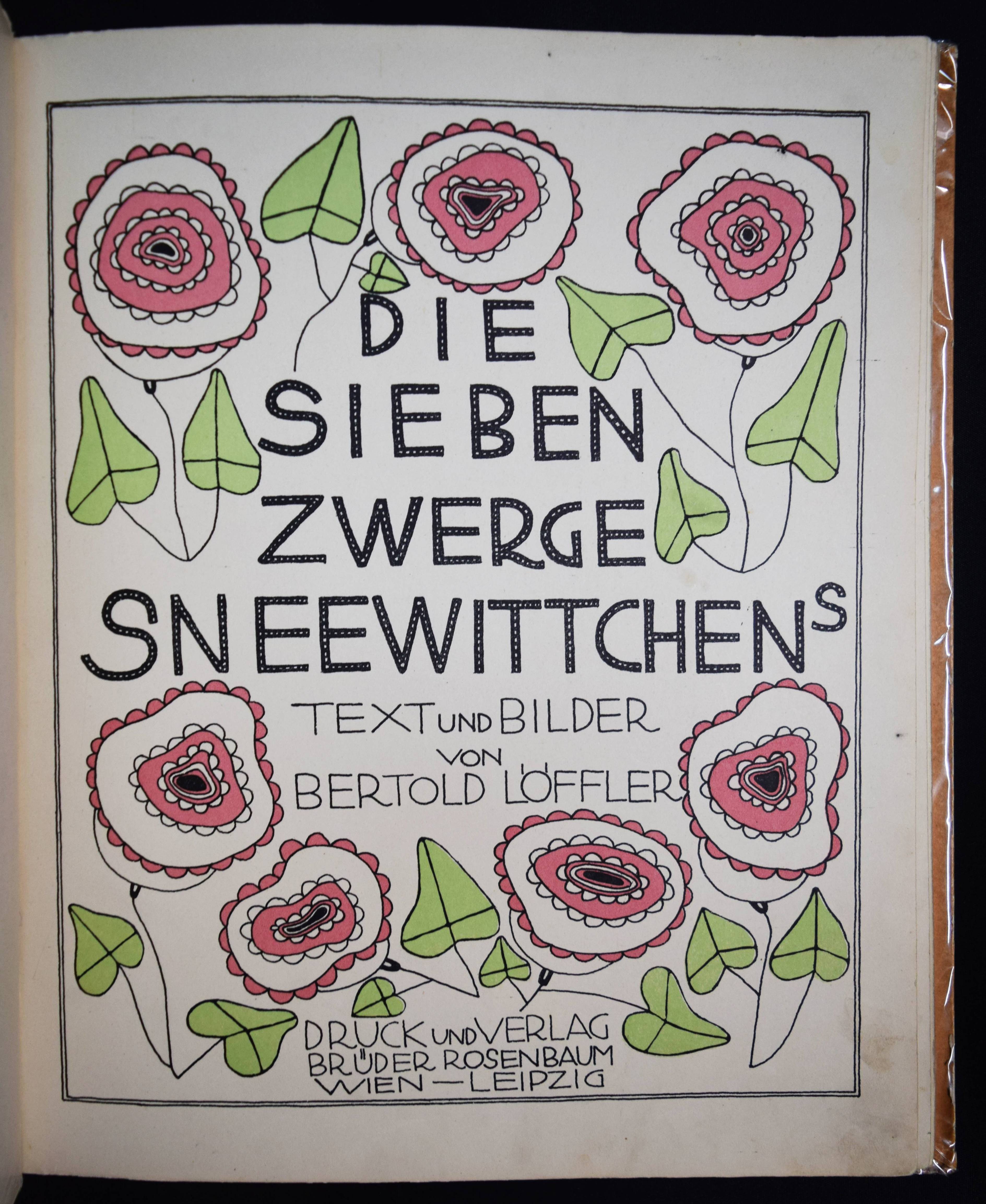 Löffler, Bertold. Die sieben Zwerge Sneewittchens. Wien, Leipzig, Druck und Verlag Brüder Rosenbaum o. J. (1911). Gr.-4° (32 x 27 cm.). [18] Bl. mit zweifarbigem illustr. Titel, 1 goldlithogr. Tafel (″Sneewittchen“) und 7 farblithogr. Tafeln. Farbig illustr. Halbleinenband. Bilderwelt 548 und 1660 (Faksimile-Ausgabe von 1970). Doderer/Müller S. 265. Heller 128 (mit Abb. 11, S. 22). LKJ II, 388. Ries 694, 2. Stuck-Villa II, 252. – Sehr seltene Originalausgabe mit der berühmten Schneewittchen-Tafel Löfflers in Golddruck. – „Das großartige Bilderbuch, das in seinen skurril überzeichneten und dekorativ umspielten Zwergengestalten in die Hochzeit der Wiener Sezession weist …“ (Doderer/Müller). – „Der Text ist in der von F. W. Kleukens 1910 entworfenen „Ingeborg-Antiqua“ mit Zeilen-Lineament gesetzt. – Das grosszügig gestaltete Buch charakterisiert die Spätzeit der Wiener Stilkunst. Die Darstellung der 7 Zwerge … ist in ihrer farbenprächtigen, zugleich klobigen wie verspielten Manier ganz deutlich von kunstgewerblichen Intentionen geprägt: sie erinnert an keramische Figuren, die Löffler für die von ihm mit Michael Powolny 1905 gegründete Werkstätte, ‚Wiener Keramik‘ entwarf“ (F. C. Heller in Bilderwelt). – „Die großen, farbenfrohen Darstellungen der Zwerge sind ganz im charakteristischen Stil von Löfflers graphischen Arbeiten jener Jahre gestaltet: Statisch wirkende Körperformen, die plastizität nur andeuten, tatsächlich aber durch flächige Formgebung stilisiert erscheinen, klobige Gesichter, Hände und Füsse, Anklänge an die keramischen Figuren Löfflers, dekorative Stilisierung von Blüten und Blättern, kräftige, kontrastreiche Farbgebungen. Ähnliche Gestaltungen finden sich auch auf einigen Entwürfen Löfflers für Postkarten der Wiener Werkstätte. Das strenge Lineament der Schrift (der Text ist zur Gänze in ein konsequentes System von Linien eingefügt) und der klare dekorativ-architektonische Charakter der Ingeborg-Type unterstützen die auffallende, vielleicht etwas plakative ästhetische Qualität dieses Bilderbuches, das wahrscheinlich nur in einer sehr kleinen Auflage erschienen ist“ (F. C. Heller). – Rücken fachgerecht erneuert, Deckel etwas berieben und angestaubt, die dritte und vierte Farbtafel hintereinander gebunden, nur vereinzelt im unteren Blattrand etwas fingerfleckig, gutes Exemplar.