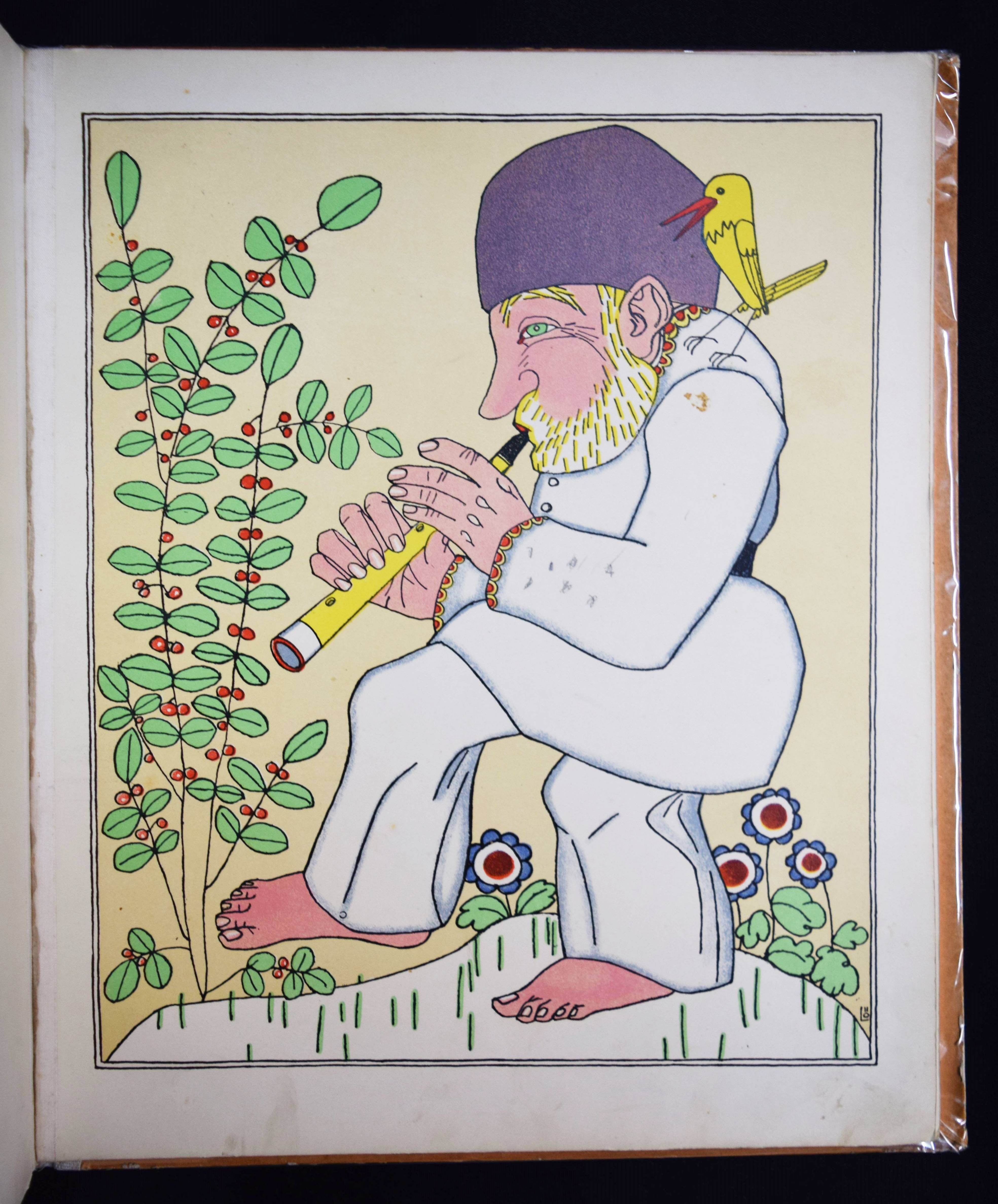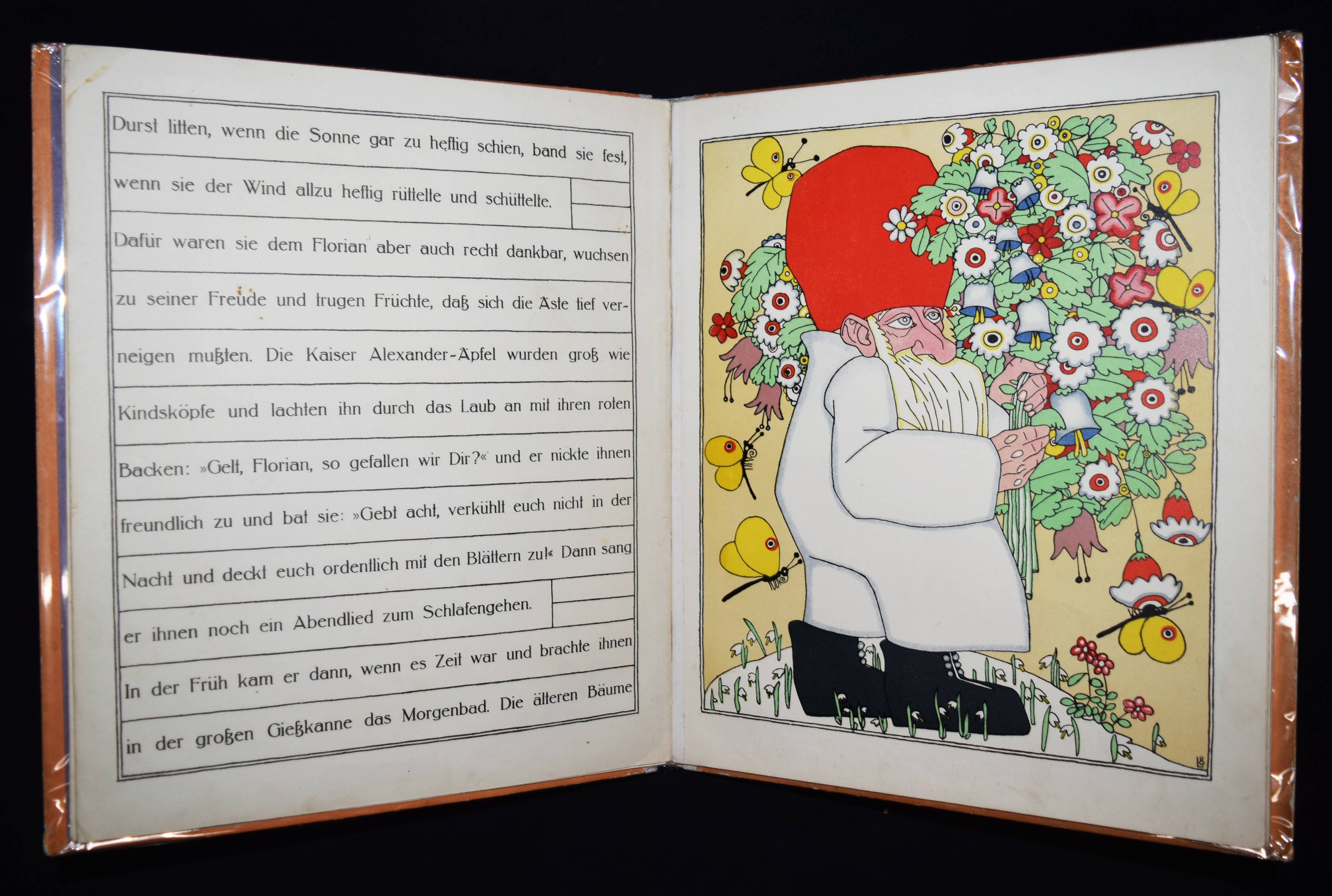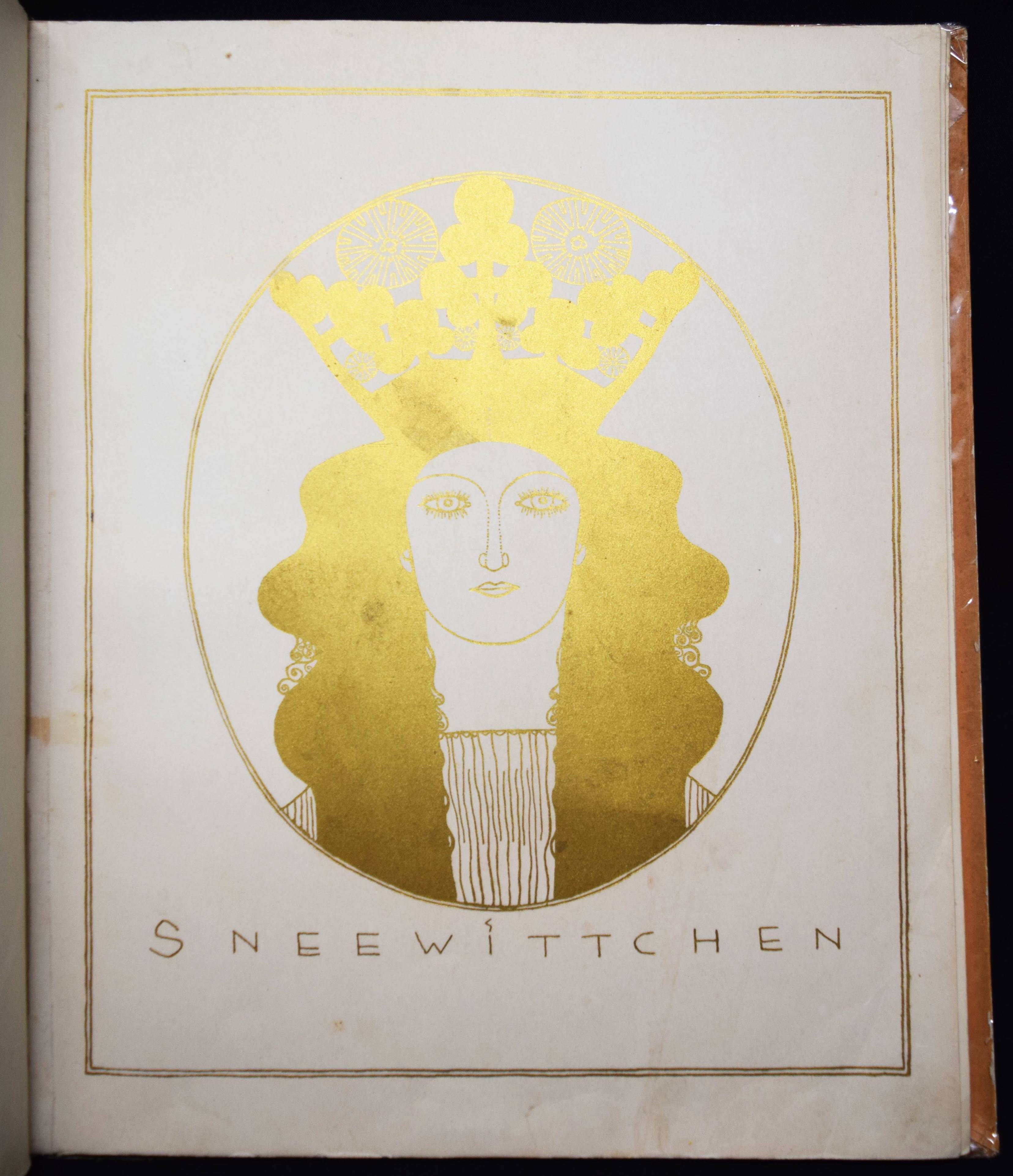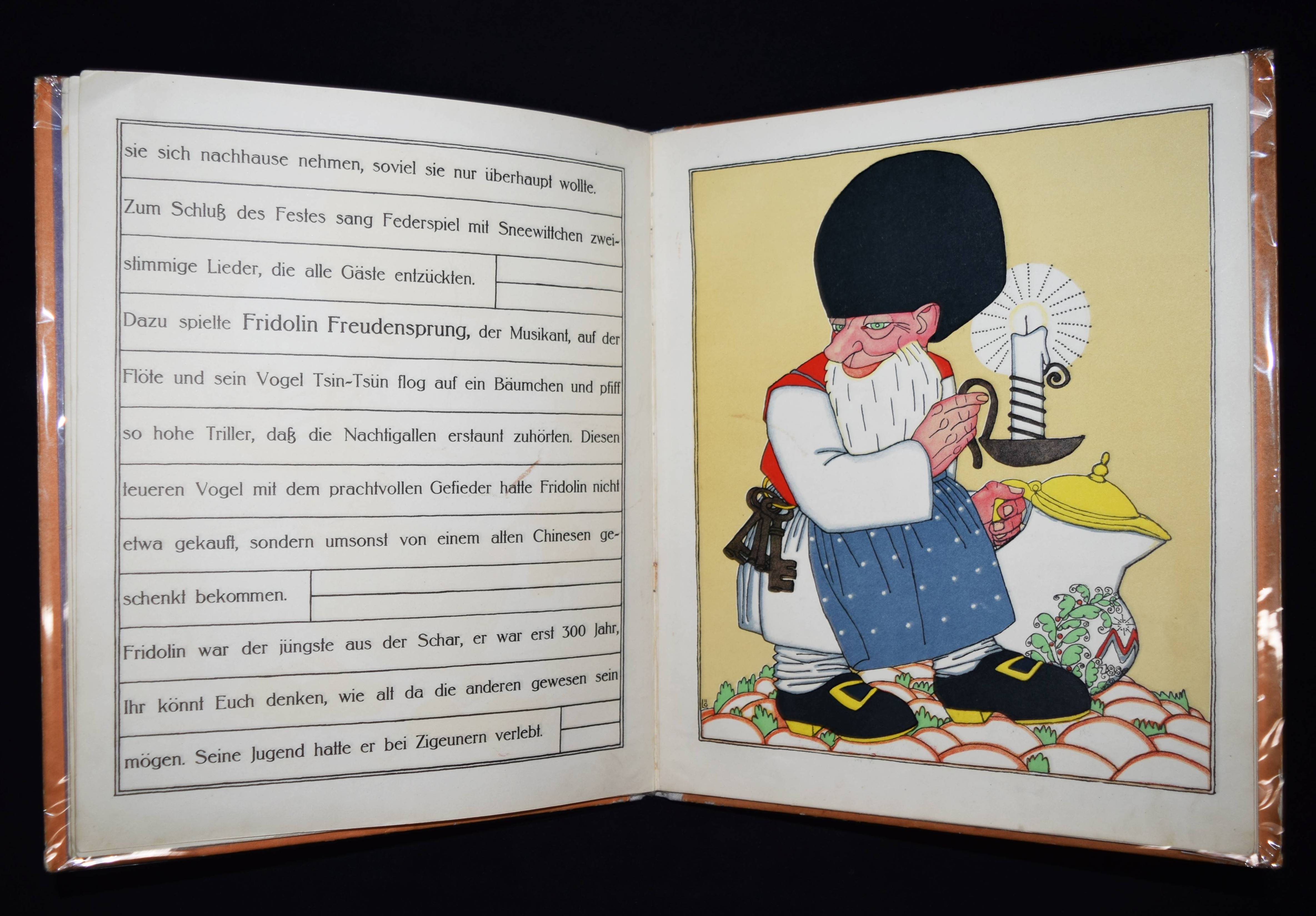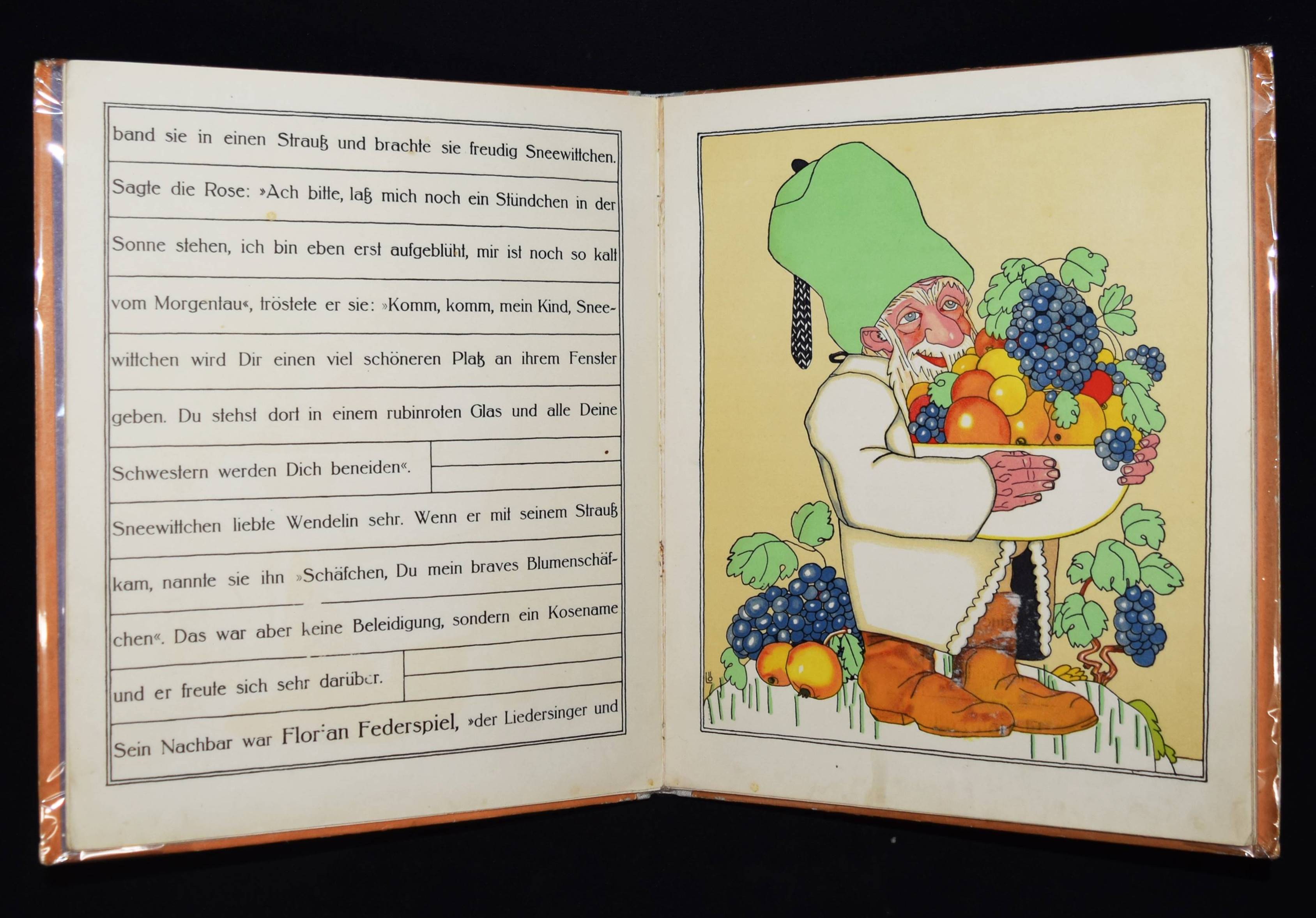 Löffler, Bertold. Die sieben Zwerge Sneewittchens. Wien, Leipzig, Druck und Verlag Brüder Rosenbaum o. J. (1911). Gr.-4° (32 x 27 cm.). [18] Bl. mit zweifarbigem illustr. Titel, 1 goldlithogr. Tafel (″Sneewittchen“) und 7 farblithogr. Tafeln. Farbig illustr. Halbleinenband. Bilderwelt 548 und 1660 (Faksimile-Ausgabe von 1970). Doderer/Müller S. 265. Heller 128 (mit Abb. 11, S. 22). LKJ II, 388. Ries 694, 2. Stuck-Villa II, 252. – Sehr seltene Originalausgabe mit der berühmten Schneewittchen-Tafel Löfflers in Golddruck. – „Das großartige Bilderbuch, das in seinen skurril überzeichneten und dekorativ umspielten Zwergengestalten in die Hochzeit der Wiener Sezession weist …“ (Doderer/Müller). – „Der Text ist in der von F. W. Kleukens 1910 entworfenen „Ingeborg-Antiqua“ mit Zeilen-Lineament gesetzt. – Das grosszügig gestaltete Buch charakterisiert die Spätzeit der Wiener Stilkunst. Die Darstellung der 7 Zwerge … ist in ihrer farbenprächtigen, zugleich klobigen wie verspielten Manier ganz deutlich von kunstgewerblichen Intentionen geprägt: sie erinnert an keramische Figuren, die Löffler für die von ihm mit Michael Powolny 1905 gegründete Werkstätte, ‚Wiener Keramik‘ entwarf“ (F. C. Heller in Bilderwelt). – „Die großen, farbenfrohen Darstellungen der Zwerge sind ganz im charakteristischen Stil von Löfflers graphischen Arbeiten jener Jahre gestaltet: Statisch wirkende Körperformen, die plastizität nur andeuten, tatsächlich aber durch flächige Formgebung stilisiert erscheinen, klobige Gesichter, Hände und Füsse, Anklänge an die keramischen Figuren Löfflers, dekorative Stilisierung von Blüten und Blättern, kräftige, kontrastreiche Farbgebungen. Ähnliche Gestaltungen finden sich auch auf einigen Entwürfen Löfflers für Postkarten der Wiener Werkstätte. Das strenge Lineament der Schrift (der Text ist zur Gänze in ein konsequentes System von Linien eingefügt) und der klare dekorativ-architektonische Charakter der Ingeborg-Type unterstützen die auffallende, vielleicht etwas plakative ästhetische Qualität dieses Bilderbuches, das wahrscheinlich nur in einer sehr kleinen Auflage erschienen ist“ (F. C. Heller). – Rücken fachgerecht erneuert, Deckel etwas berieben und angestaubt, die dritte und vierte Farbtafel hintereinander gebunden, nur vereinzelt im unteren Blattrand etwas fingerfleckig, gutes Exemplar.