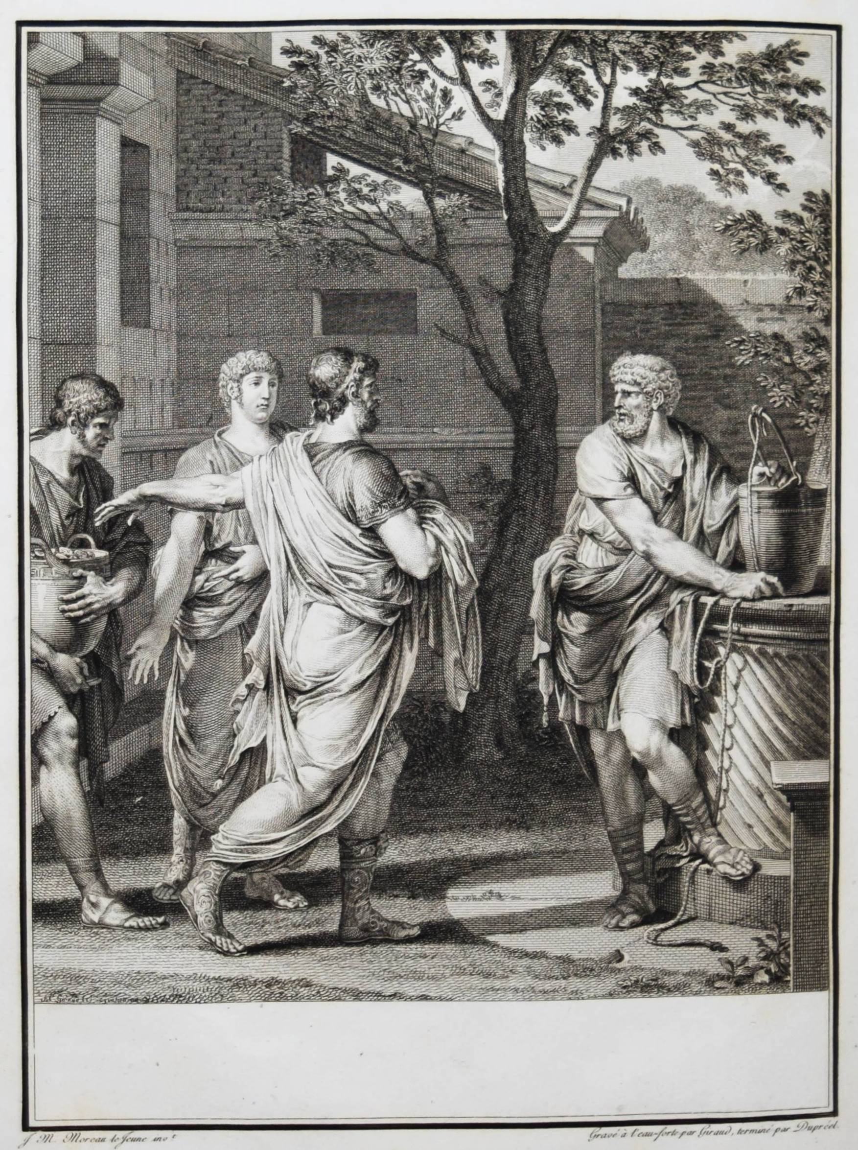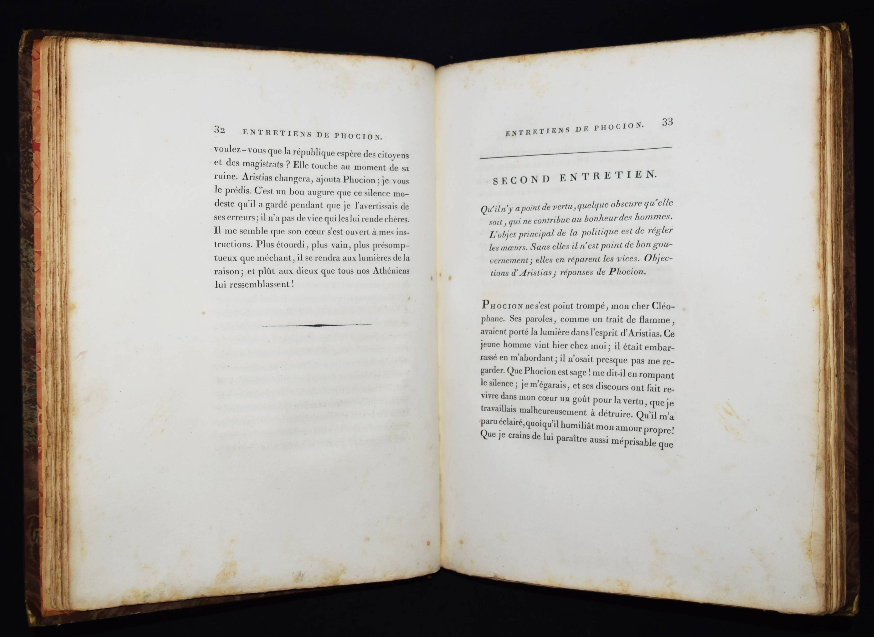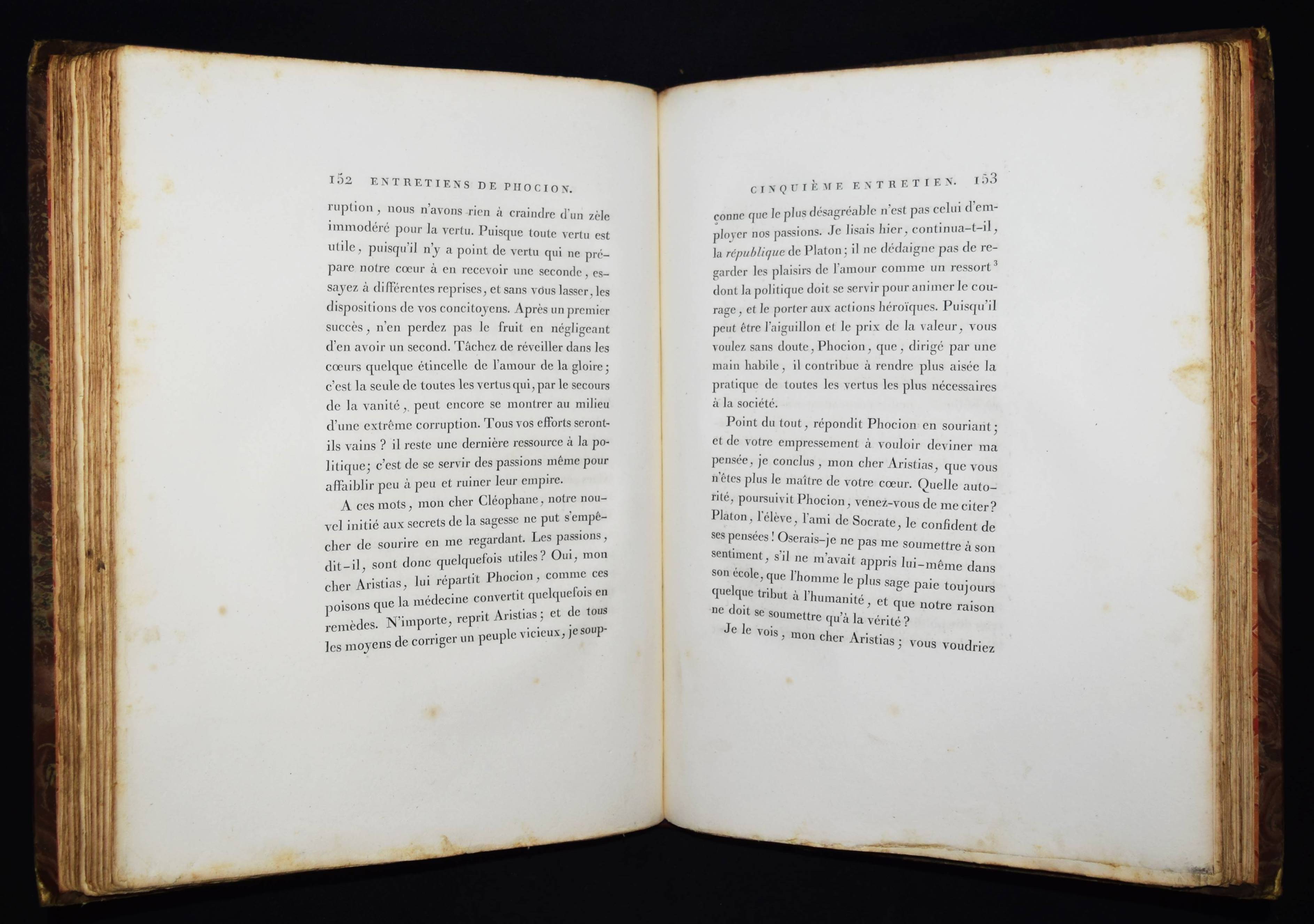 Mably, (Gabriel Bonnot, Abbé de). Entretiens de Phocion, sur le rapport de la morale avec la politique. Traduis du Grec de Nicolès avec des remarques. Edition à laquelle on a joint la vie de Phocion par Plutarque, traduction d’Amyot. Paris, Didot le jeune L’an troisième (1795). Folio (36 x 27 cm.). XXIV, 265 S., [1] Bl. mit 2 Kupfertafeln von Giraud und Dambrun nach (Jean-Michel) Moreau le jeune. Weinroter Halblederband um 1900 mit goldgepr. Rückentitel und Linienvergoldung. Querard V, 405. Rahir 519. Schweiger I, 267. Vgl. Higgs 3082 (Anm.). Palgrave II, 655. – Seltene Prachtausgabe in Folio bei Didot. – Die Angabe „Übersetzung aus dem Griechischen“ ist fingiert. – „In 1763, he published ‚Les entretiens …‘: This travesty, as it may almost be called – the best of his writings in style, and a happy example of rhetorical exaggeration – eulogises the institutions of Lycargus, and marks the author as a member of the school of J. J. Rousseau“ (Palgrave). – „Avec les „Entretiens de Phocion“, qui parurent en 1763, Mably intervint consciemment dans le débat théorétique des Lumières françaises et chercha à donner une base systématique à sa théorie politique à travers le devoir moral de la politique dans le sens de l’Antique“ (Révolution Francaise (dot) net). – G. B. de Mably (1709-1785), einer der Väter der Revolution und des Sozialismus, „trat für eine sozialistische Ordnung der Gesellschaft ein und verlangte Gleichheit und Wohlwollen als ihre Grundlagen“ (W. Ziegenfuss, Philosophen-Lexikon II, 94). – Die beiden Kupfertafeln unten mit Randeinrissen (ca. 4 cm.), stellenweise im weißen Blattrand etwas braunfleckig, gutes breitrandiges Exemplar.