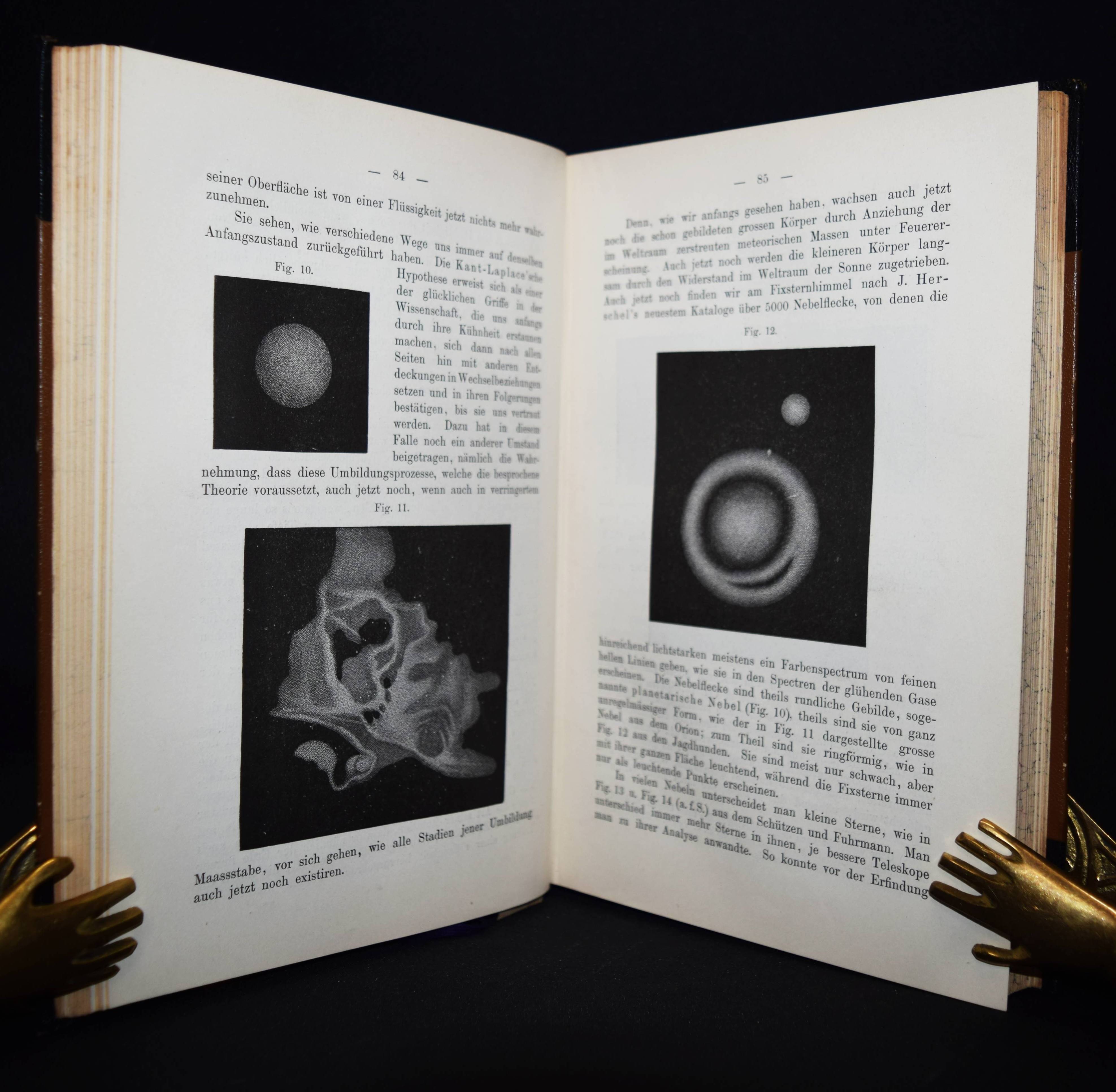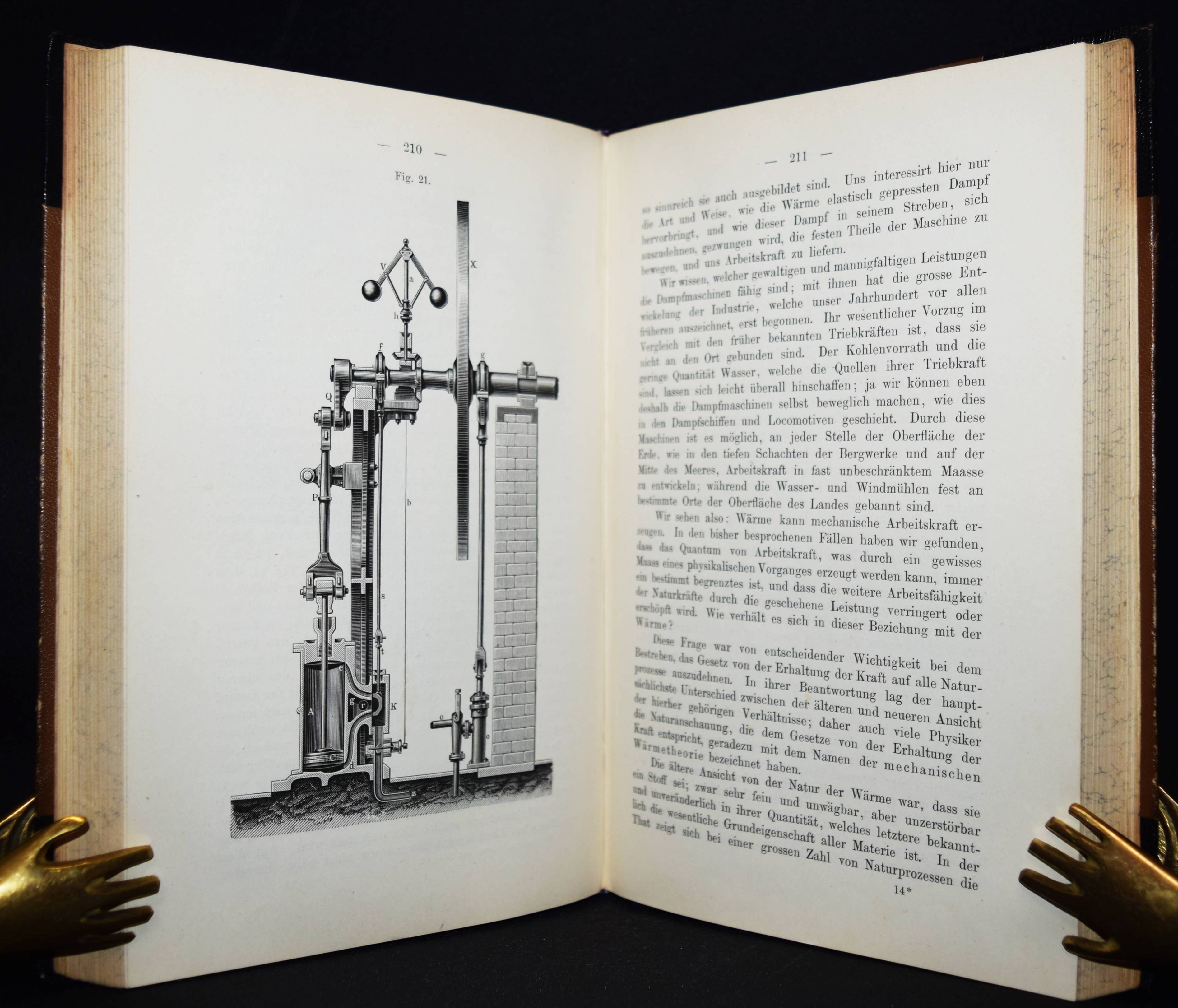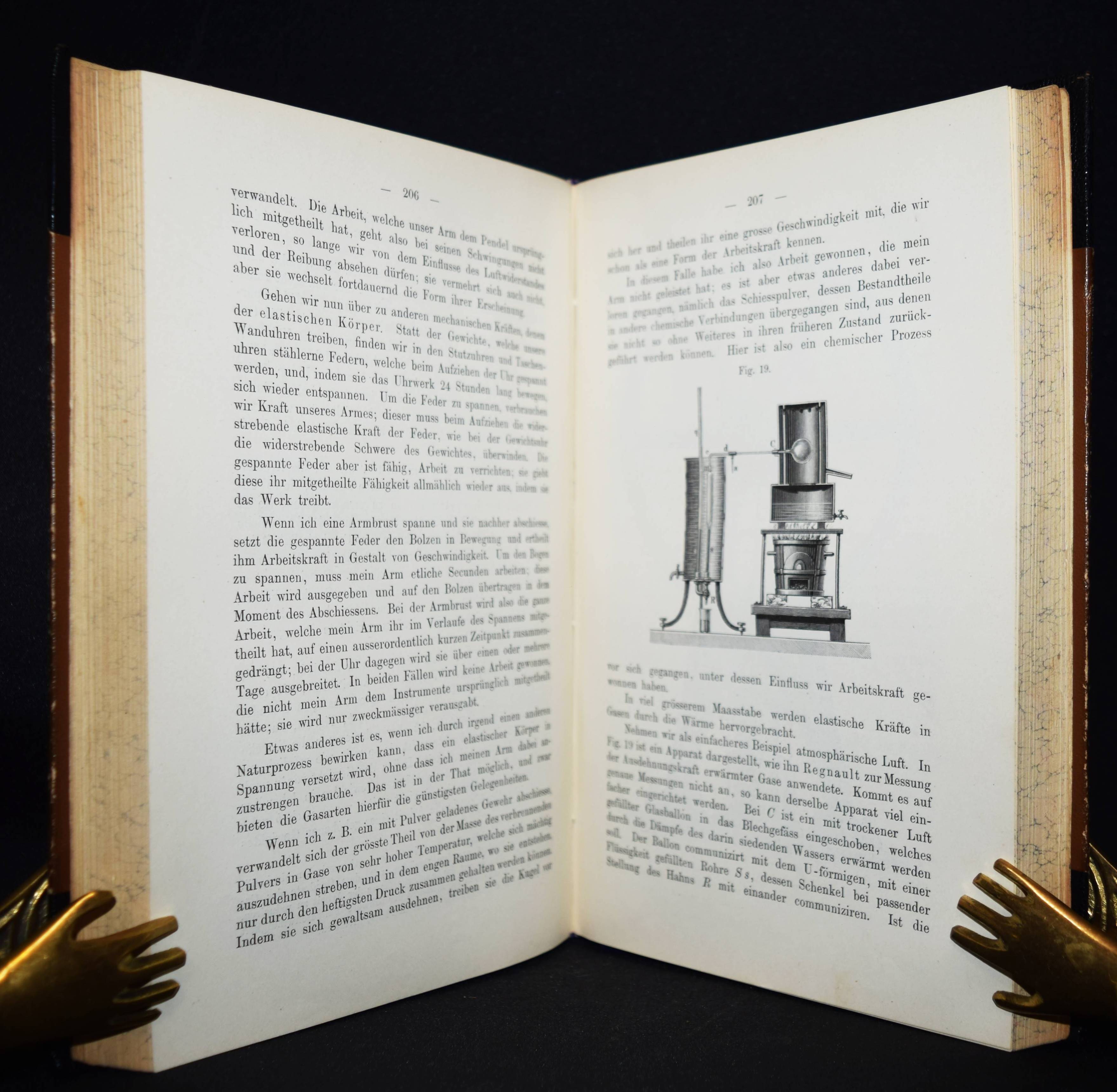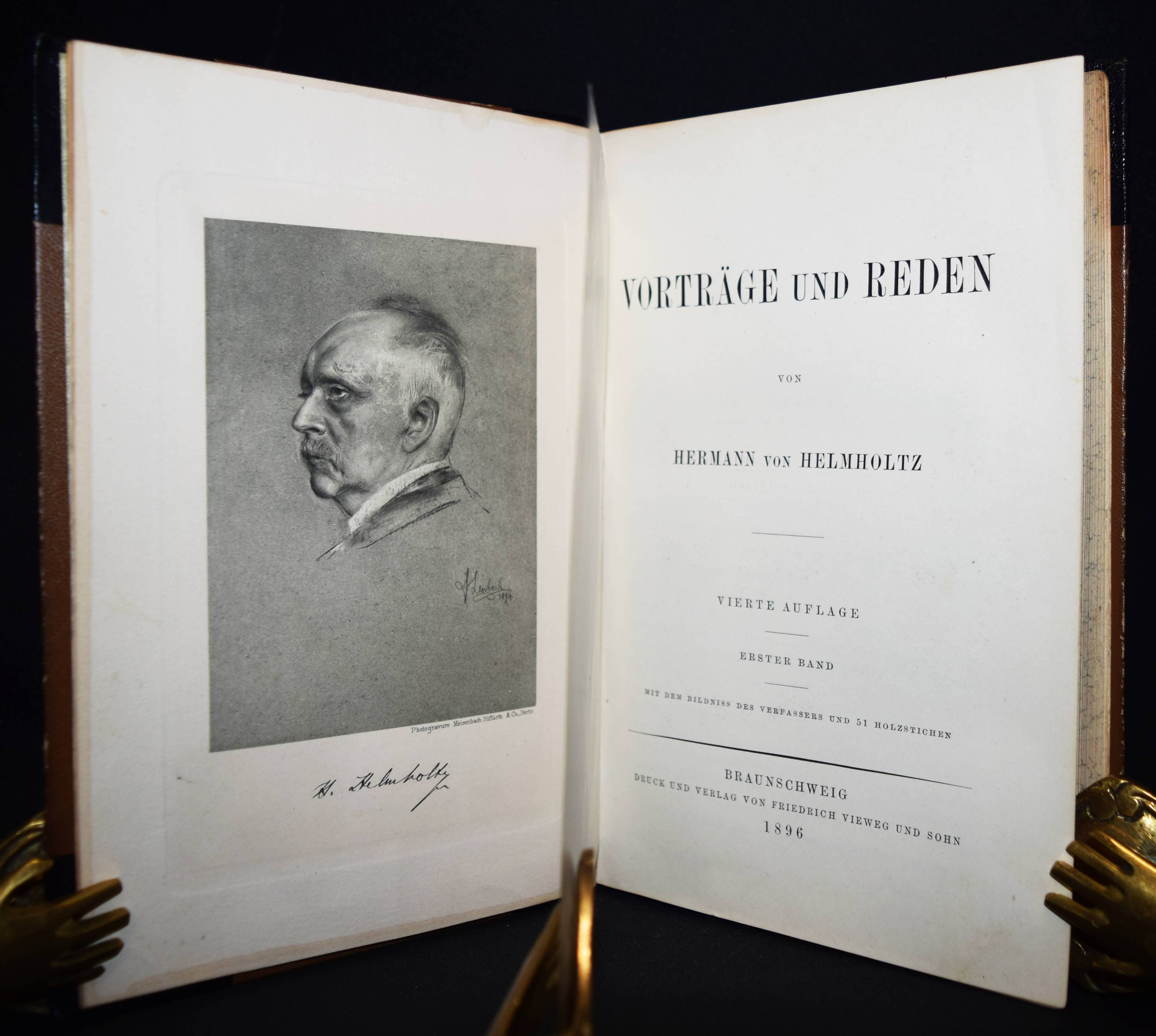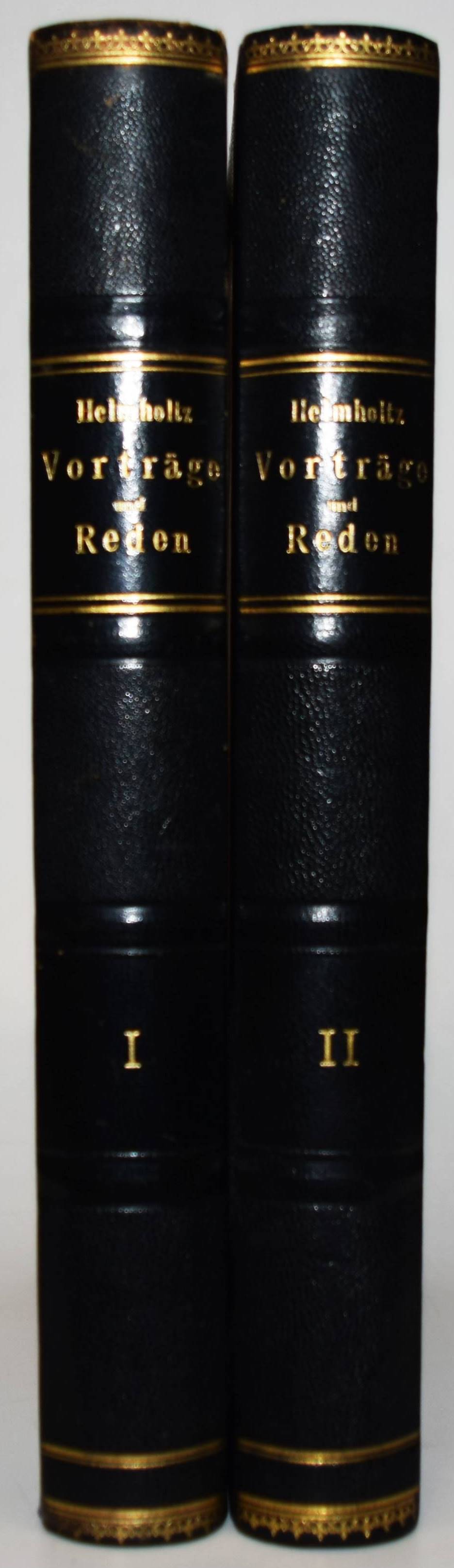 Helmholtz, Hermann v. Vorträge und Reden. 4. Auflage. 2 Bände. Braunschweig, Friedrich Vieweg und Sohn 1896. Gr.-8°. XV, 422 S., IX, 434 S., [1] Bl. mit Portrait in Photogravure und zus. 71 Holzstich-Abb. Orig.-Halblederbände mit goldgepr. Rückentiteln und dezenter Rückenvergoldung. NDB VIII, 498 ff. – Erschien zuerst 1884 mit diesem Titel. – „Die Weite seines systematischen Denkens und seiner Interessen belegen seine erkenntnistheoretischen Arbeiten. Zu ihnen ist die – wenn auch der Form nach mathematische – großartige, auch auf die Wissenschaftsgeschichte eingehende Behandlung der Allgemeingültigkeit des ursprünglich auf mechanische Bewegungsvorgänge beschränkten „Prinzips der kleinsten Wirkung“ (1886) zu rechnen, die er durch „Das Prinzip der kleinsten Wirkung in der Elektrodynamik“ (1892) abschließt“ (W. Gerlach in NDB). – Sehr schönes sauberes Exemplar in den dekorativen Verlagseinbänden.