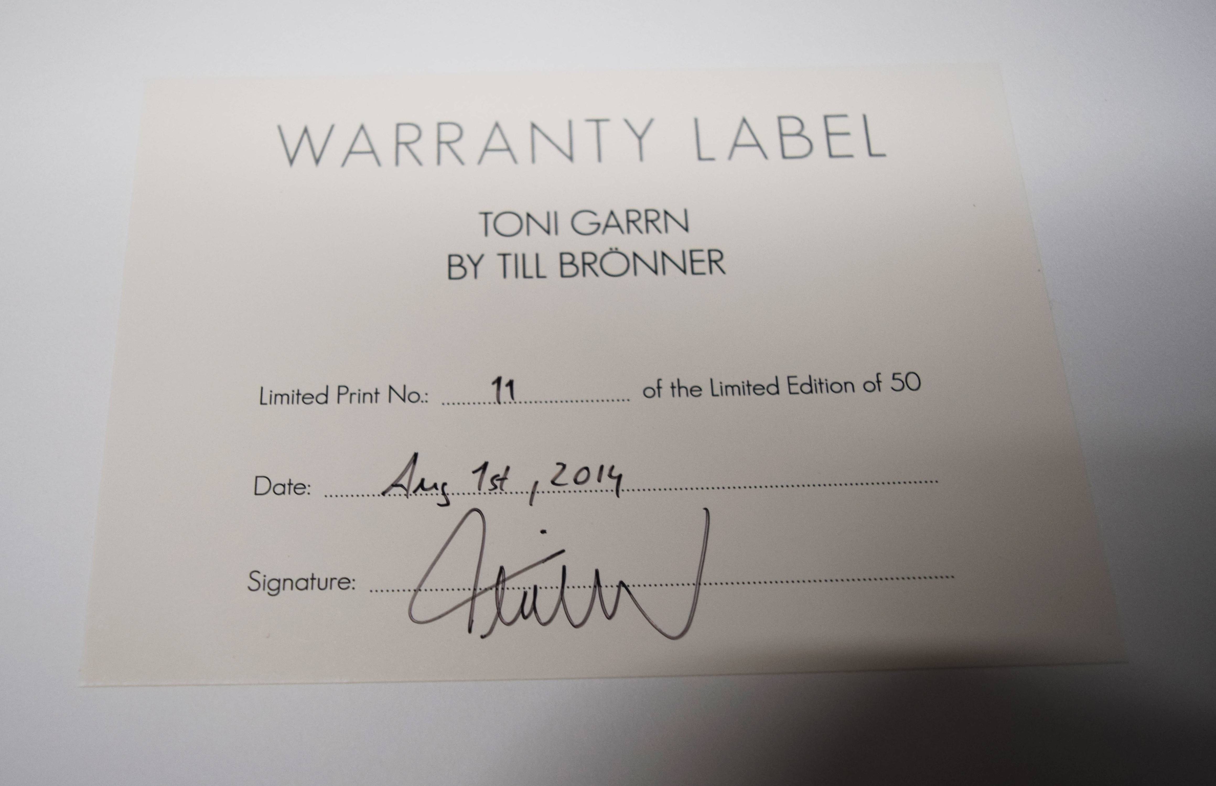 Brönner, Till. Faces of talent. (Mit einem Essay von Inas Fayed). Kempen, teNeues (2014). Folio (38 x 30 cm.). 206 S. mit teils doppelblattgr. Duotone-Tafeln und 1 sign., num. und dat. Orig.-Print Toni Garrn in Leinen-Chemise mit silbergepr. Deckeltitel. Orig.-Pappband mit goldgepr. Rücken- und Deckeltitel und illustr. OU. in Leinen-Buchkassette. Erste Ausgabe der ersten Foto-Publikation. – Eines von 100 Exemplaren der Collector’s Edition von Till Brönner auf dem Titelblatt signiert und mit num. (11/50), dat. und signiertem Print: Toni Garrn. Text in Deutsch und Englisch. – Mit hervorragenden Potraits des bekannten Jazz-Trompeters von Seal, Hugh Masekela, Beth Ditto, Marcus Miller, Peaches, Sergio Mendes, Dieter Meier, Philip Glass, Daniel Barenboim, Klaus Maria Brandauer, George Benson, Quincy Jones, Andreas H. Bitesnich, Marcus Lüpertz, Bob Geldof u.v.a. – „This successful jazz musician shows us another exciting facet of his artistic talent. In true Blue Note tradition the cover of Till Brönner’s self-titled 2012 album is in itself a work of art. The musician-who had played with Natalie Cole and Dave Brubeck before he became a celebrity himself-enjoys being photographed by star photographer Andreas H. Bitesnich, resulting in portraits that are cool but without a hint of artificiality. Brönner is not only one of the best and most successful jazz trumpet players of our time, but he also has a special relationship with the visual arts. Since the moment he received his first Leica camera, he discovered a love of photography and is turning the tables. He captures internationally famous musicians and celebrities from Beth Ditto to Armin Müller-Stahl, David Guetta to Gregory Porter. Because of his musical background, Brönner has the necessary feeling for timing and the right orchestration. His photographic style is spare and no method is an end in itself. The result: impressive black-and-white portraits that reveal unknown sides of familiar faces. When viewing these images you can immediately sense that there is a special relationship between the photographer and his subjects-making these photos exceptionally compelling – Die Arbeiten des herausragenden Musikers nun auch als Collector’s Edition in einer handgefertigten Clamshell-Box – Limitierte Auflage von 100 Exemplaren. Enthält eines von Till Brönners faszinierenden Porträts als handsignierten und nummerierten Print in einem Portfolio“ (teNeues). – Sehr gutes Exemplar.